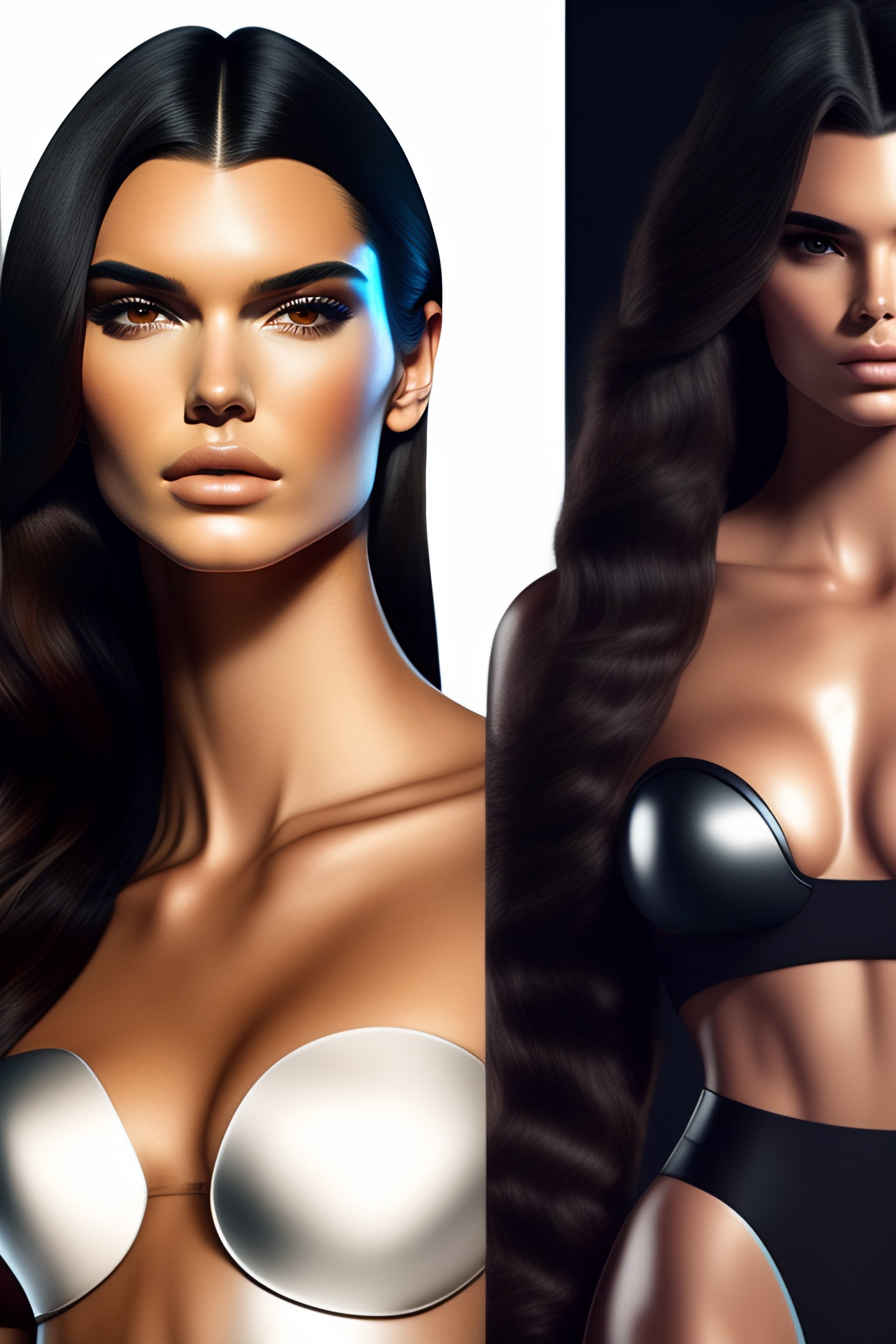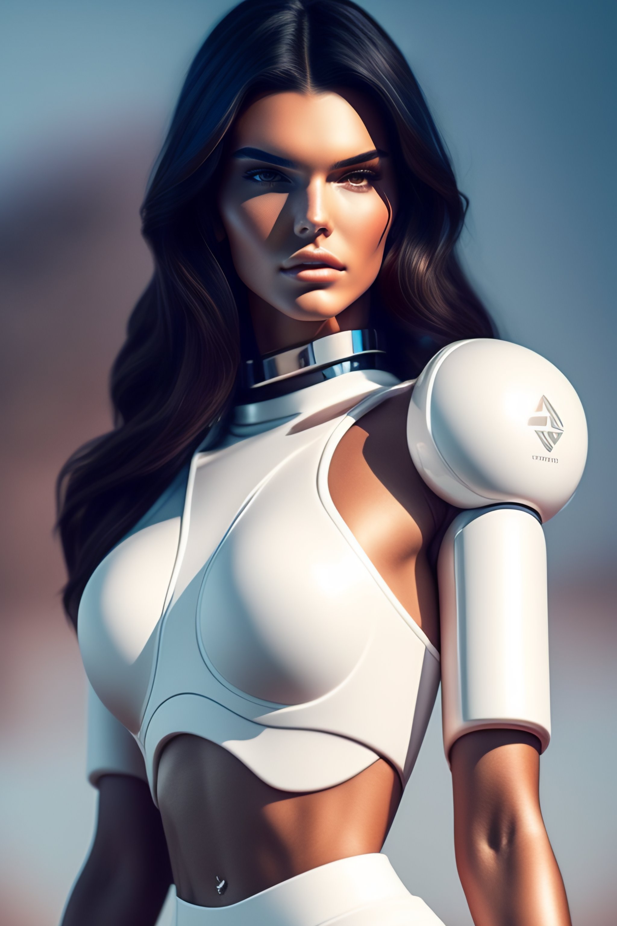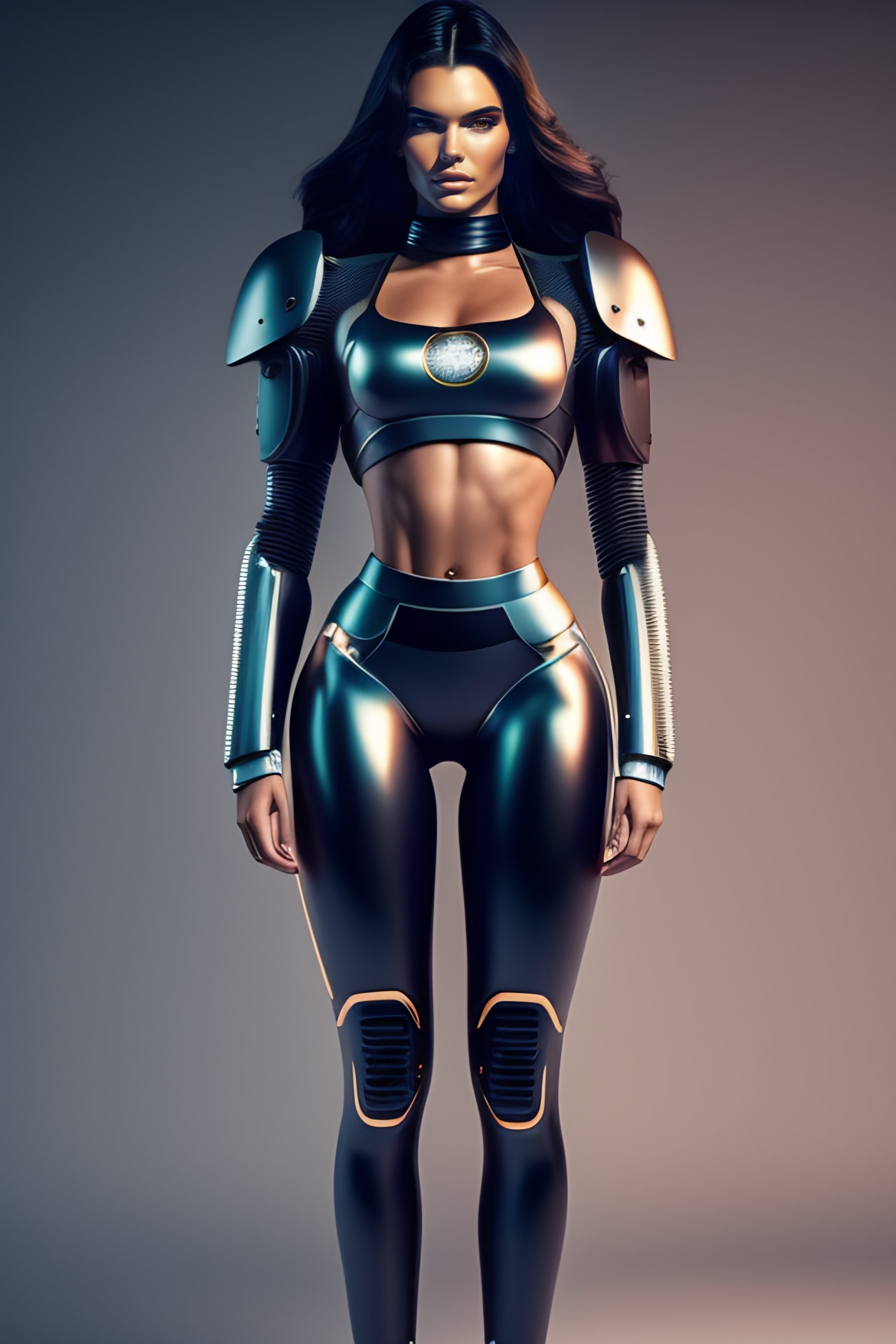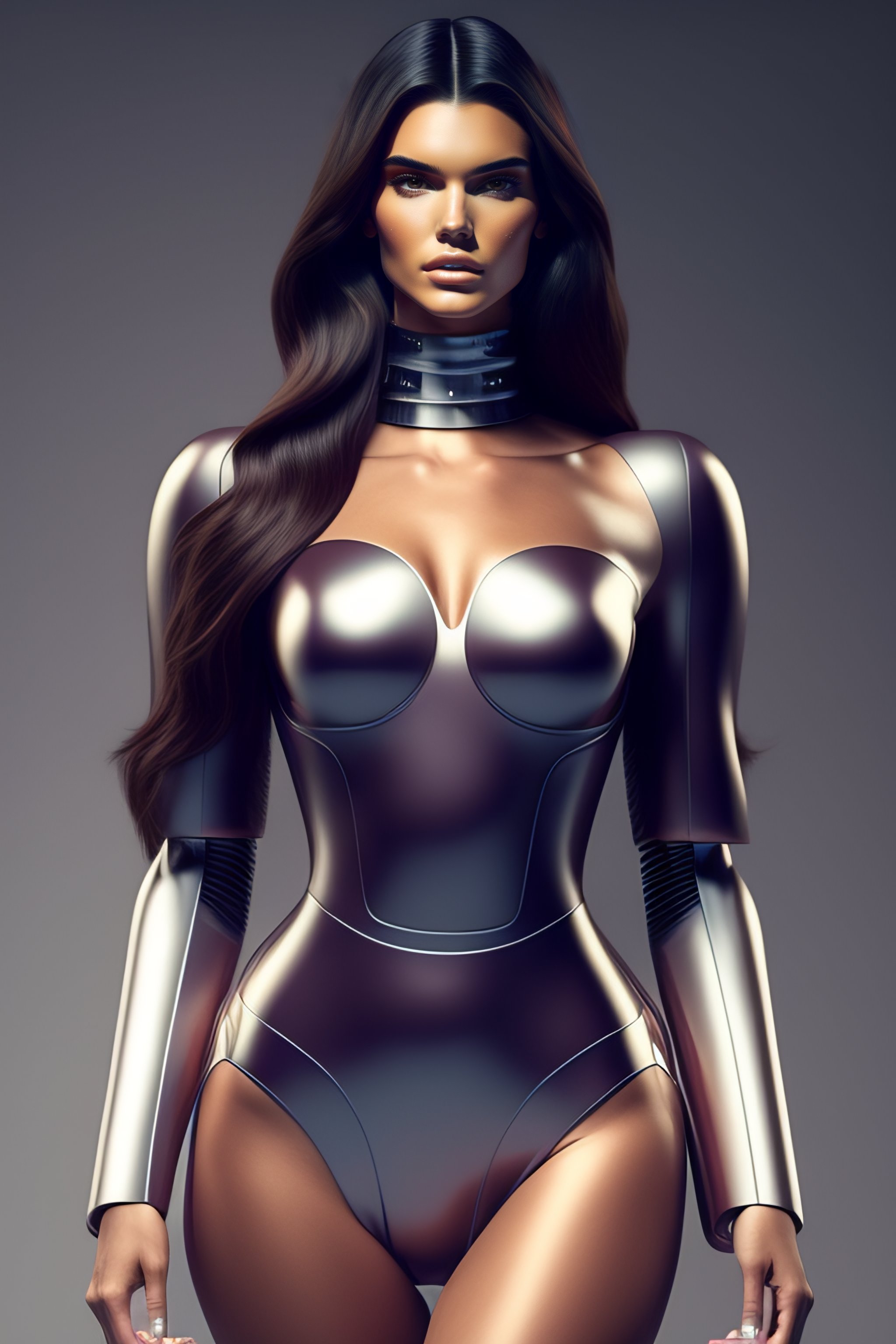 2500 future kendall jenner robot, athletic body, full body product photography, double round, tiny waist, pretty face, concept art