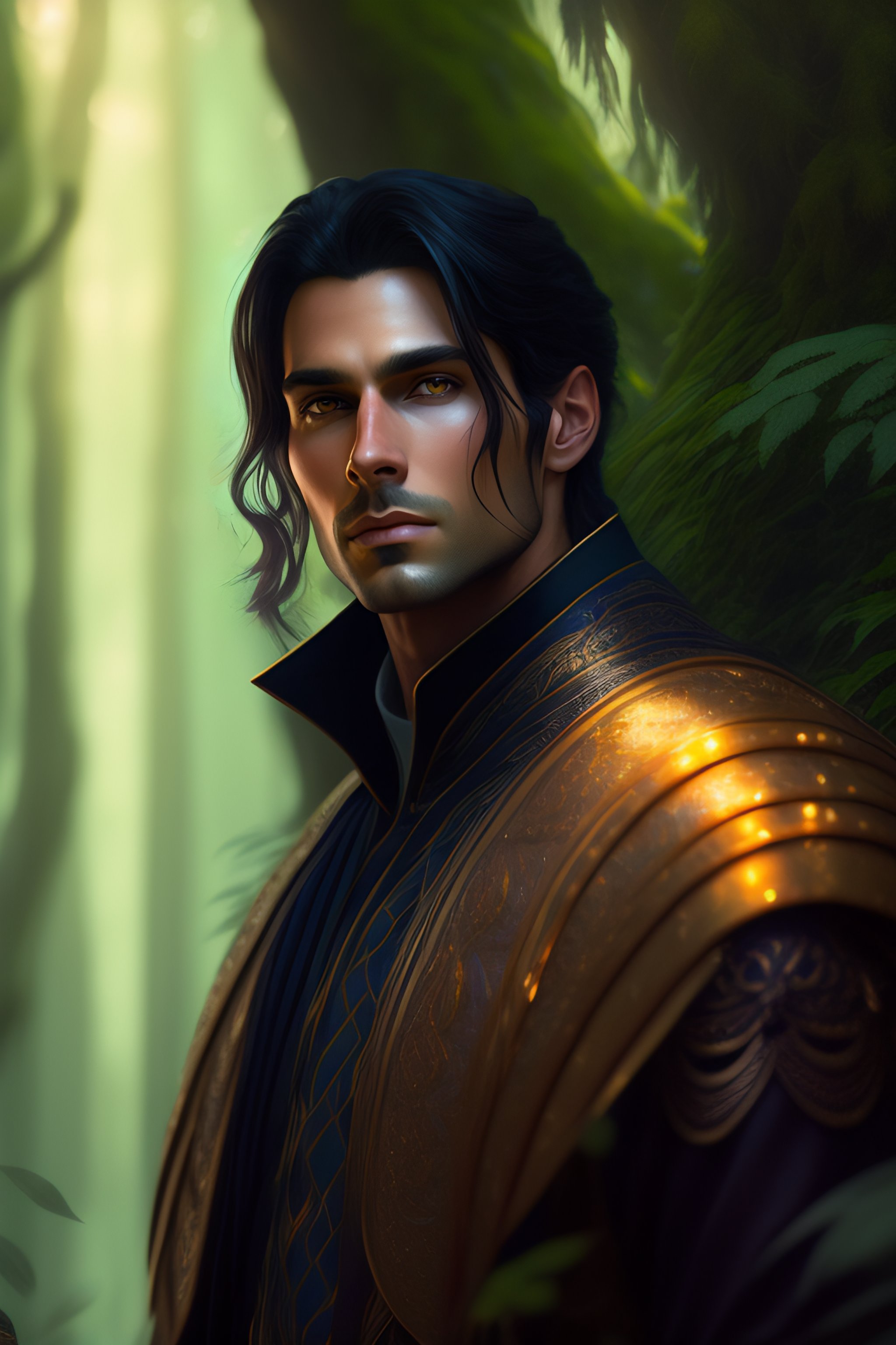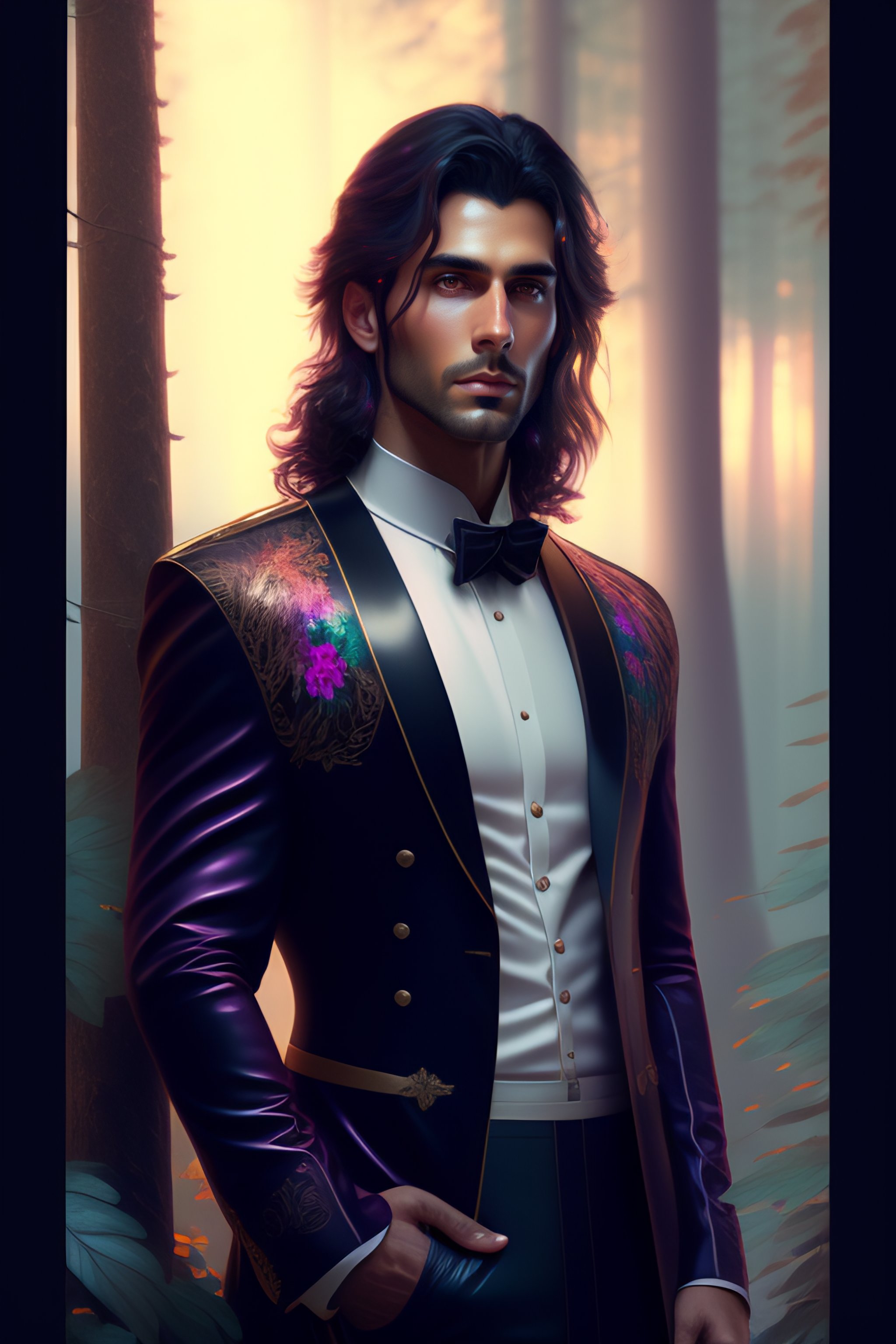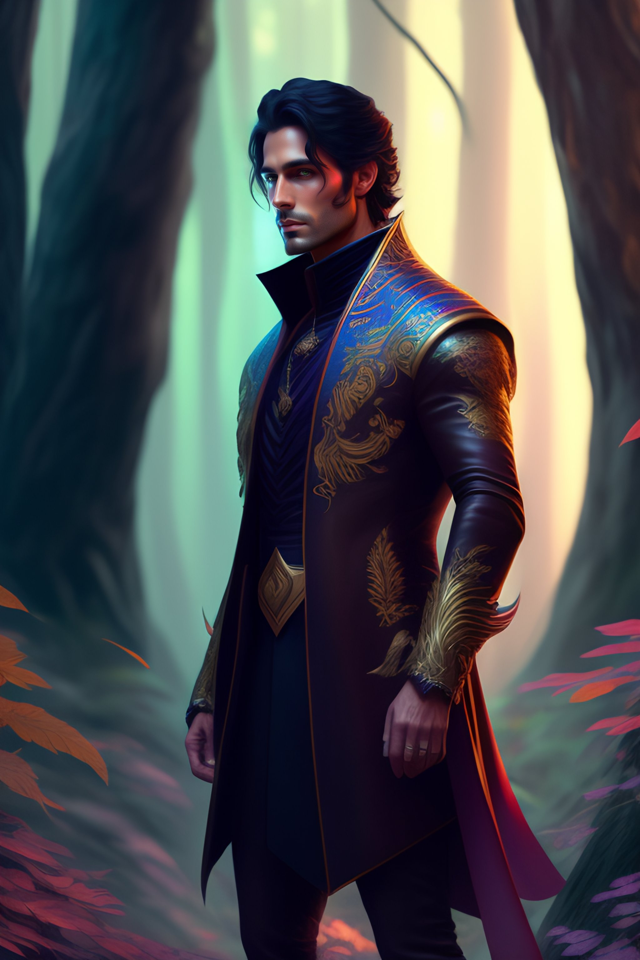 Full length shot of handsome dark haired male standing in alien colorful forest, highly detailed, digital painting, deviantart, artstation, concept art, matte, sharp focus, photo realistic, detailed face, photorealistic pale skin, greg rutkowski and alphonse mucha