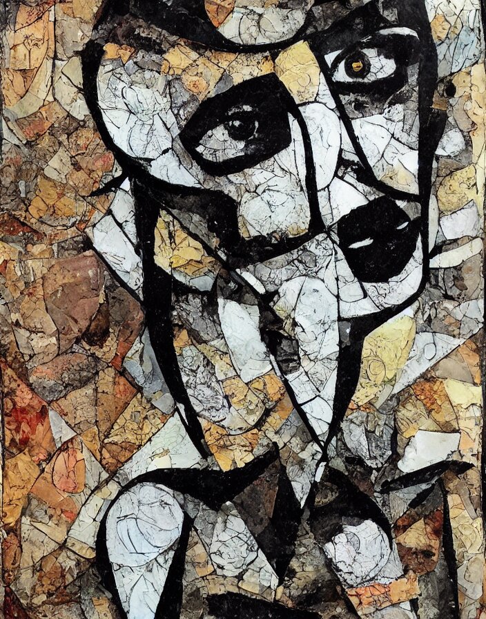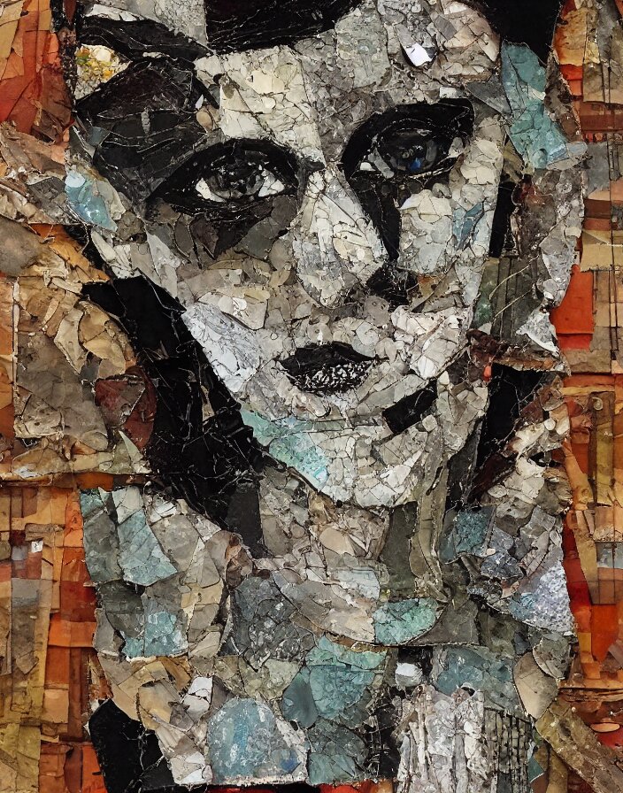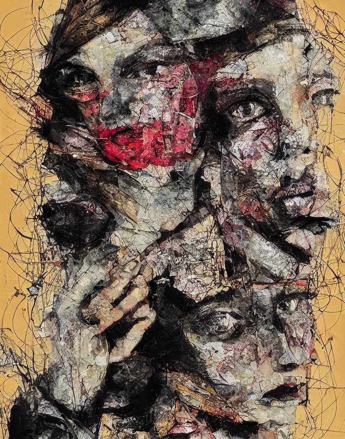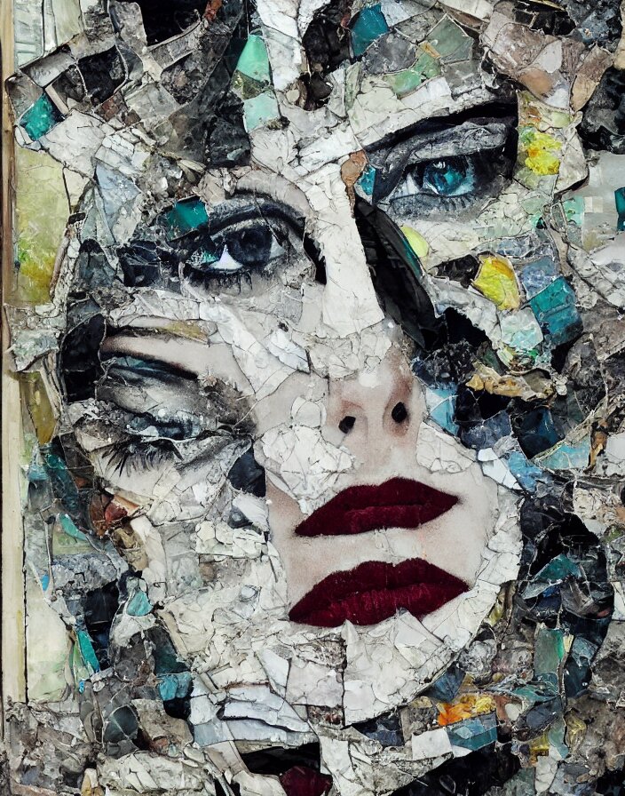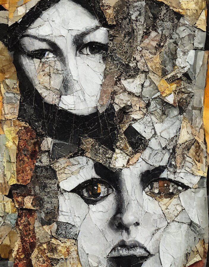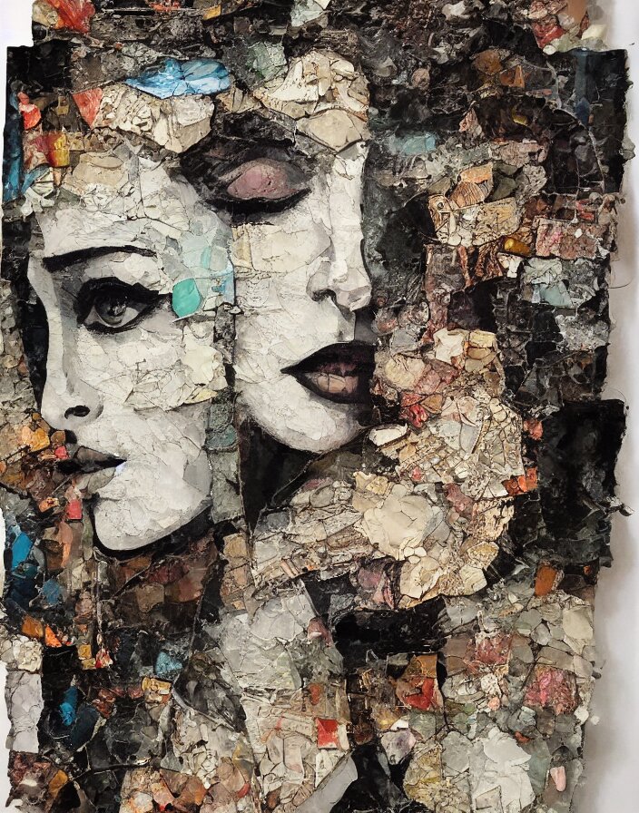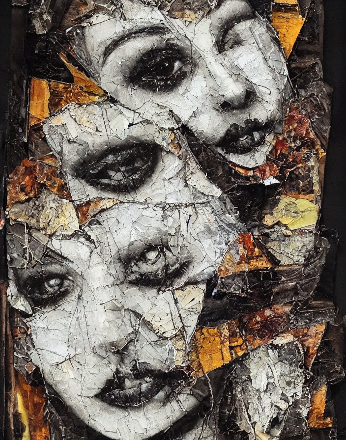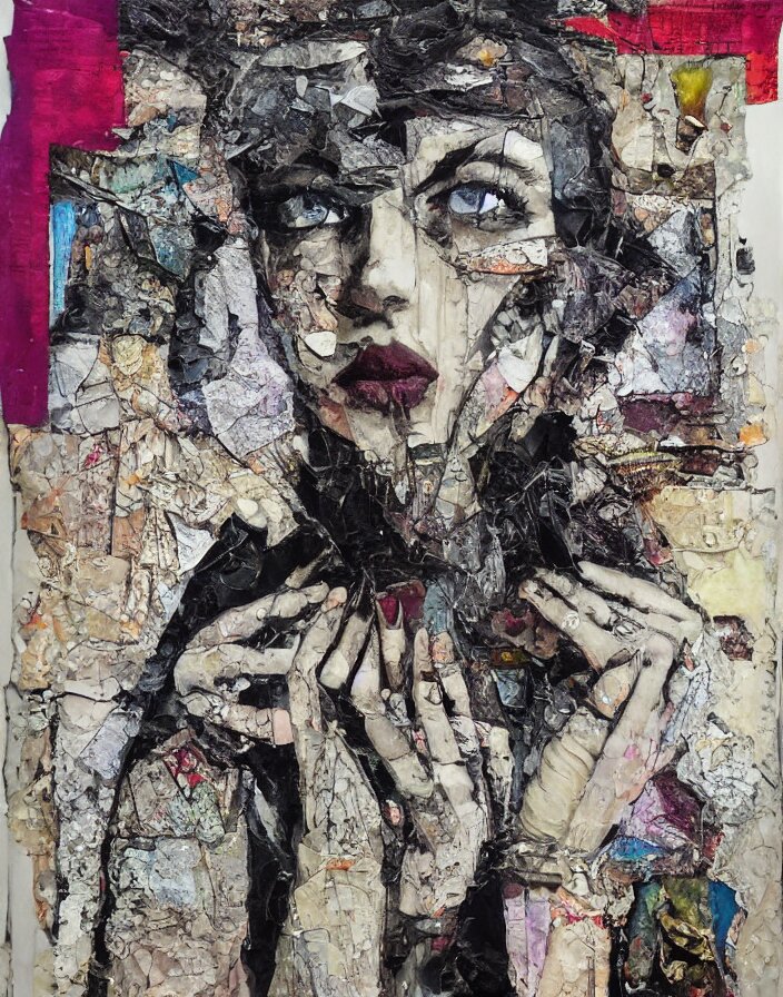 Decadent symmetry detailed analogue mixed media collage with canvas texture in style of contemporary art, punk art, hyperrealistic beautiful face, photorealistic, expressionism, masterpiece, perfect composition, spectacular quality torn paper, intricate oil details, broken glass