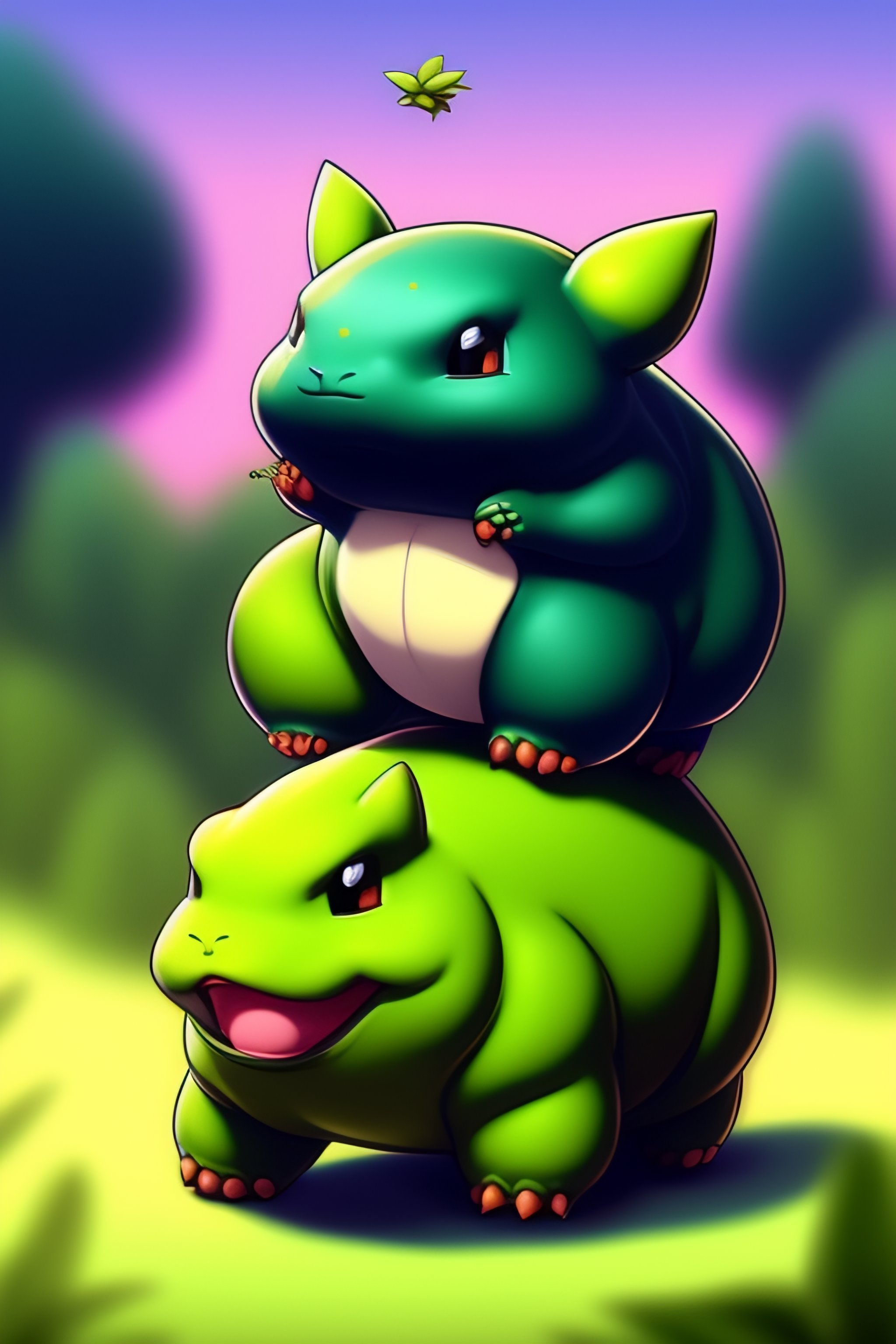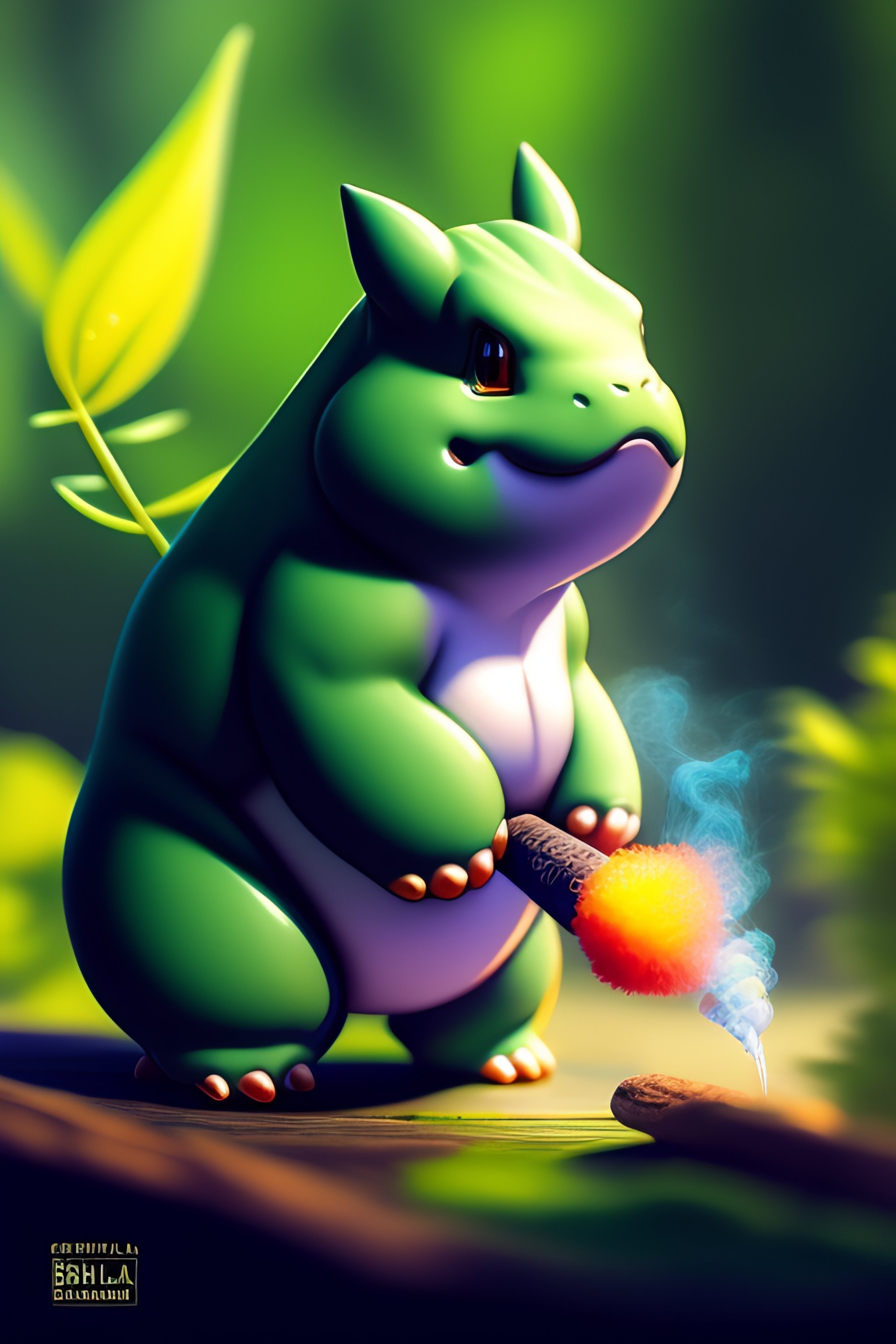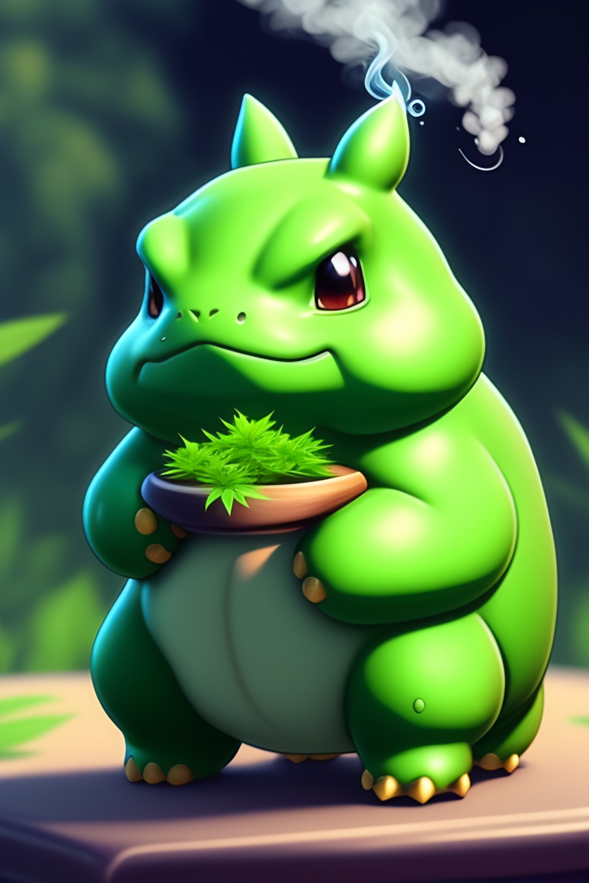 Bulbassaur from pokemon art with a weed plant on its back smoking a joint