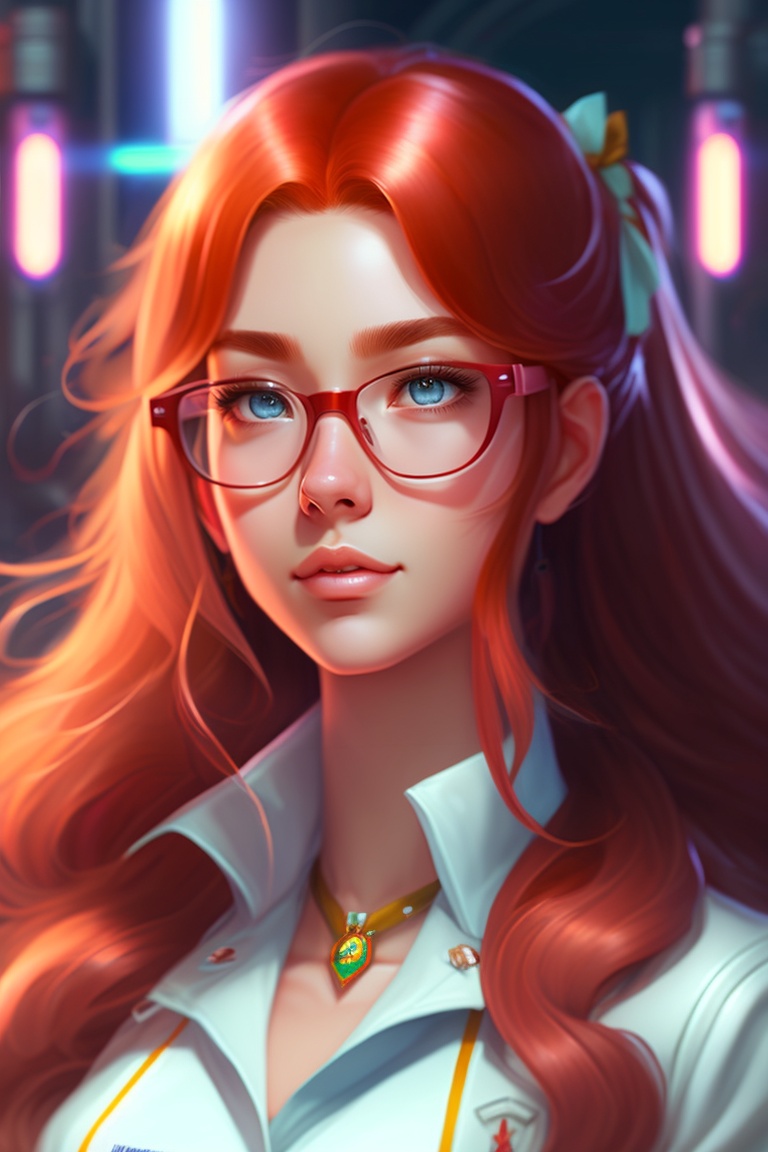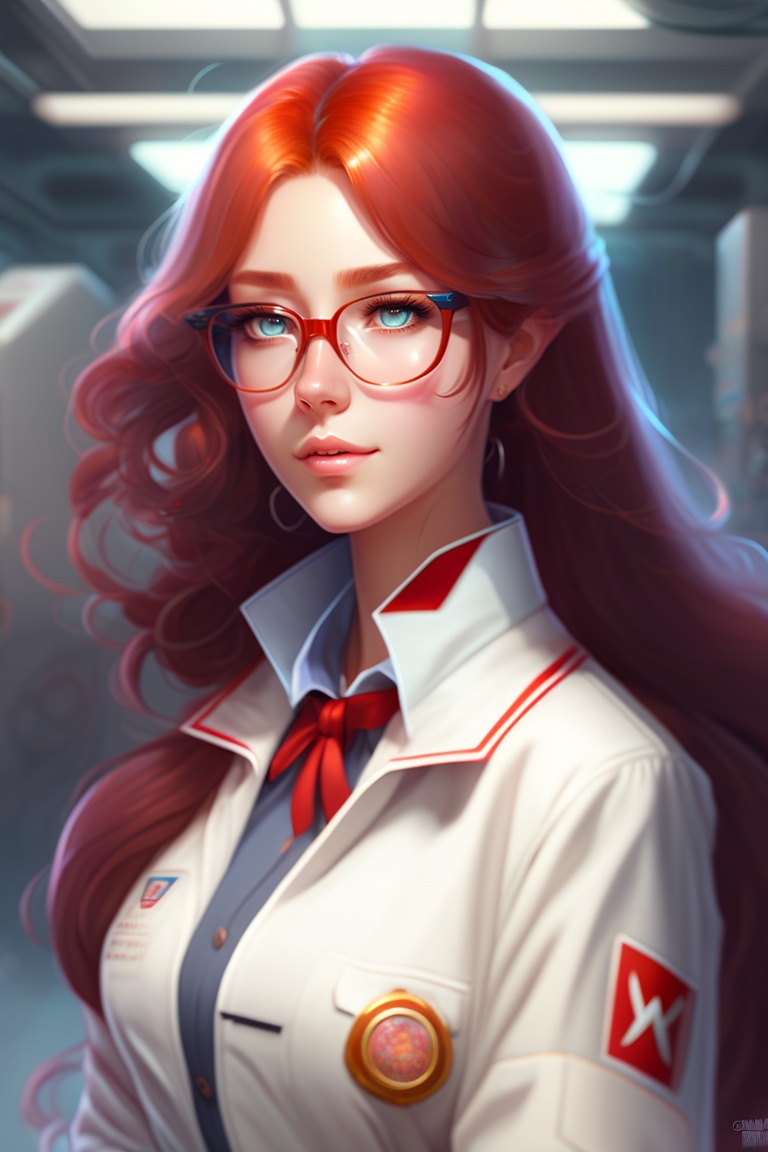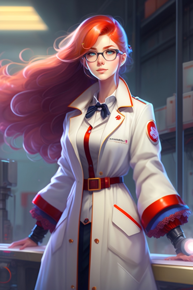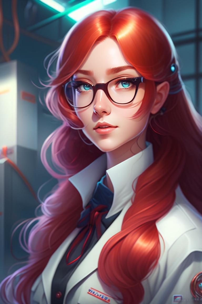 Beautiful anime girl with long red hair, wearing lab coat and glasses, super mario cloth, standing inside a research facility, character portrait, 1 9 6 0 s, long hair, intricate, elegant, highly detailed, digital painting, artstation, concept art, smooth, sharp focus, illustration, art by wlop, charlie bowater and alexandra fomina