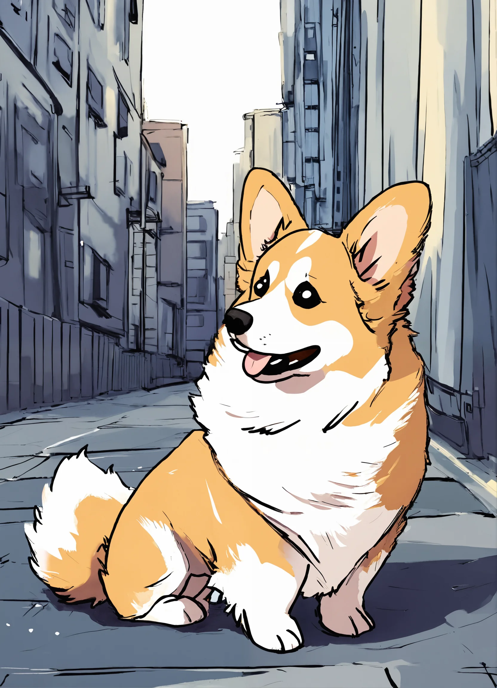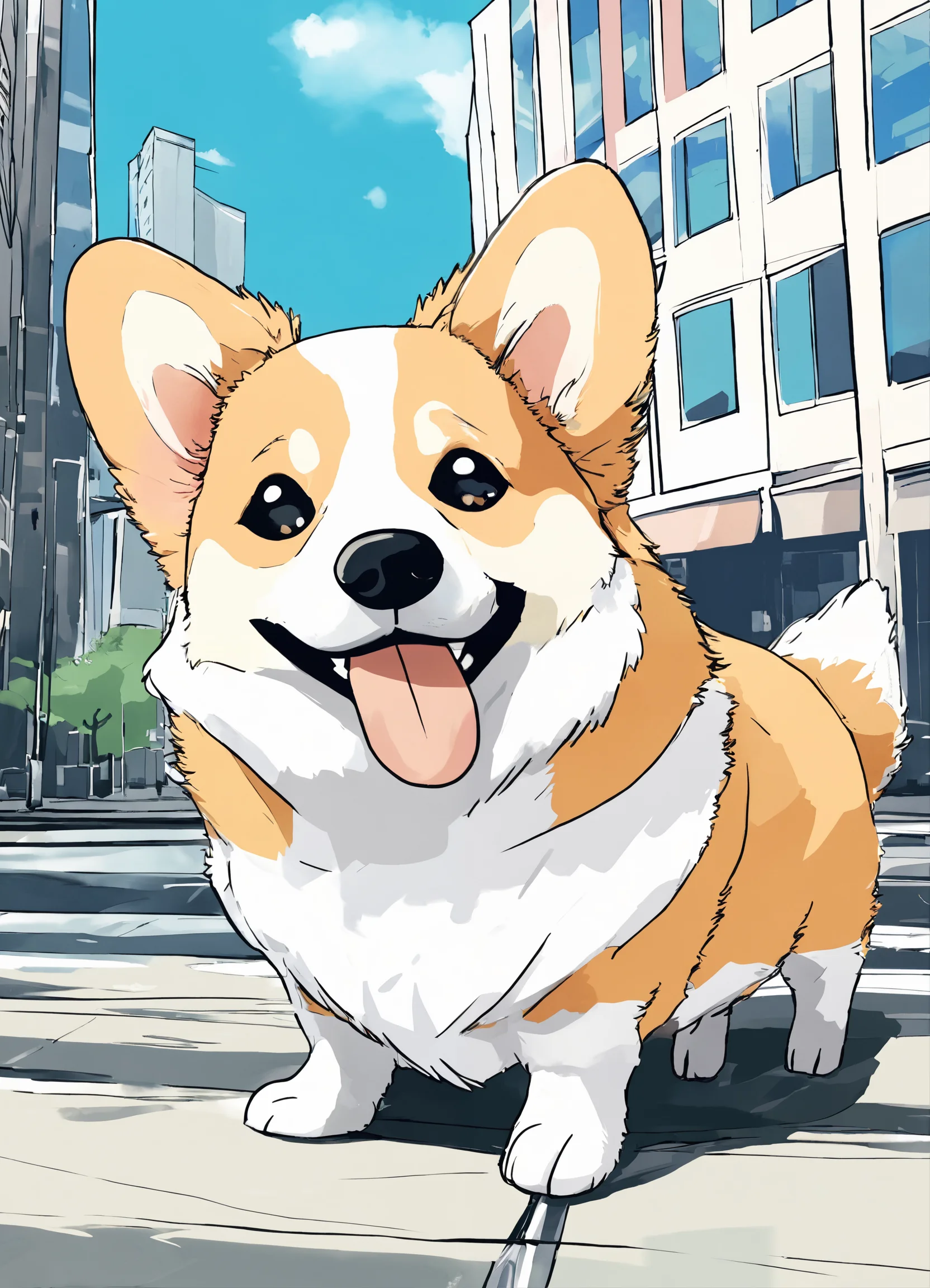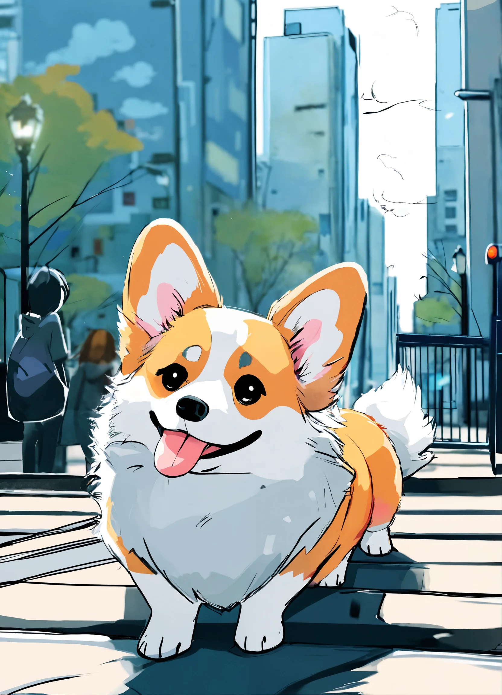 Cute fluffy corgi dog in the city in anime style