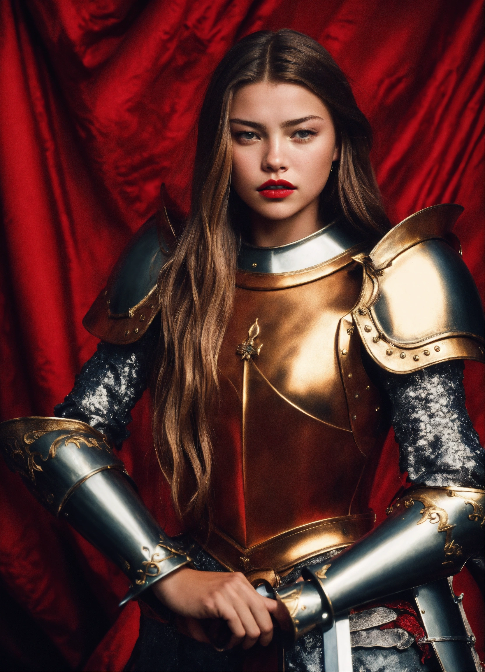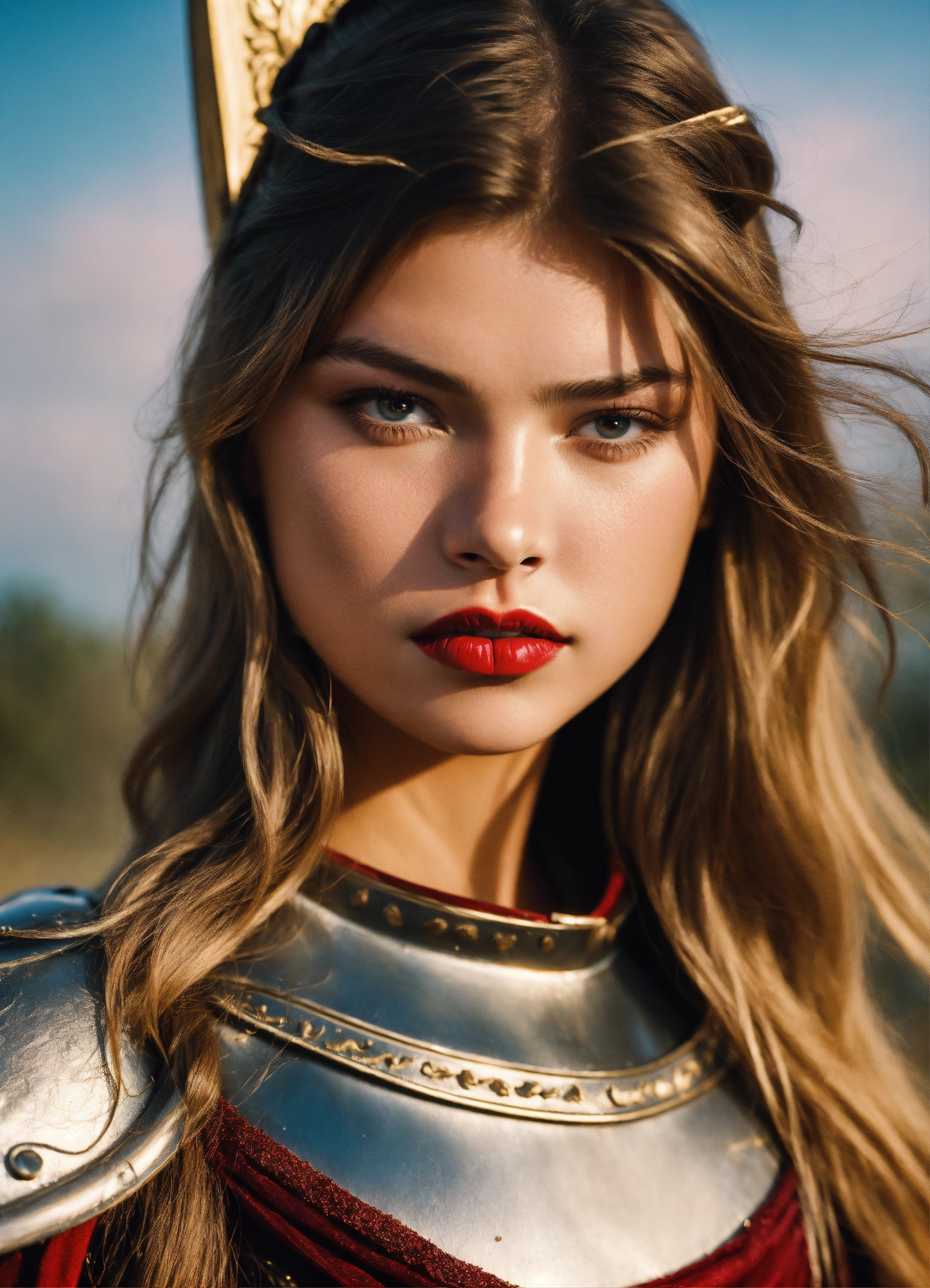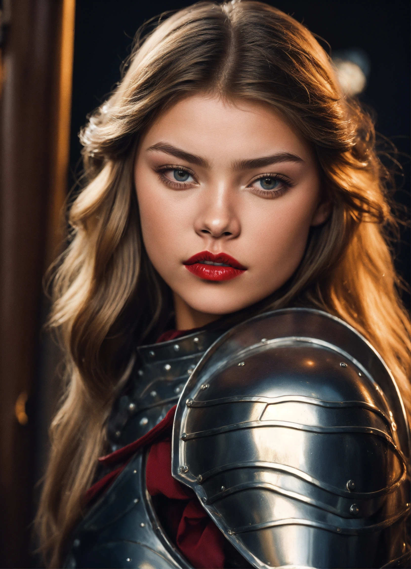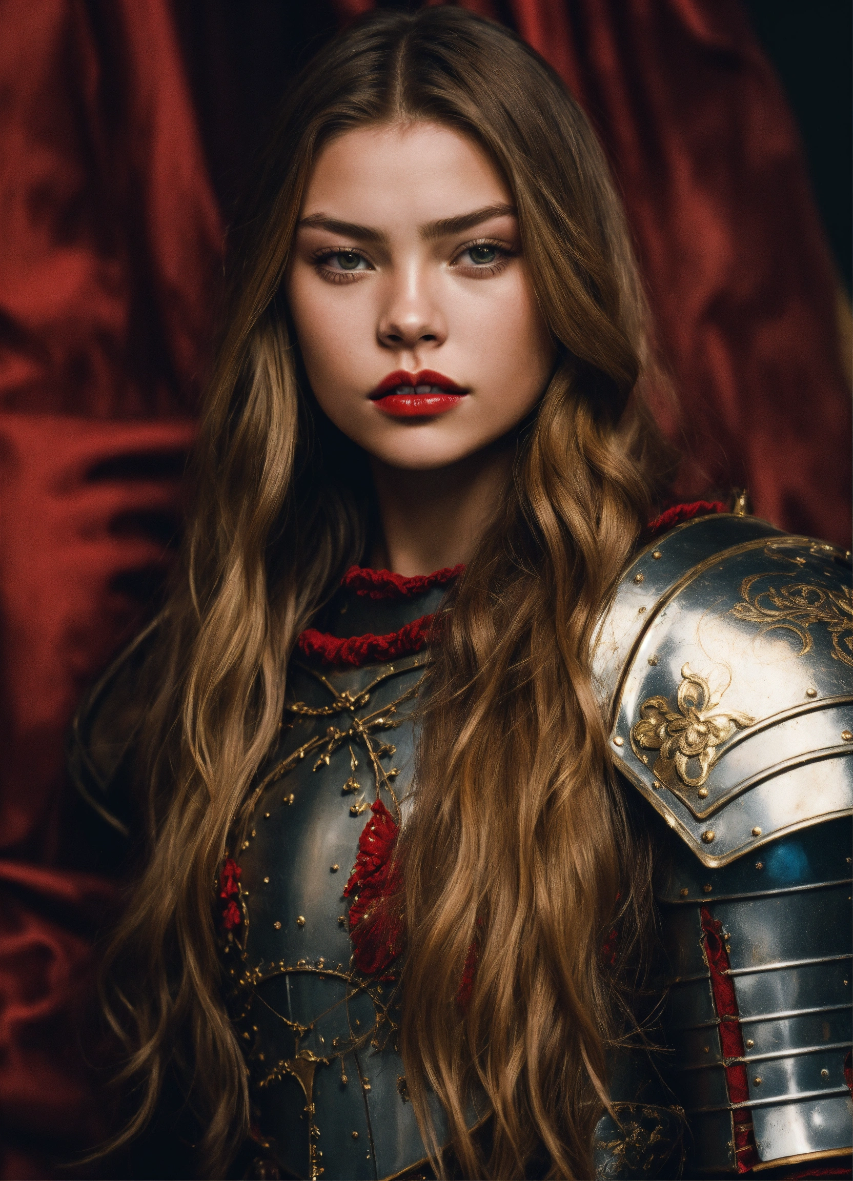 Photo quality color portrait of young beautiful thylane blondeau as a heroine knight in armor with flowing hair and red lips and stern expression