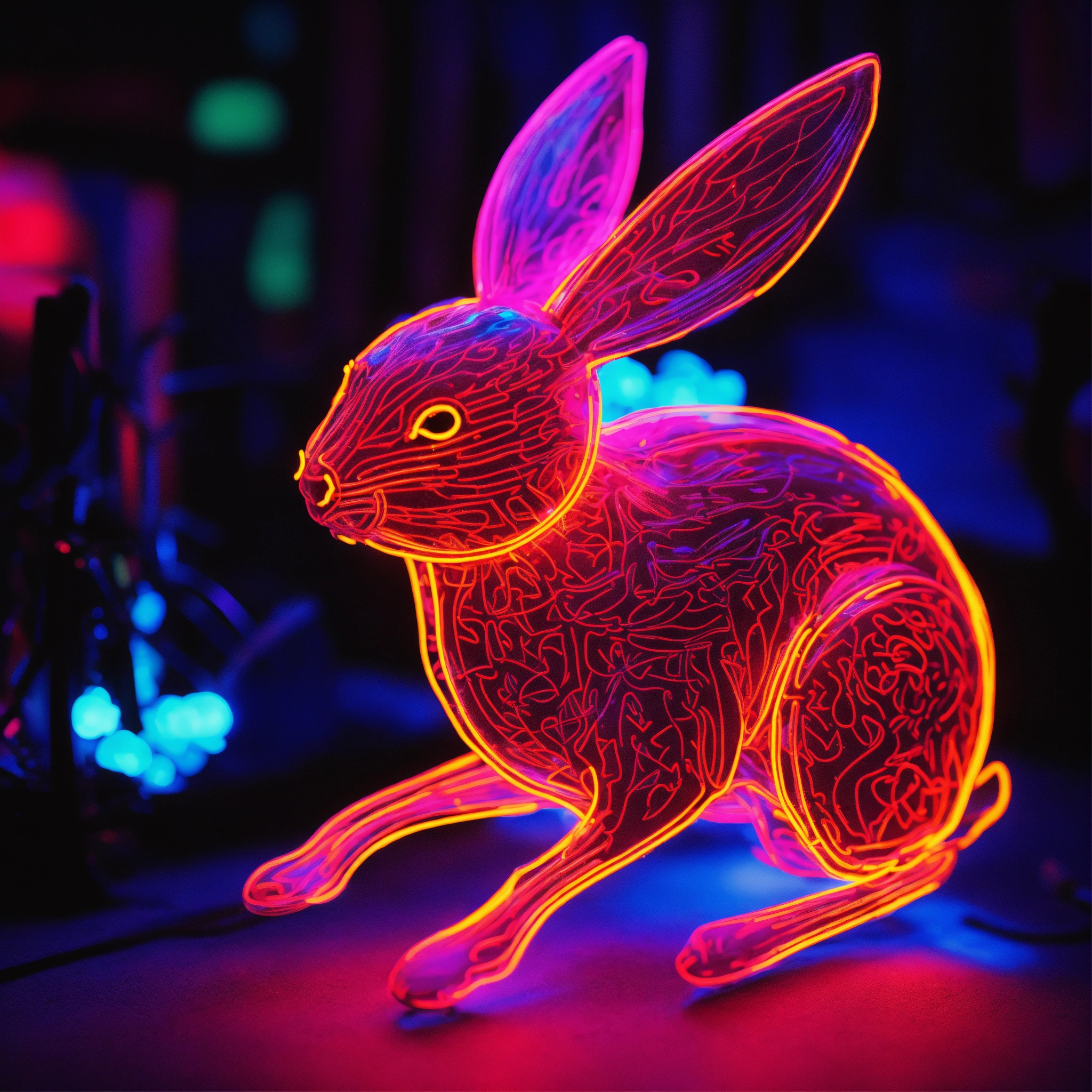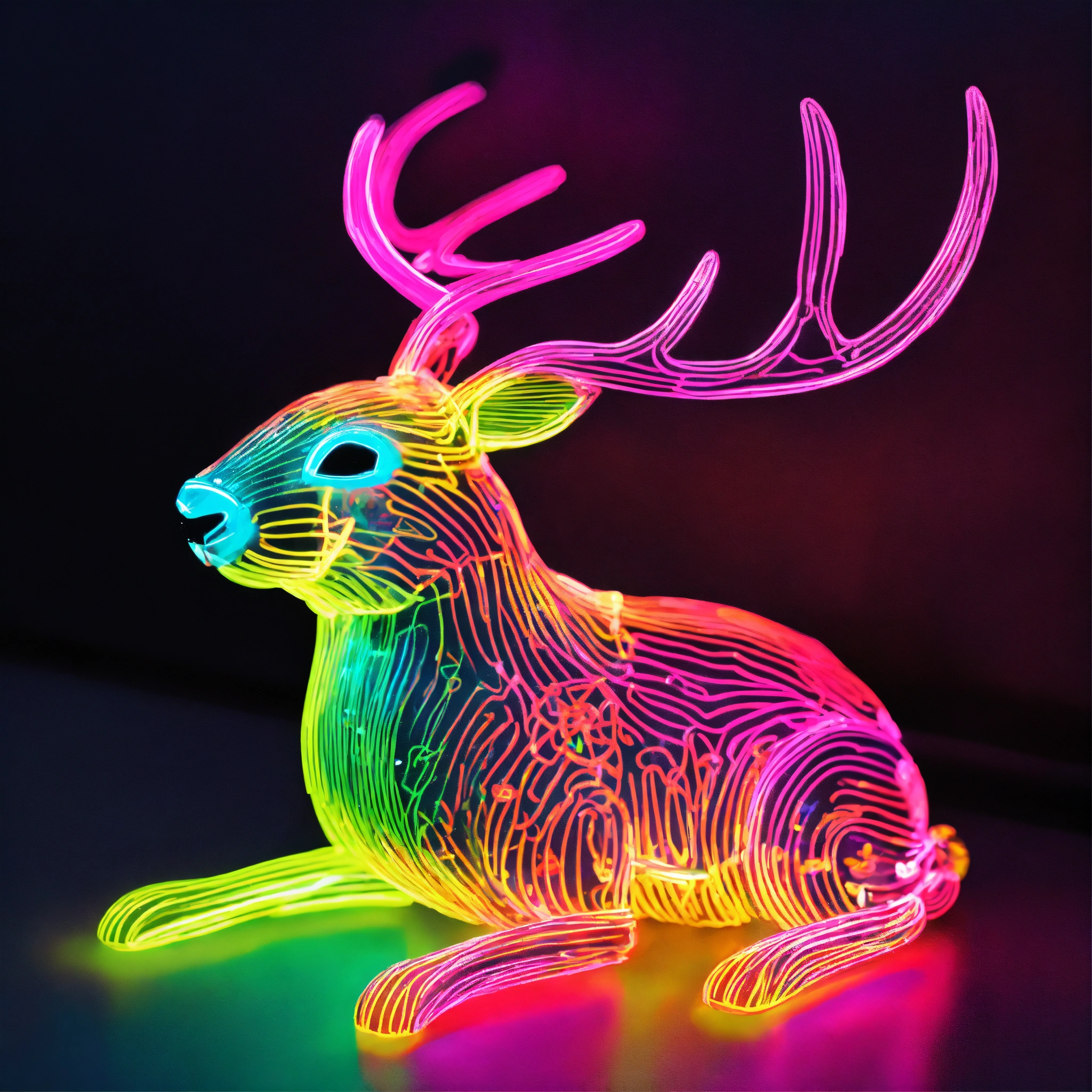 A neon bioluminescent rabbit with antlers that is luminescent