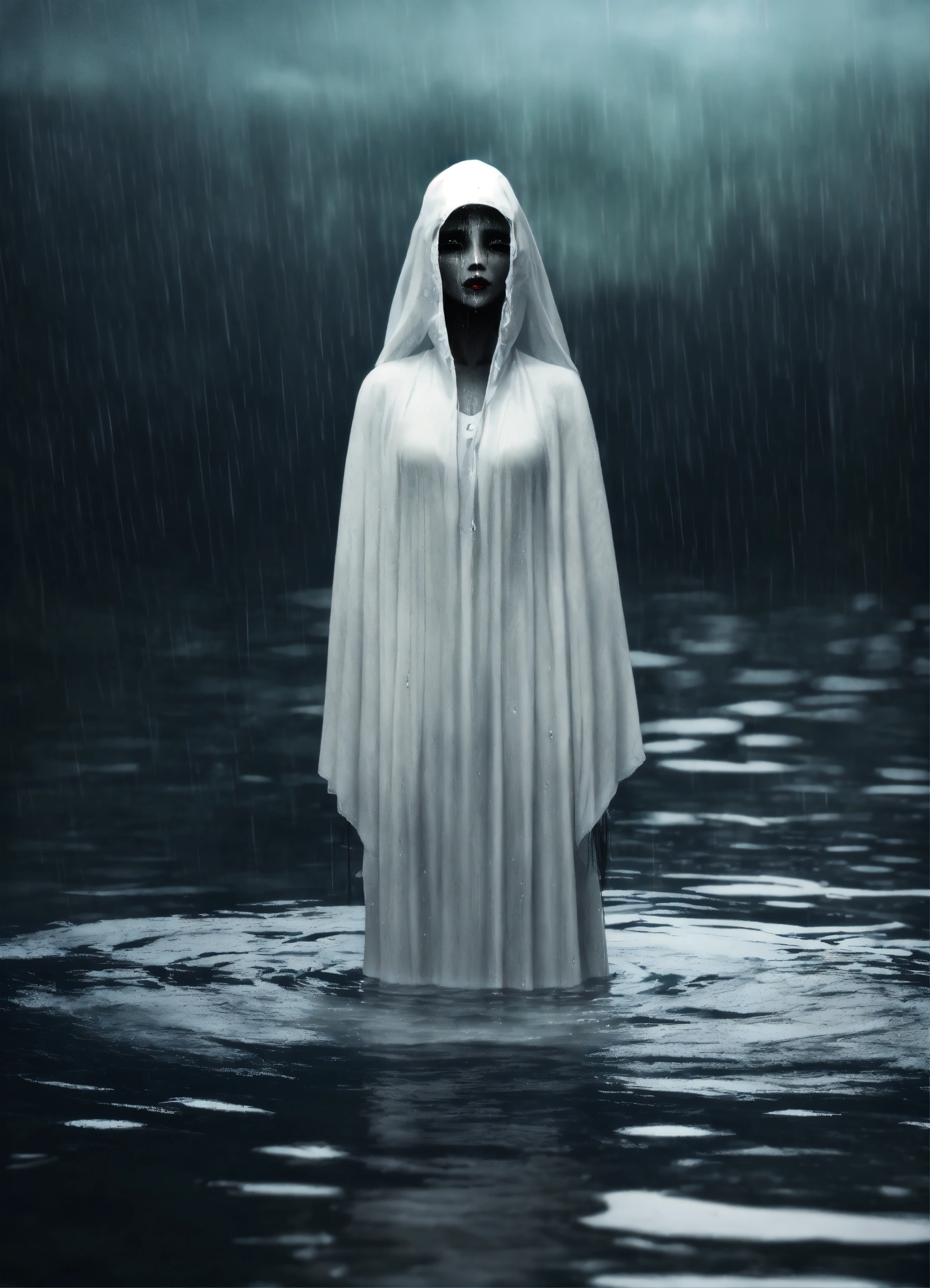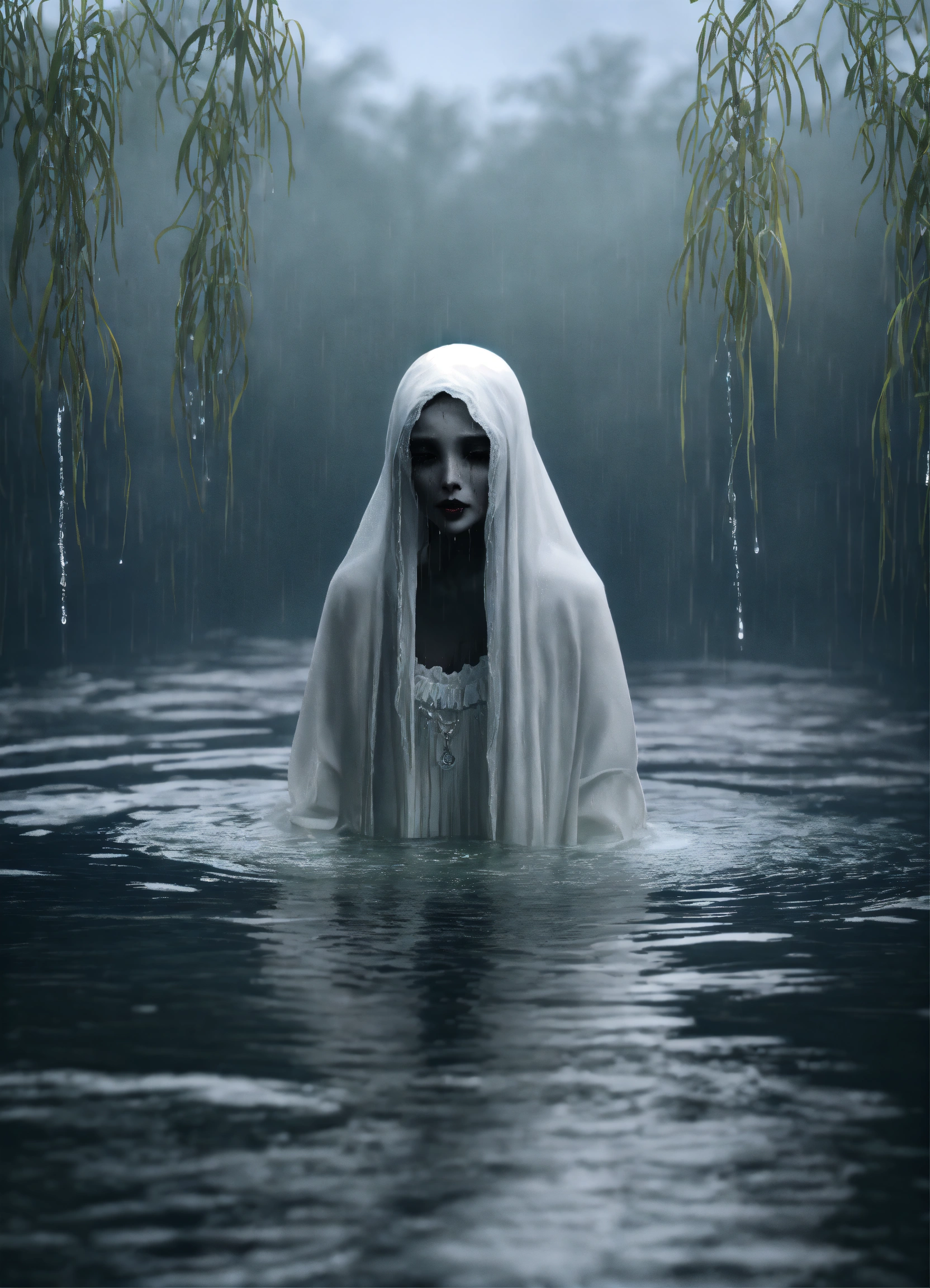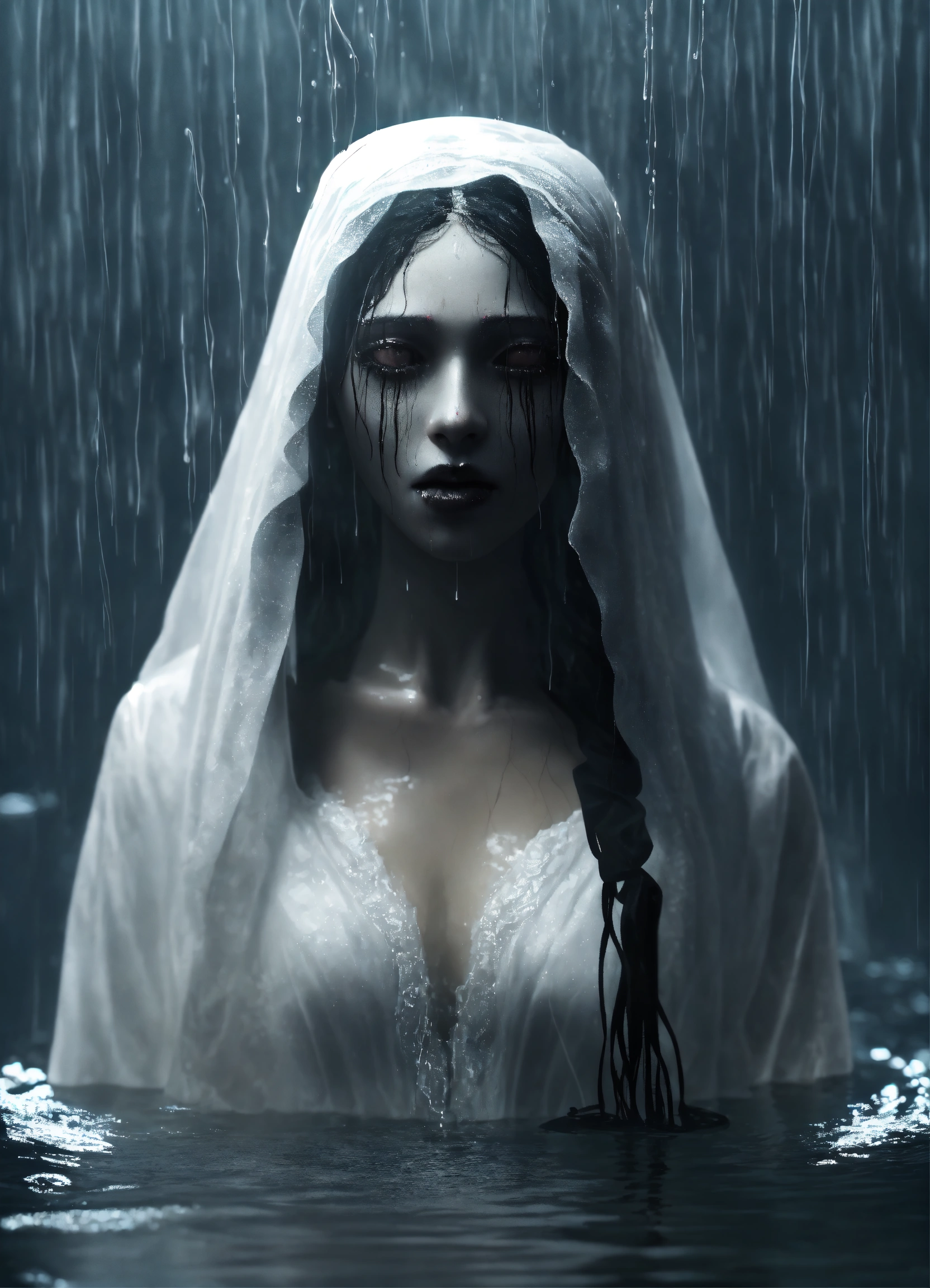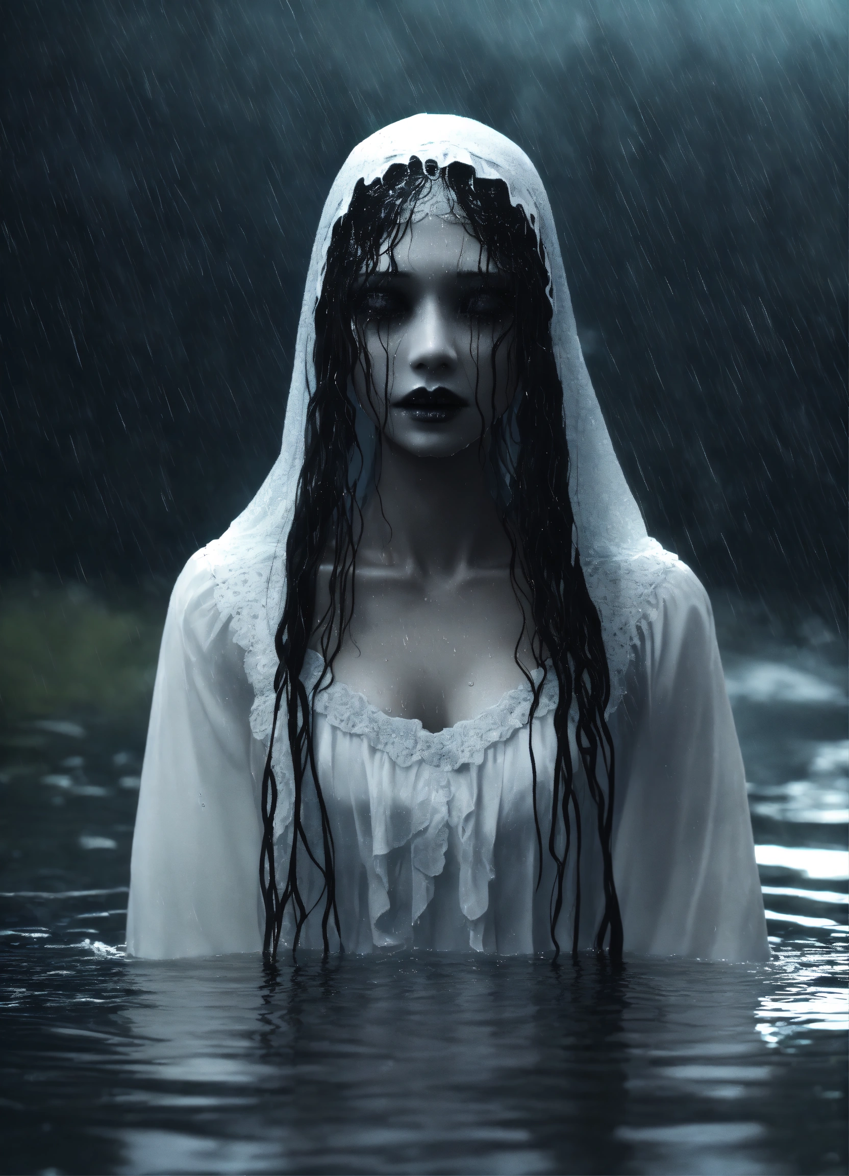 A scary la llorona in white in water. only the head and shoulders peep out of the water. she has no eyes, only black. she has black lips. she is wet. 3d model. dark. mist. rain