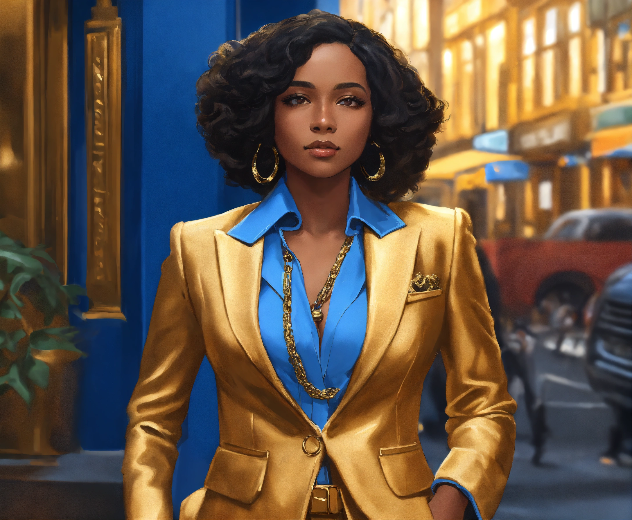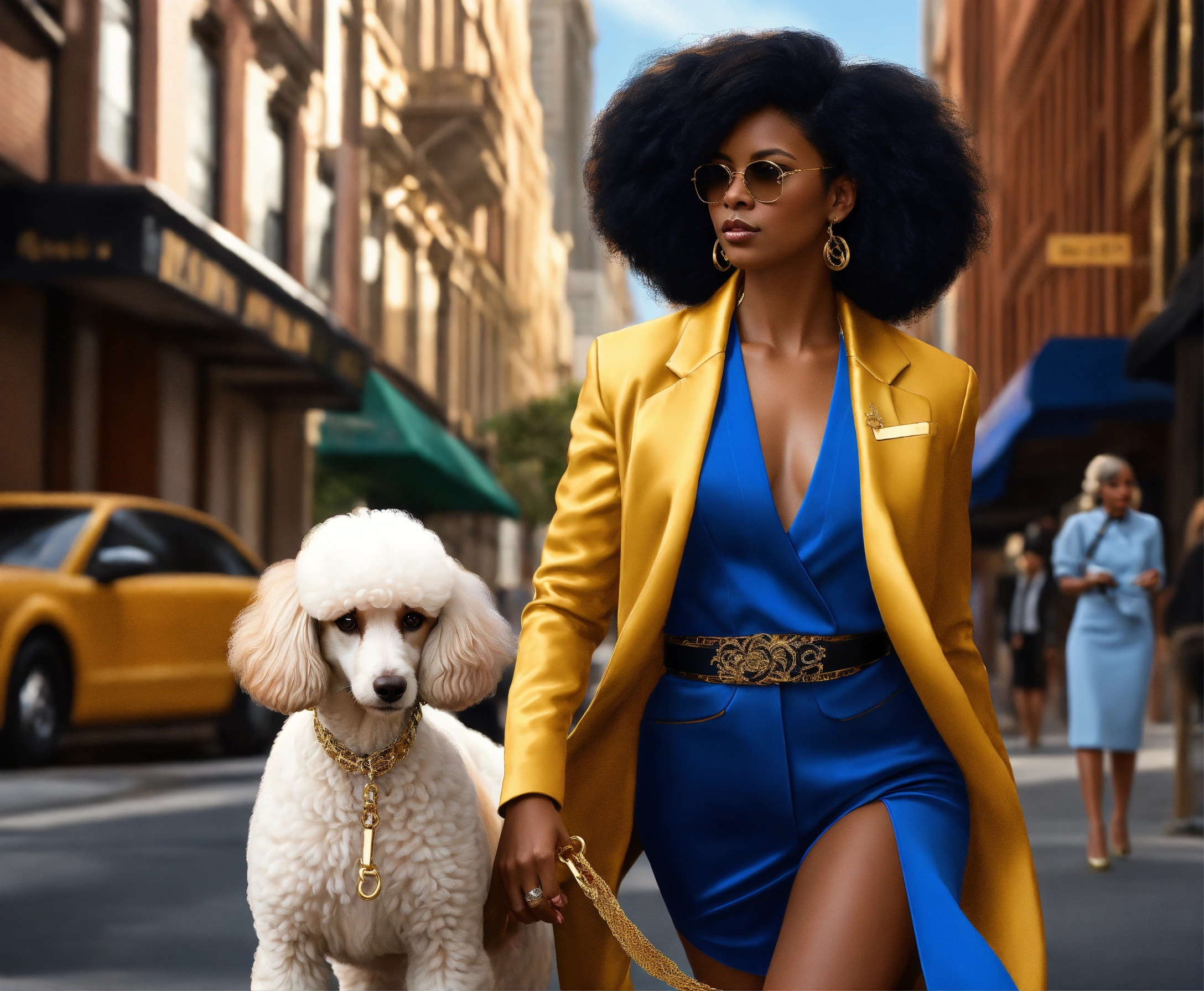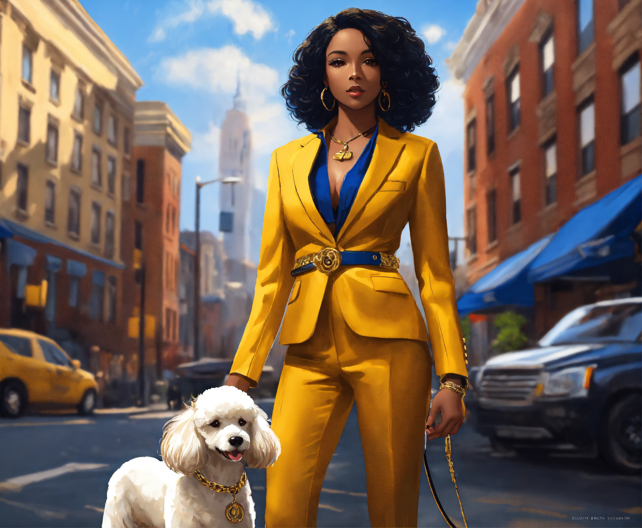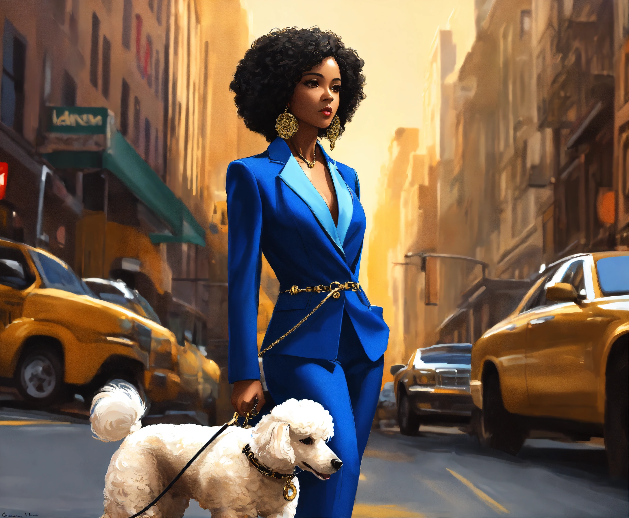 Solo beautiful cocoa brown skinned business woman with black hair, with white poodle on gold leash, in blue or gold suits, in harlem full body, intricate, elegant, highly detailed, digital painting, concept art, art station, smooth, sharp focus