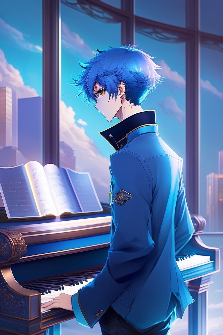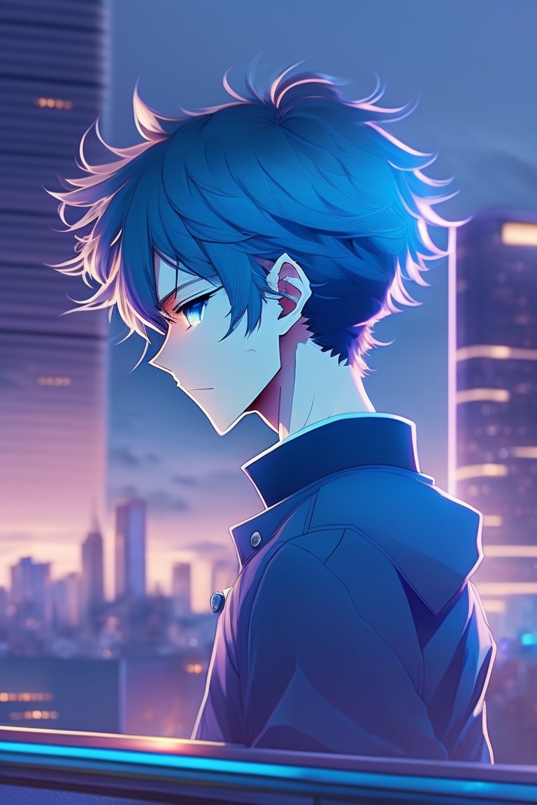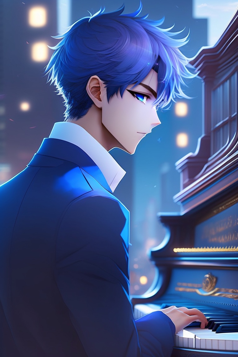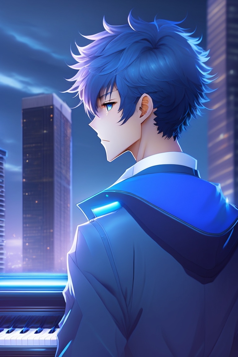 An anime boy strikes a pose in front of a moody cityscape, his hair a deep shade of blue and his eyes sharp and confident. as the camera captures the moment, the soft melody of a piano playing in the background creates a sense of contemplation and introspection.