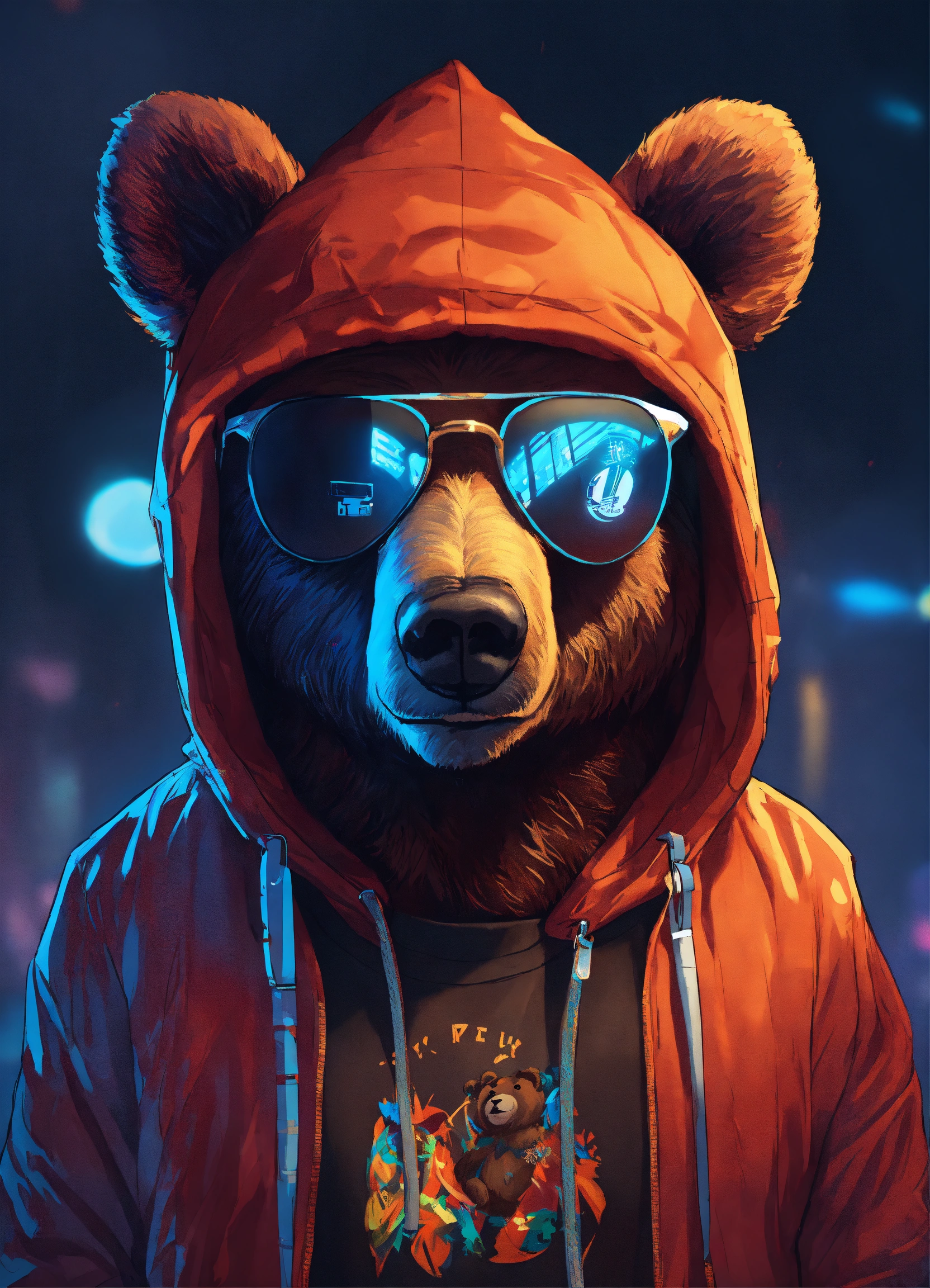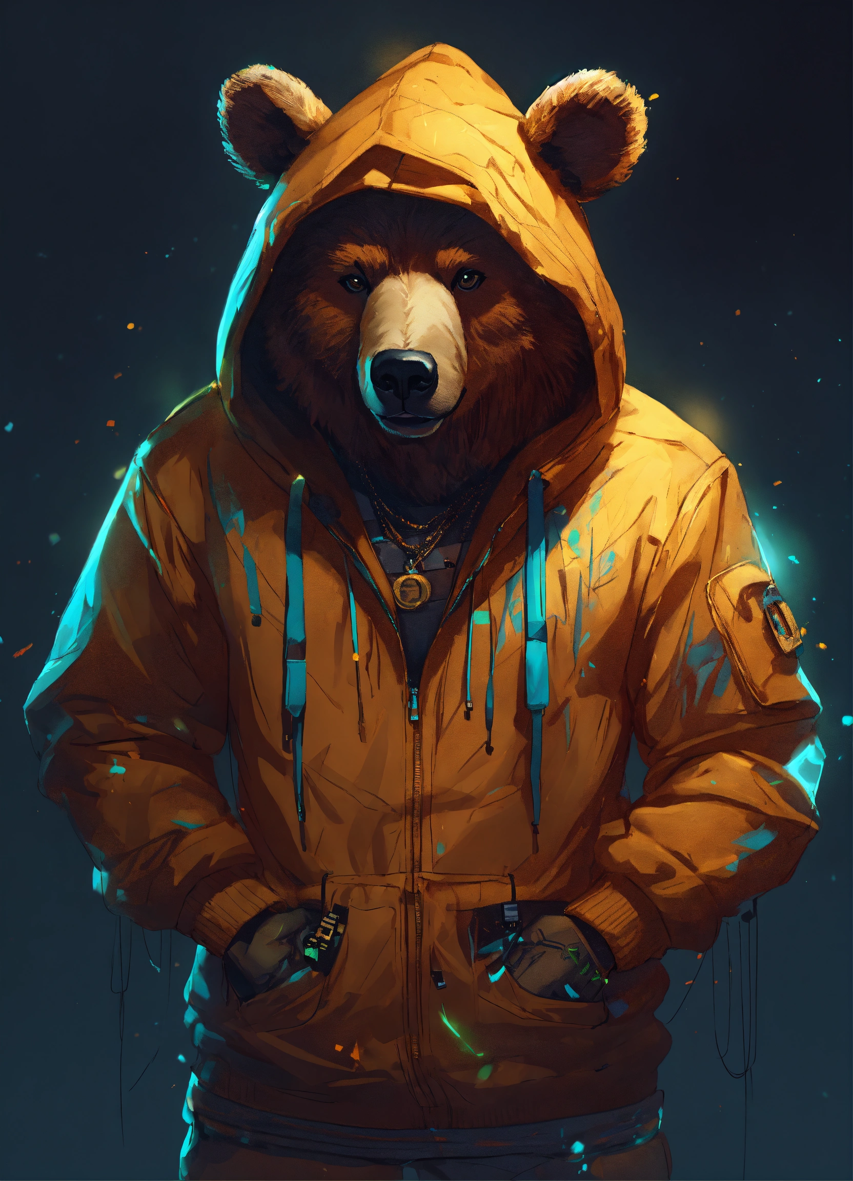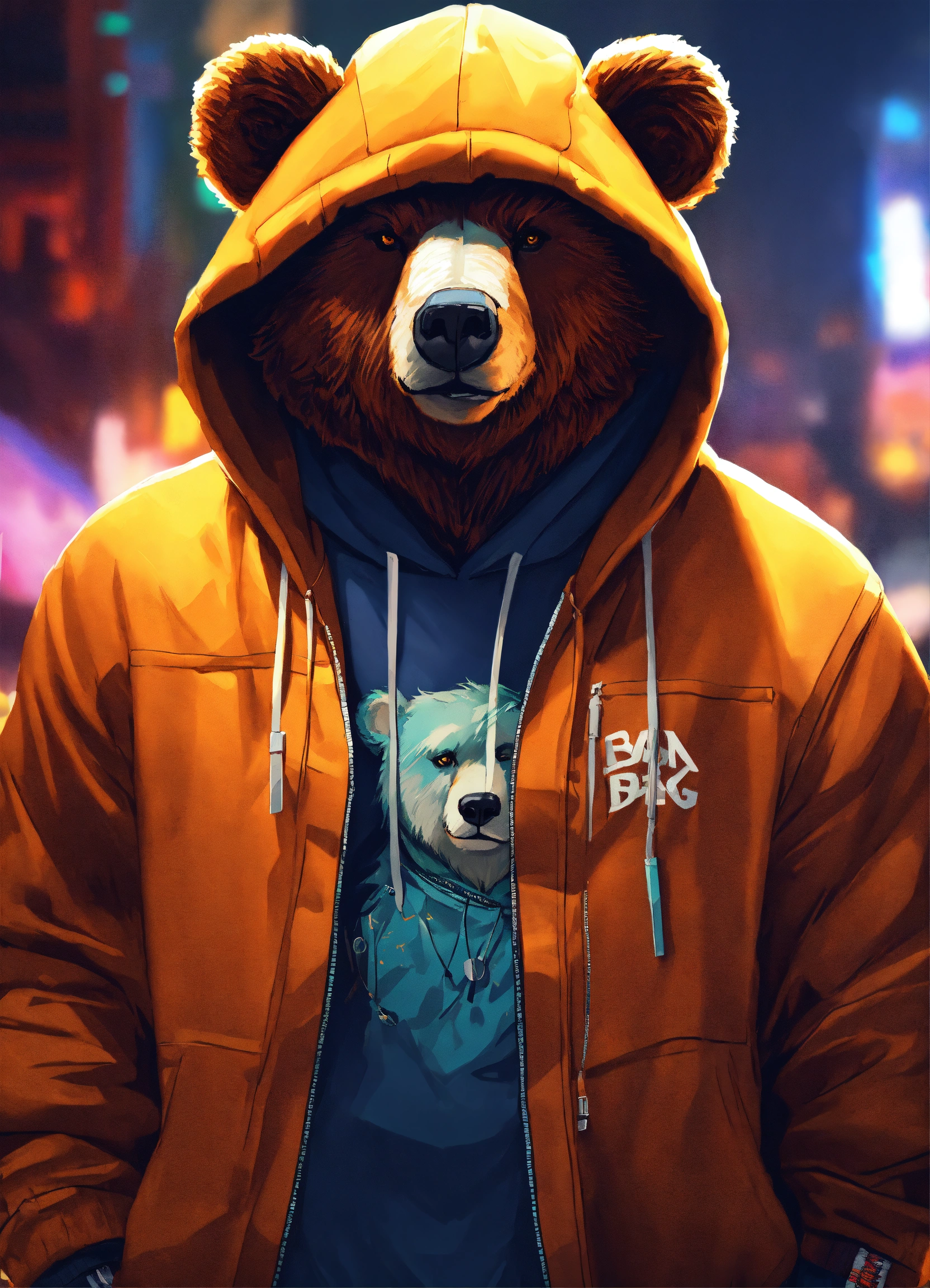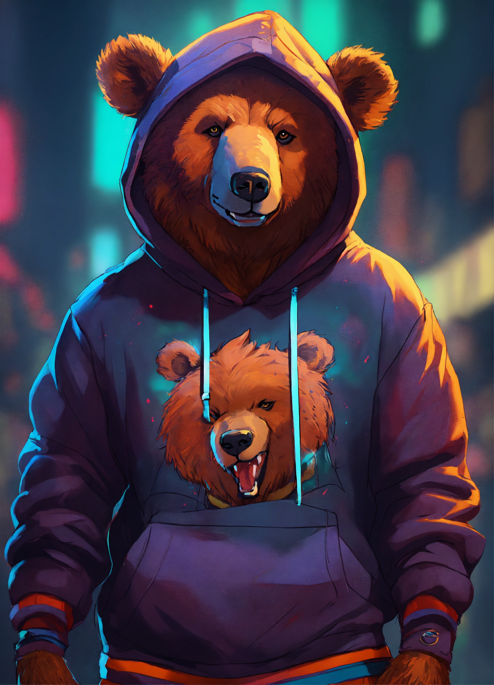 Anthro humanoid bear, hoodie, hip-hop, character concept design, digital illustration, detailed, vivid, trending on artstation, 8k, detailed lighting