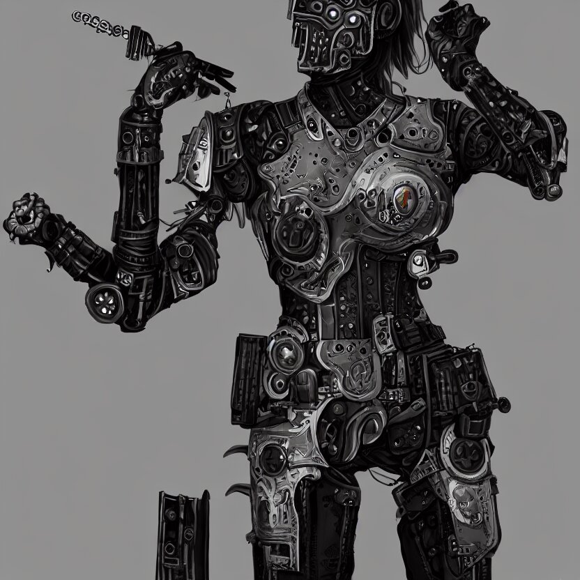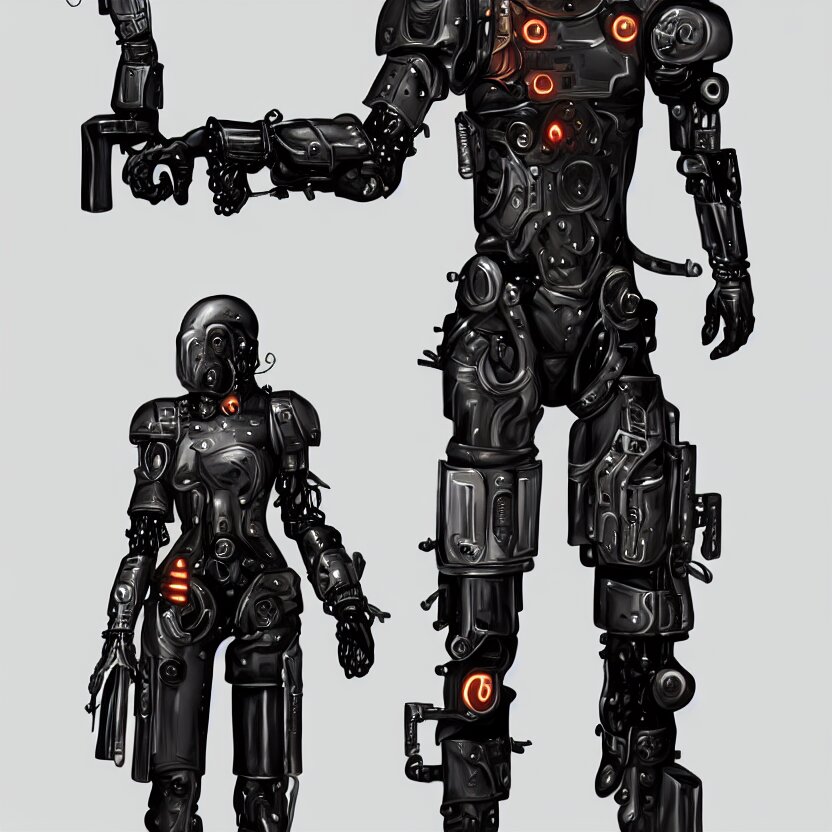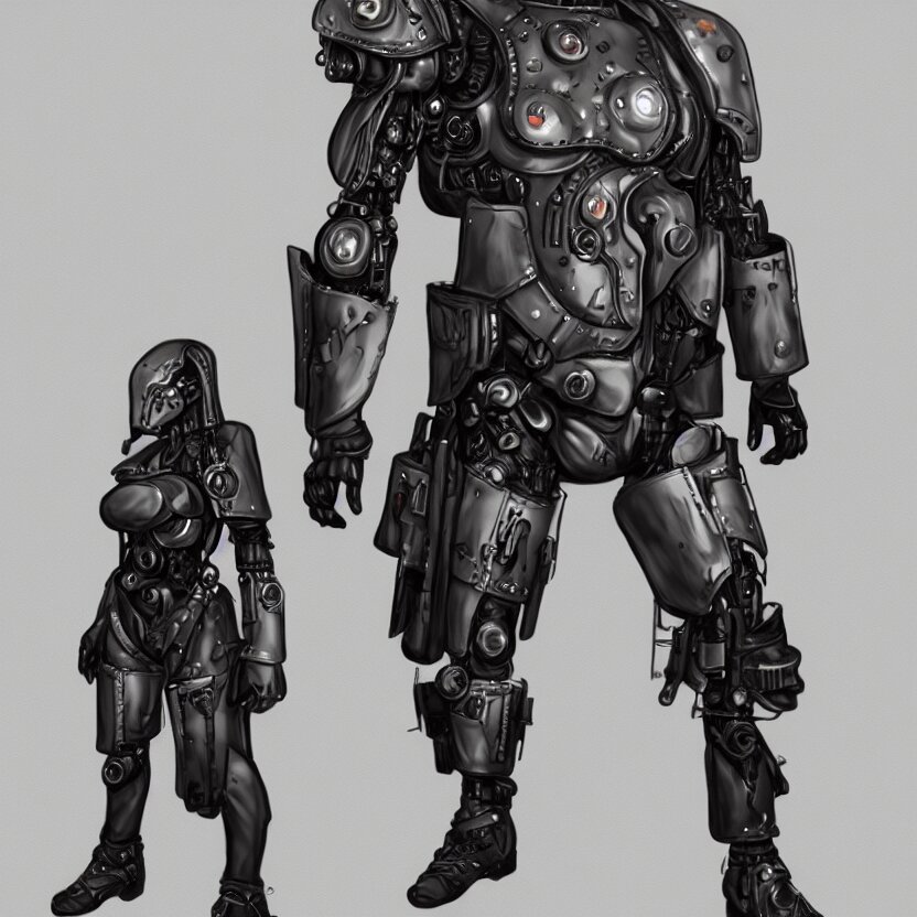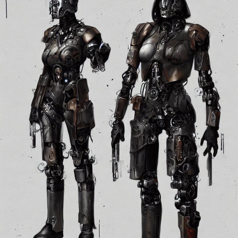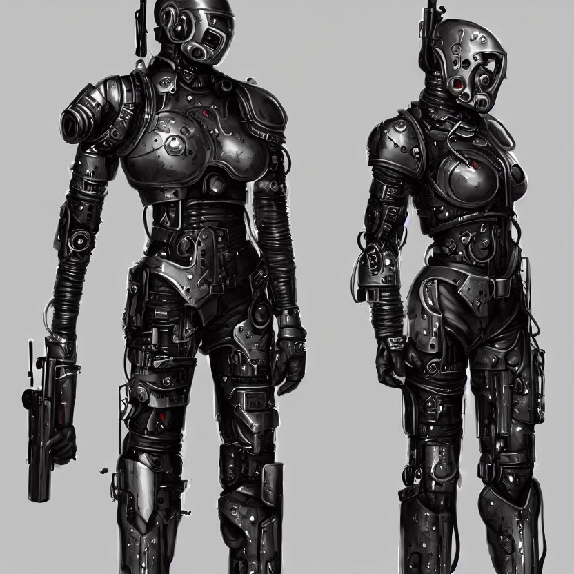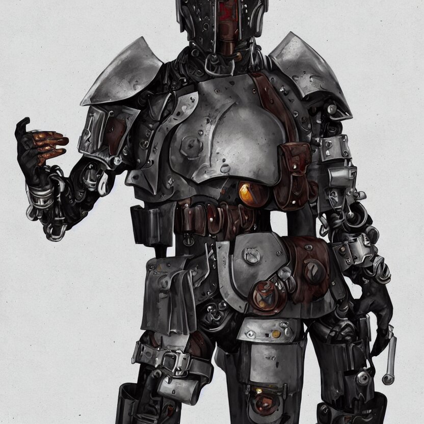 A cyborg bounty hunter, leather straps and metal armor, led buttons, trench coat, holstered pistols, art by dan luvisi, trending on artstation, 8 k