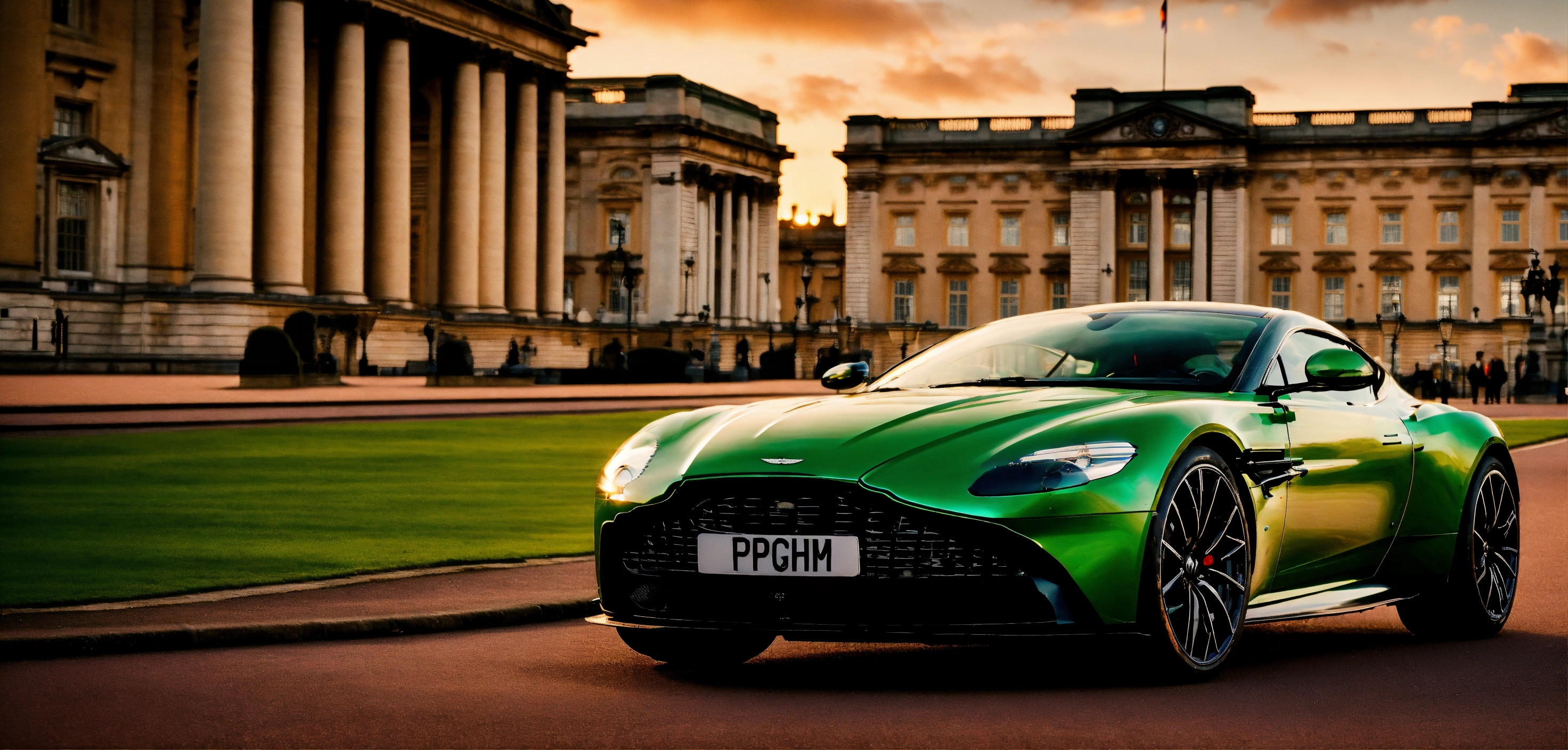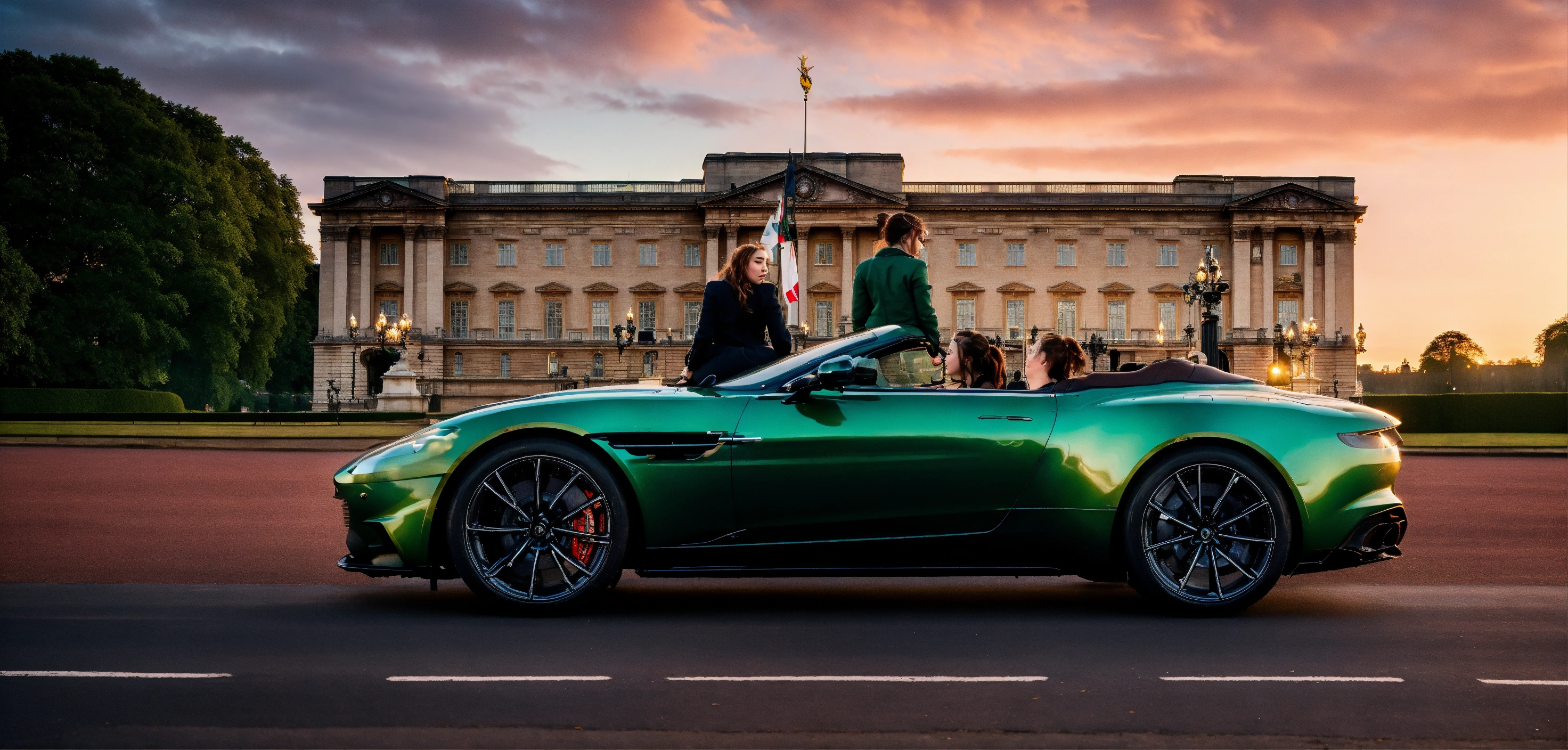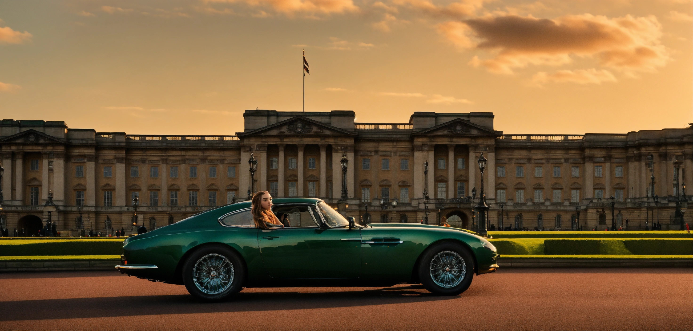 Florence pugh sitting on a racing green aston martin in front of the buckingham palace, at sunset, far long-distance cinematic shot