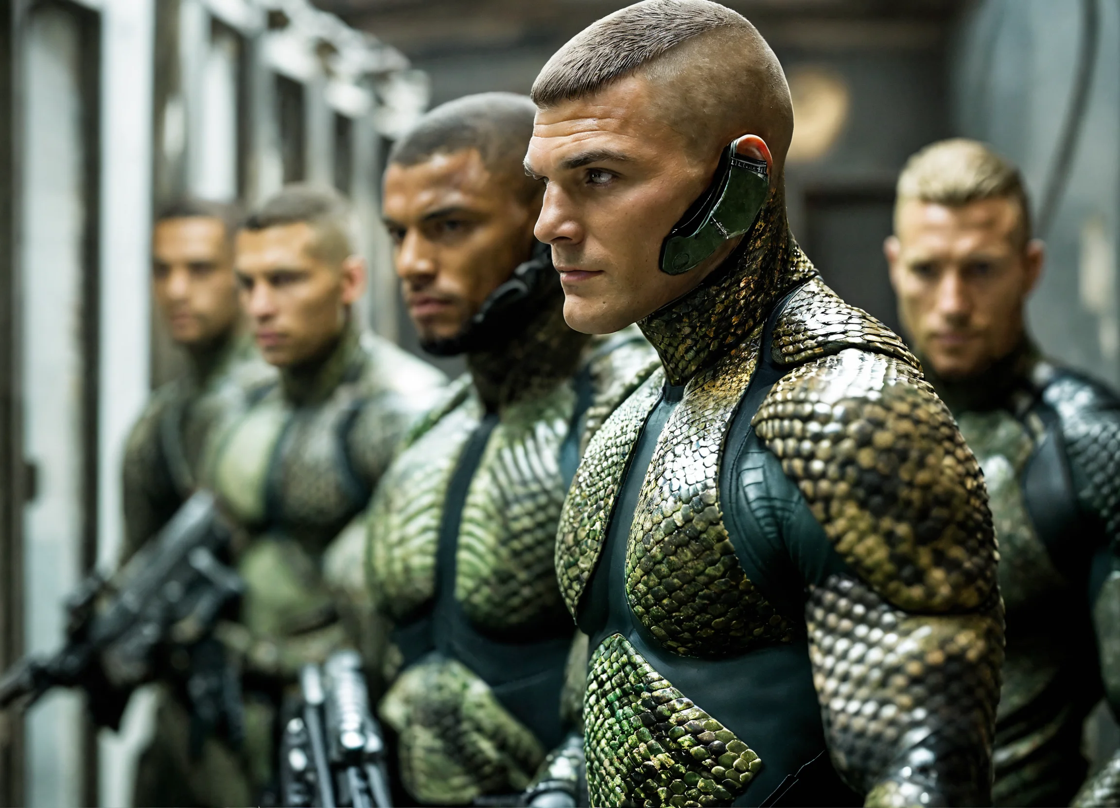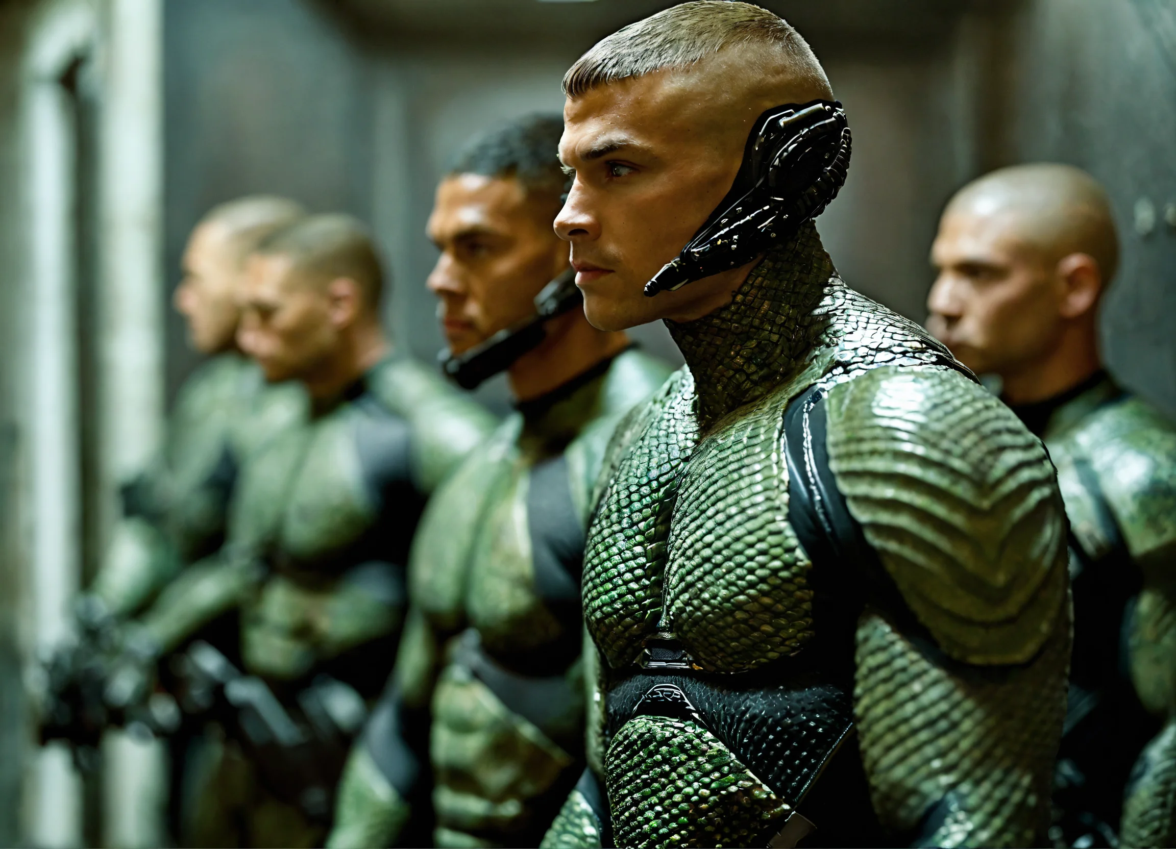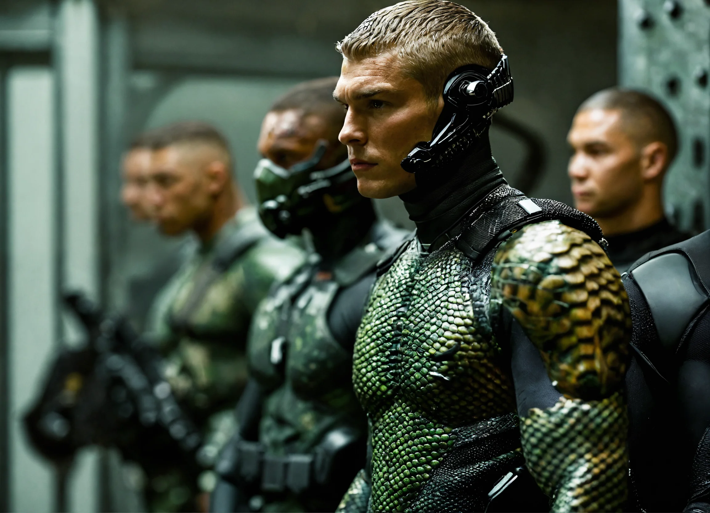 Beautiful guy, alien, wetsuit, fullsuit, scaleskin, snakeskin, snake skin, camouflage, aquaman, six packs, muscular, army, commando, soldiers, marines, short hair, buzzcut, locker room, combat diver, three men, team, master chief, alpha male