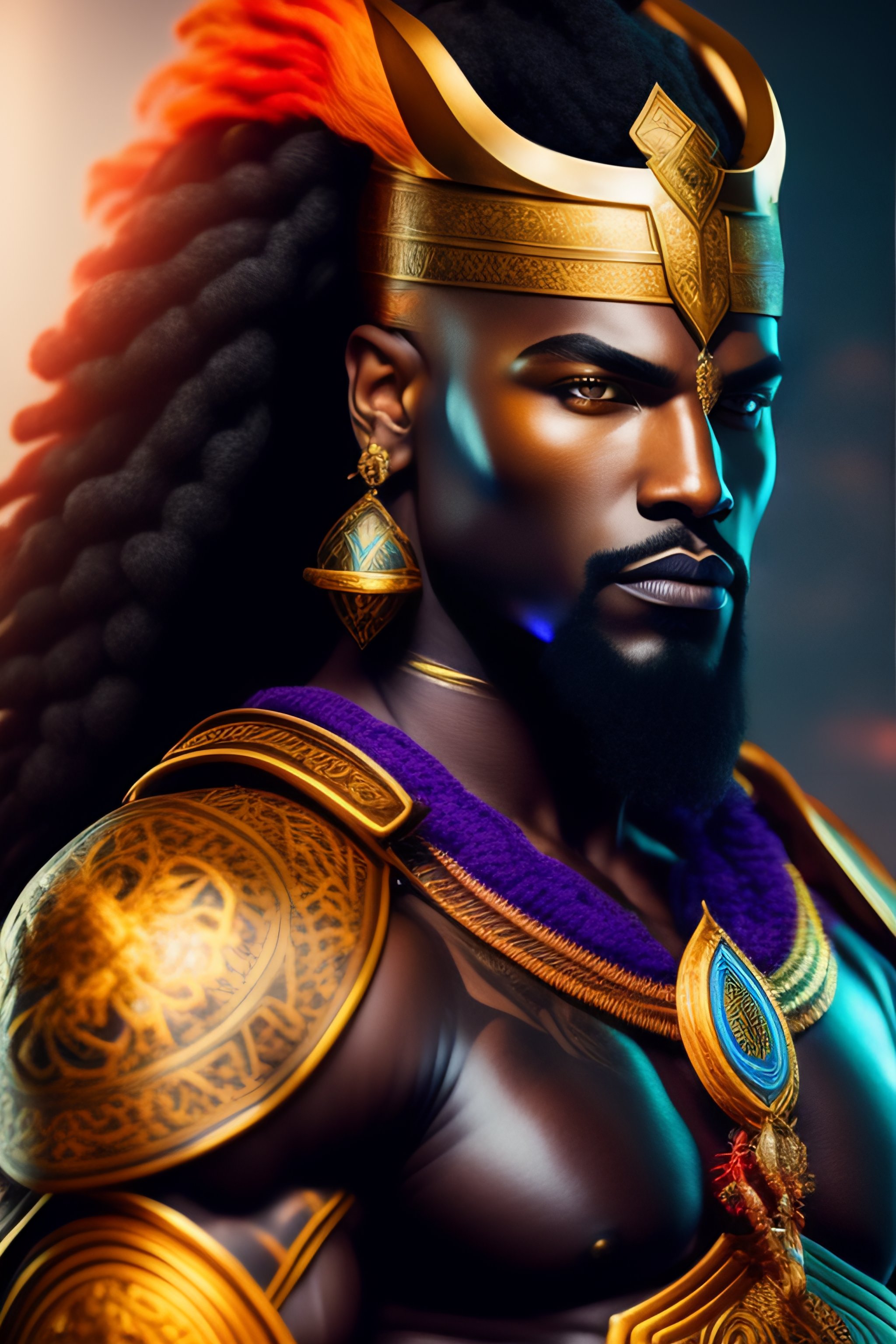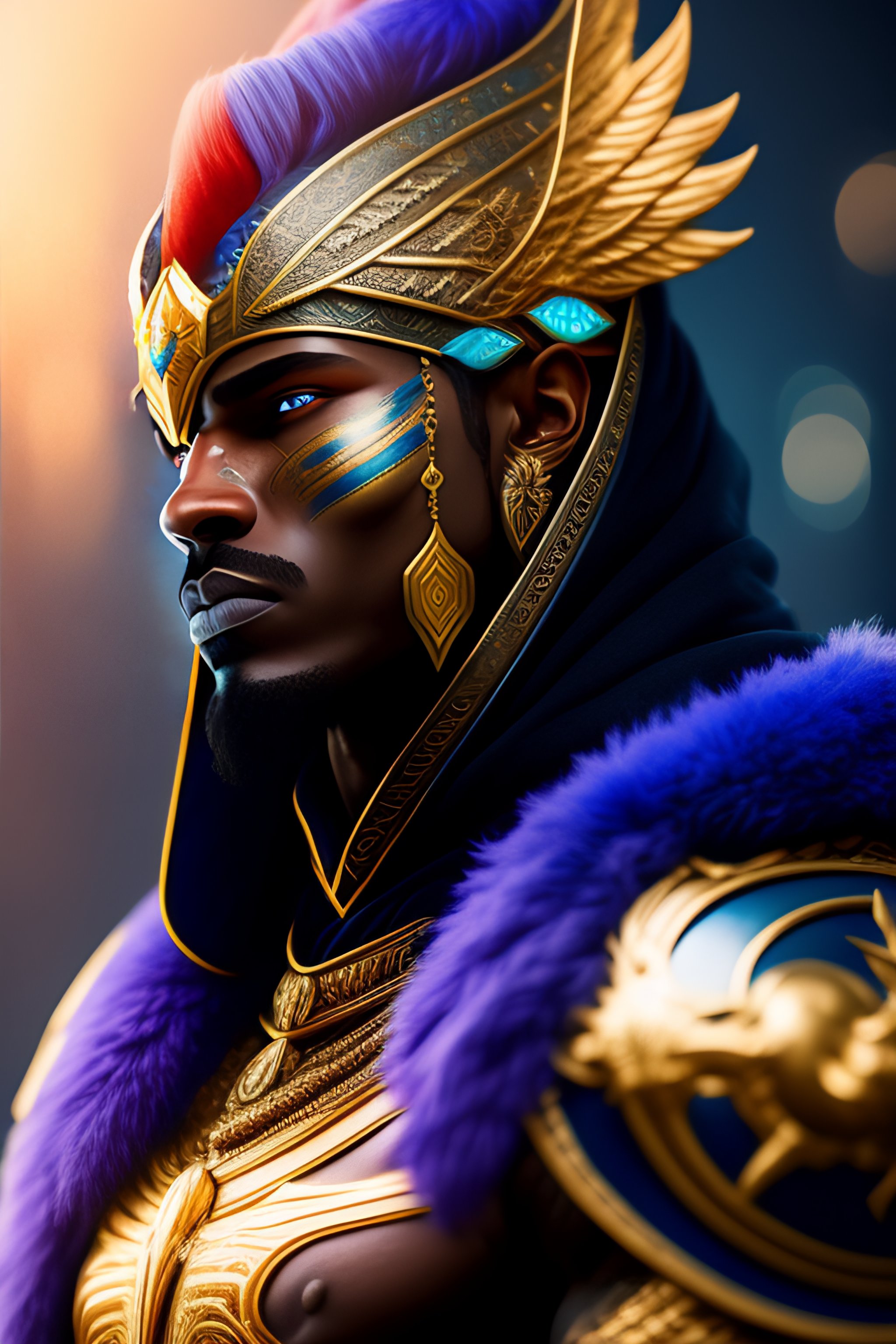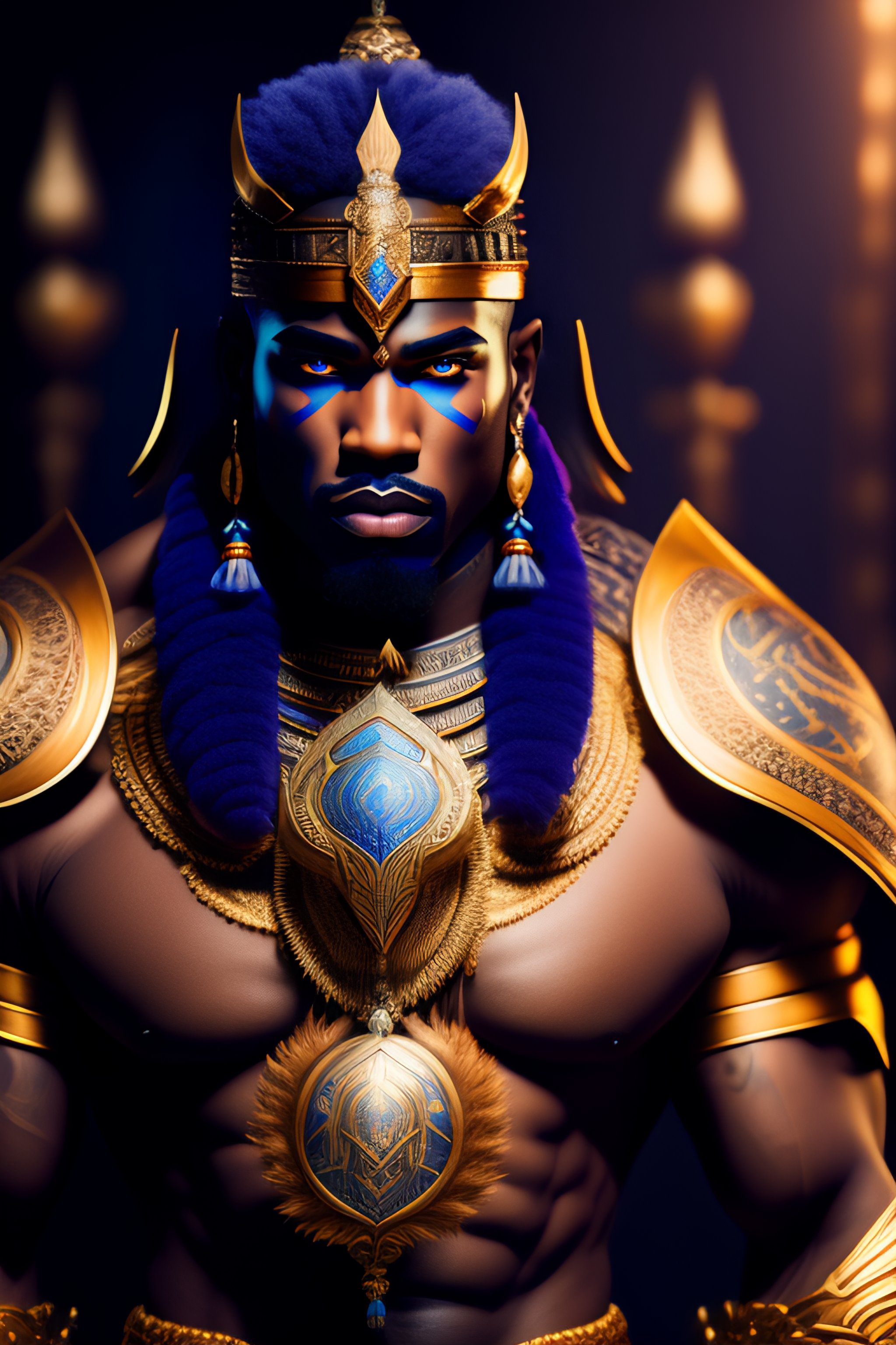 Highly detailed color portrait horus the god of war and sky, warframe, ancient tattoos on armour, intricate details, muscular build, mystical energy, diffused light, volumetric light, 4k
