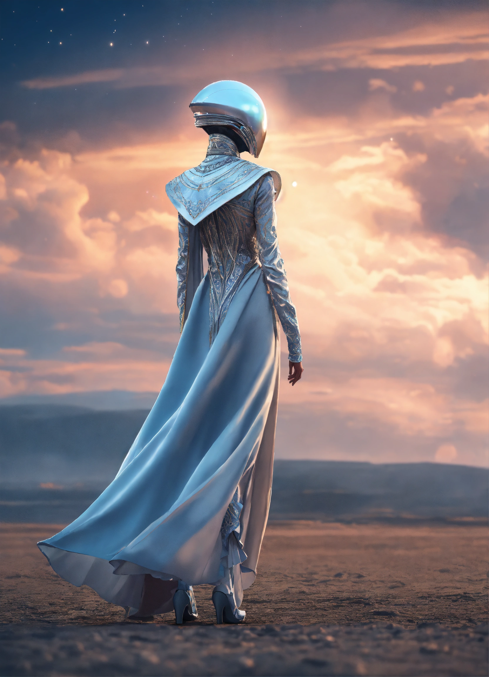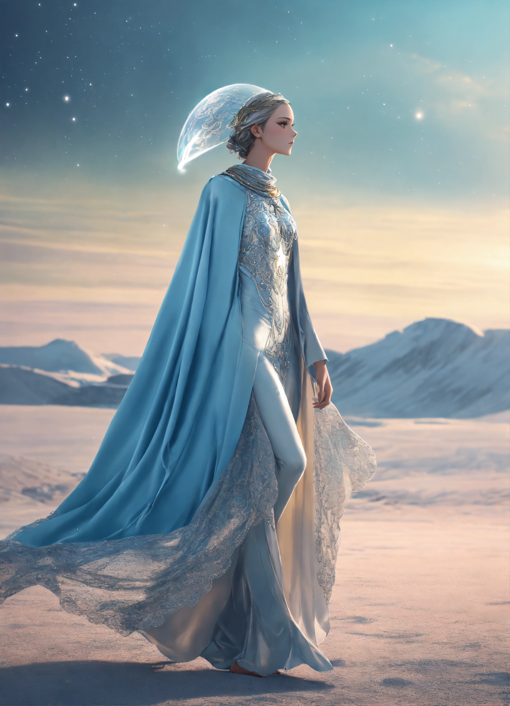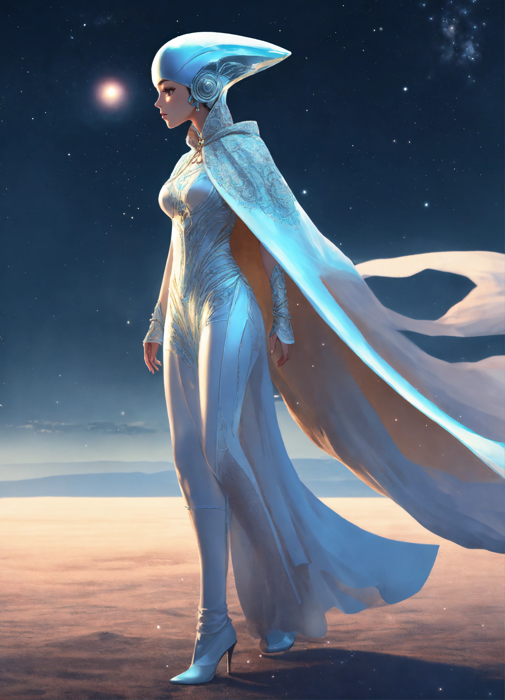 A alien, woman with a long beutiful dress, winter cape hippiestyle vibrand soft light blue and pearl white, silver decoreted clothings, full body wide shot, walking pose, side view, intricate, sharp_focus, concept_art, simple backround cosmic sky