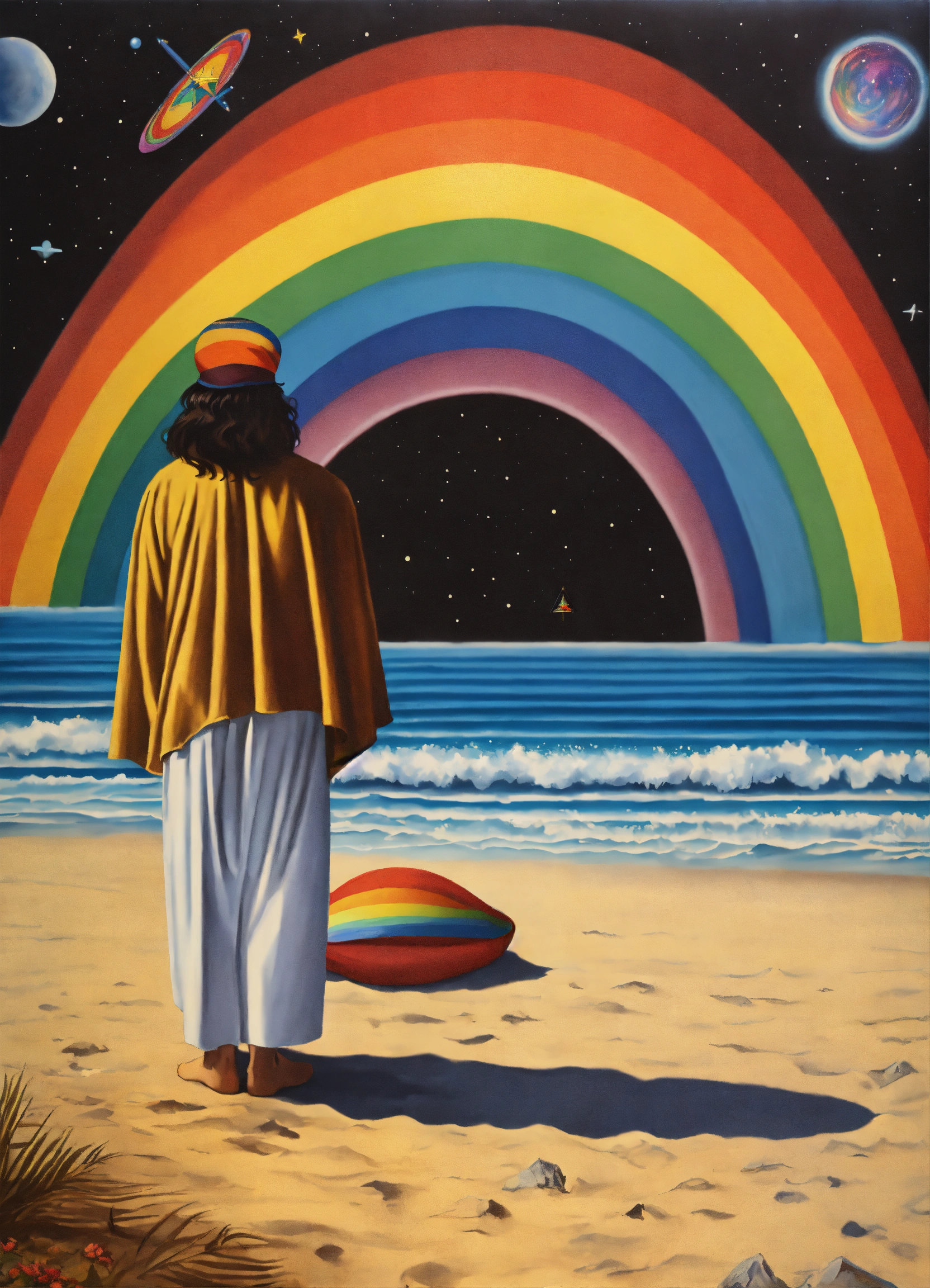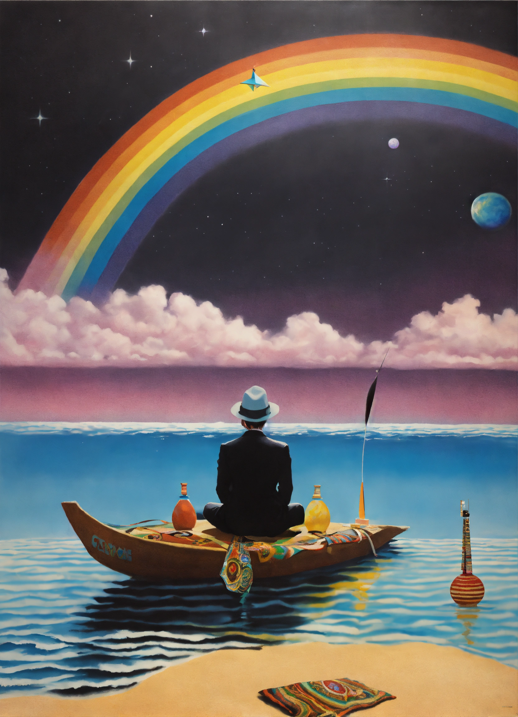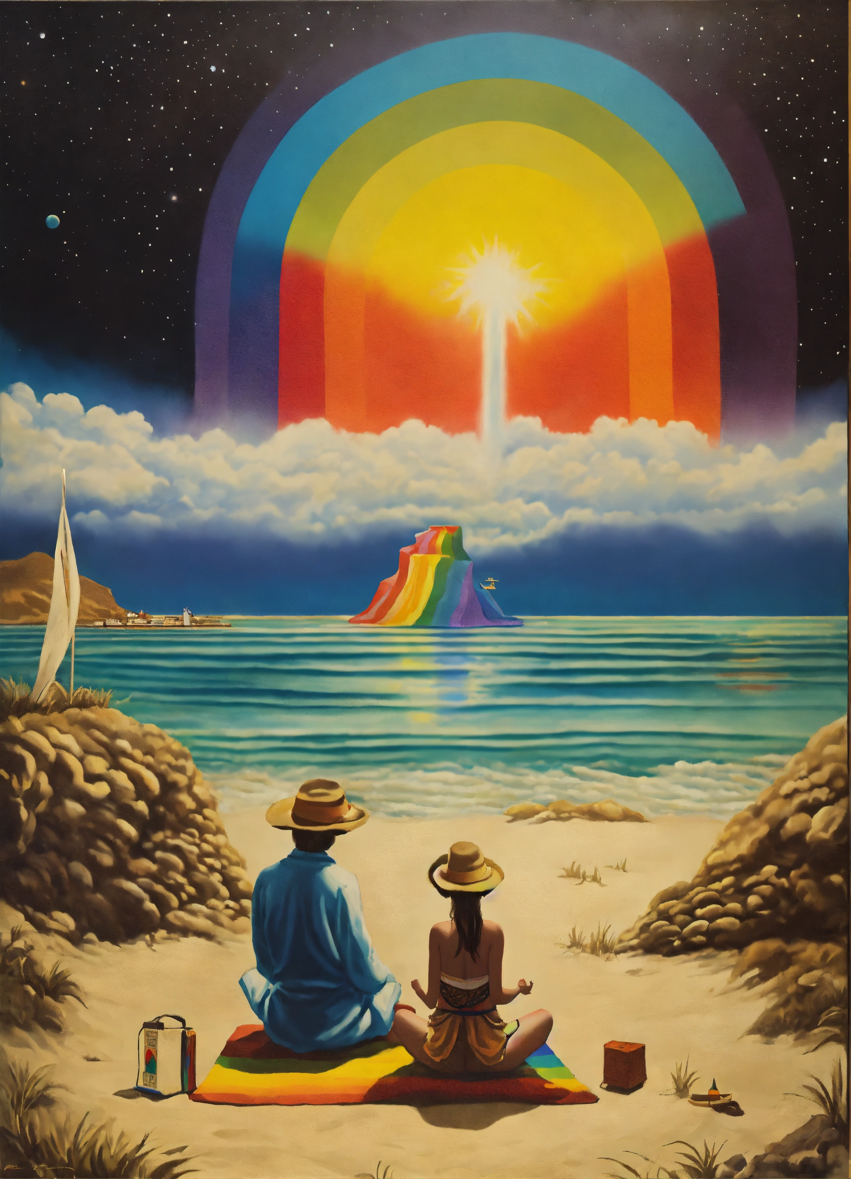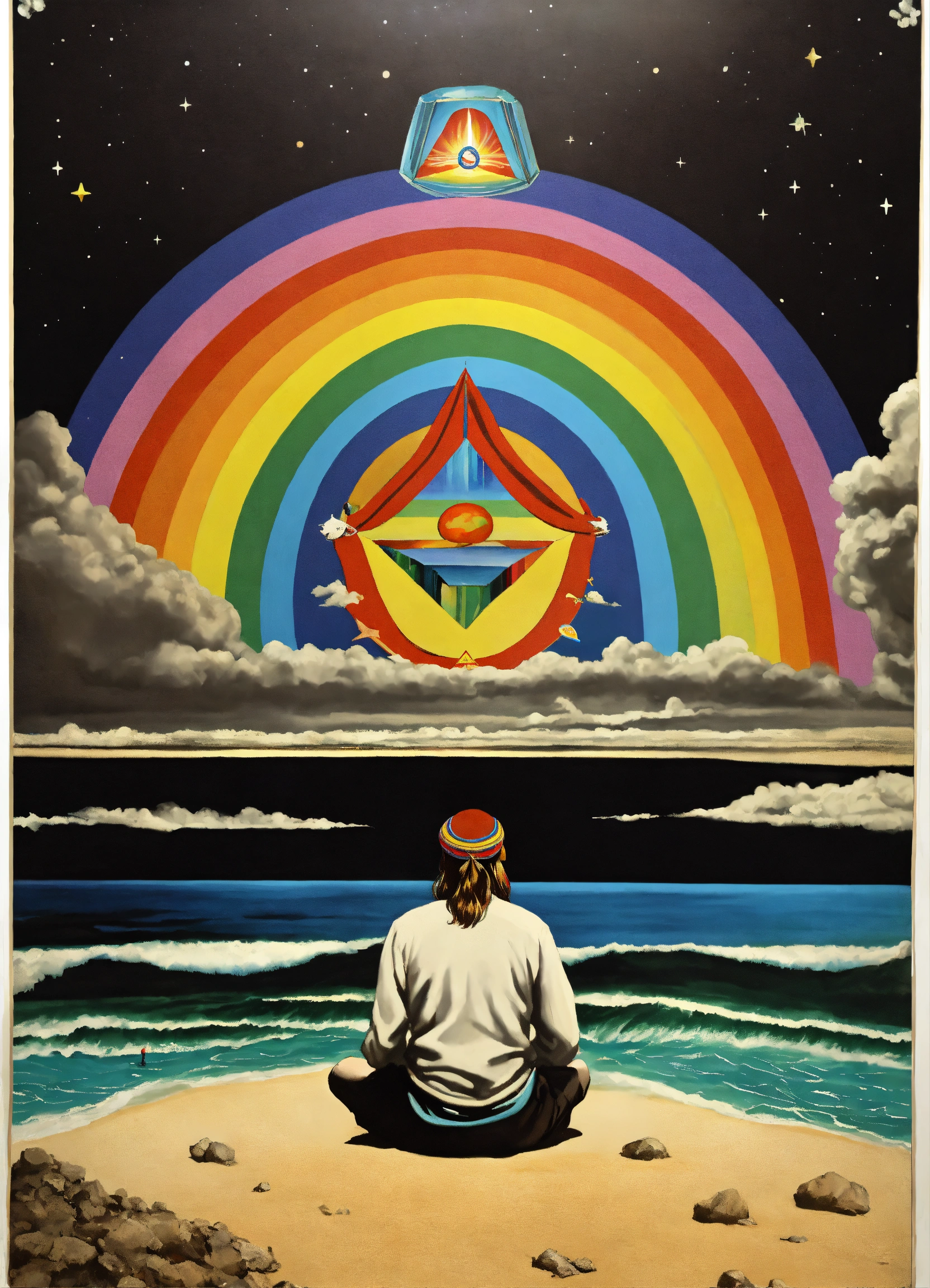 Vintage poster hippie meditating on the beach rainbow tubing, galaxythe world inside an aboriginal psychedelic art, and the four corners of the universe, painted by rene magritte, black and white, masonic flooring