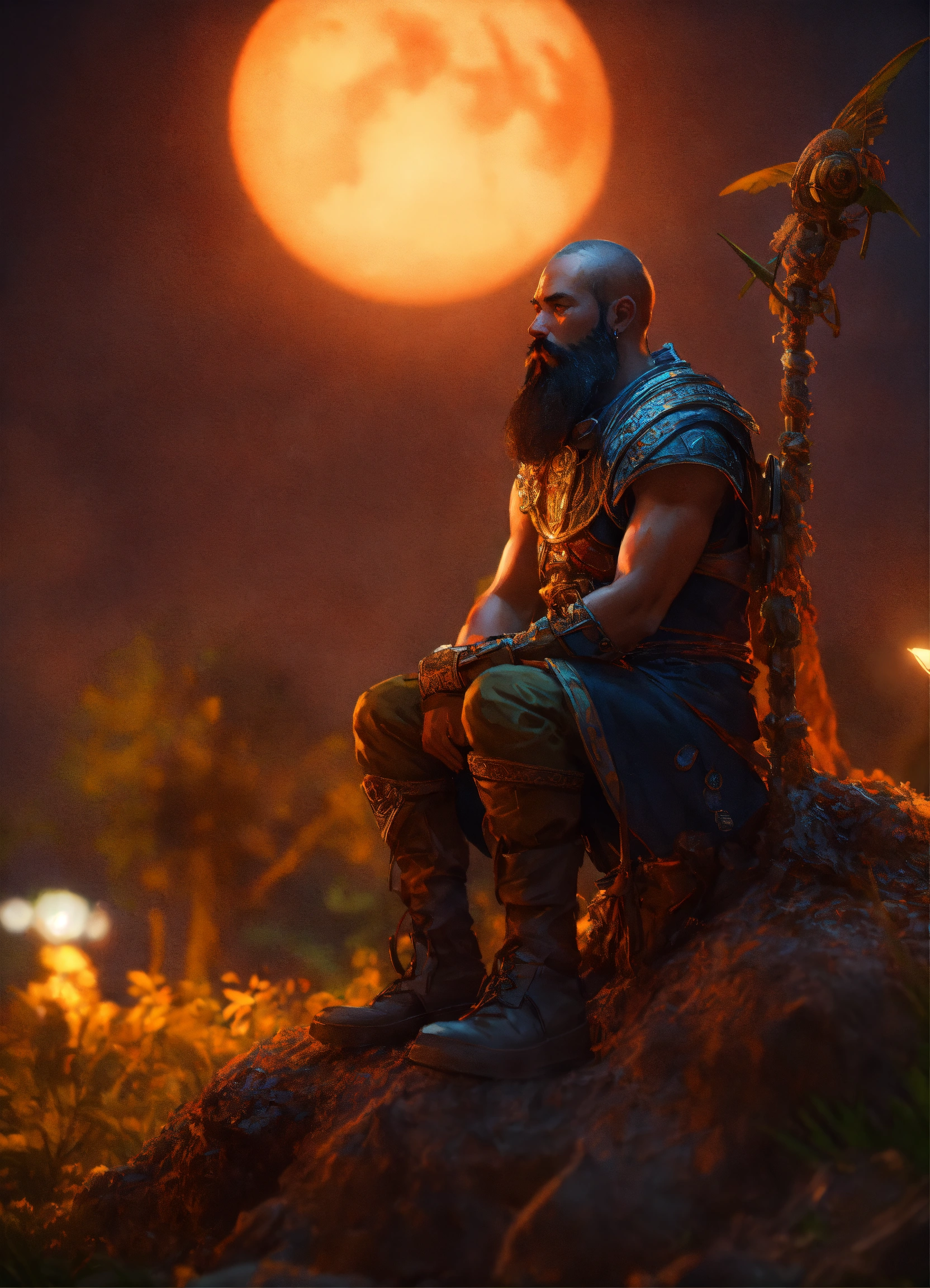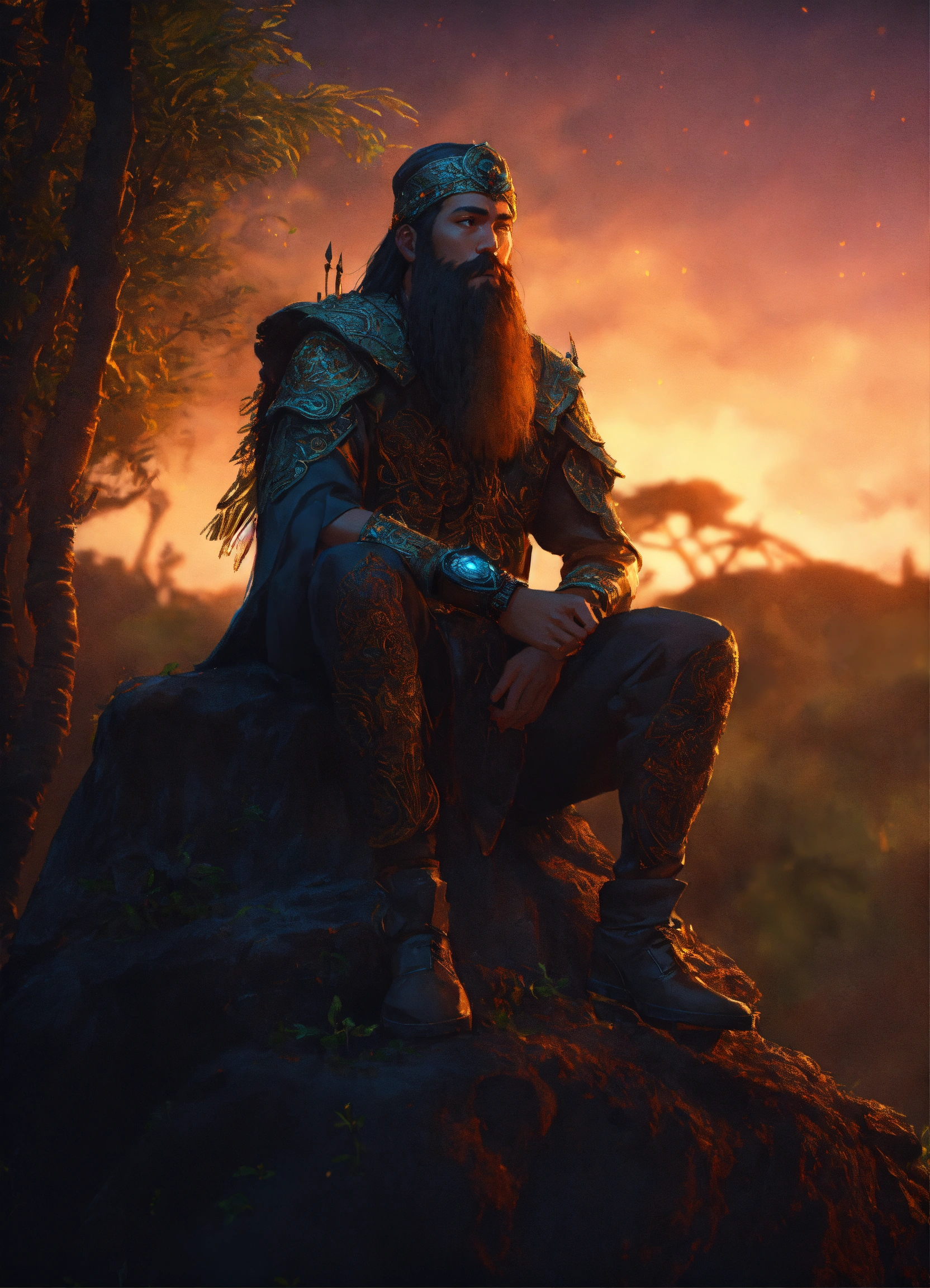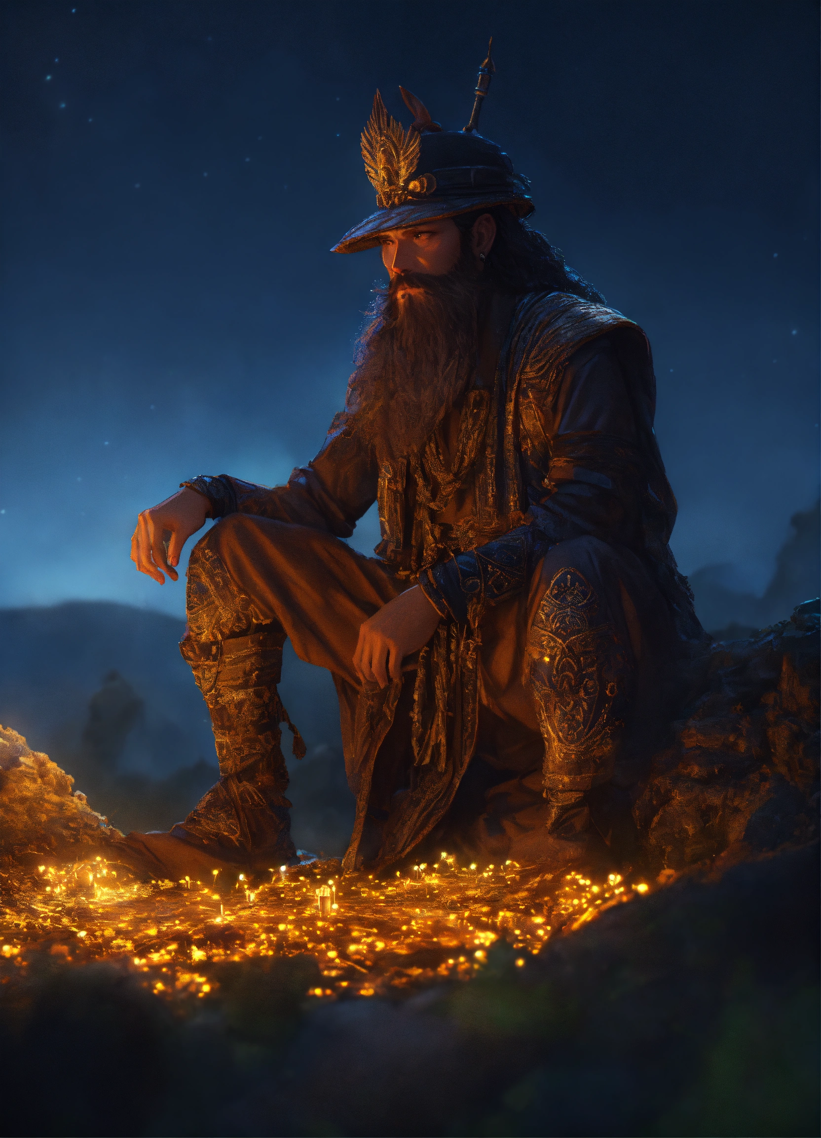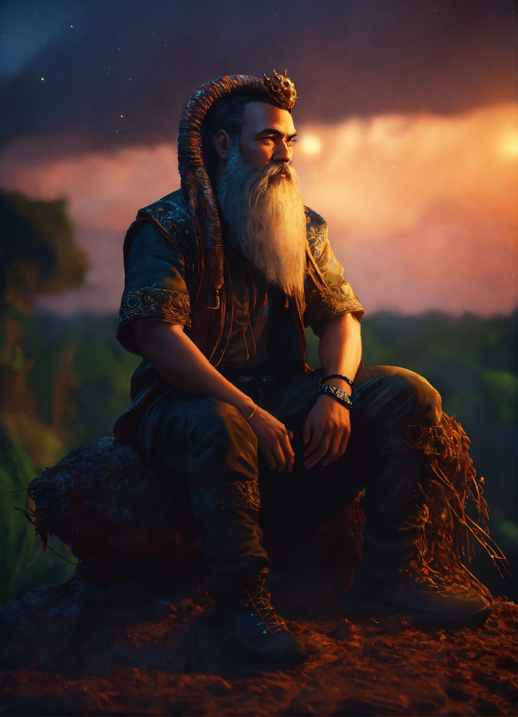 A duwende with long beard, sitting on termite mound, philippines, night light, intricate, sharf focus, concept art, artstation, fantasy, octane render, cinematic lighting, otherworldy