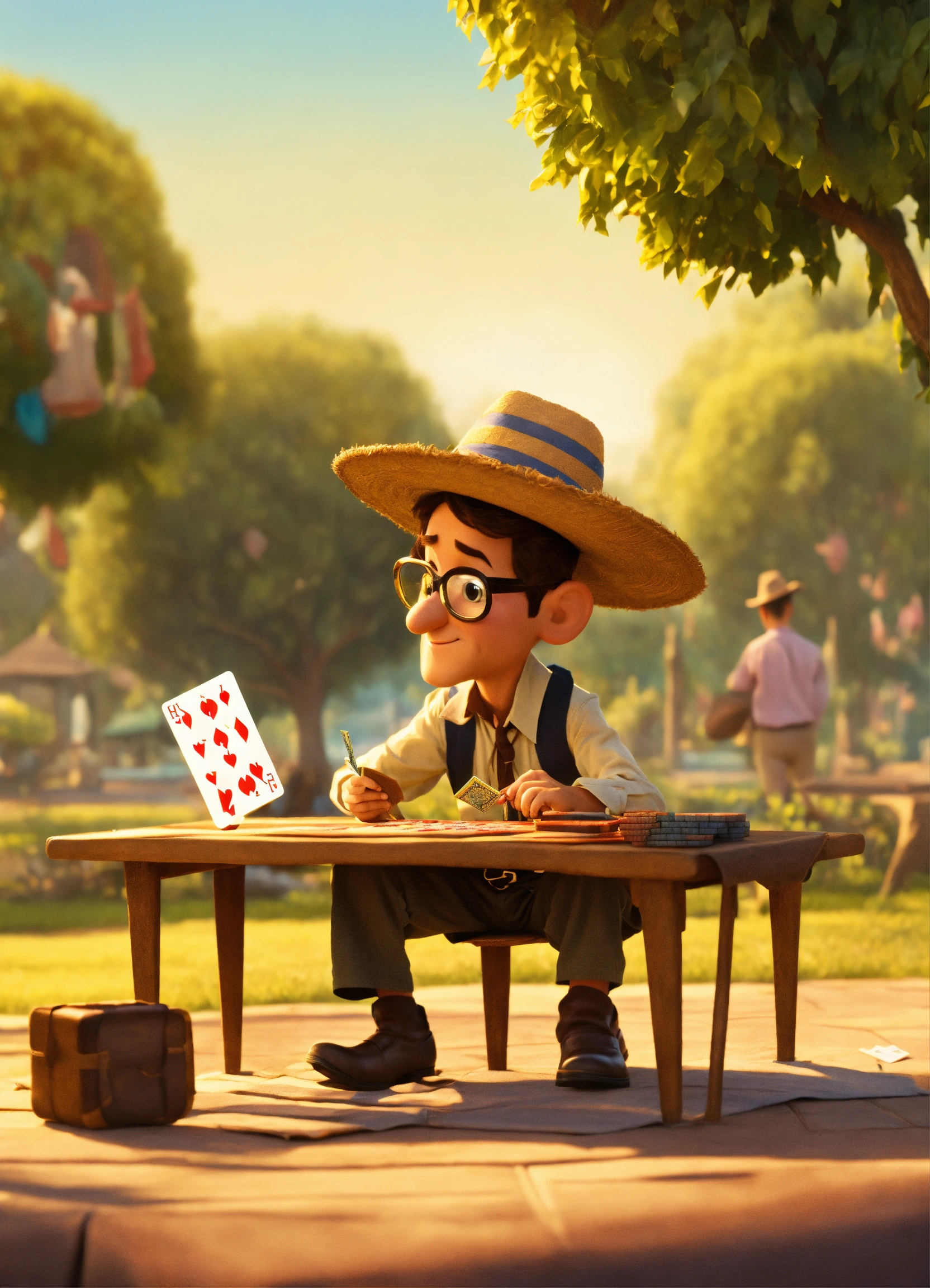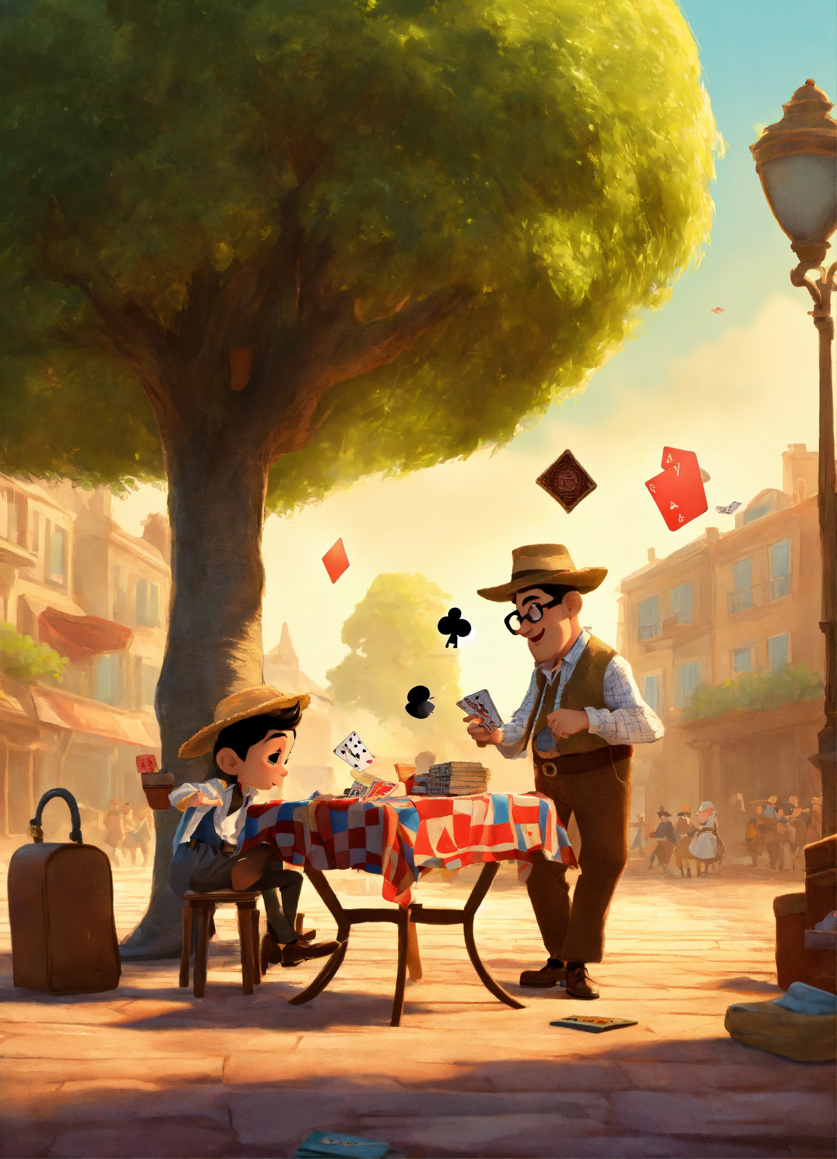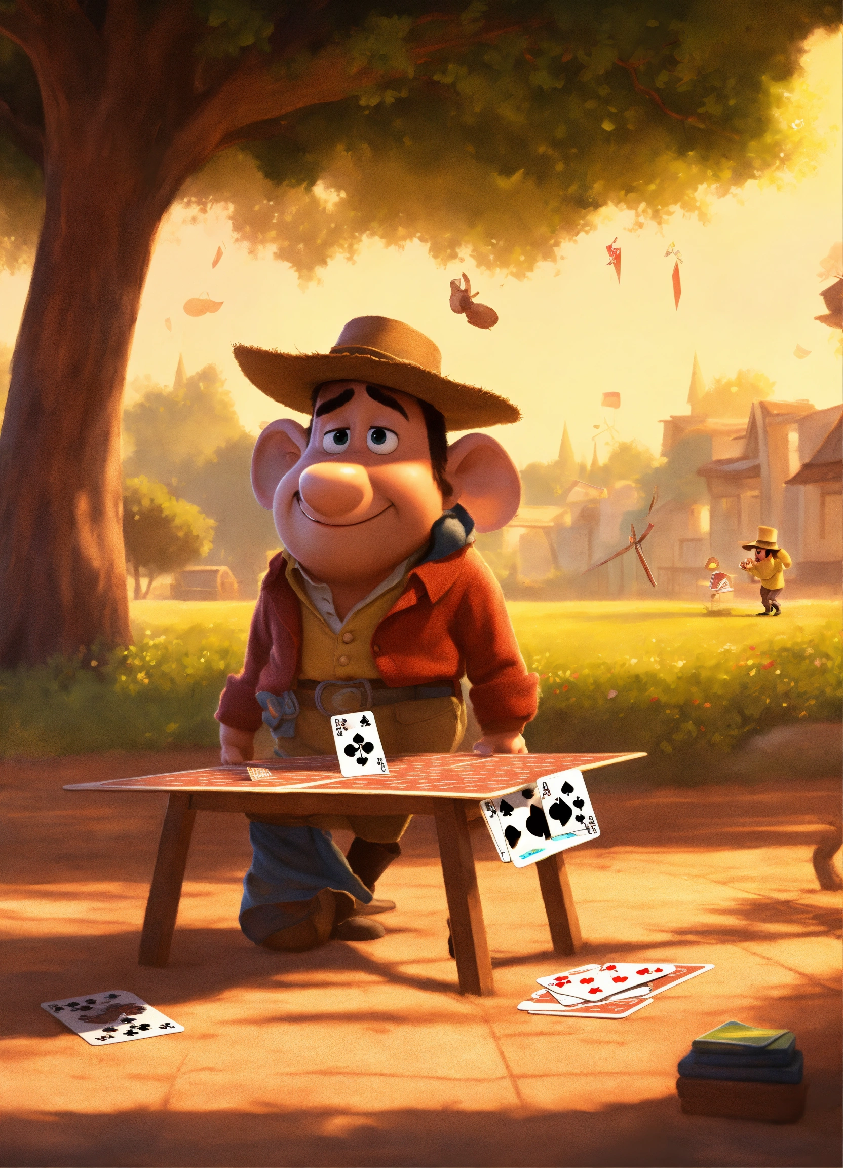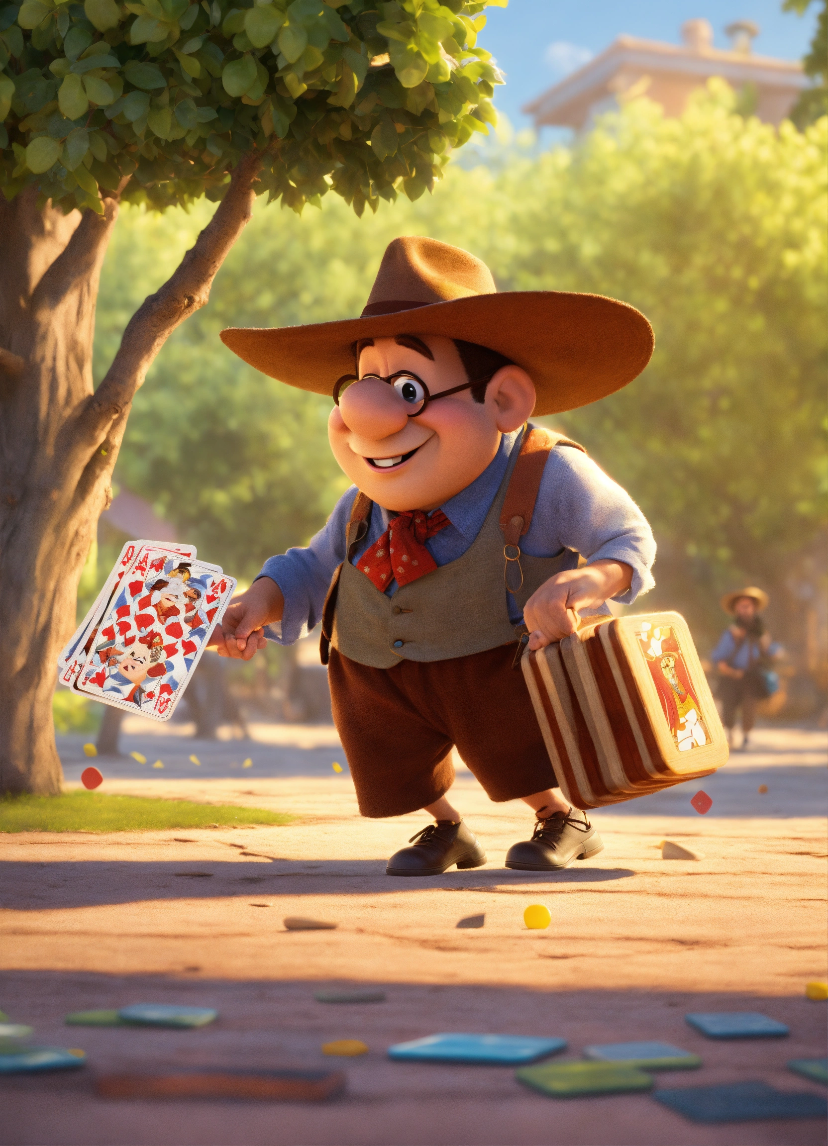 Style from pixar up movie, on a square, gaucho cloths, gaucho man dragging a table under a tree, playing cards, day light, cartoony style, character old disney style.