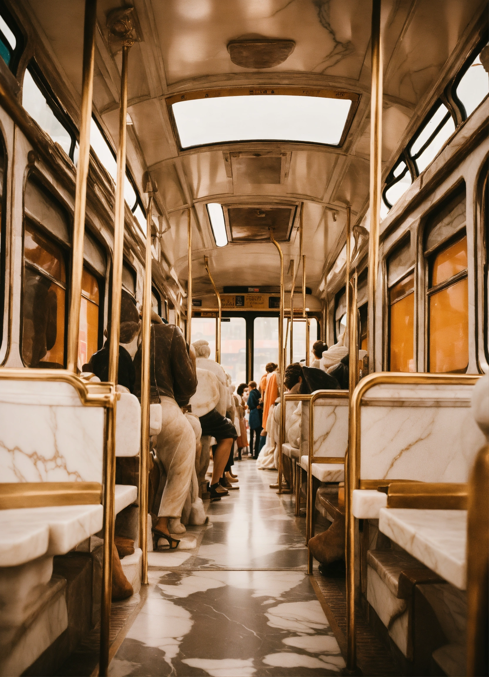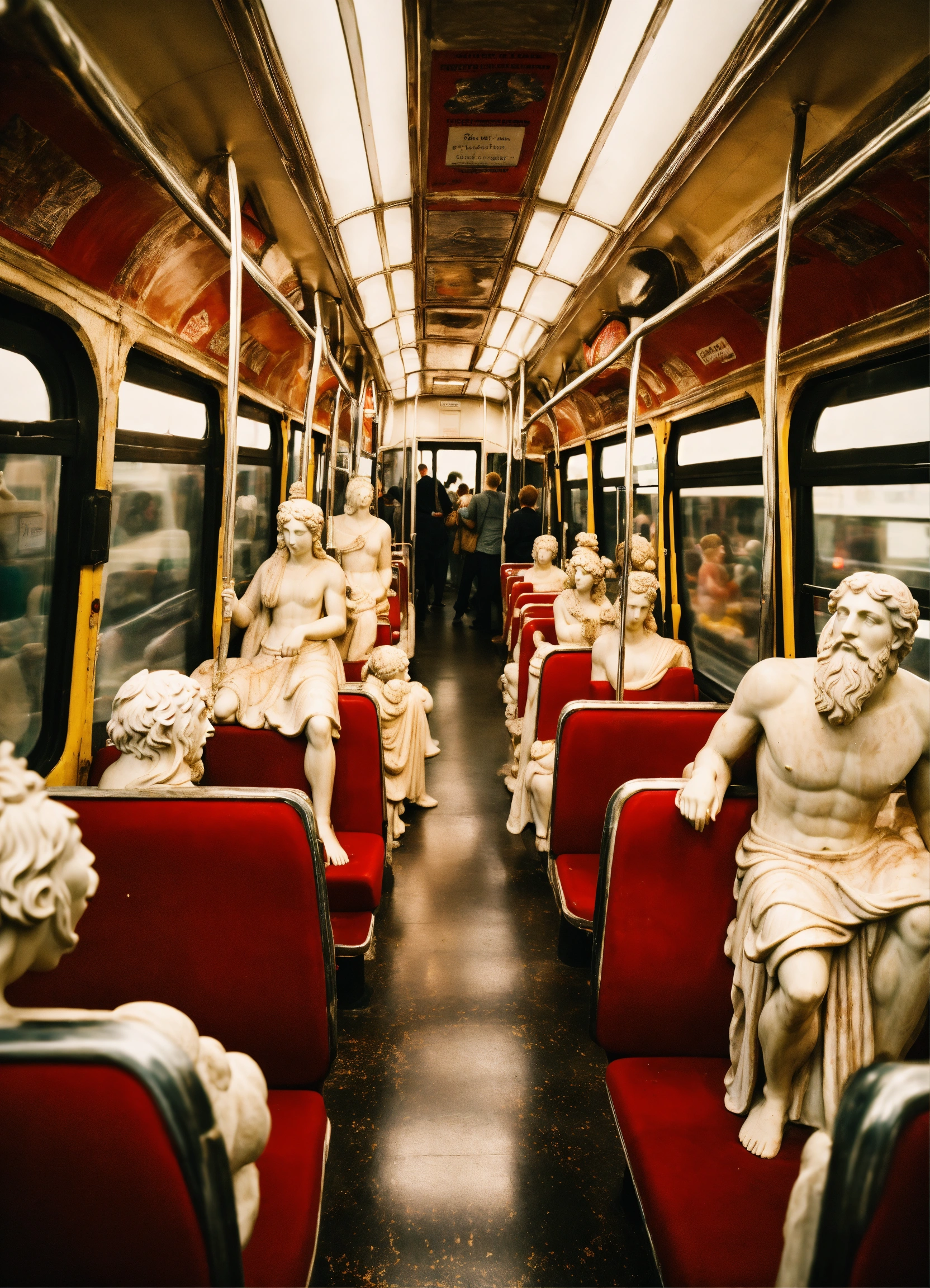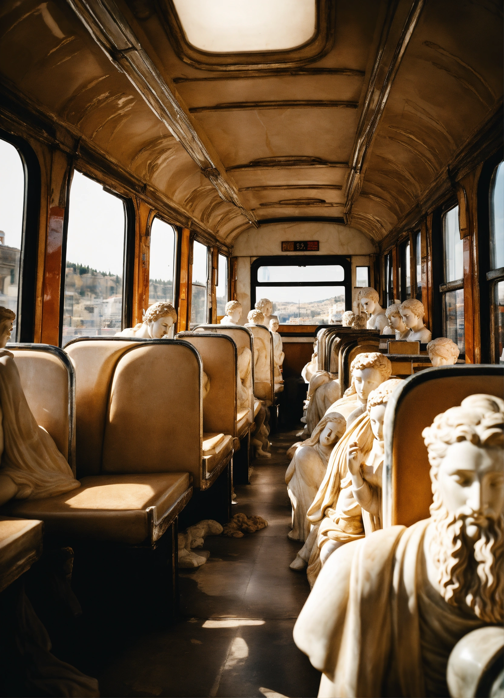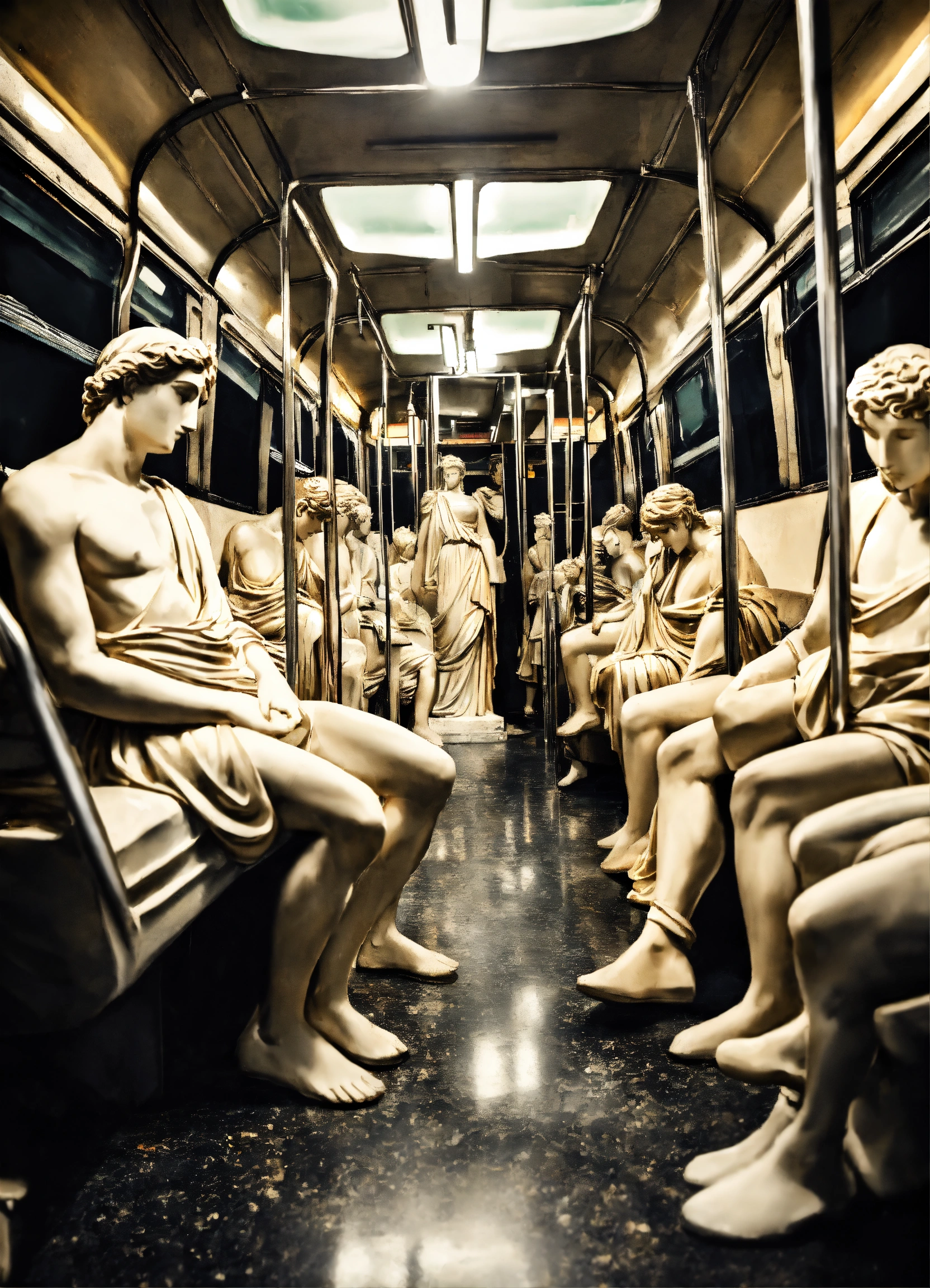 Sad white (greek marble statues) commuting in an old (crowded) bus