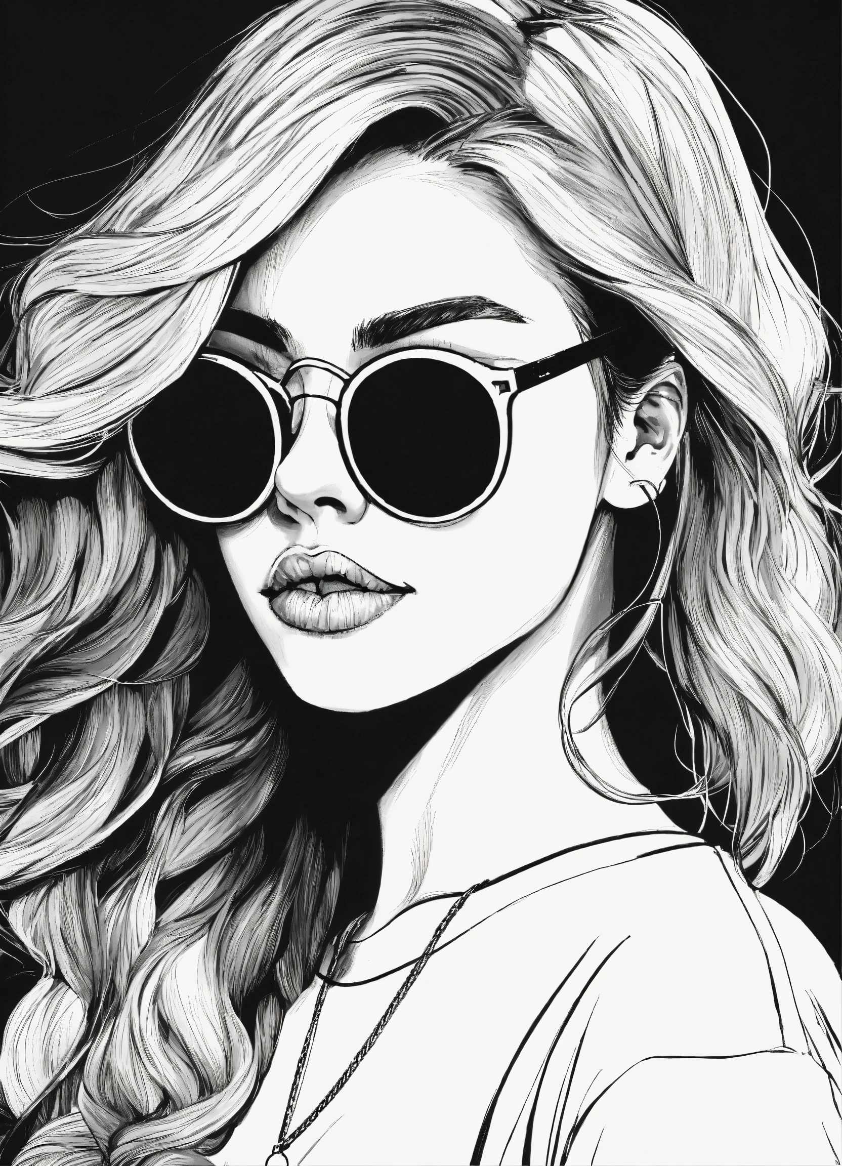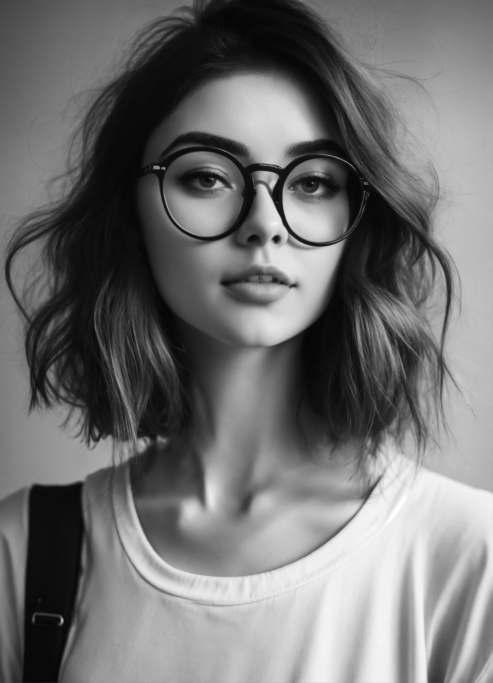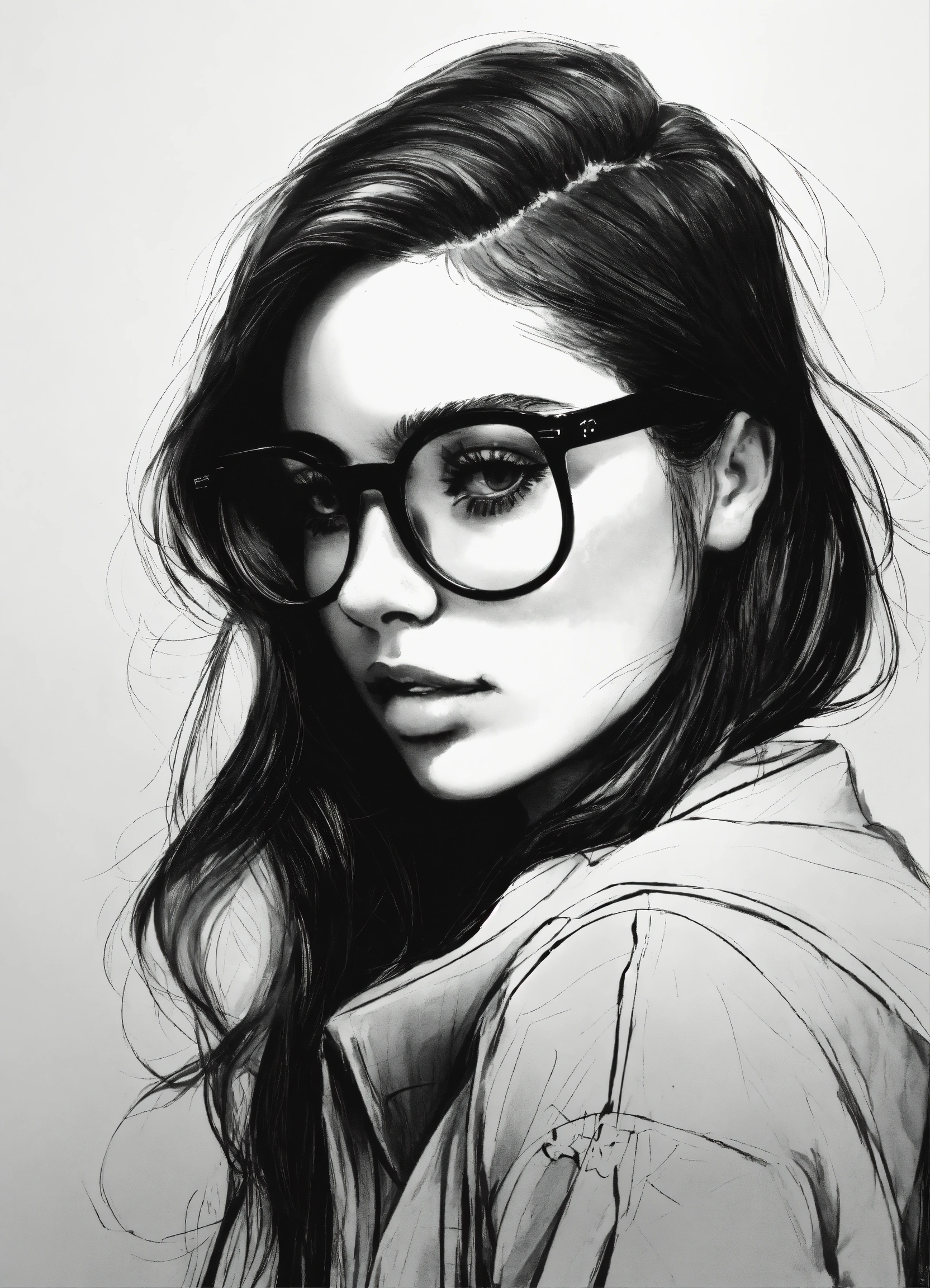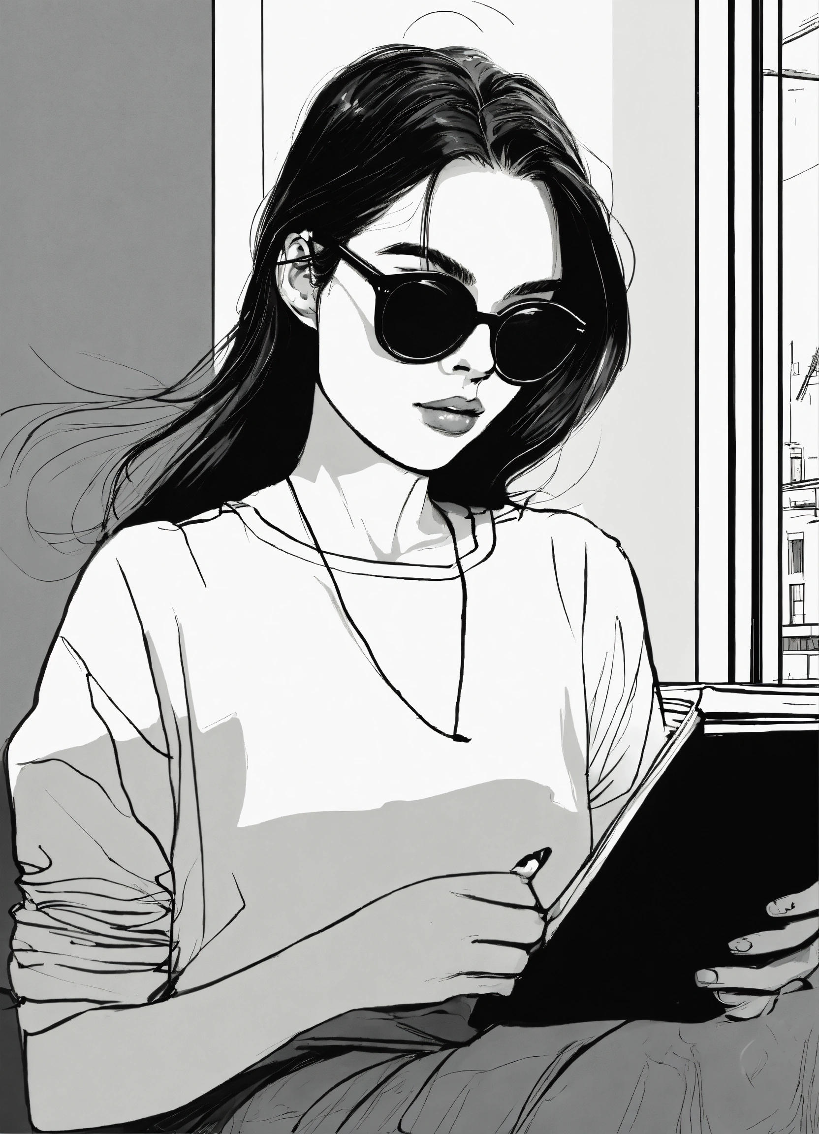 Photo en blanco y negro, estilo caricatura minimalista, de una chica con gafas redondas, pelo por los hombros, con fondo blanco, corrigiendo un texto o leyendo