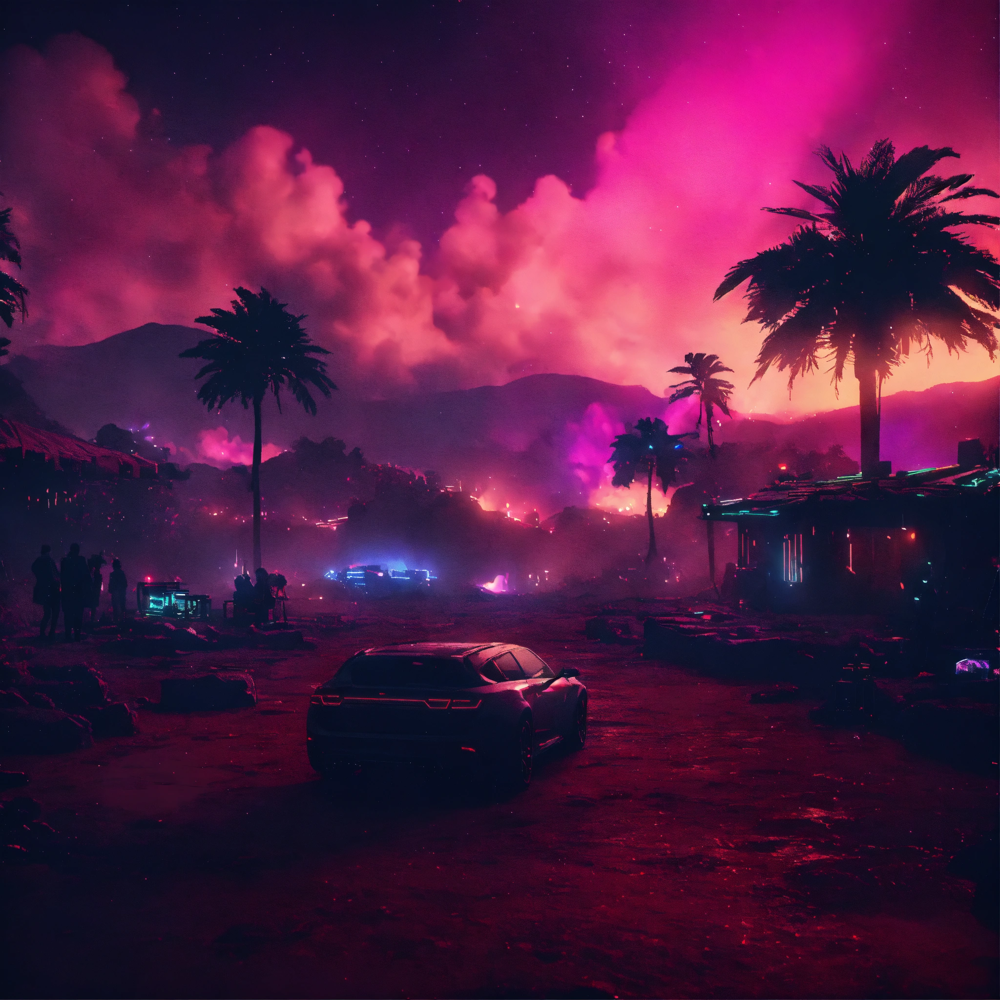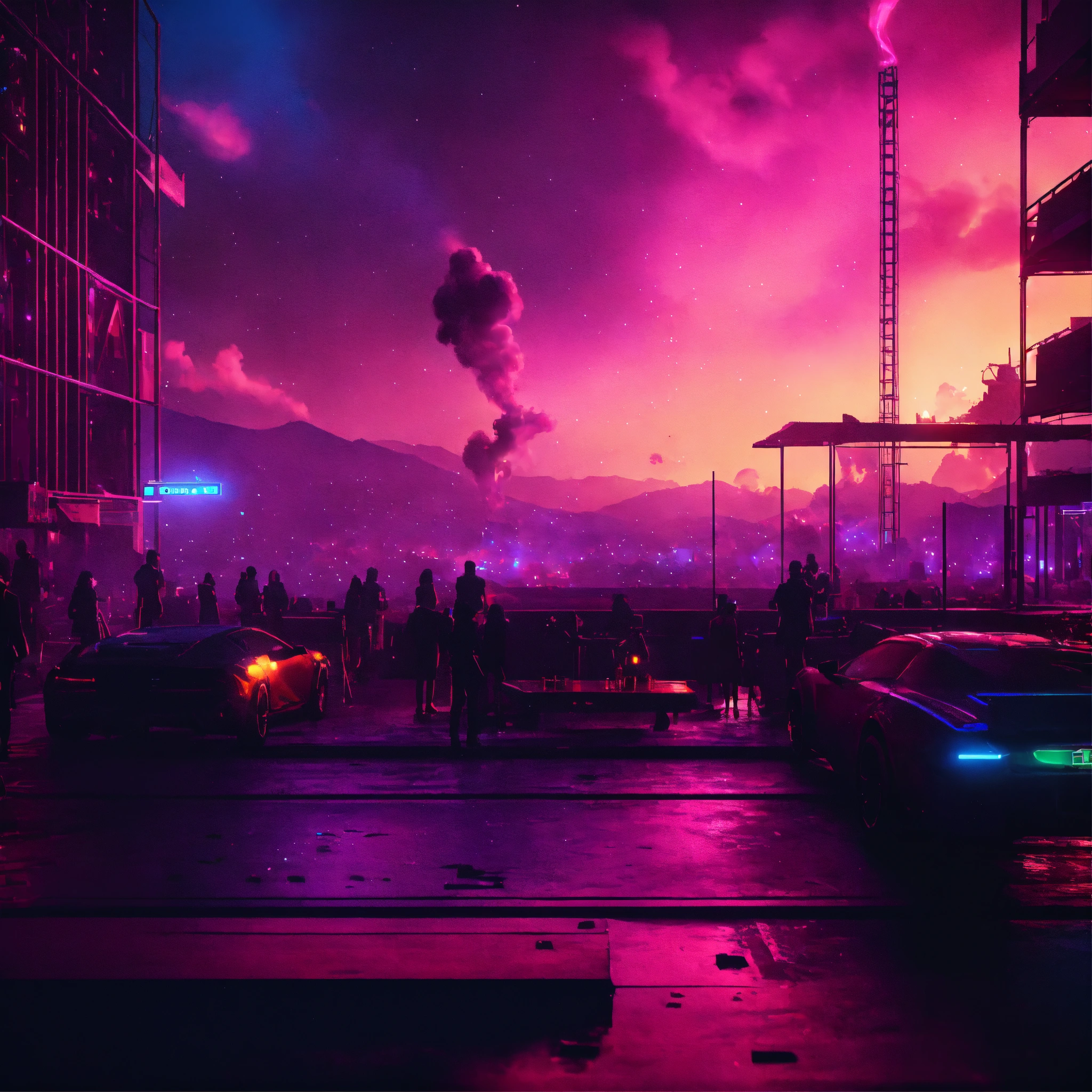 Dark neon smoke cinematic party background, silhouettes, night sky, 8k, unreal engine render, cinematic noise