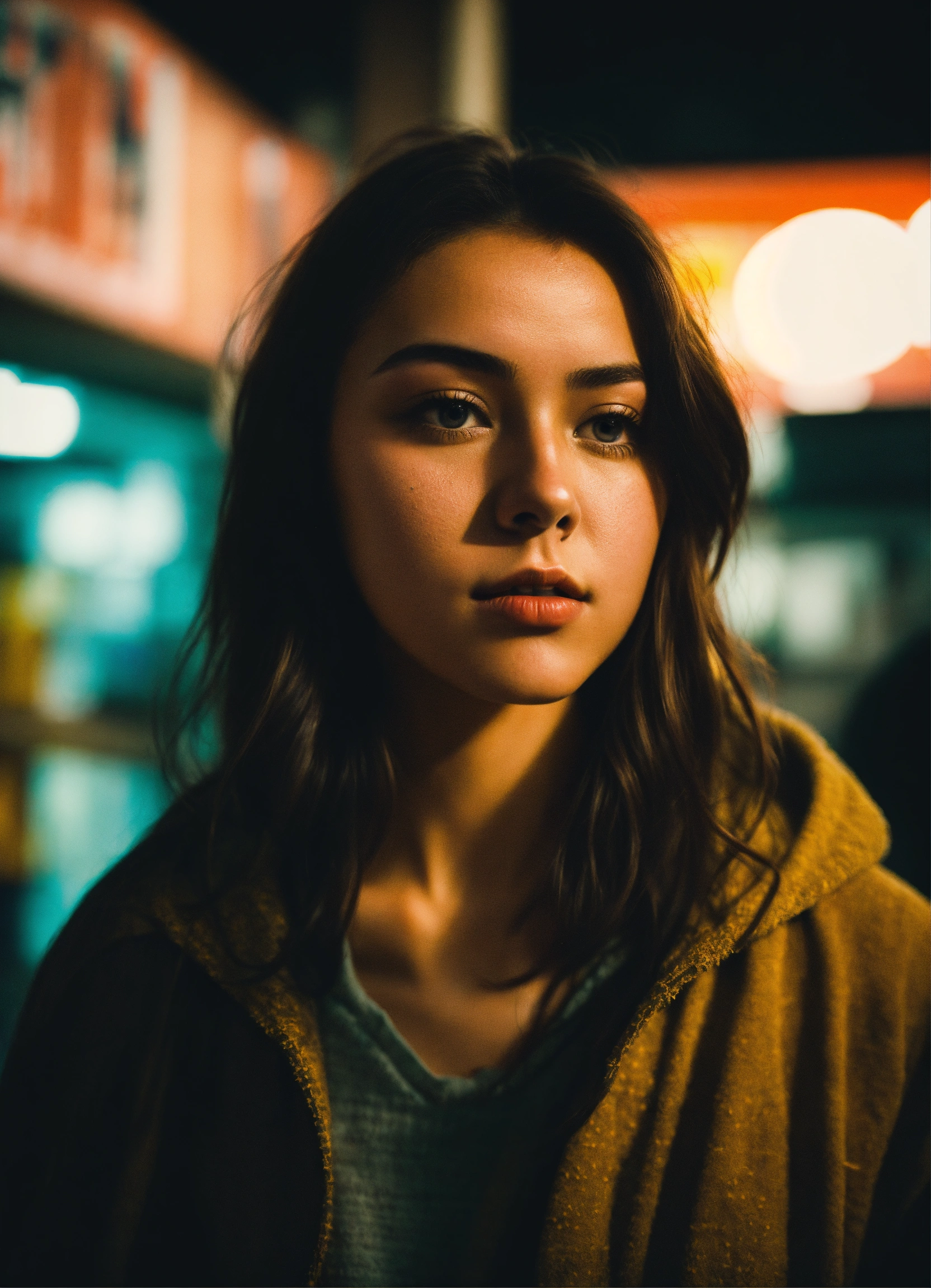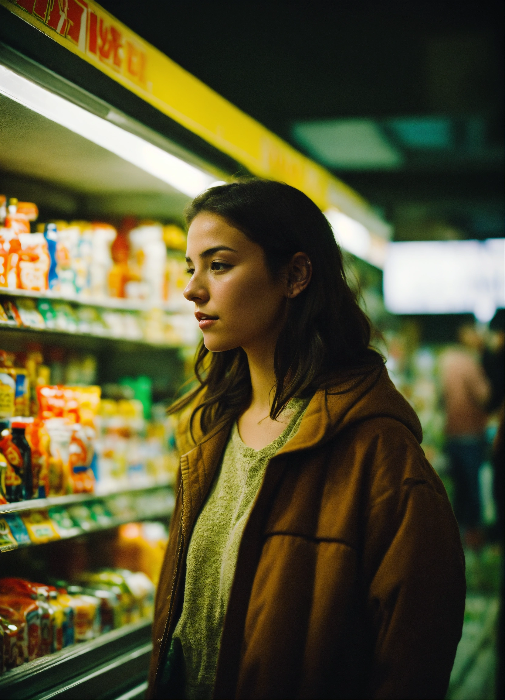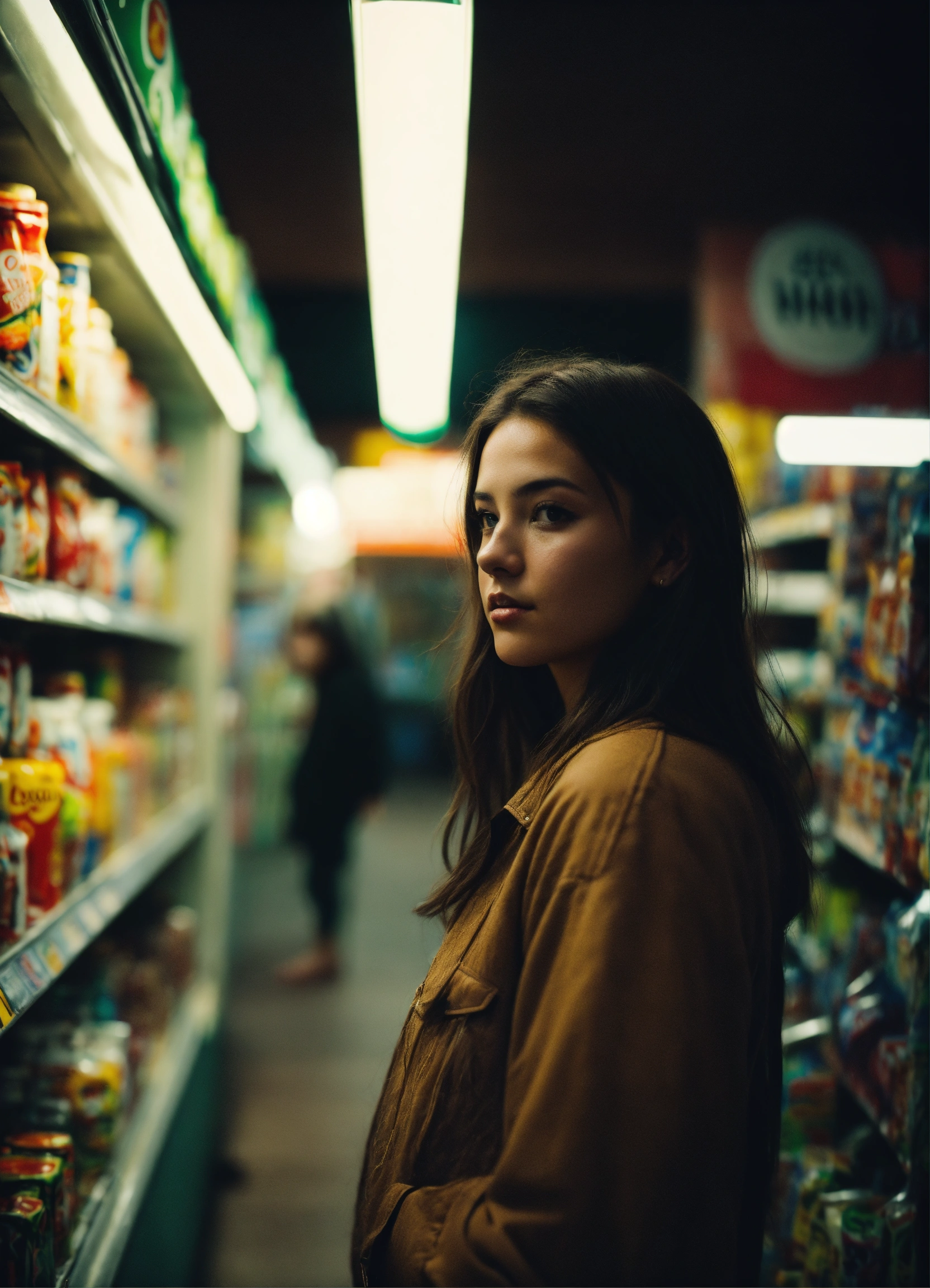 Candid photo of a young brunette woman taken at a convenience store during the night, low quality image, exhibiting a grainy texture, jpg artifacts, film grain, gritty, raw aesthetic