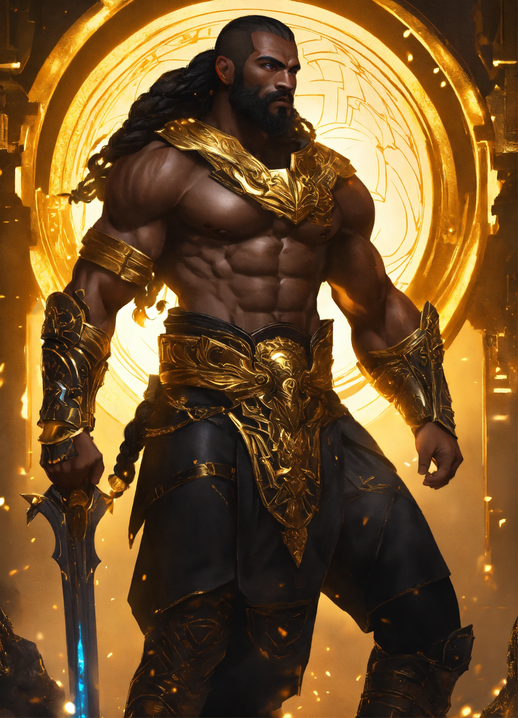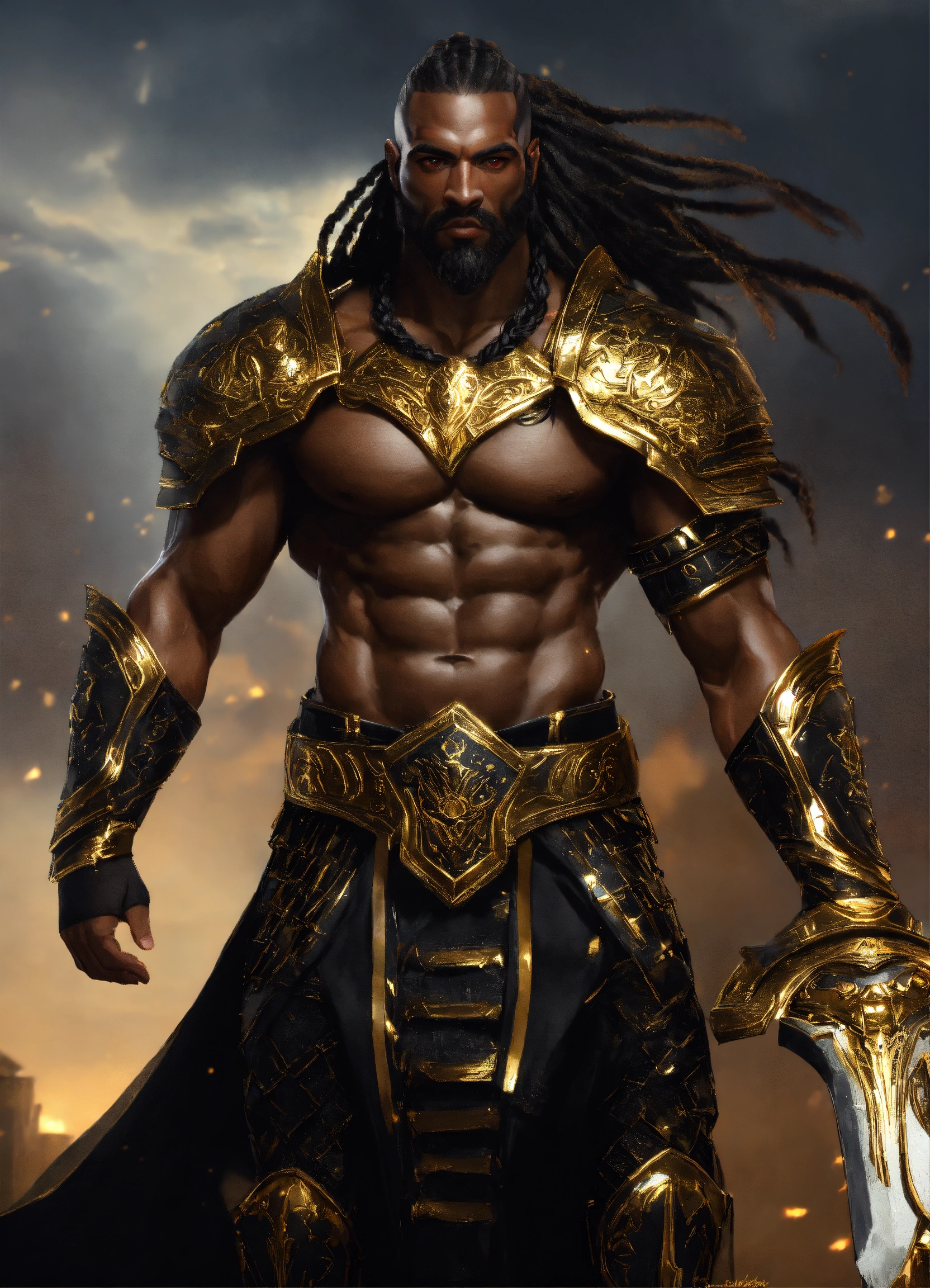 Full body, black god of war, muscular handsome black futuristic fantasy warrior man, most manly man in the world, with gold and black armor, and long braided hair