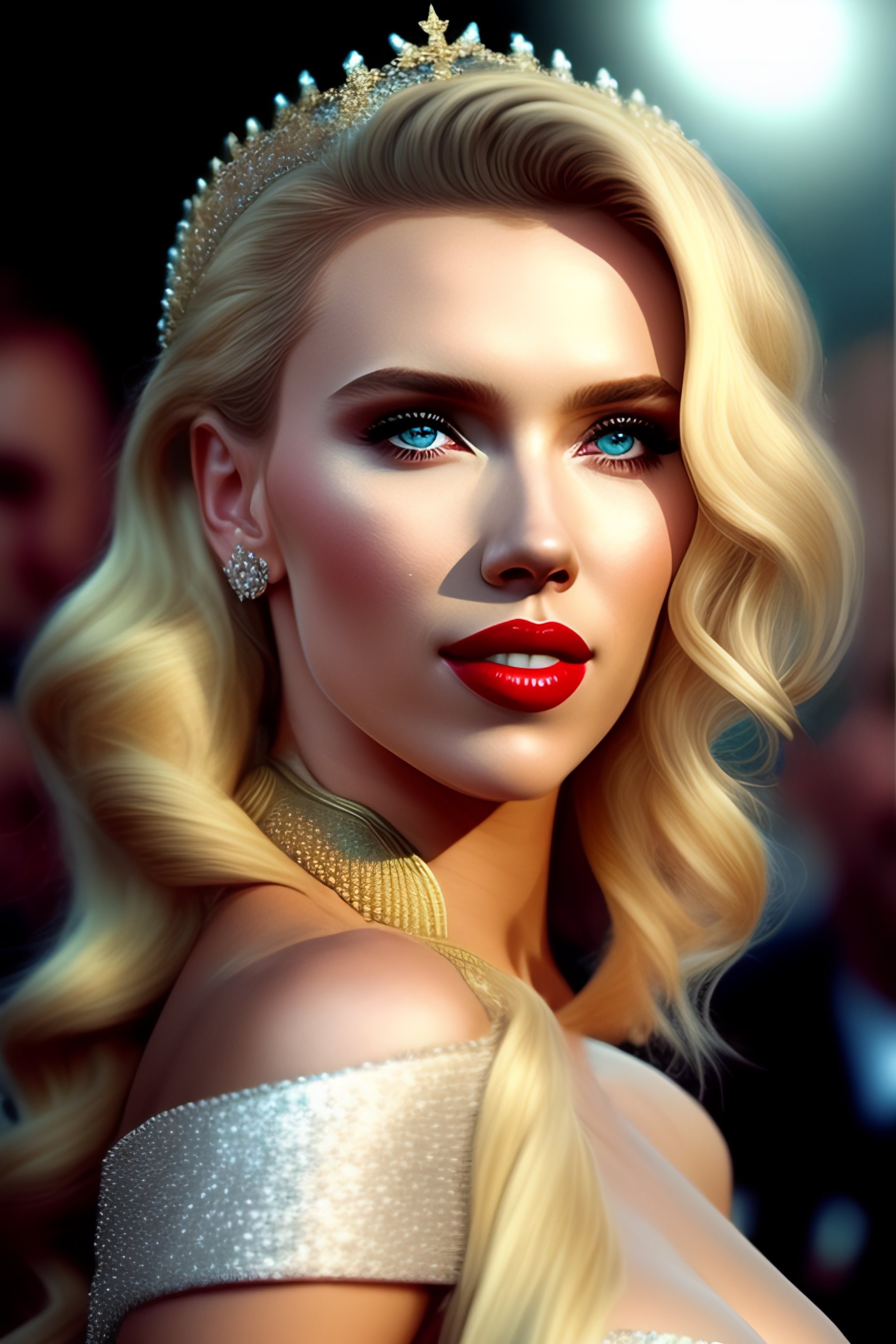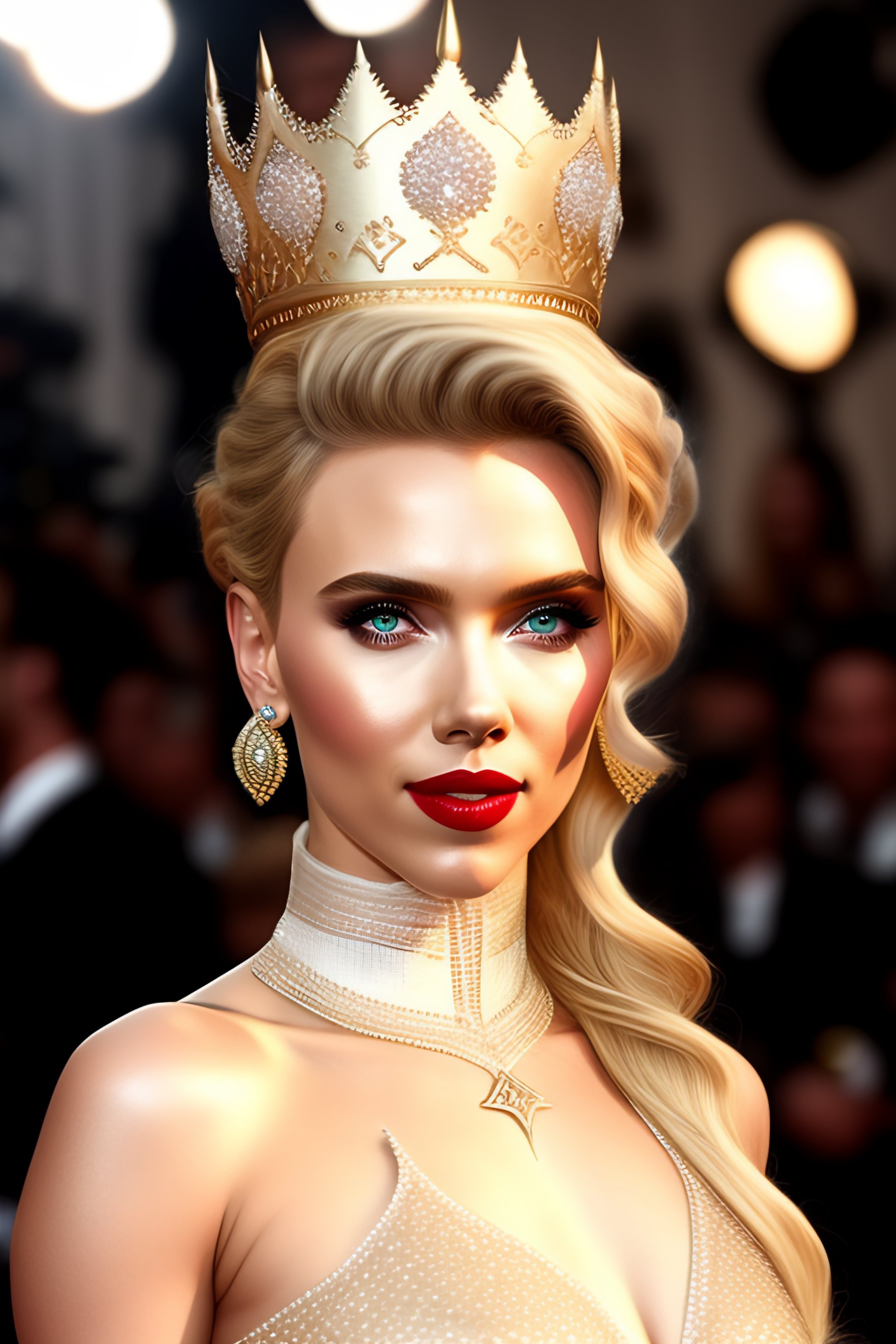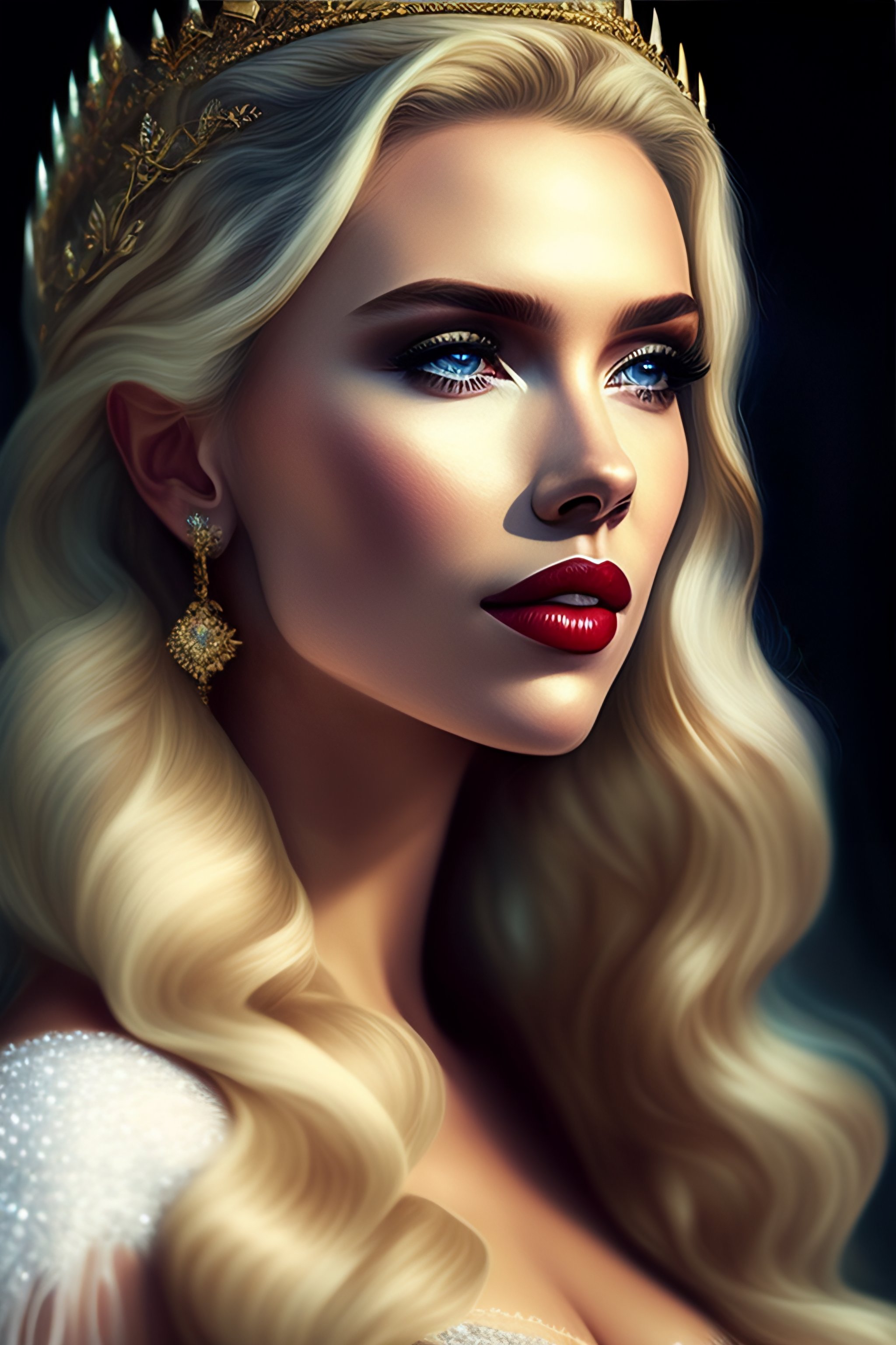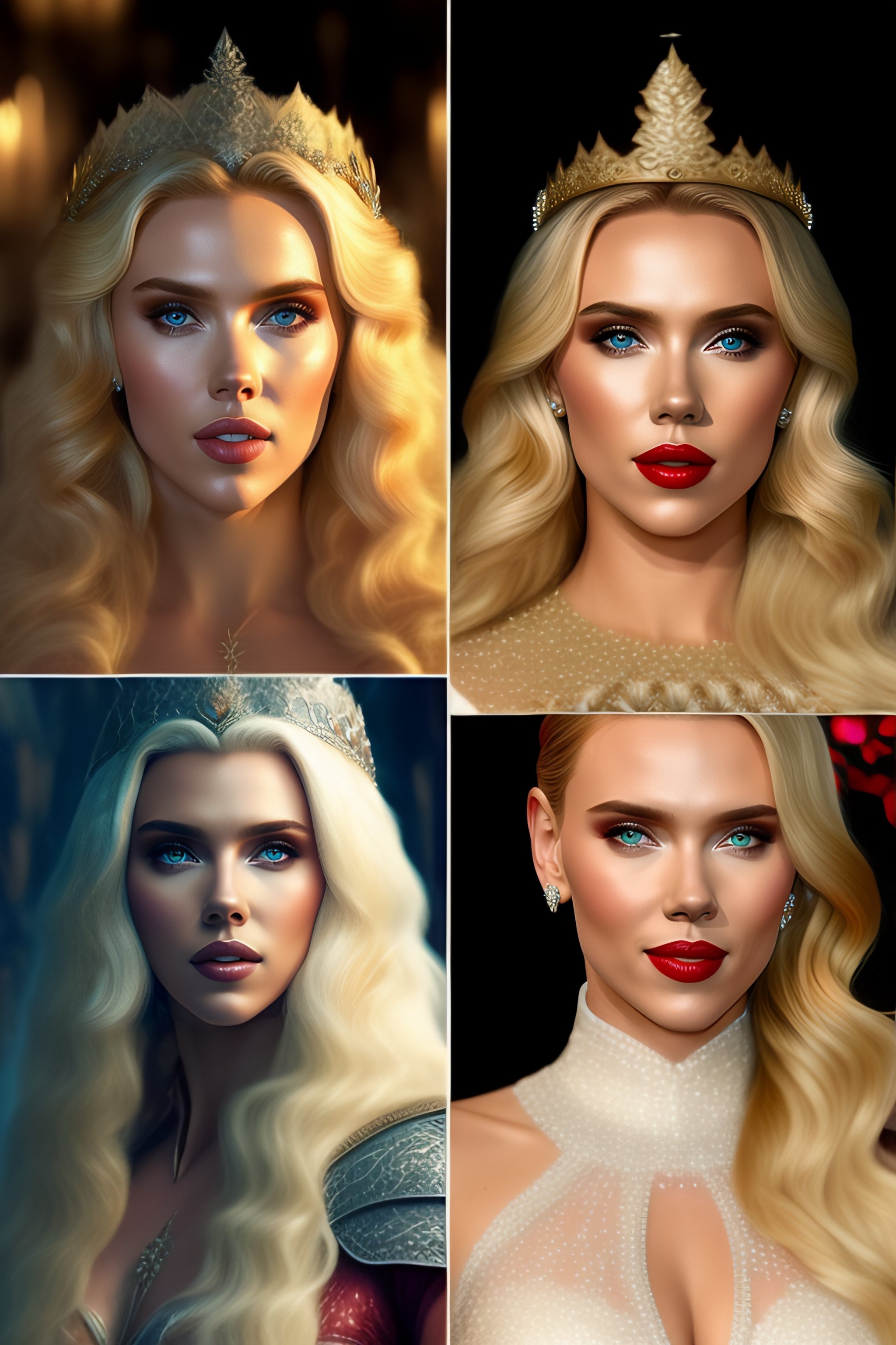 Scarlett johansson elves queen white intricate dress and crown beautiful detailed long blonde hair lord of the rings style dark makeup