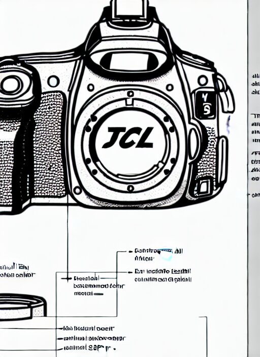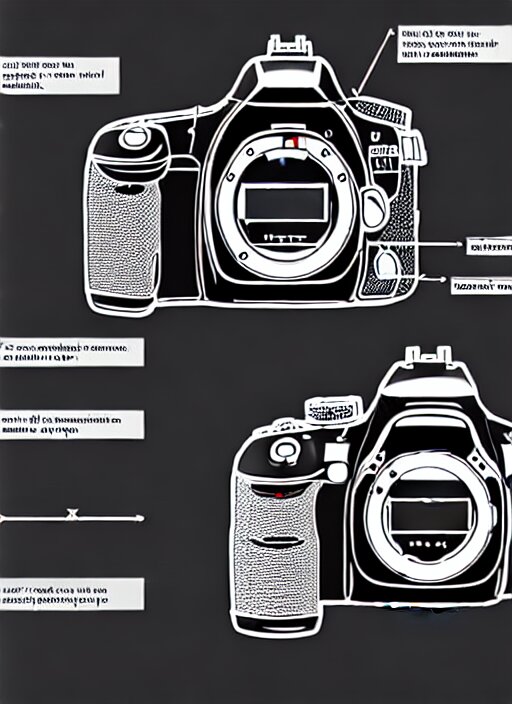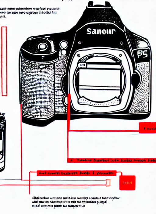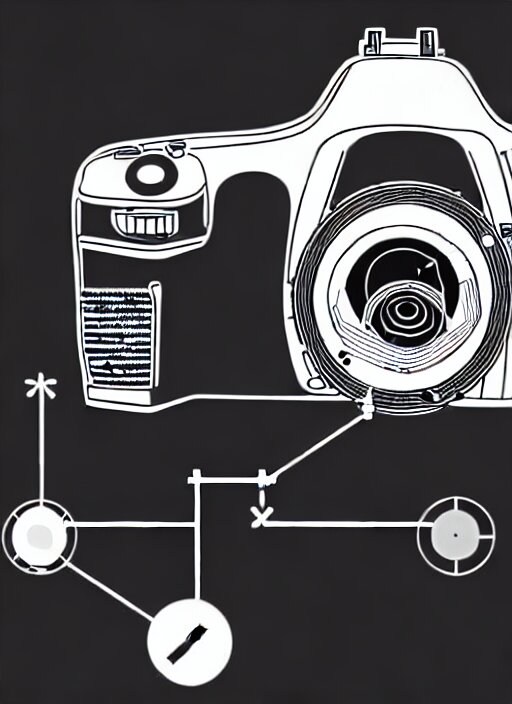 A detailed technical diagram, a professional dslr camera pointed at the viewer manual intricate linework detailed interior mechanism visible annotated parts disassembled