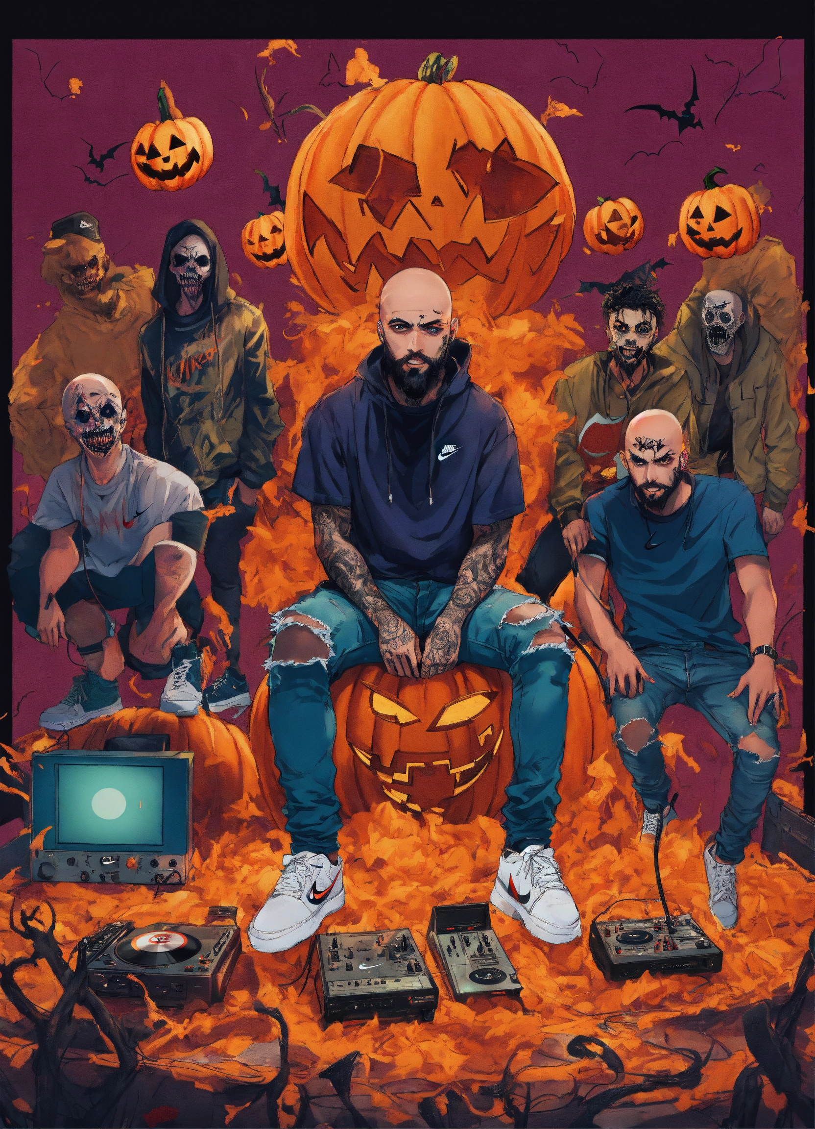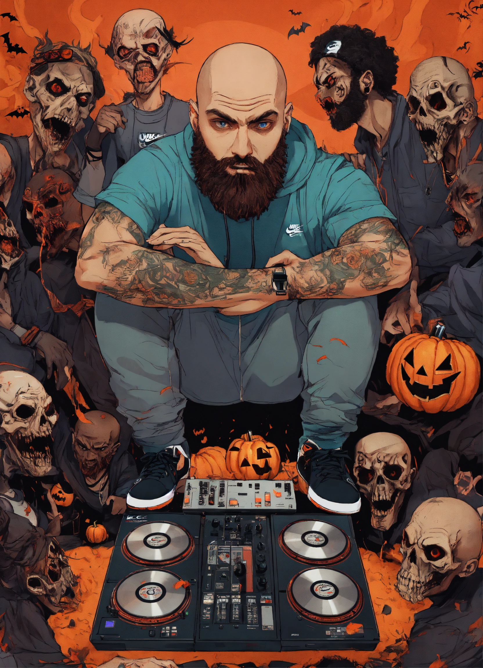 A young bald man with beard 8k modern day 2023 clothing t shirt and ripped jeans nike sb dunks create a terrifying halloween tableau featuring a group of possessed individuals with twisted, demonic features and malevolent grins dj a booth with turntables and mixer and a mic