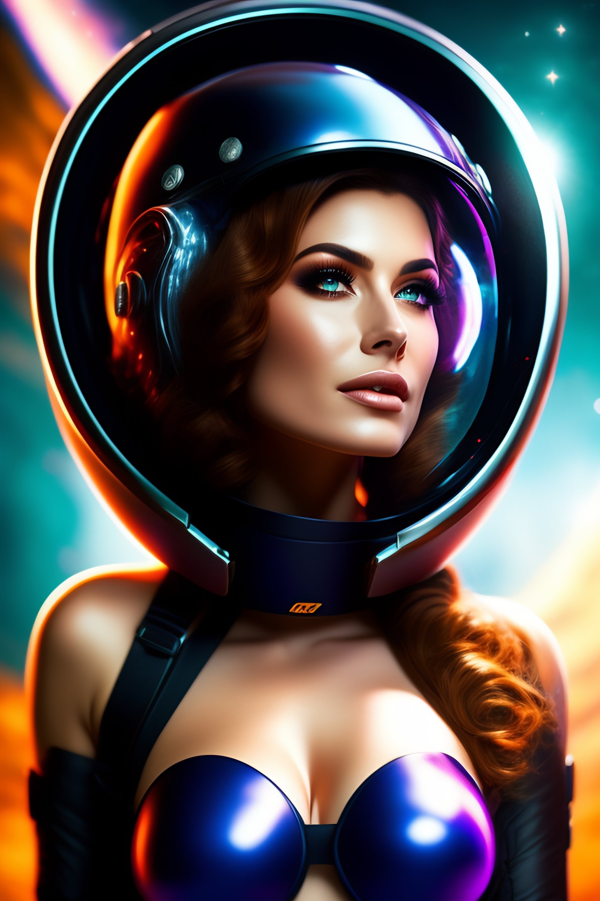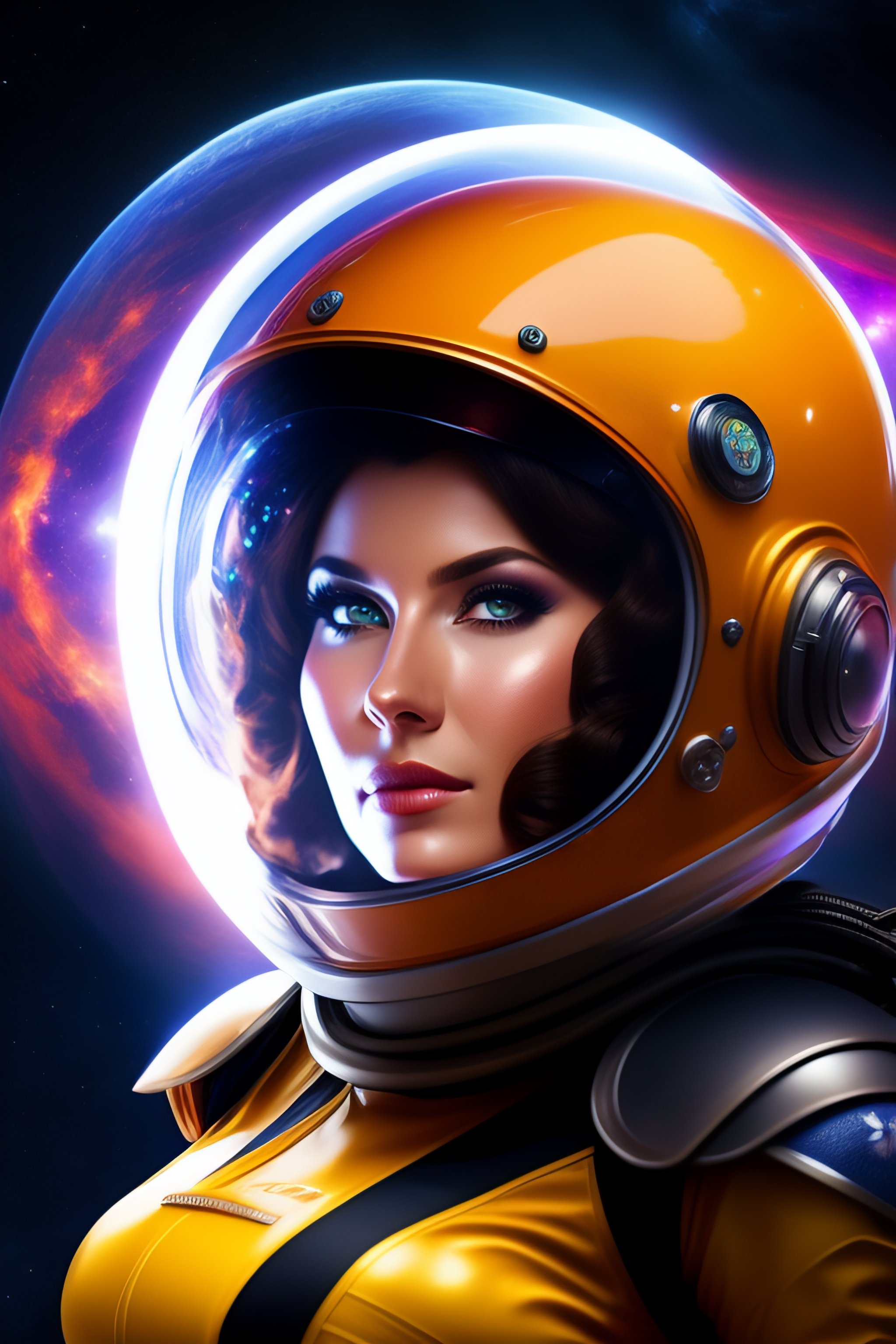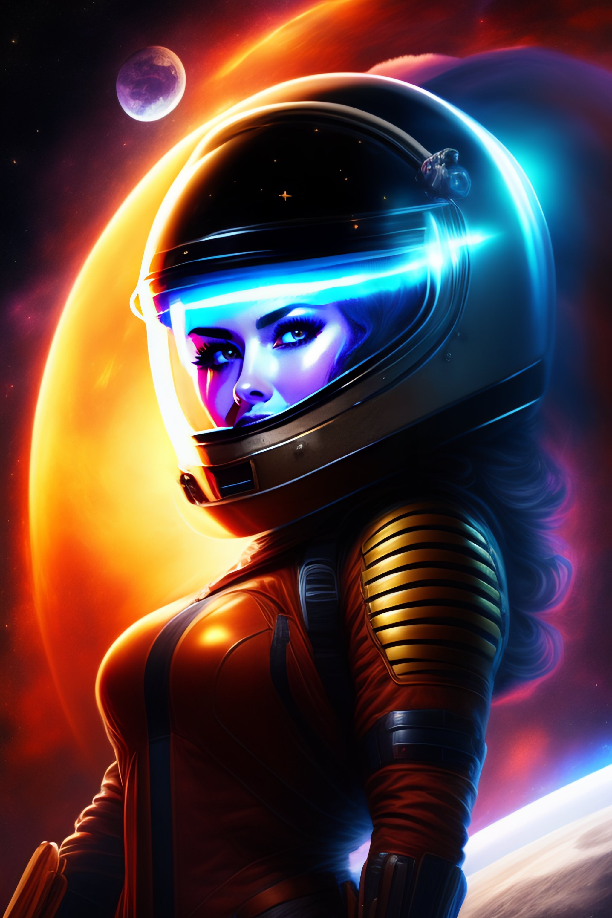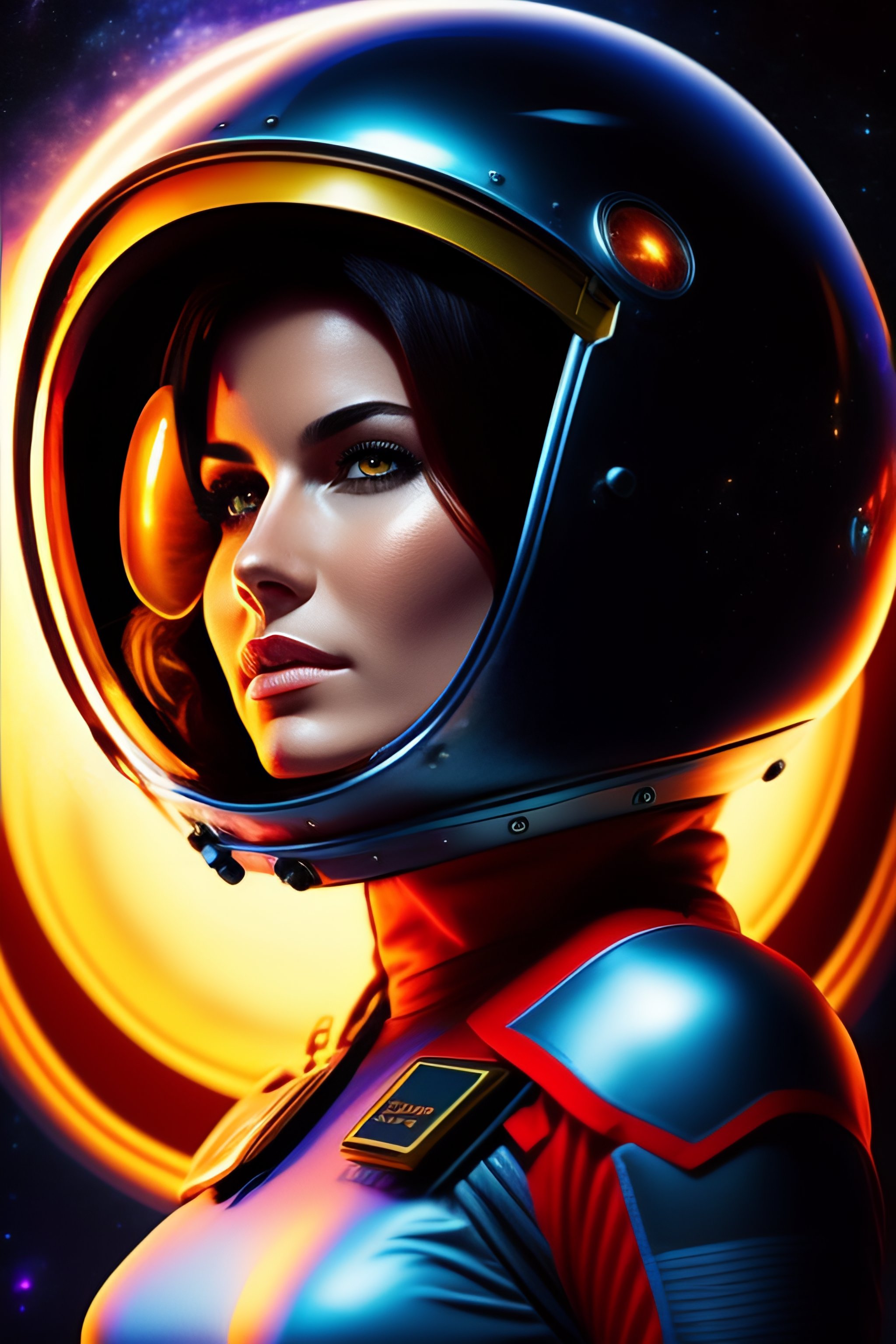 Hot spacegirl in costume with helmet in front of a blackhole