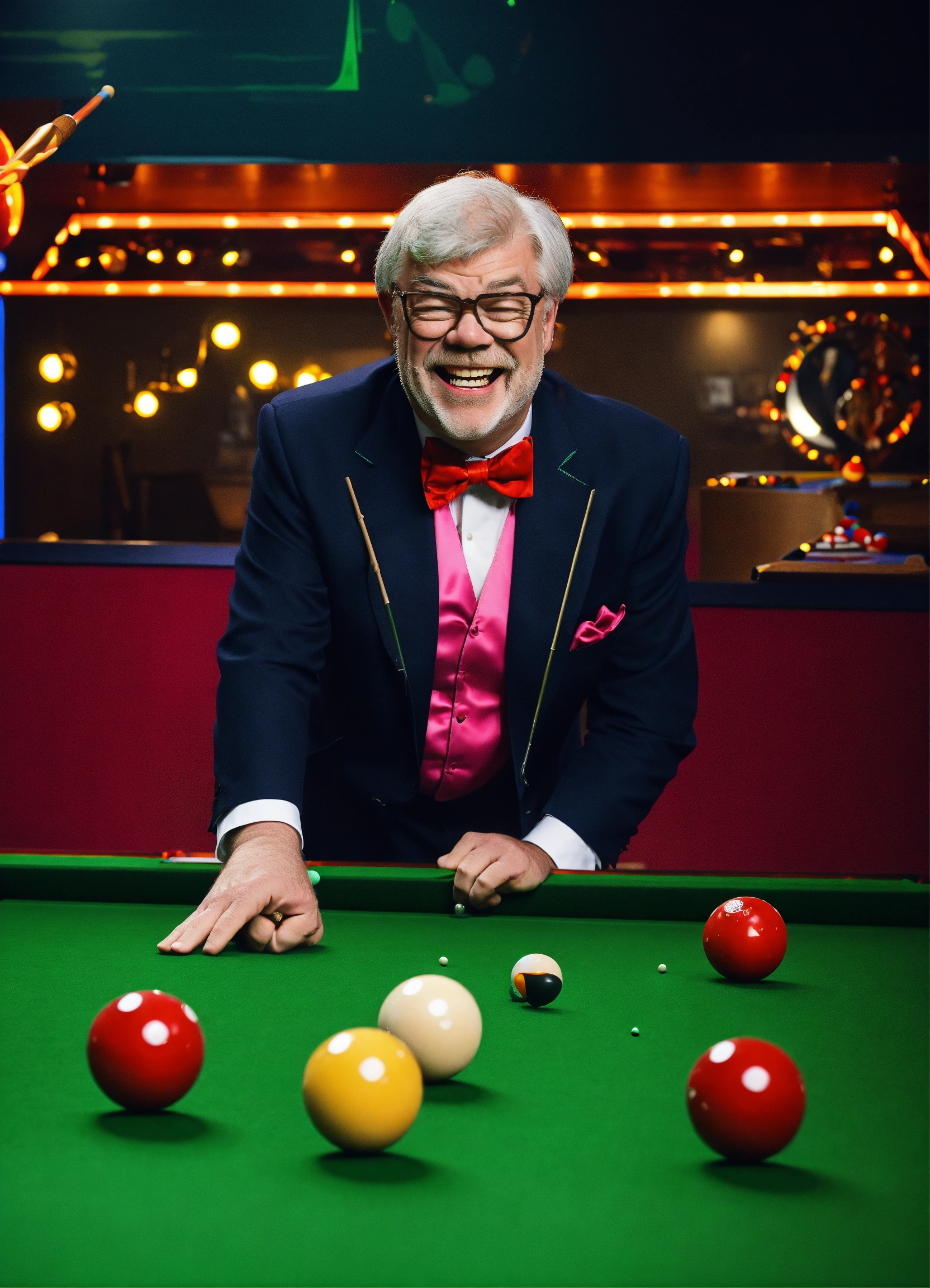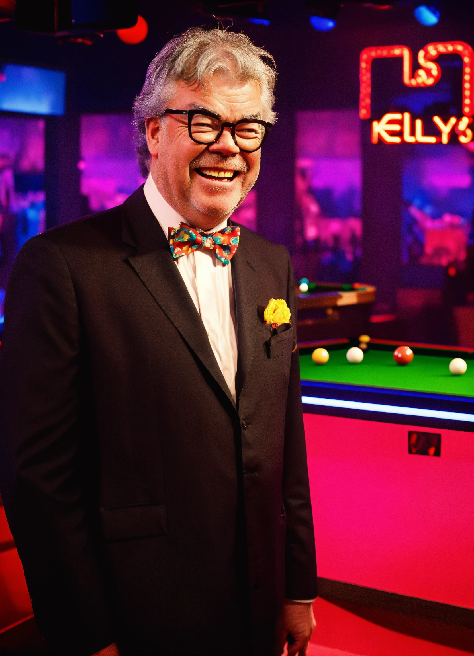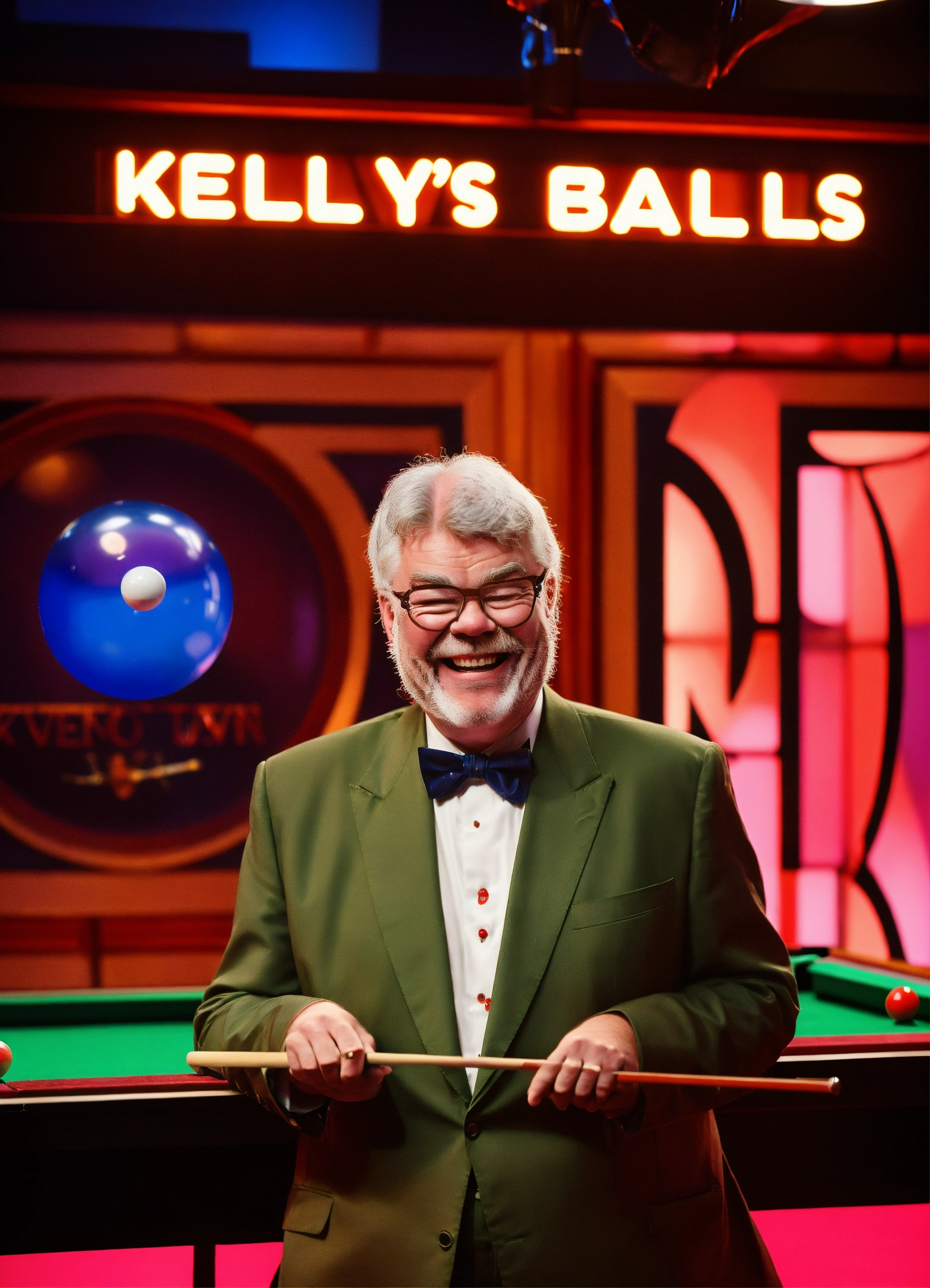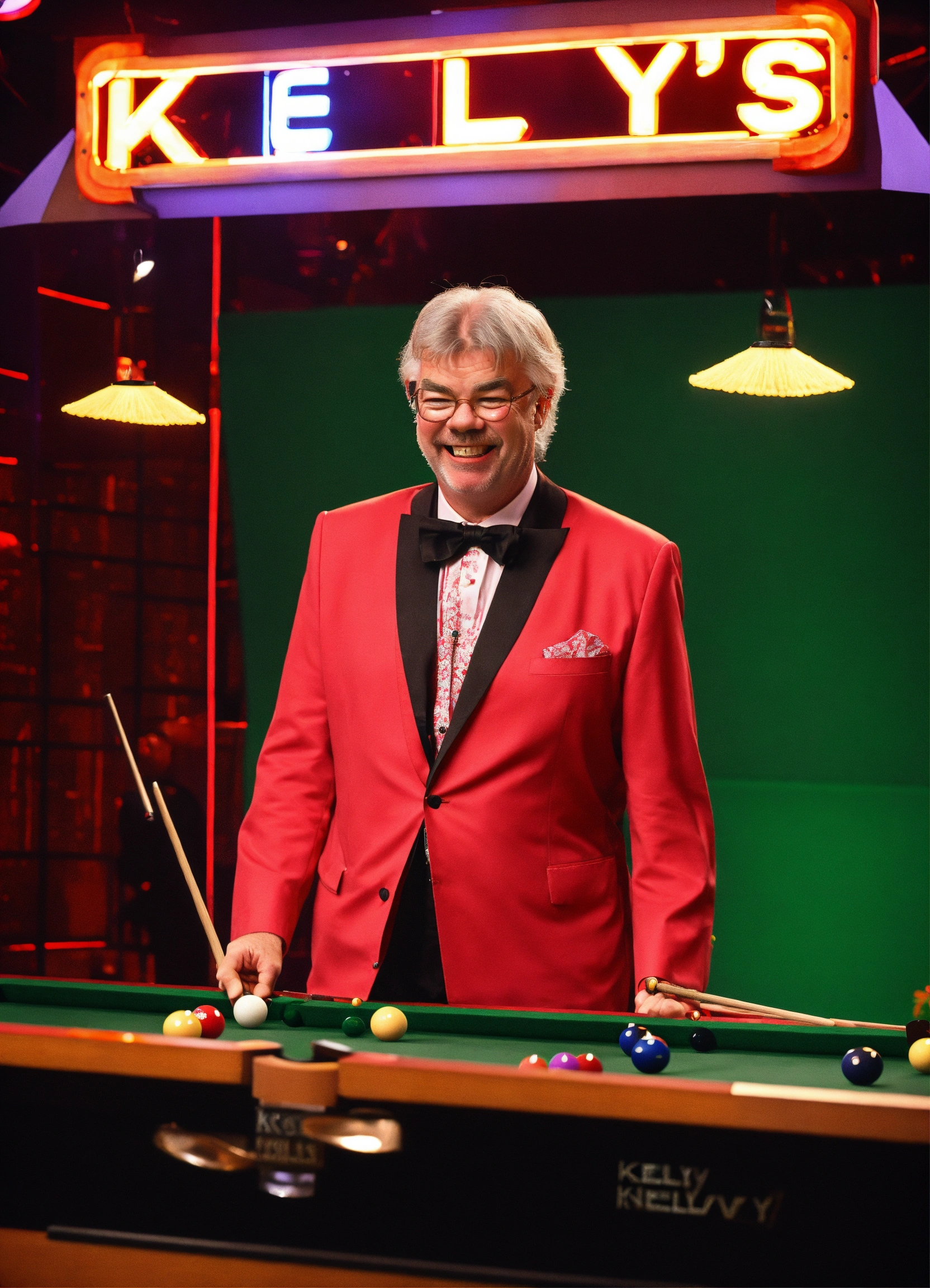 Tv gameshow being filmed in studio, matthew kelly wearing oversized upside down glasses, enormous oversized bow tie, playing snooker with a tiny short snooker cue, laughing. neon sign "kelly's balls", comedy. itv logo bottom right