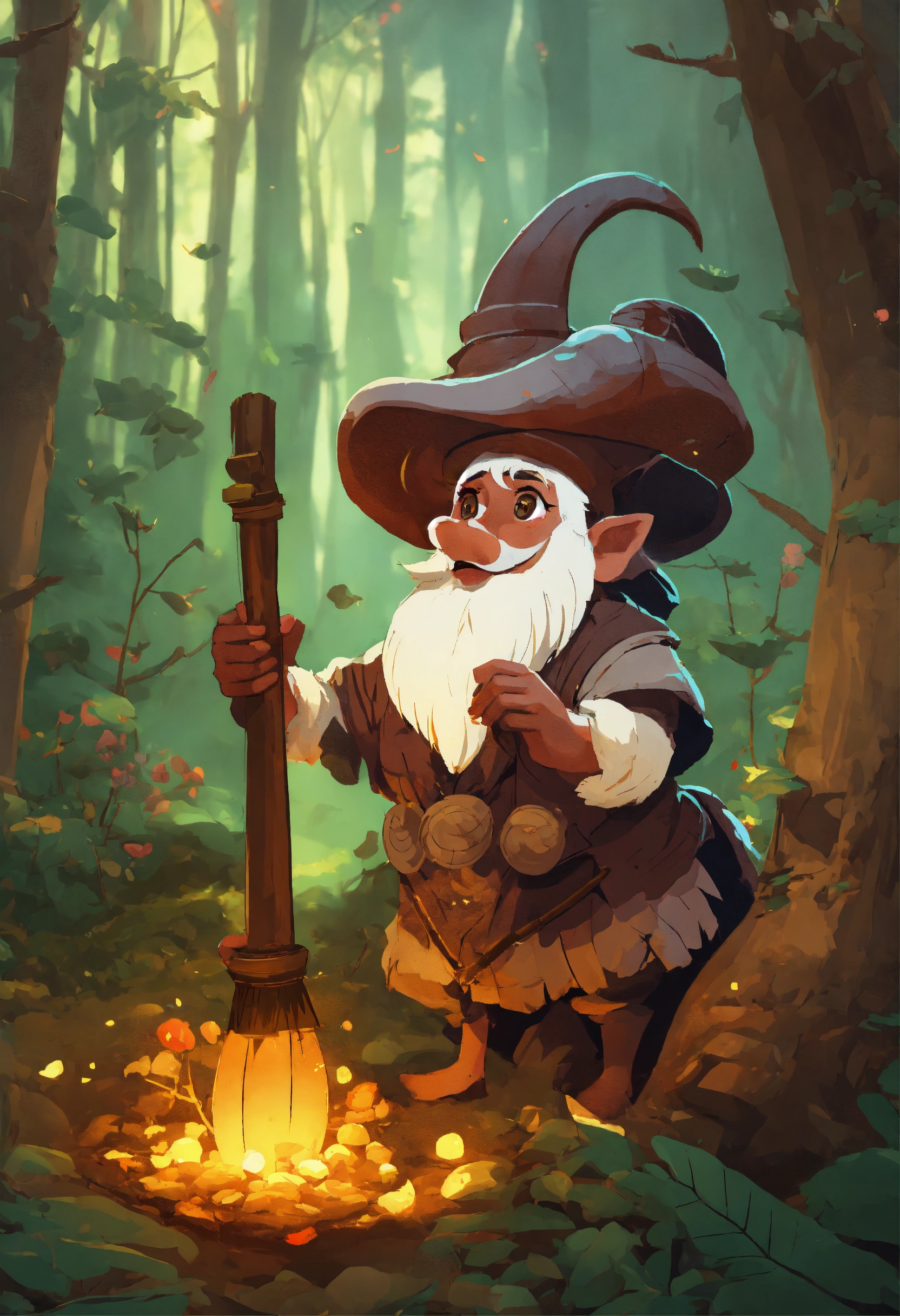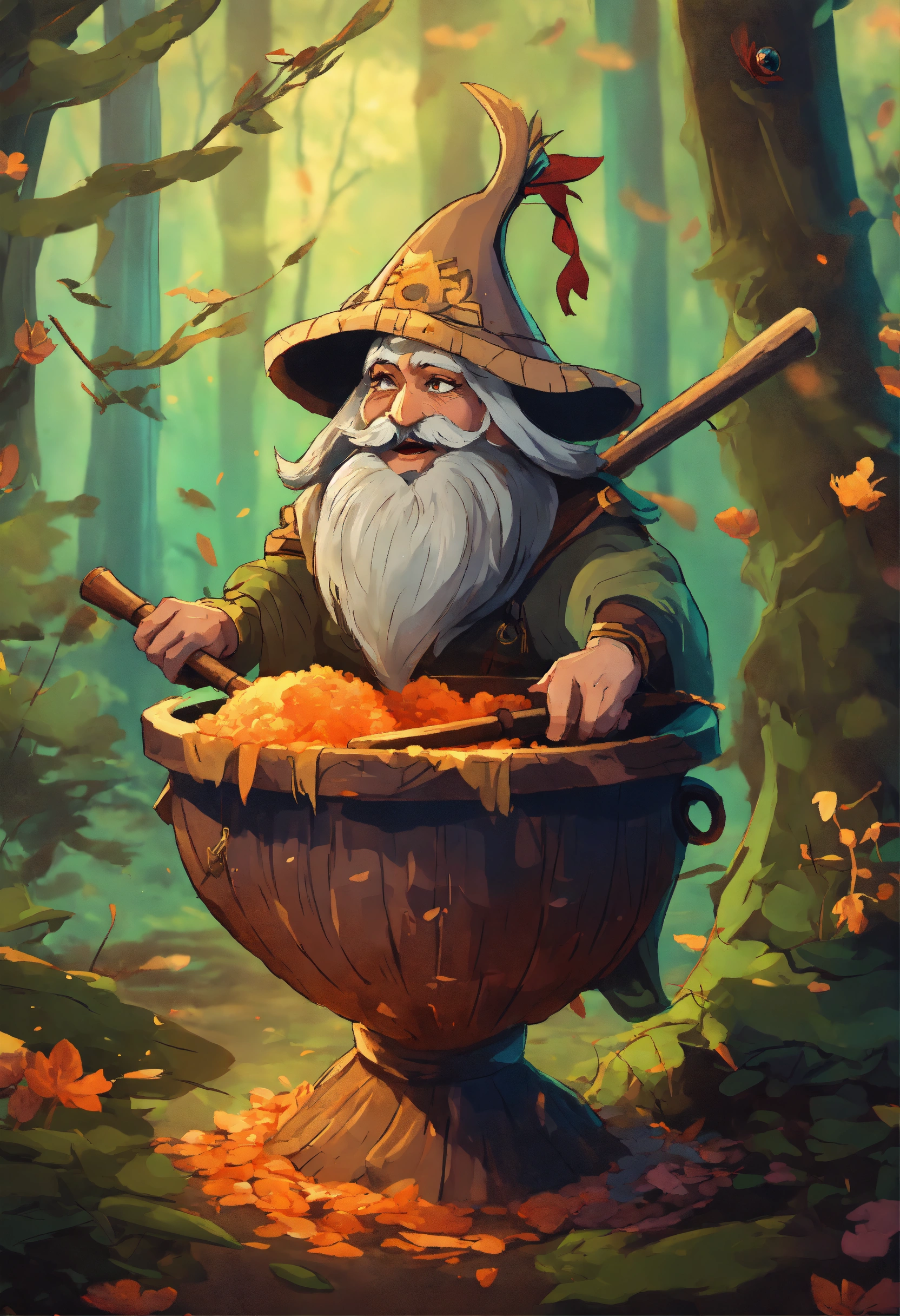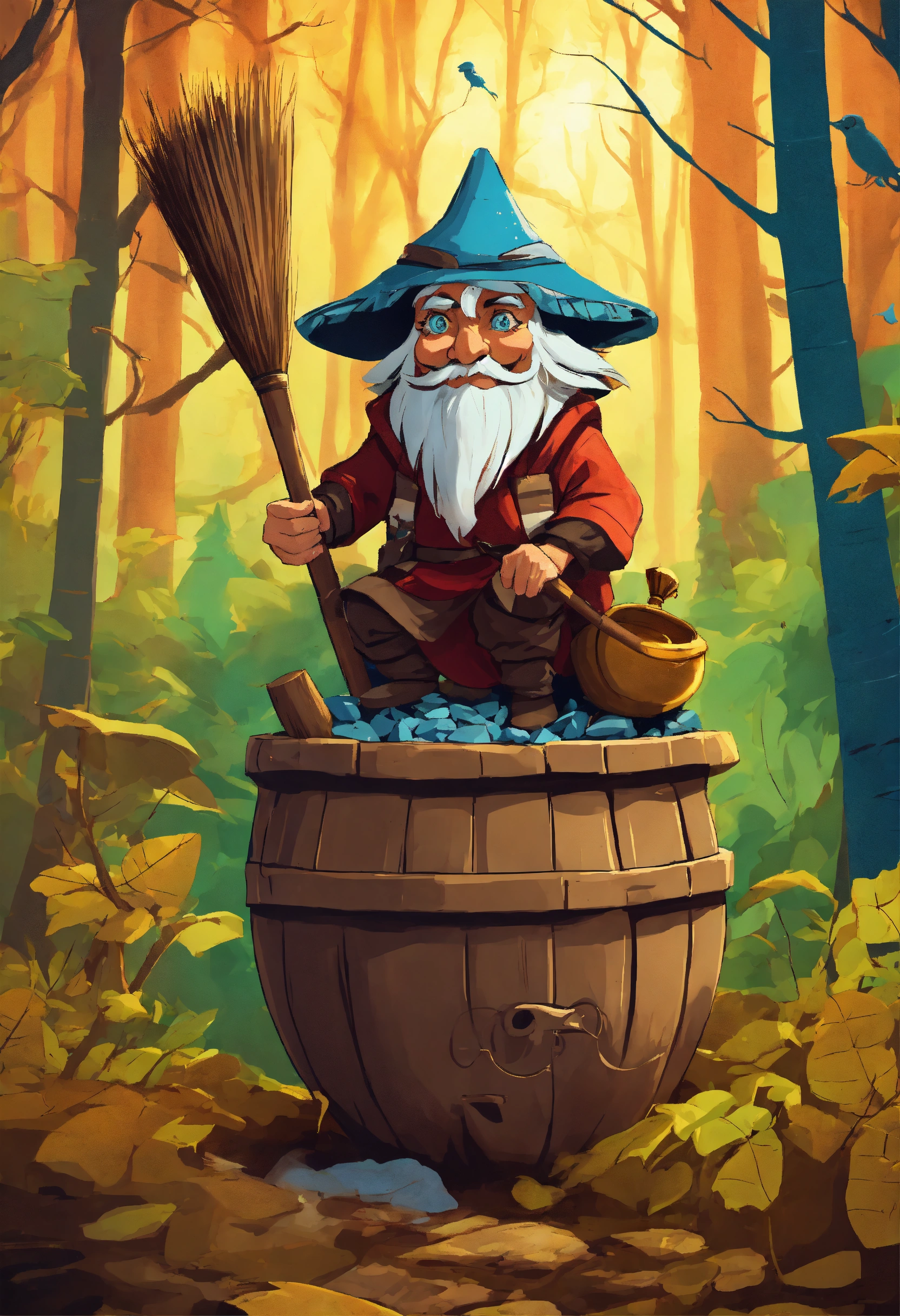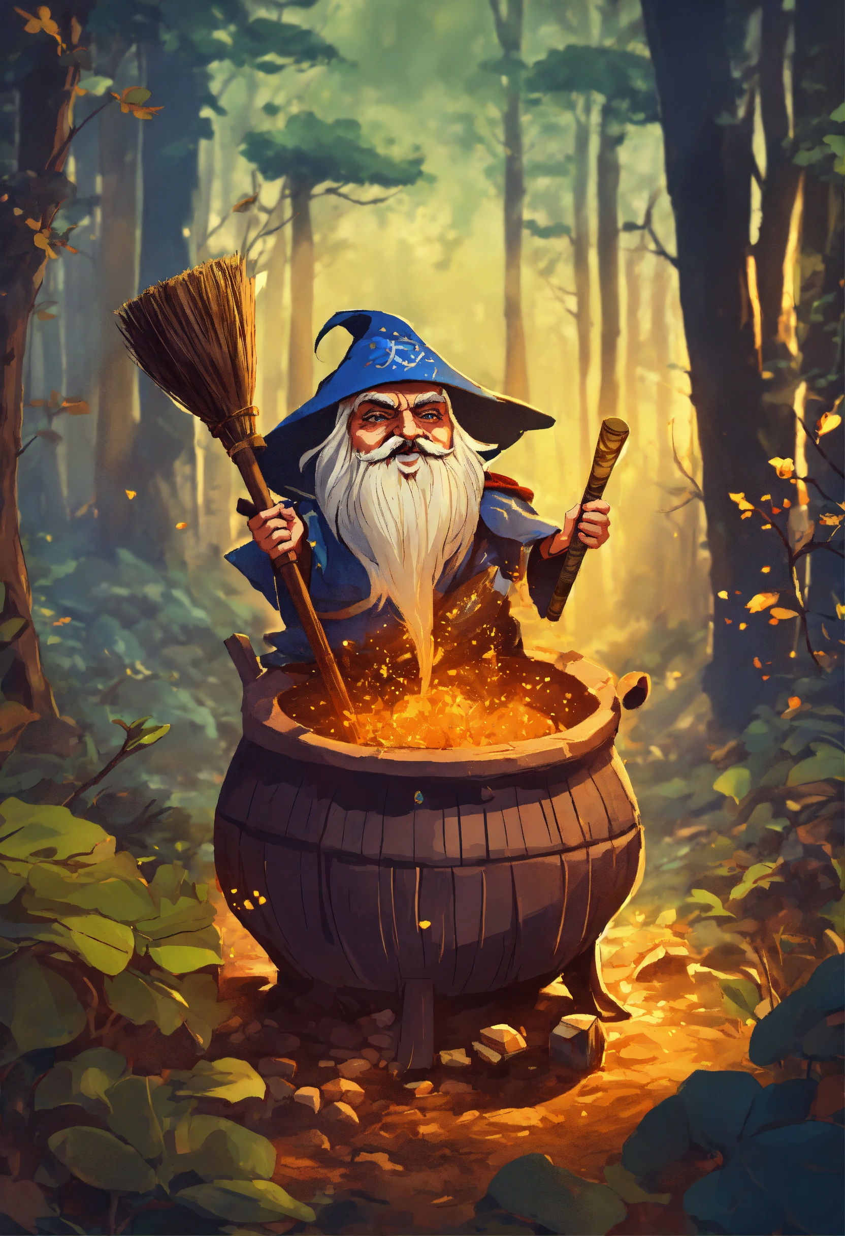 Fantasy cartoon style baba yaga in a mortar with a broom in a magical forest