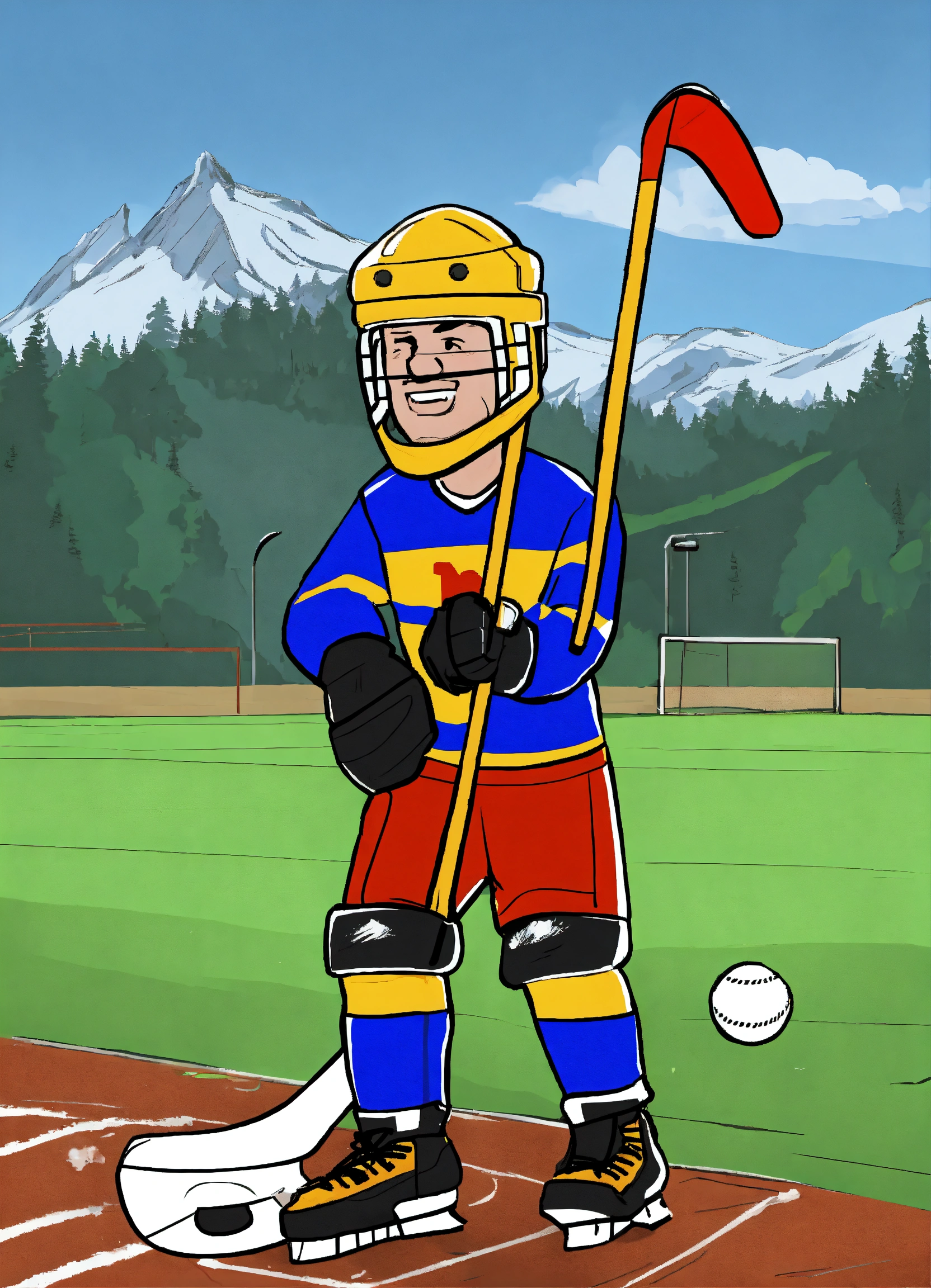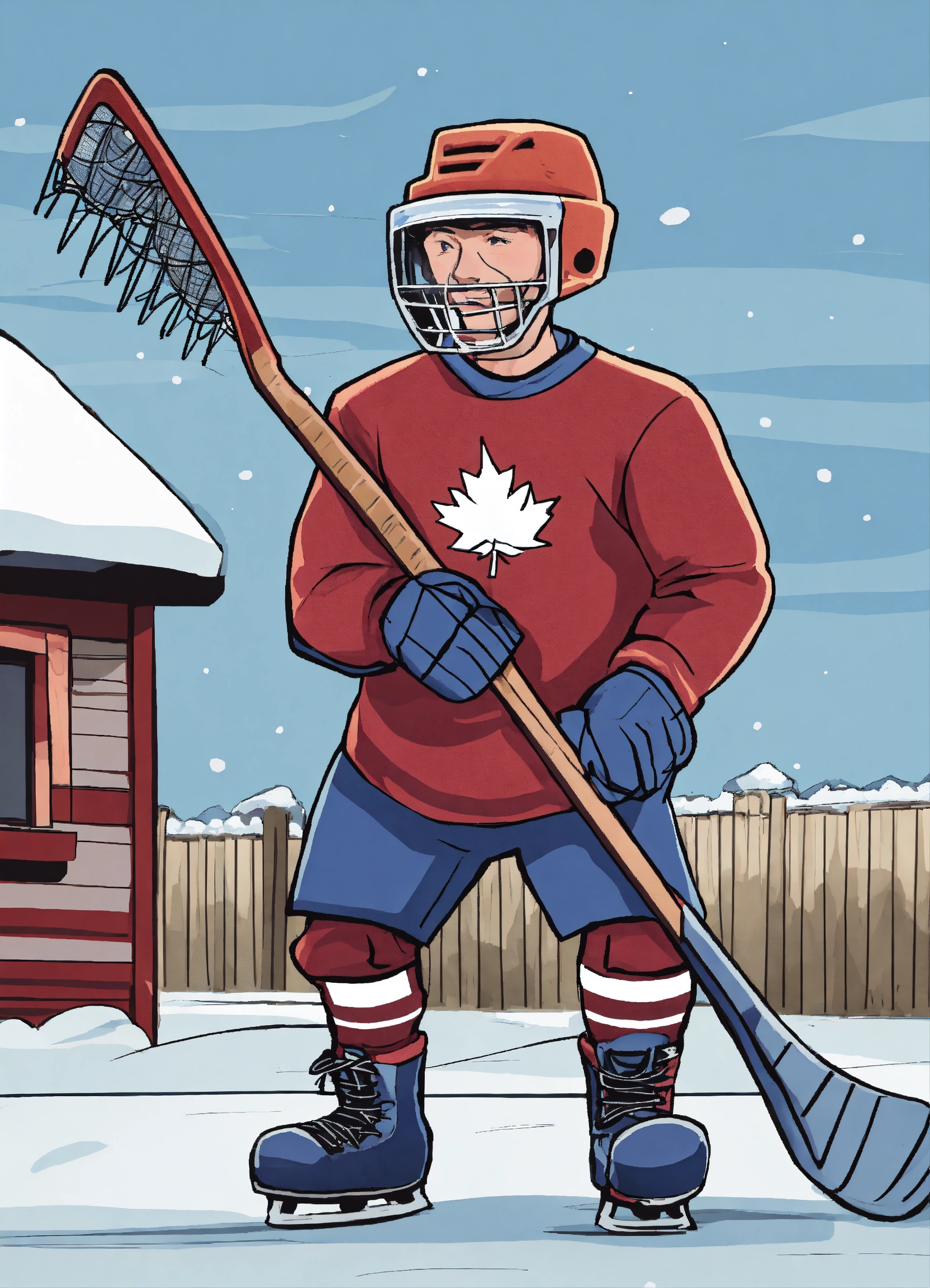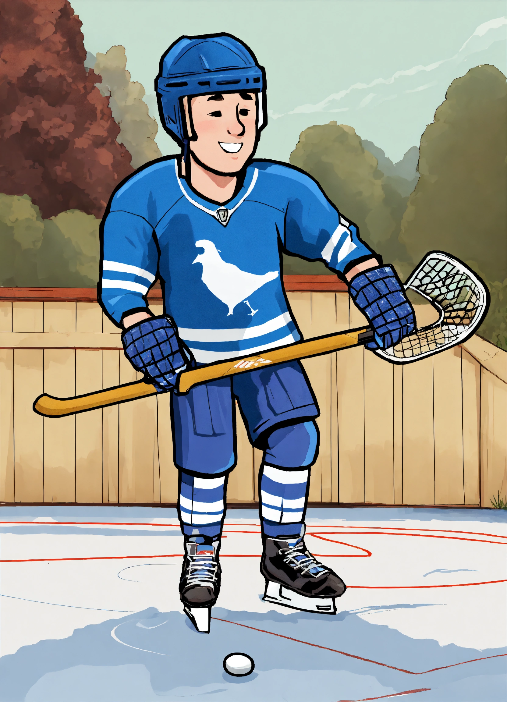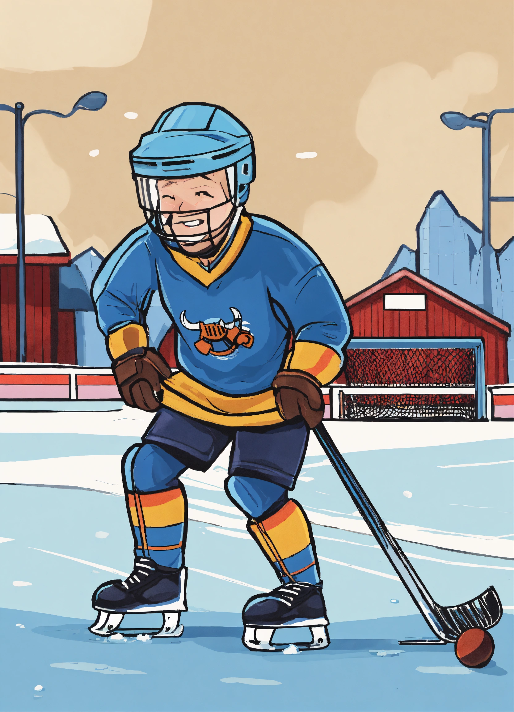 Generate an image of a cartoon farmer with an ice hockey helmet playing ice hockey with a pitchfork