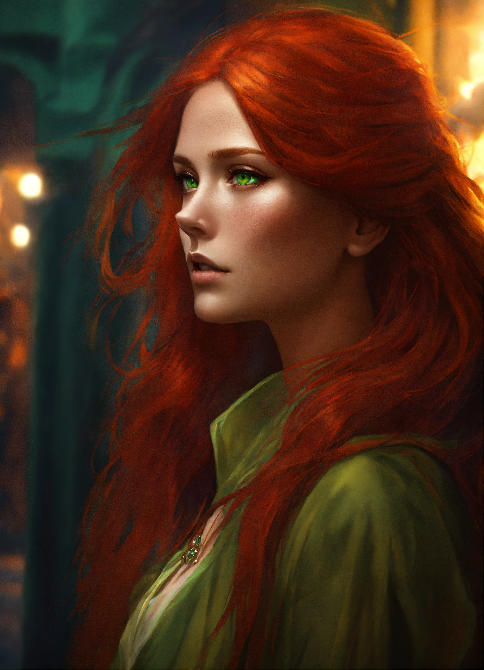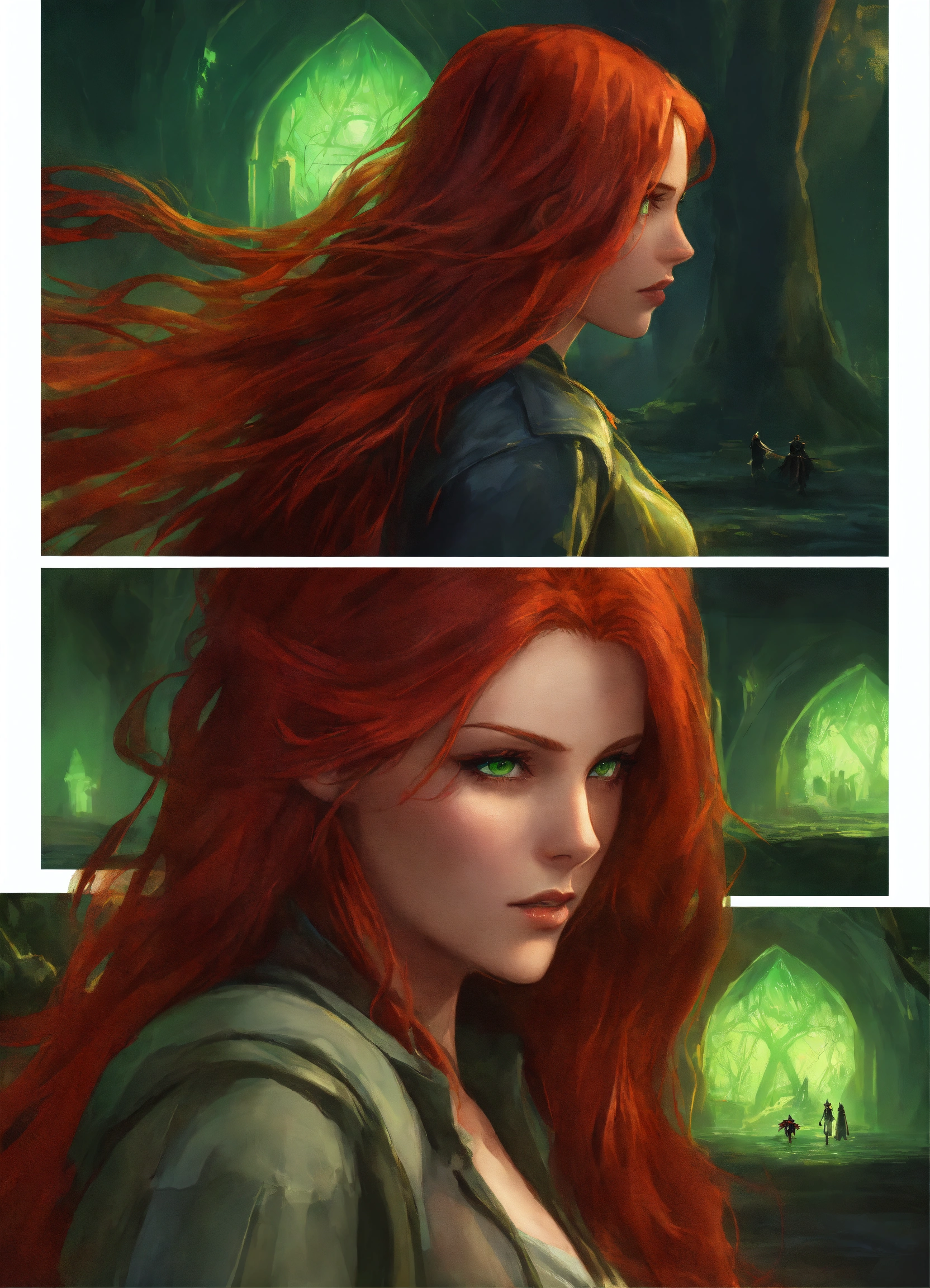 Ultra realism, long red hair on a woman with green eyes looking into a rift that a demon is walking out of in the rifts rpg.