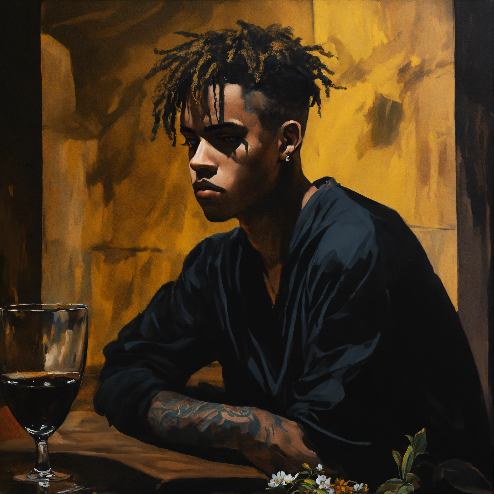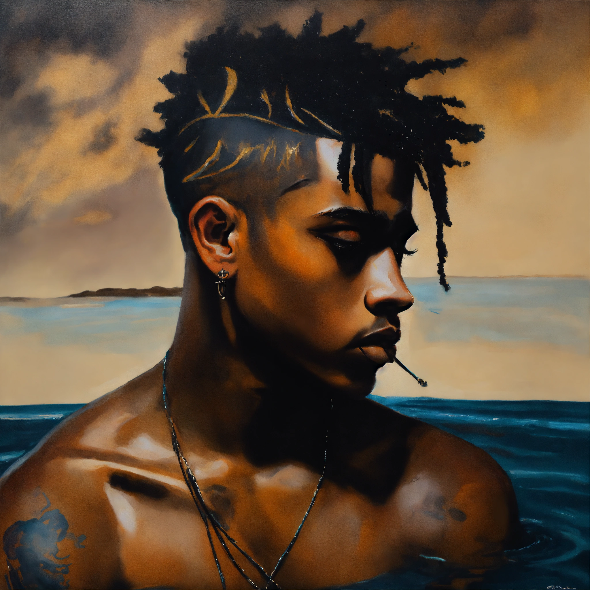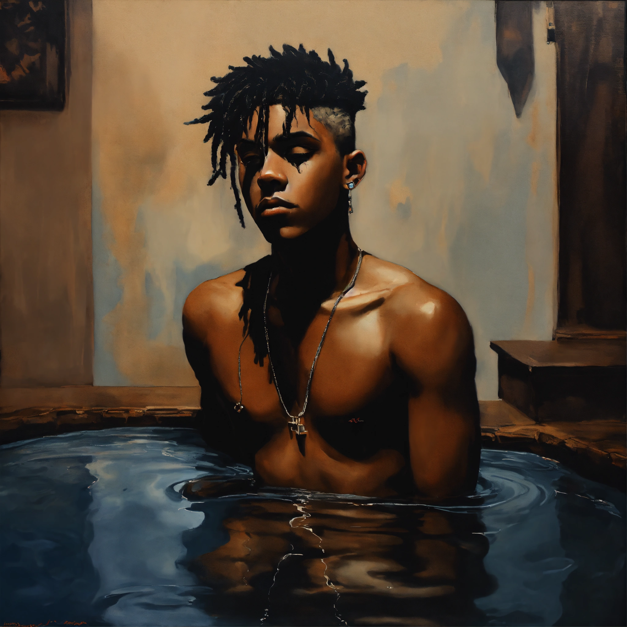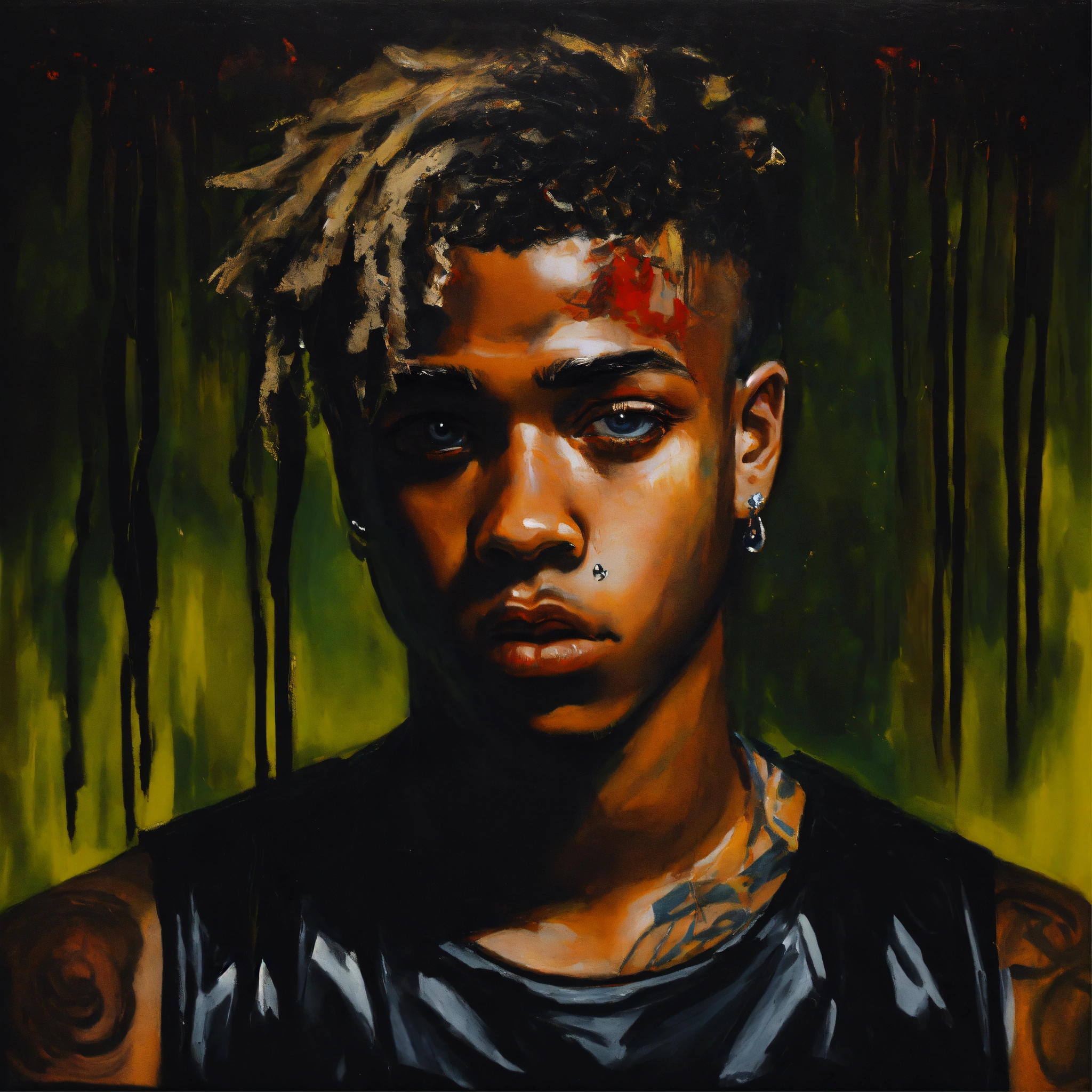 Title narcissus xxxtentacion style caravaggio description a painting of xxxtentacion in the style of caravaggio, with a similar vibe to narcissus. xxxtentacion is gazing into a pool of water, seeing his reflection. his eyes are sad and introspective, and his expression is one of longing. the painting is dark and moody, with a strong sense of atmosphere. additional instructions use dark, rich colors, such as black, brown, and red. focus on the light and shadow to create a dramatic effect. pay attention to the details of xxxtentacion's face and tattoos. capture the introspective and longing expression in his eyes. create a painting that is both visually stunning and emotionally evocative.