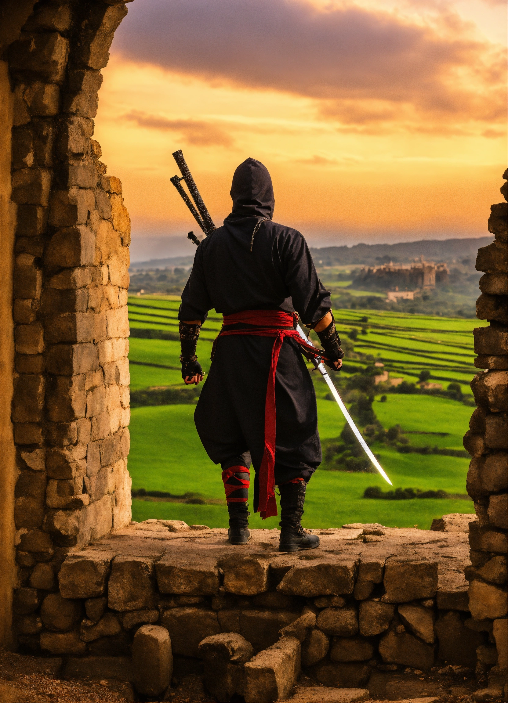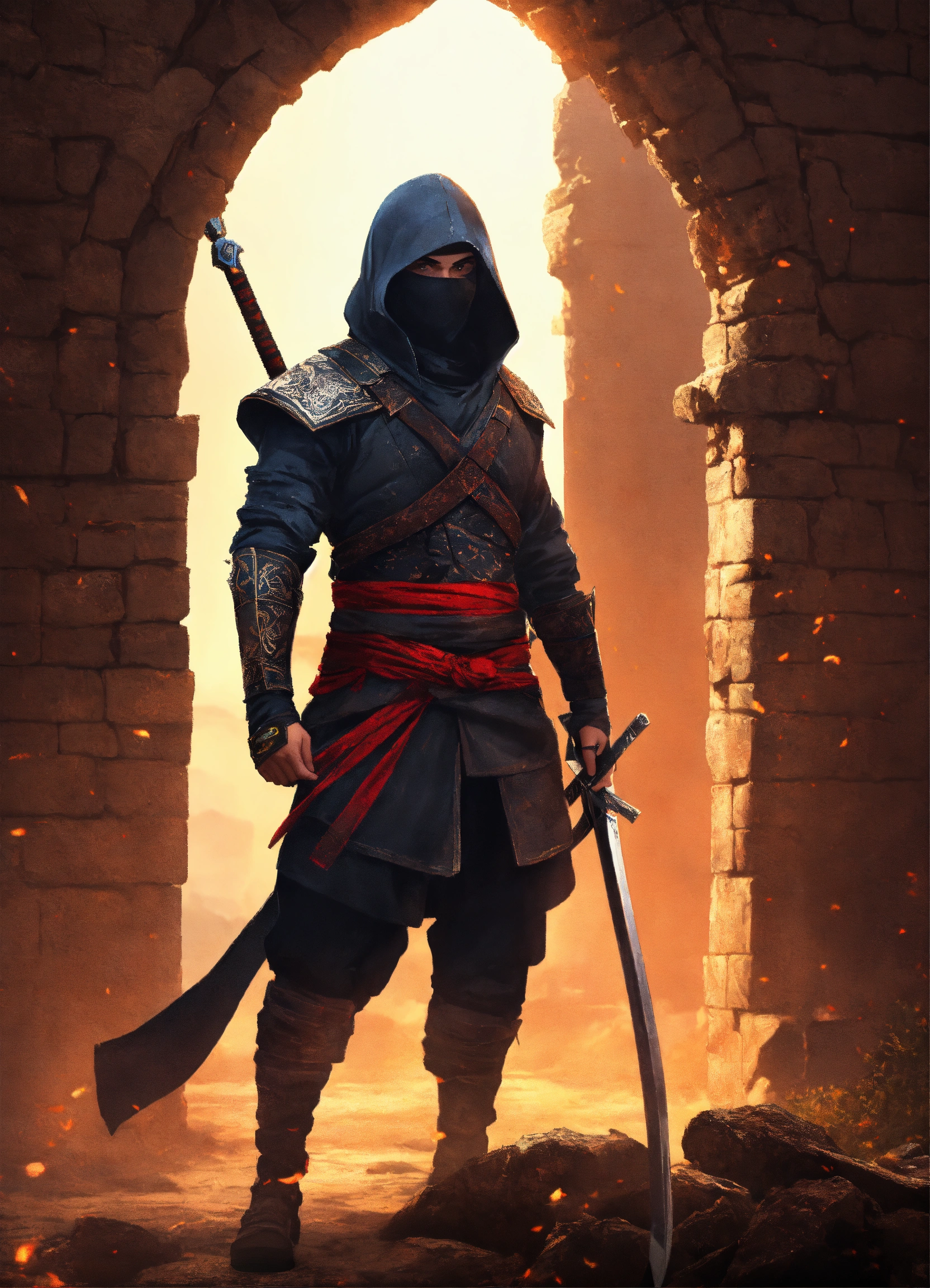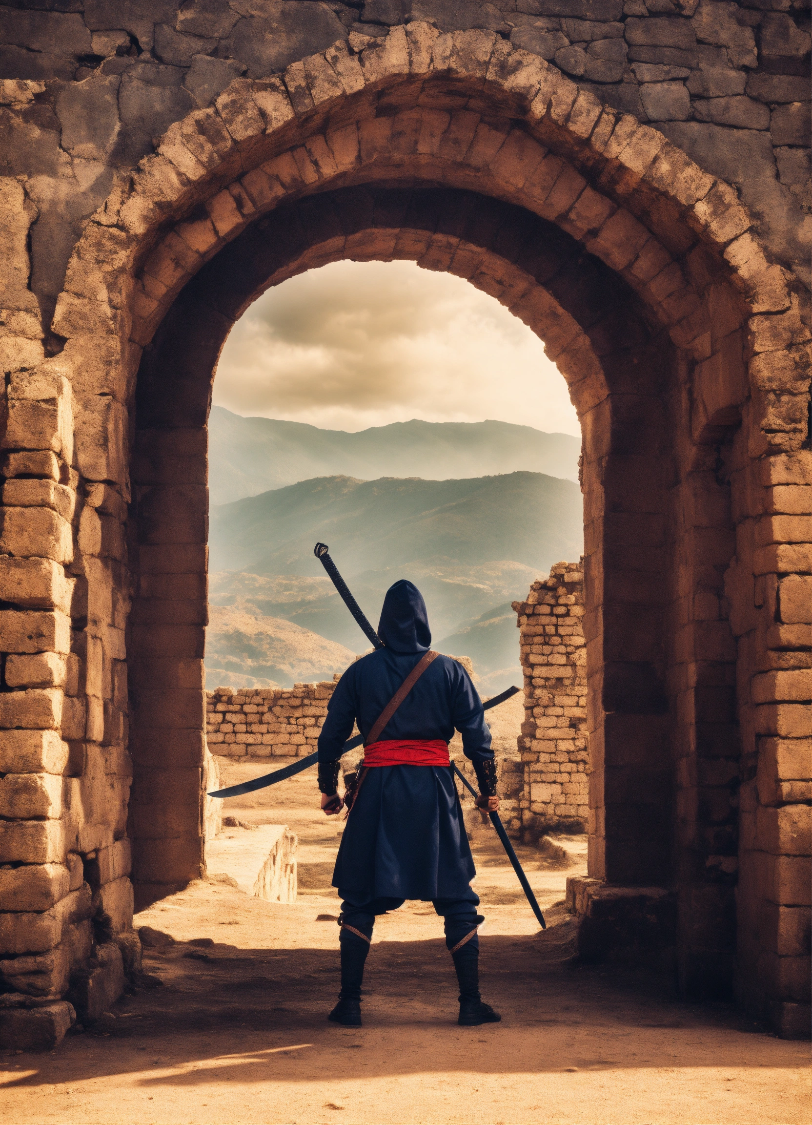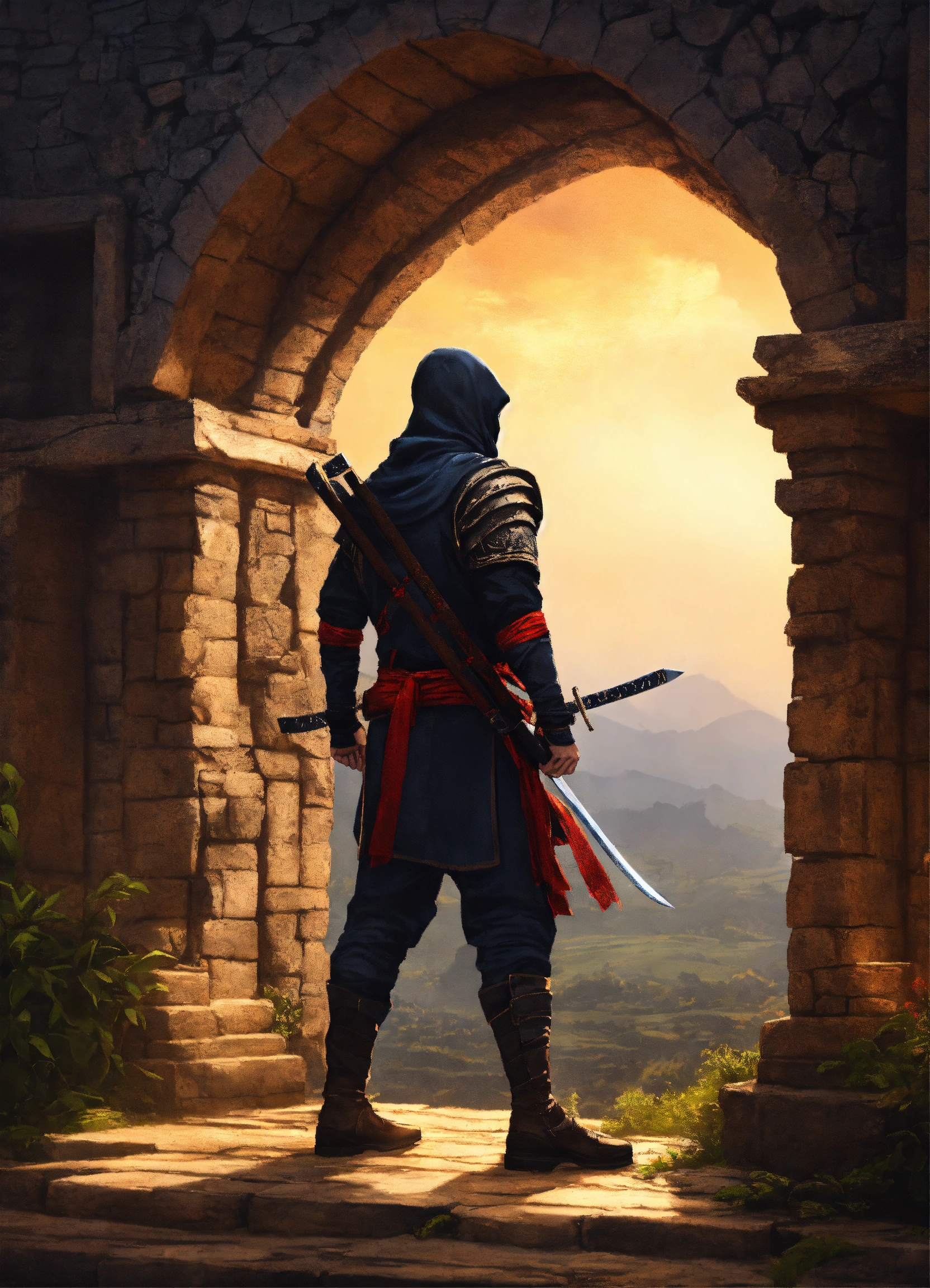 Ninja de espaldas con un gran arco y un fondo en ruinas
