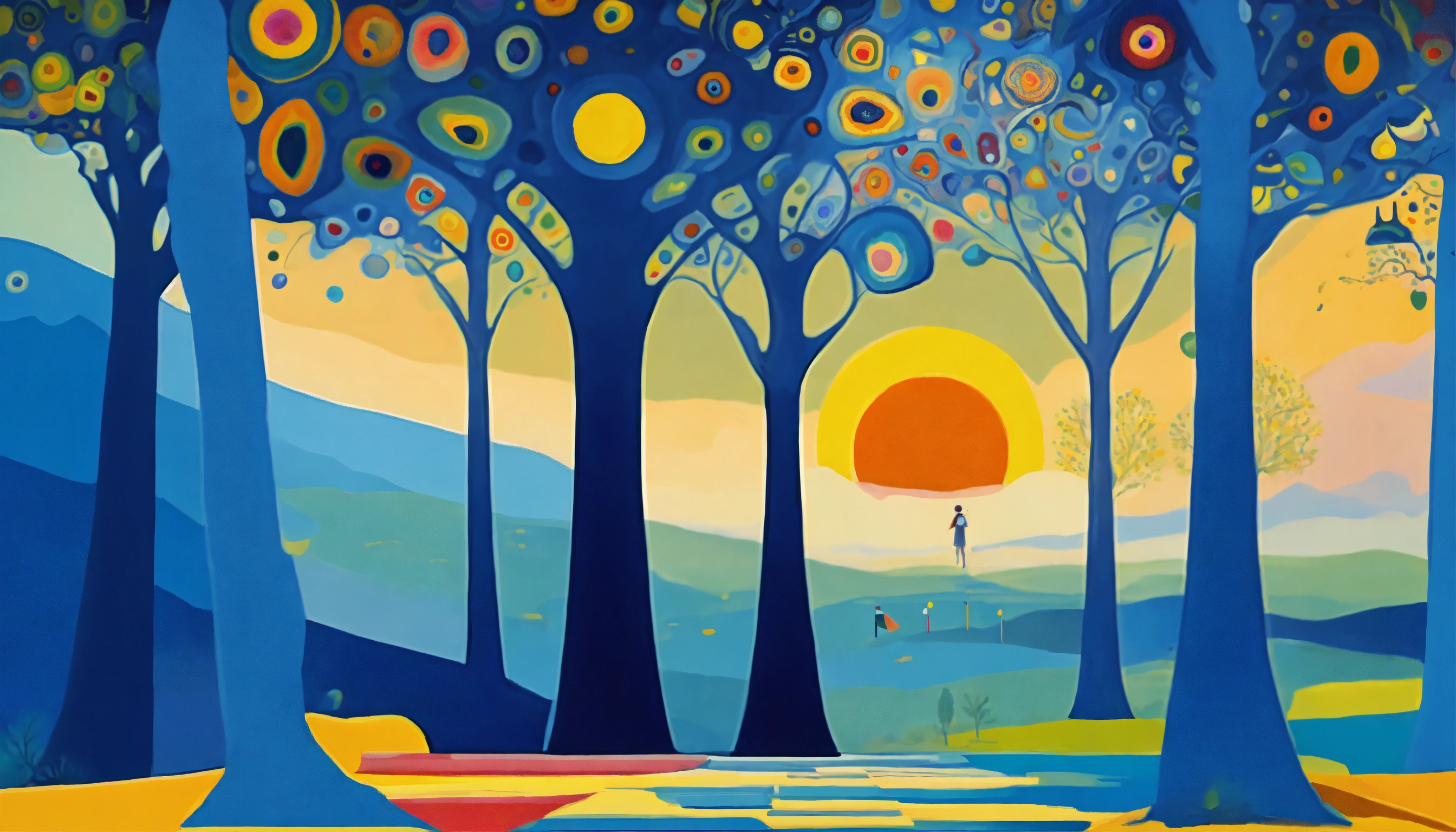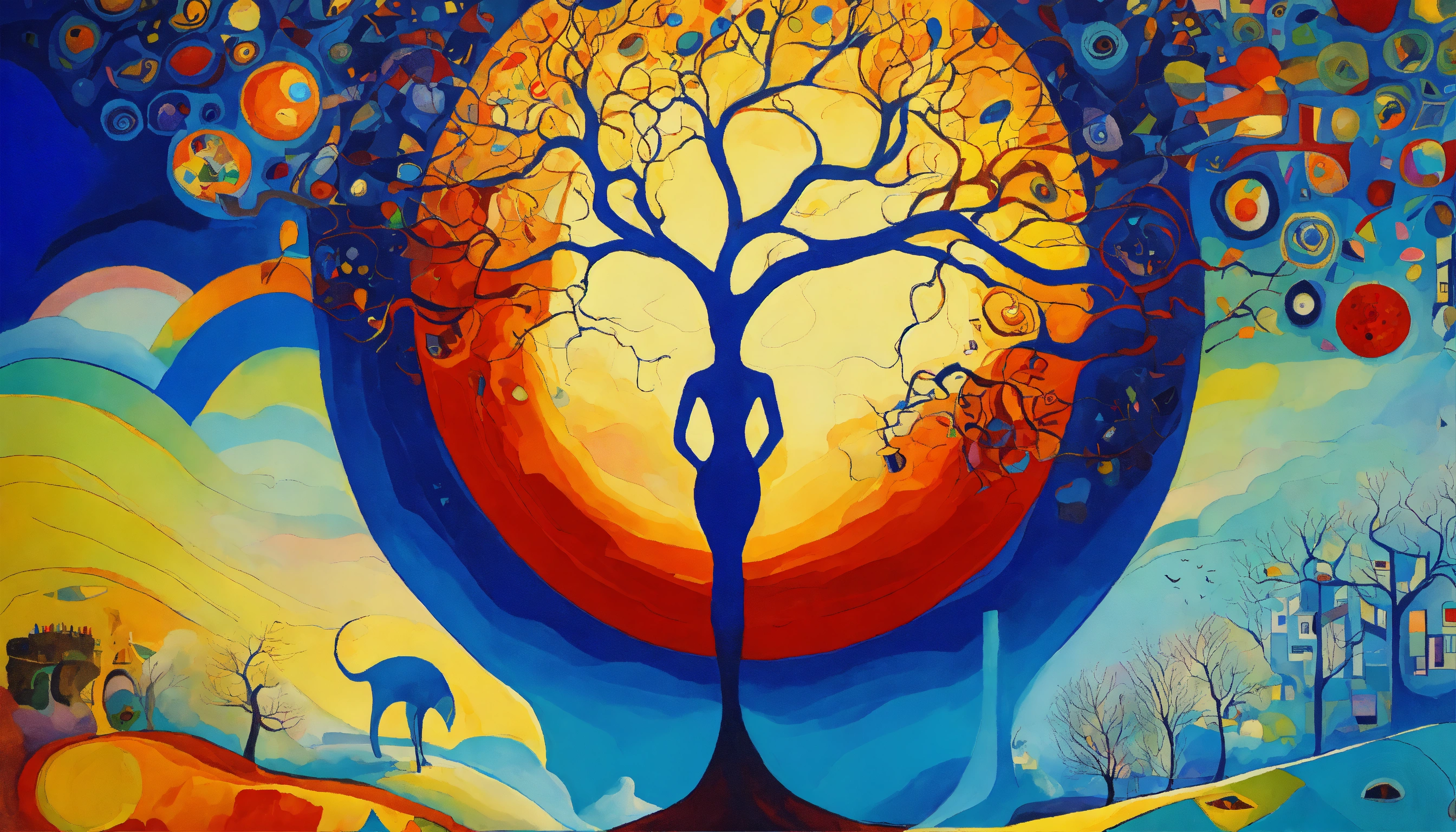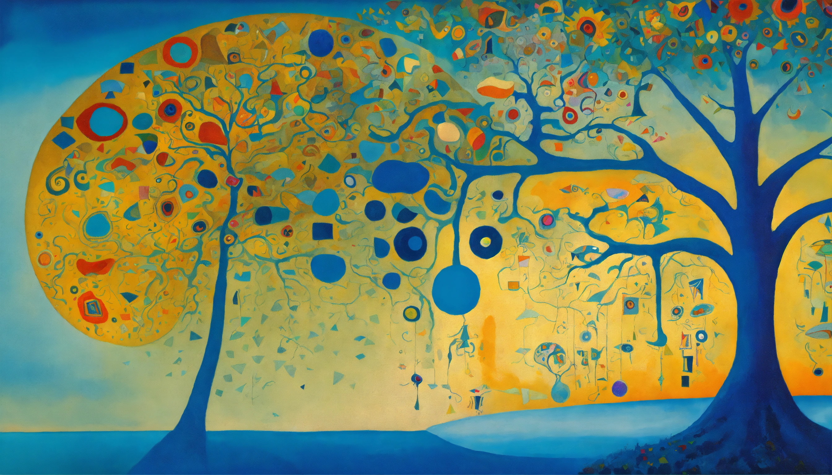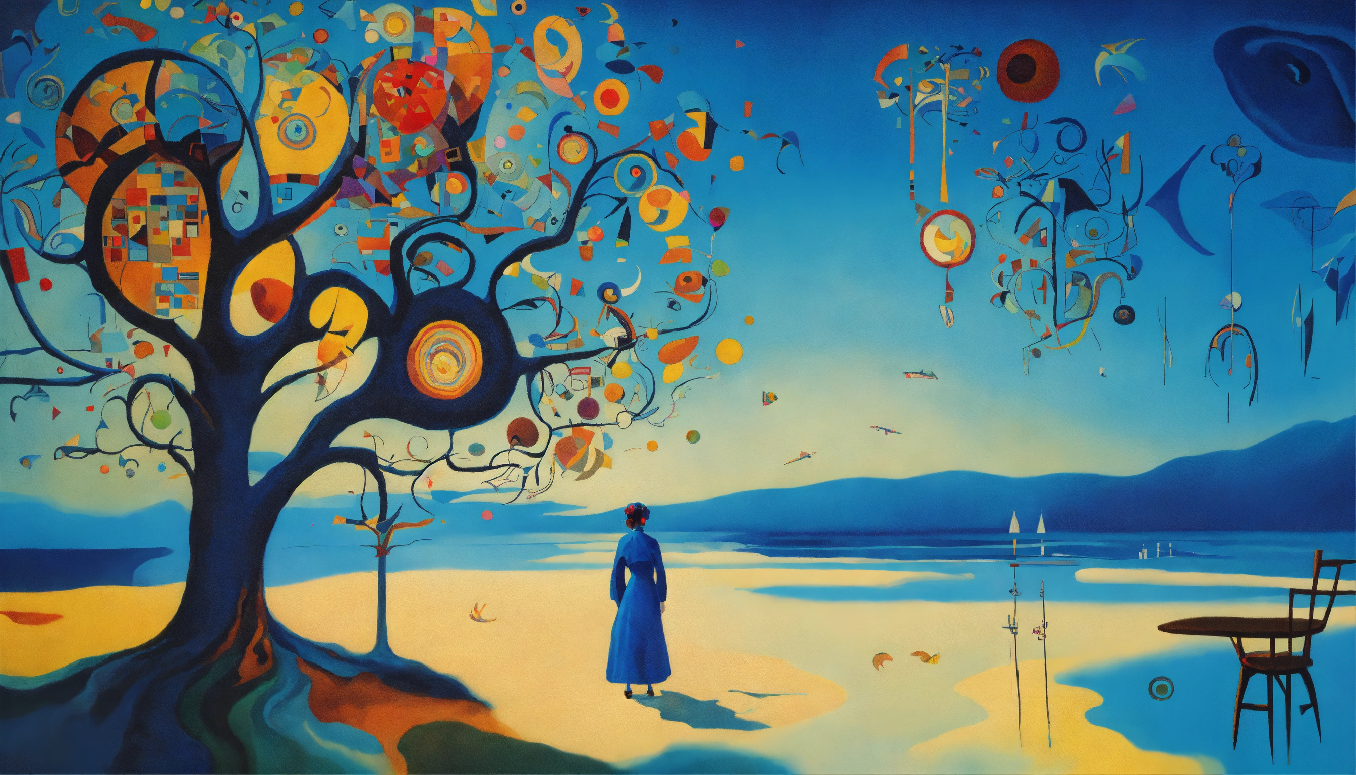 Poster for psychologist, meaning of life, thoughts in her head, psychedelia, tree of life, surrealism, salvador dali style abstraction, wassily kandinsky, blue color scheme