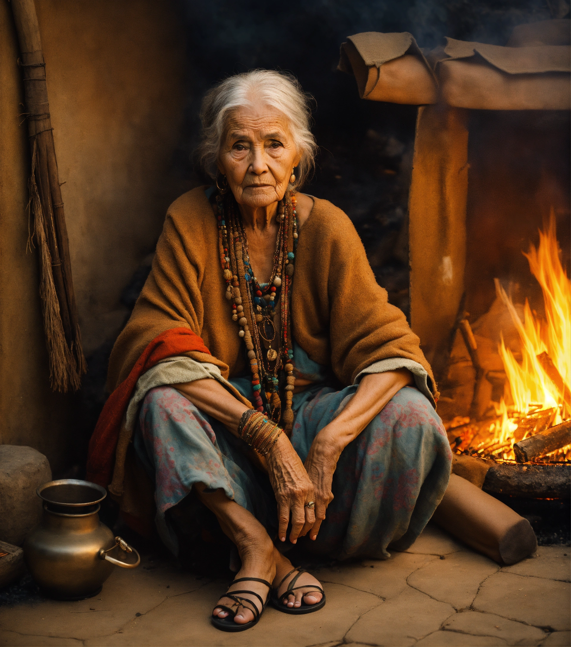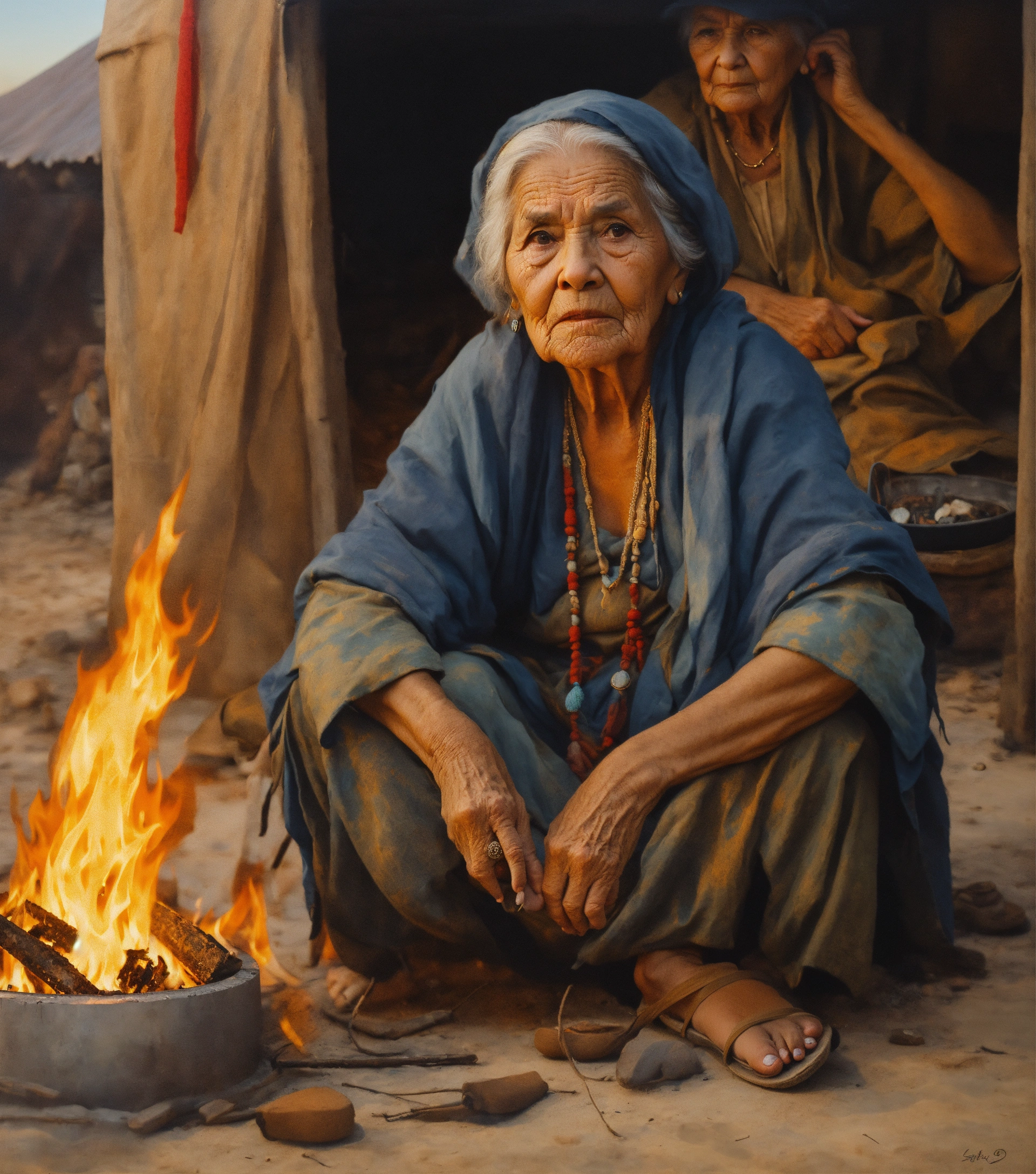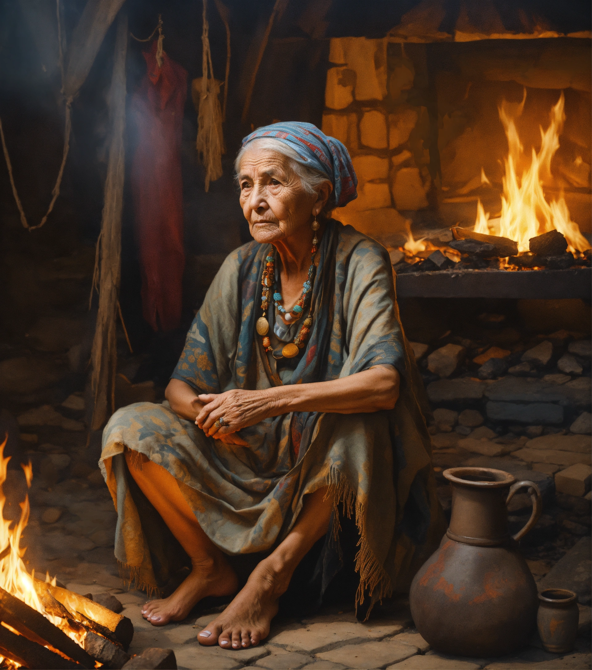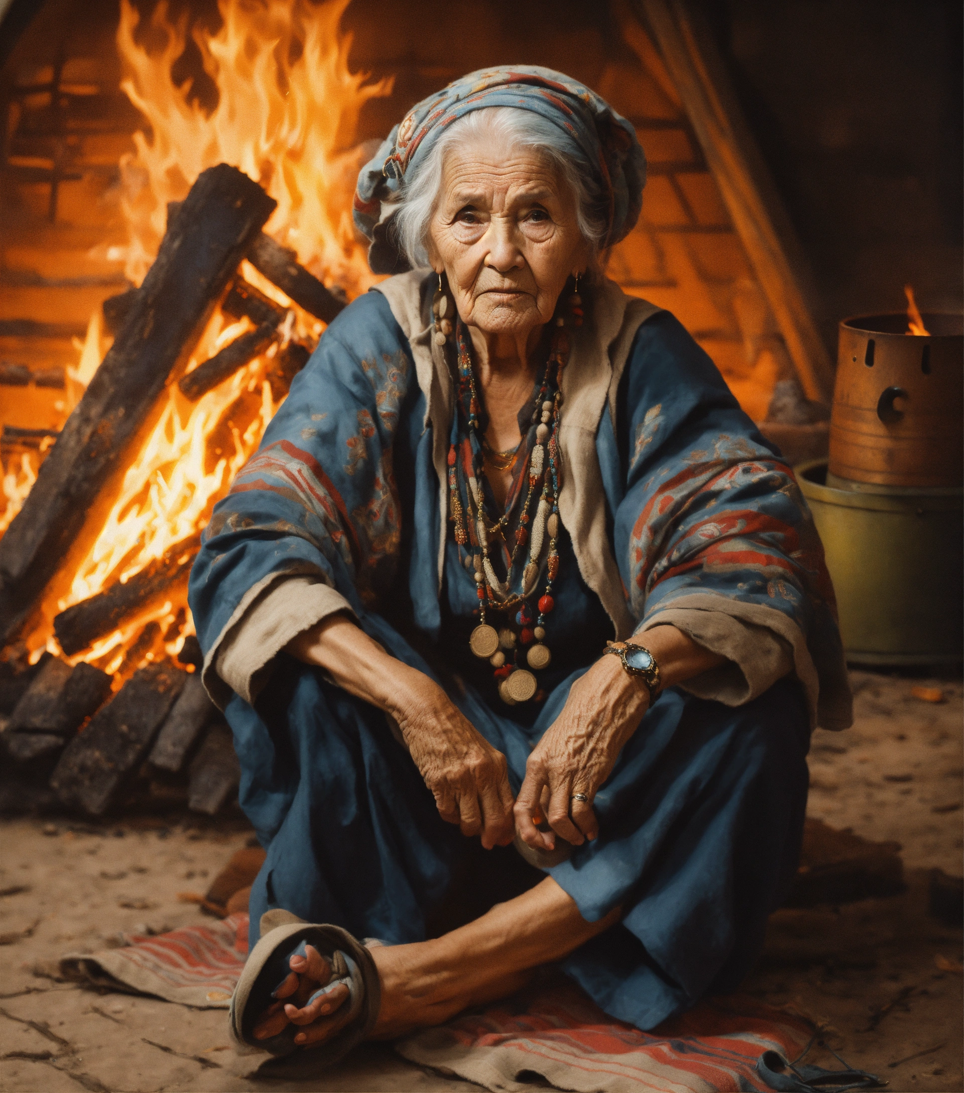 An ultrarealistic portrait of a wise old woman, dressed in tattered clothes, shoeless, serious expression, while sitting on the floor in front of a fire pit, inside a tribal tent.