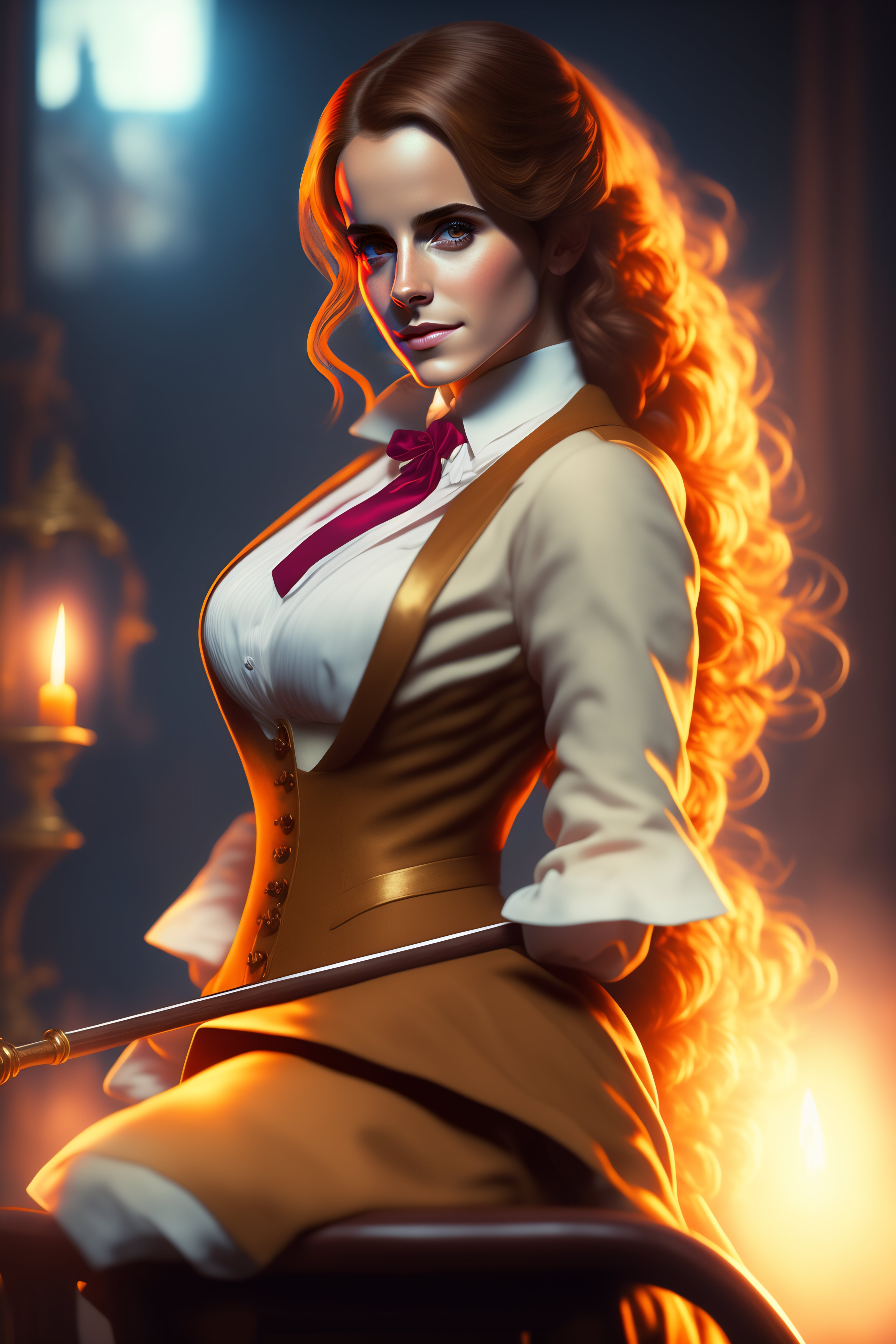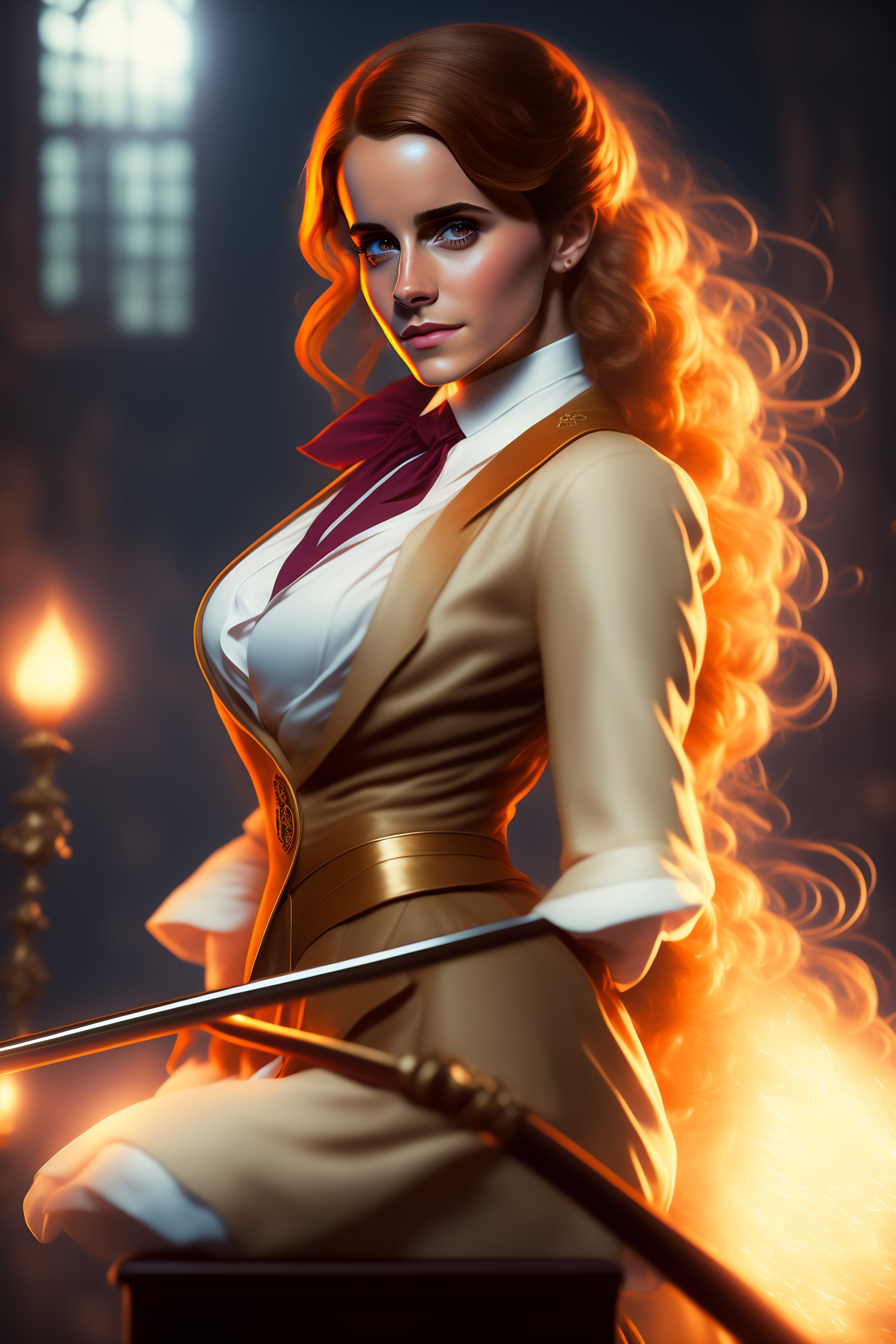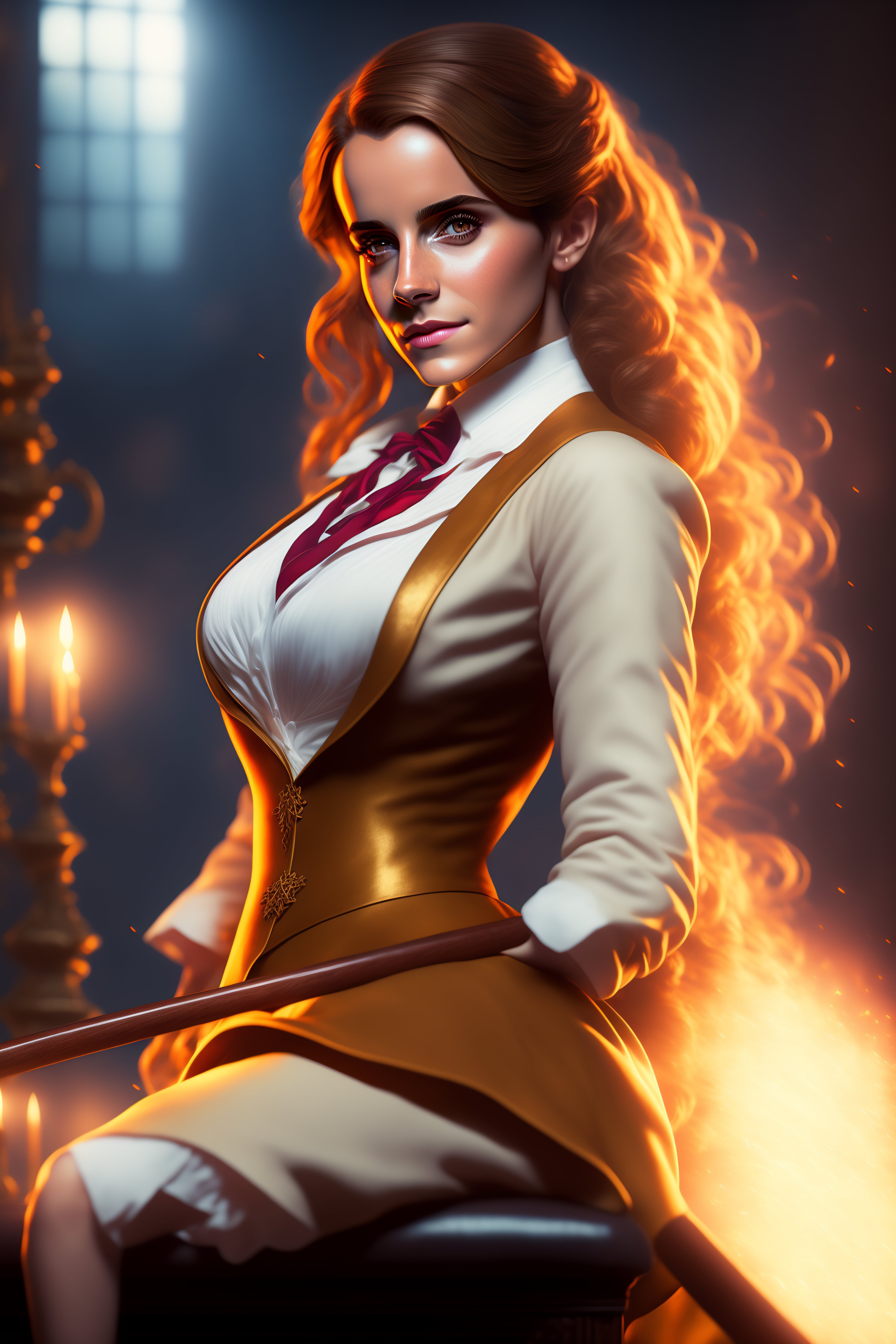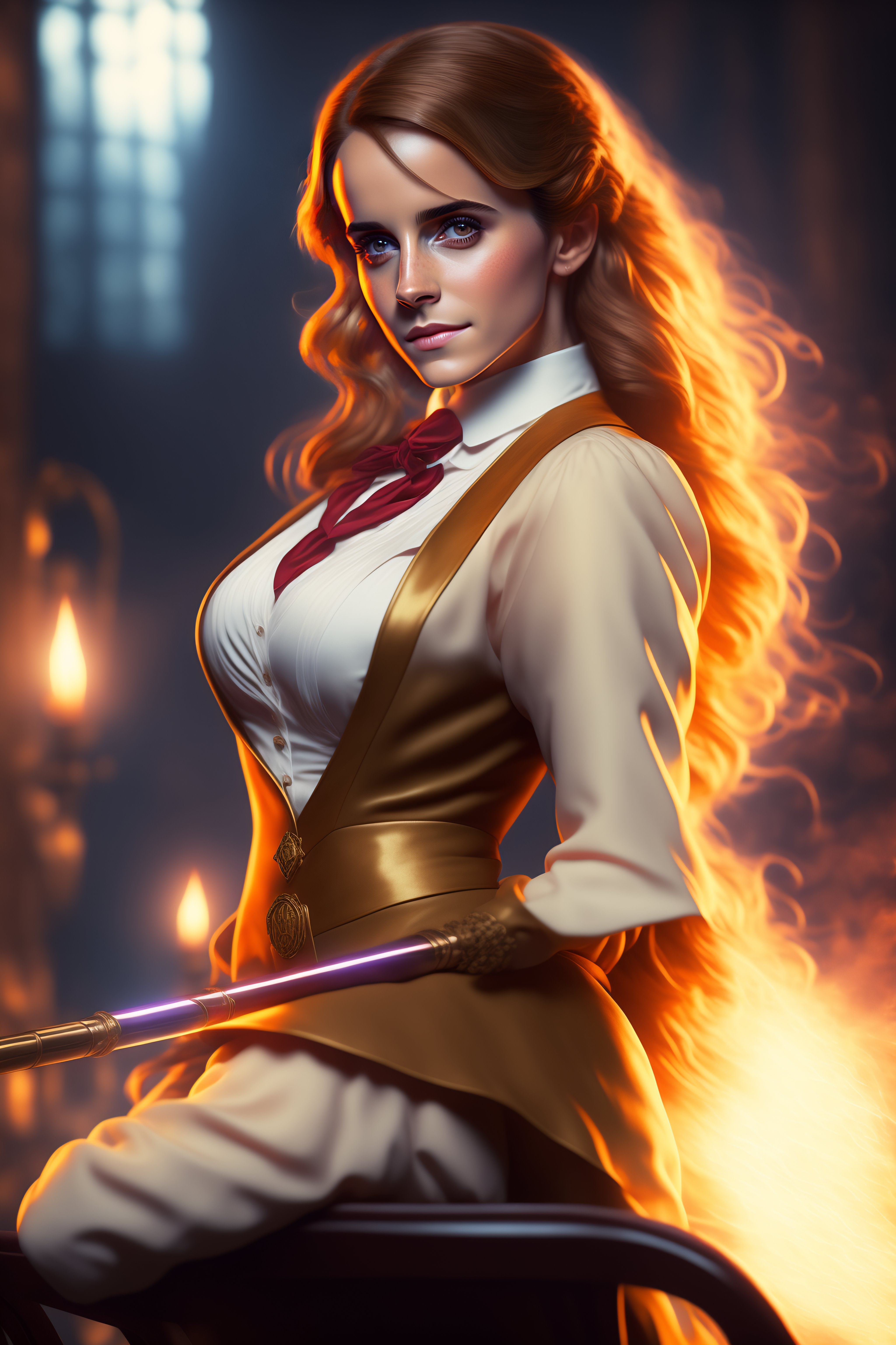 Emma watson cosplaying as hermione granger in a sexy hogwart's school uniform wearing a short skirt while sitting on a chair leaning back and balancing with her active wand in hand, by award winning digital artists, 8k resolution, hd, concept art portrait by greg rutkowski, artgerm, wlop, alphonse mucha dynamic lighting hyperdetailed intricately detailed splash art trending on artstation triadic colors unreal engine 5 volumetric lighting"