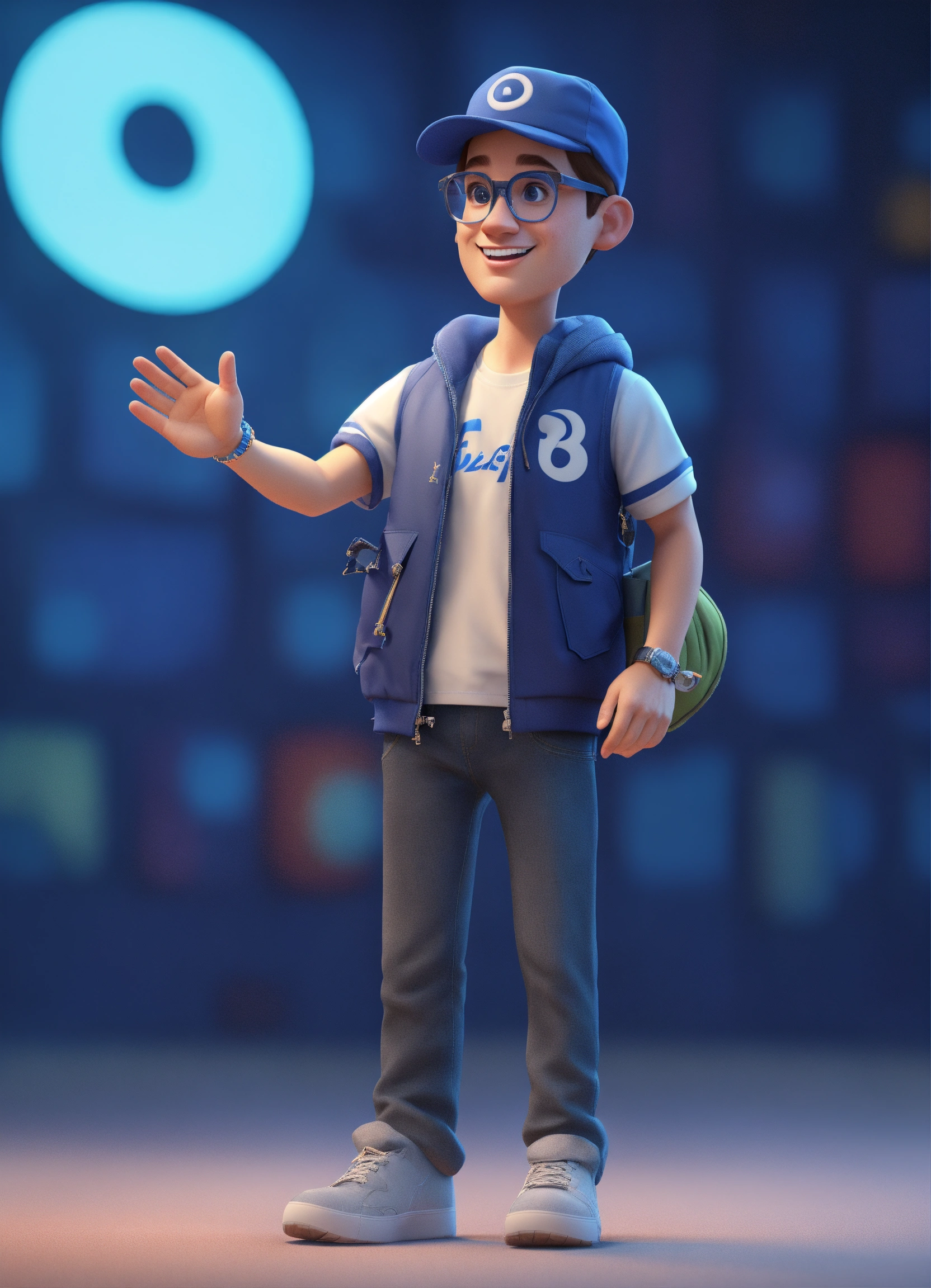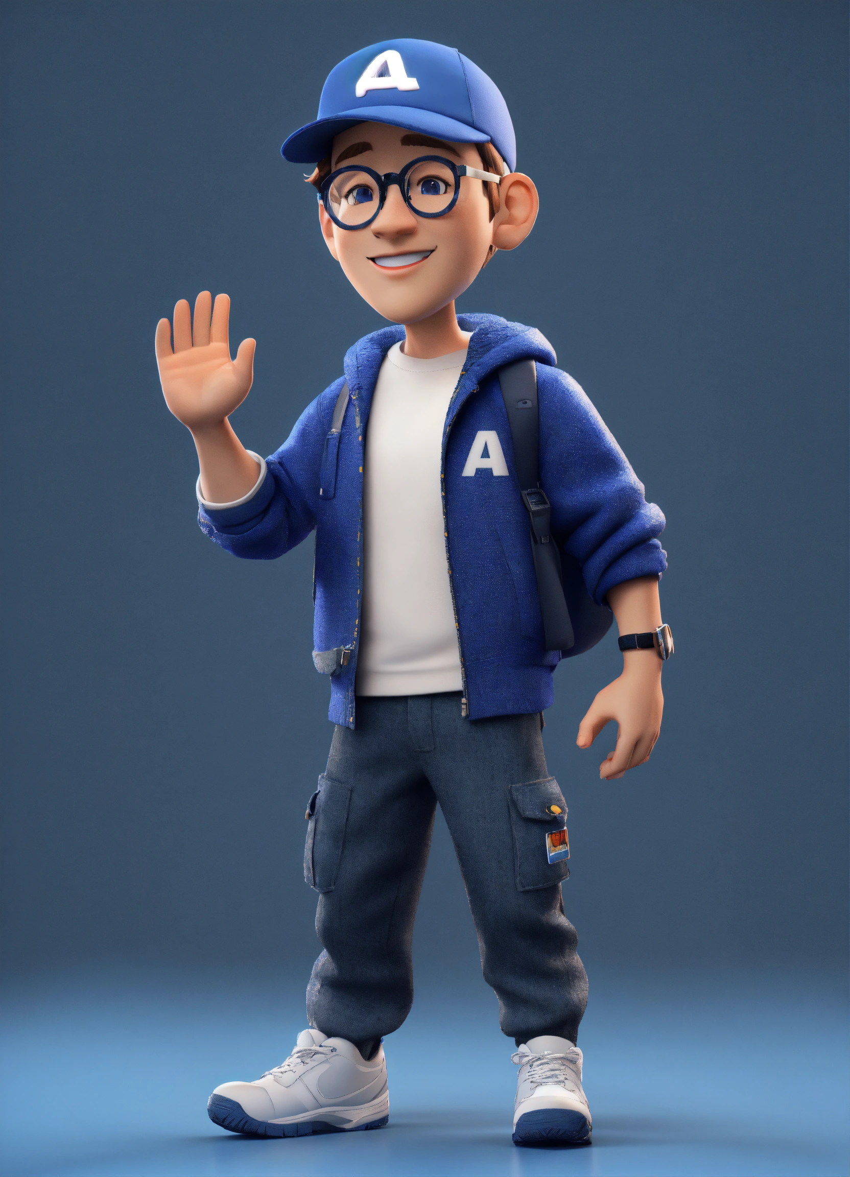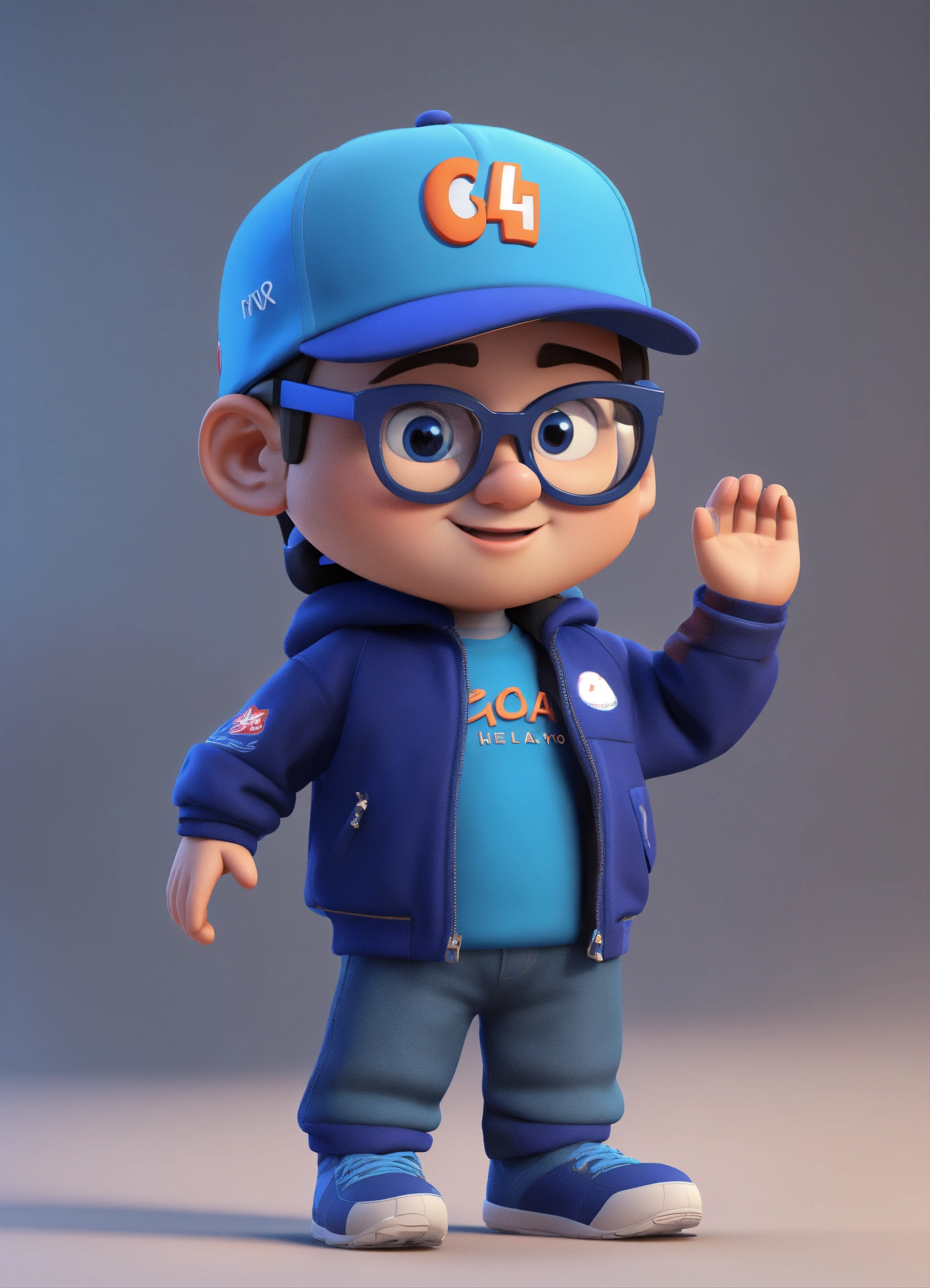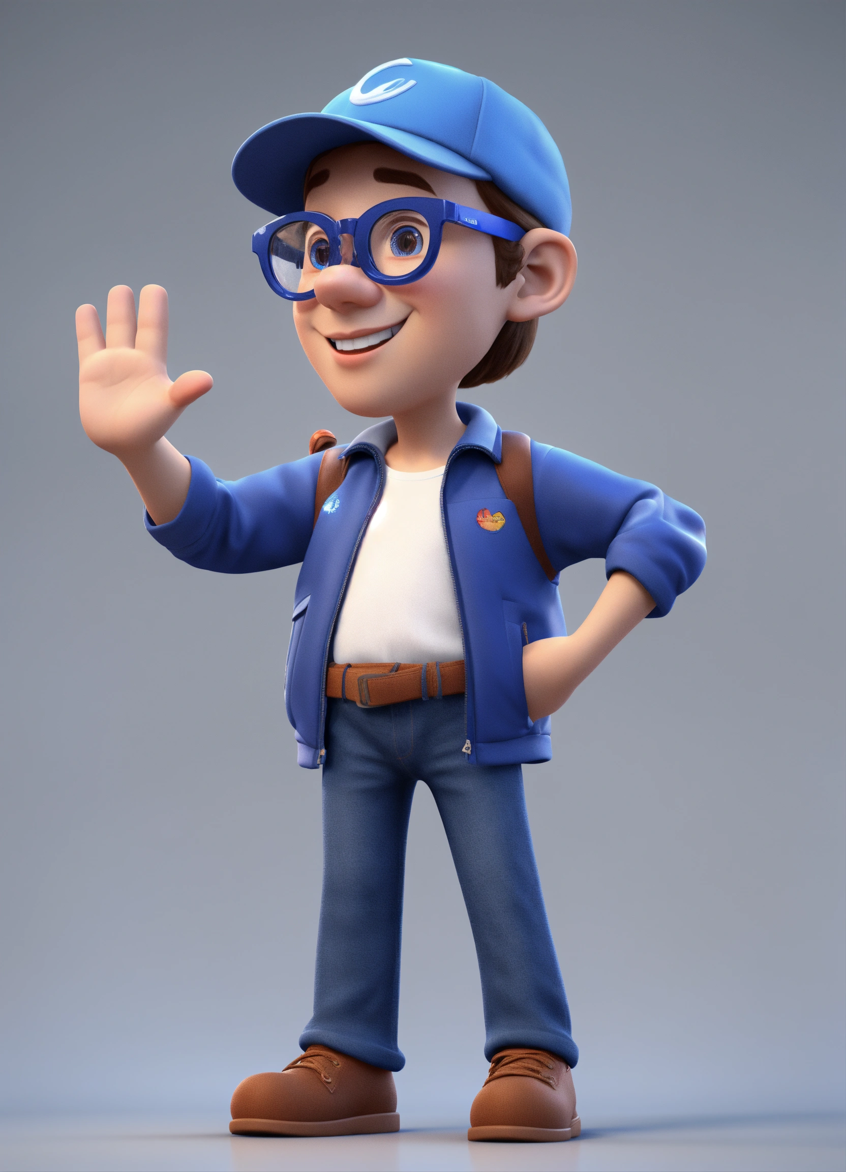 Standing white man in glasses and blue cap, dark blue jacket, white t-shirt, ((waving)), (saying hello), developer, faces to us, 3d render, pixar style, detailed digital art, stylized 3d render, c4d, (full height), high quality, composition, masterpiece, artstation, solid background