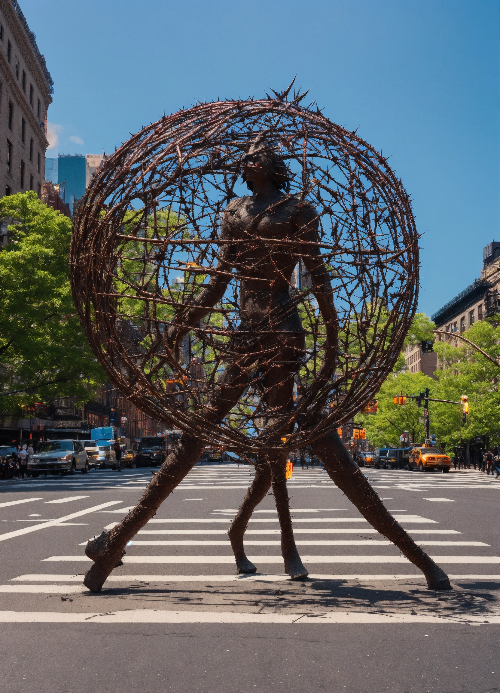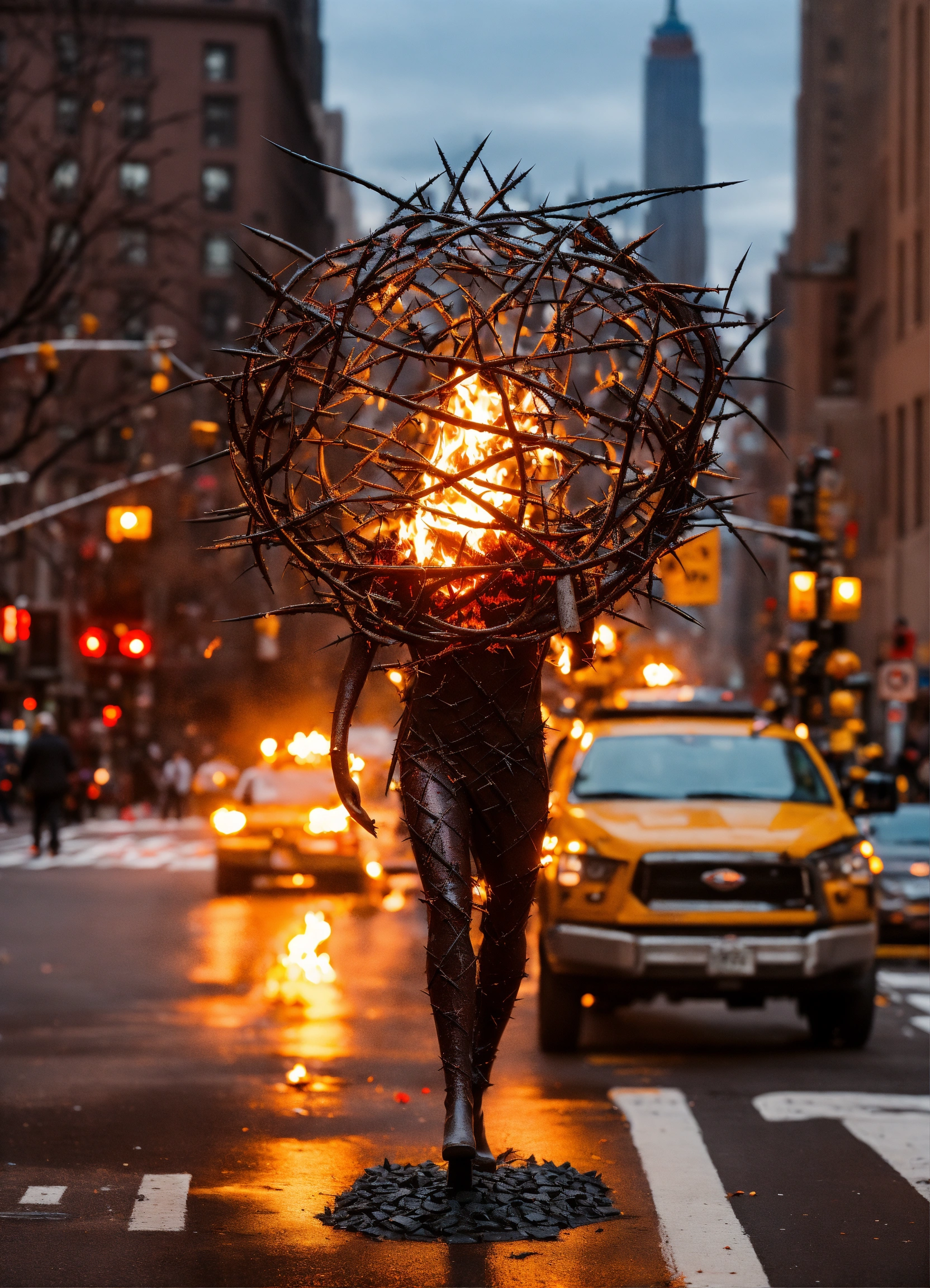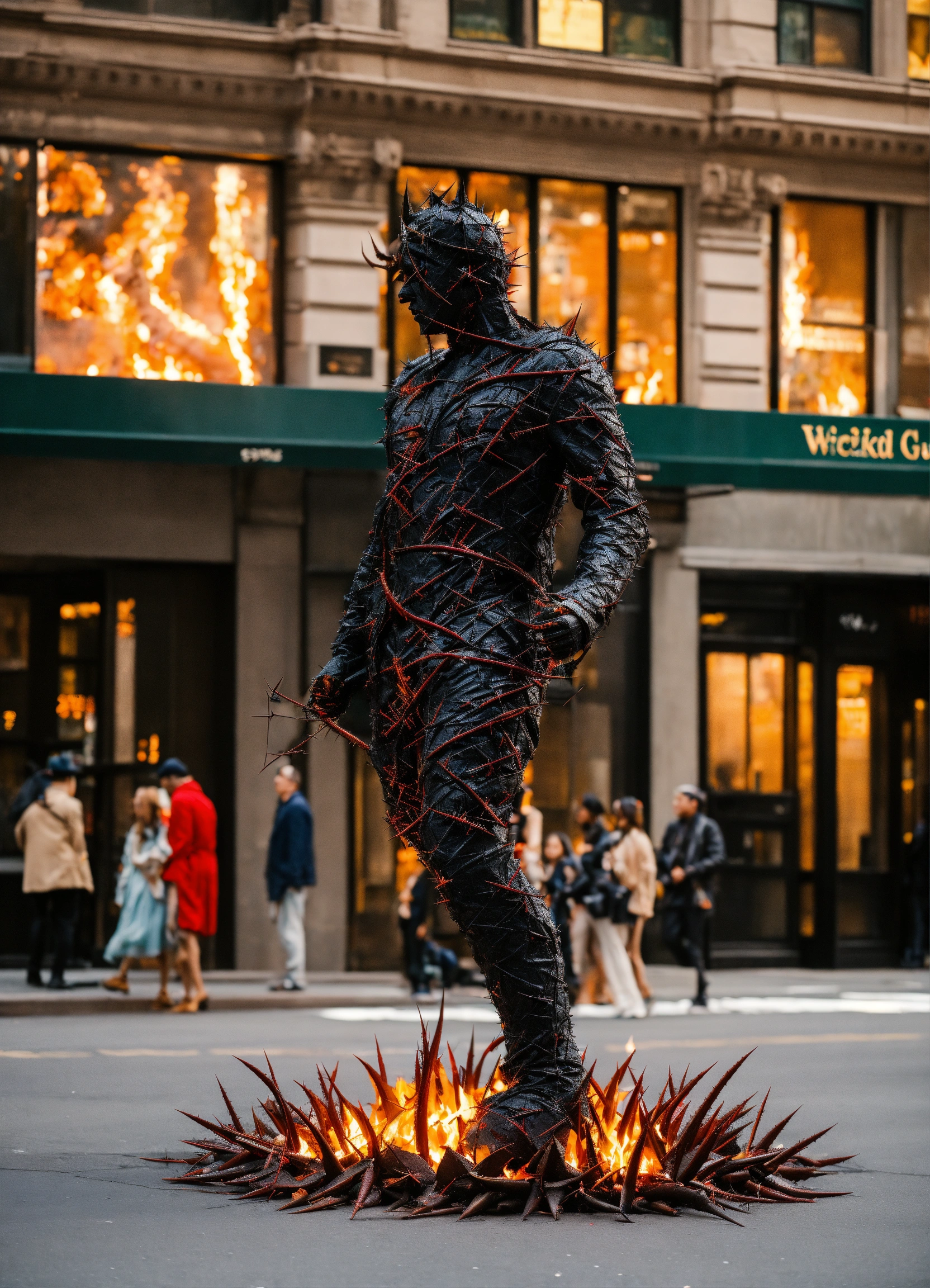 A sculture saying wicked game with thorns on fire in the middle of the street of new york with people walking