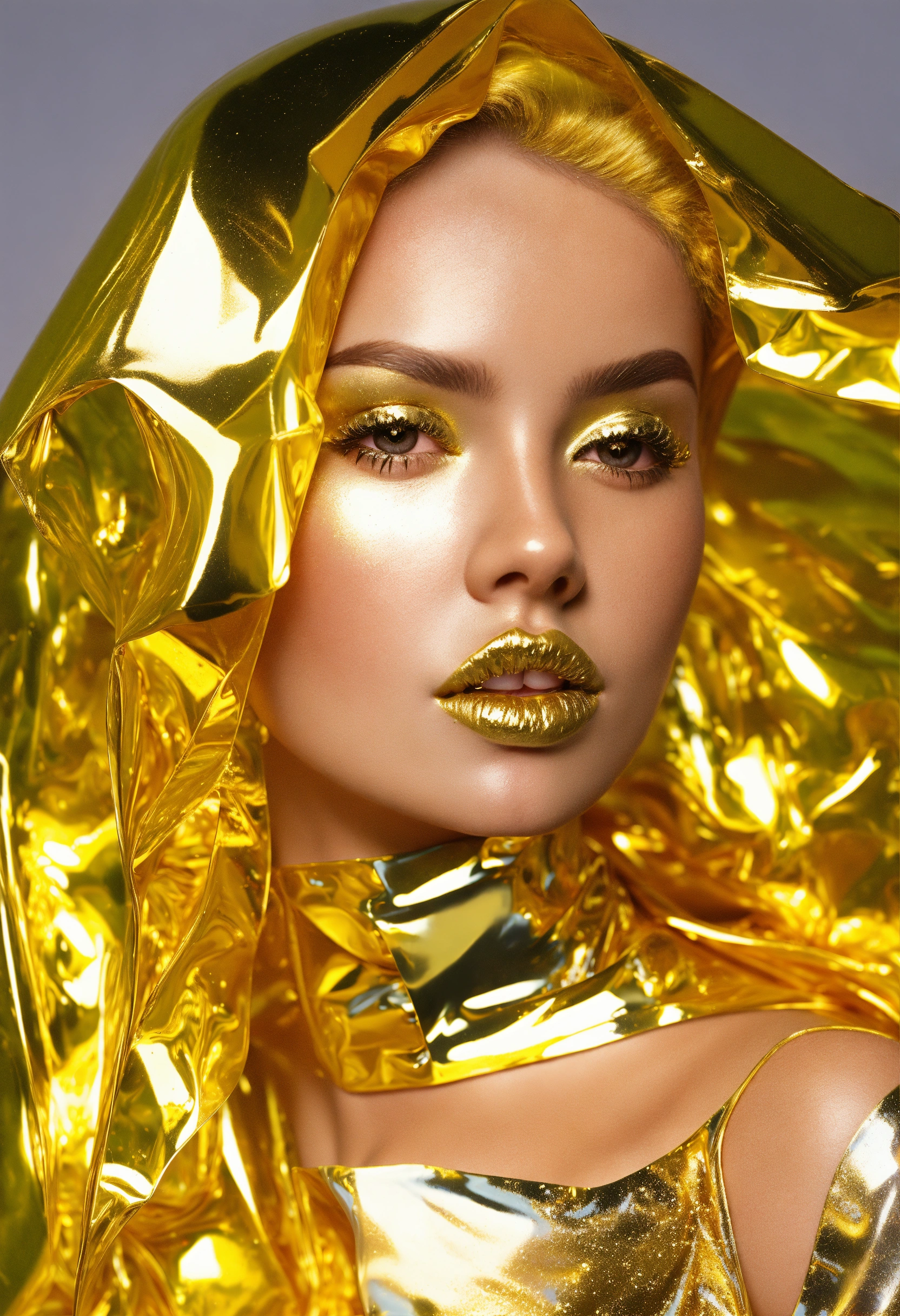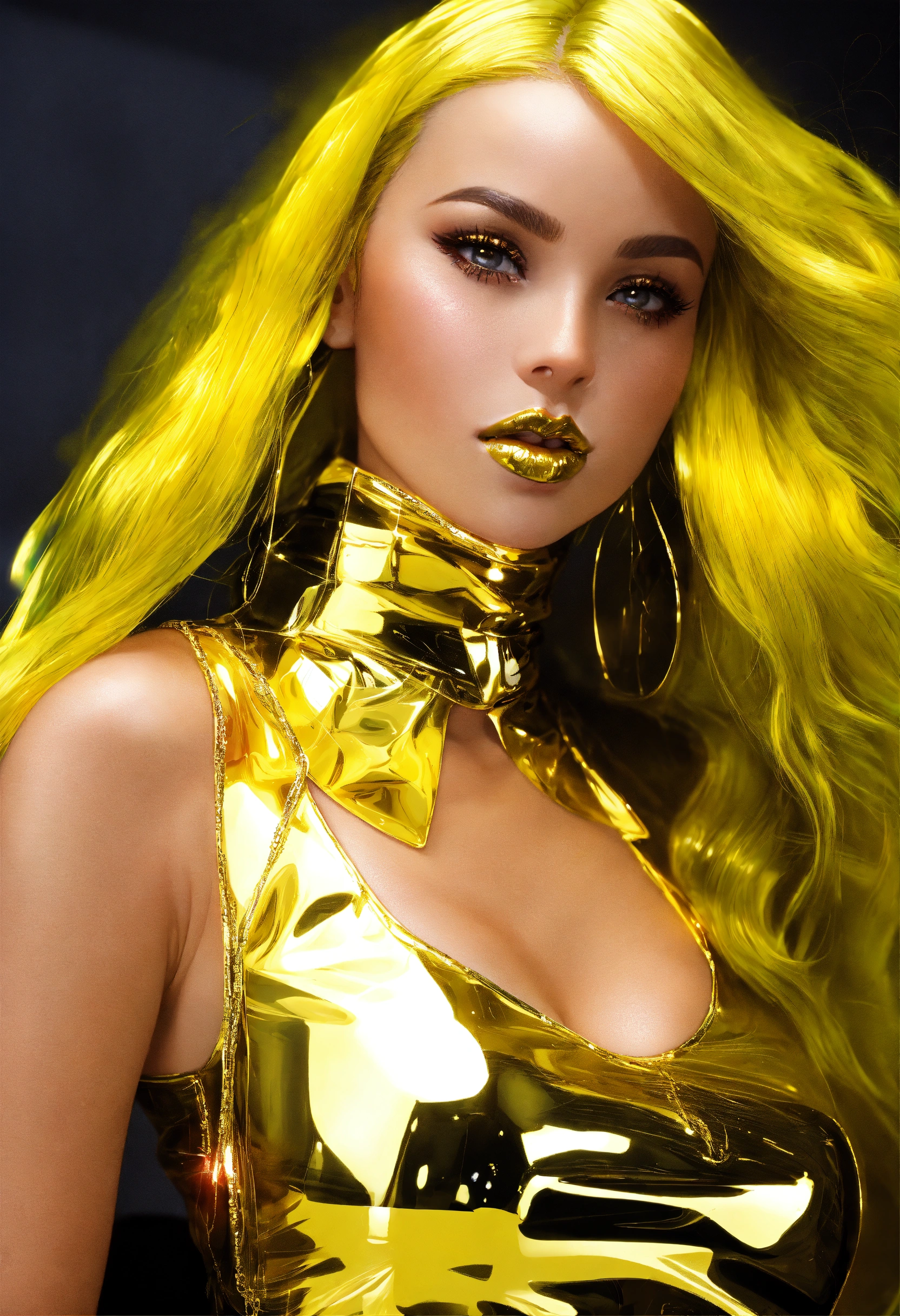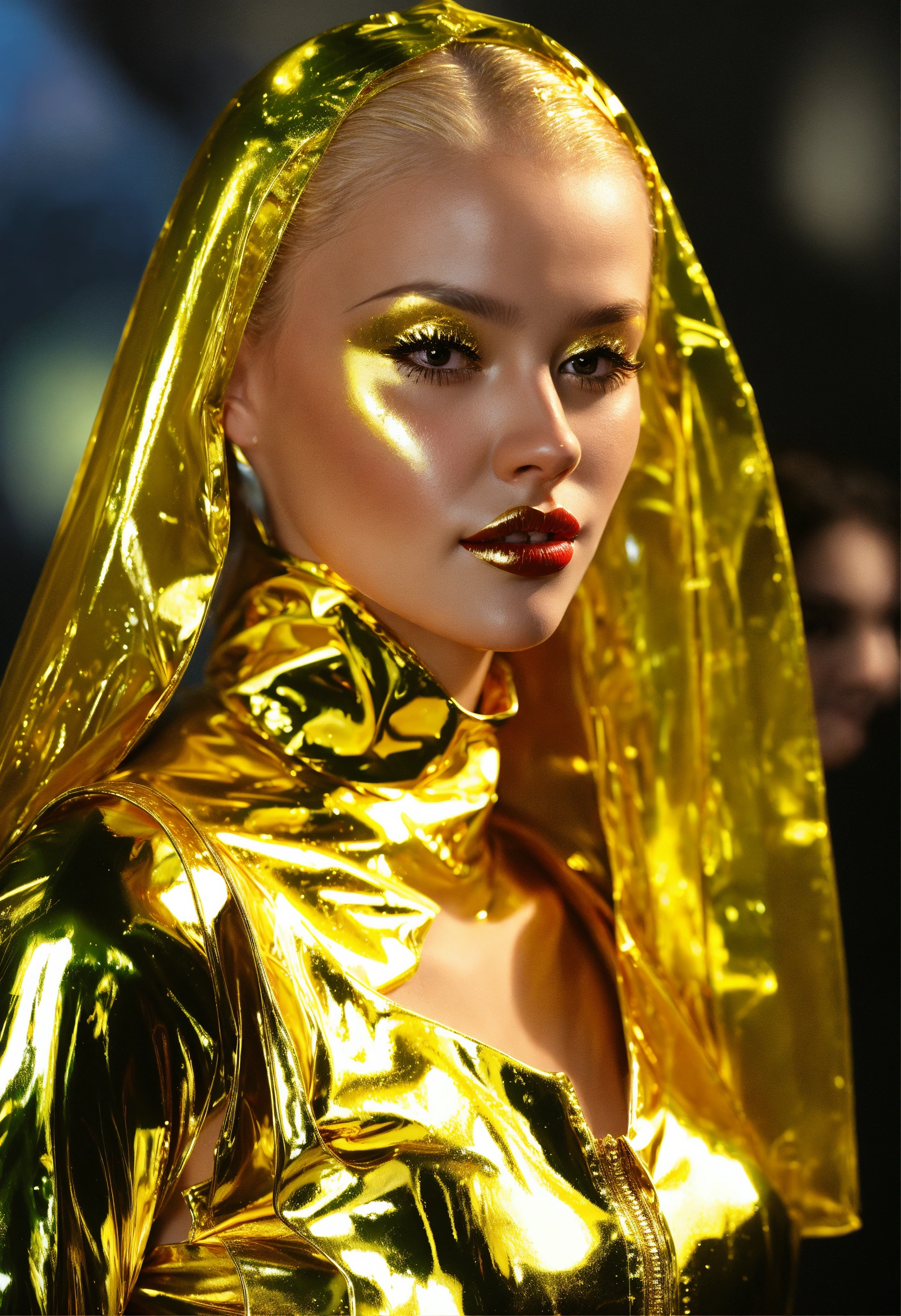Clear bright shiny clear plastic outfit, bright shiny plastic hair, bright shiny plastic gold lips, bright shiny plastic gold hair, bright shiny plastic gold lips, bright shiny plastic face, bright shiny plastic gold lips, bright shiny plastic face, bright shiny plastic gold lips, bright shiny plastic face, bright shiny plastic gold lips, bright shiny plastic face, gold lips*4