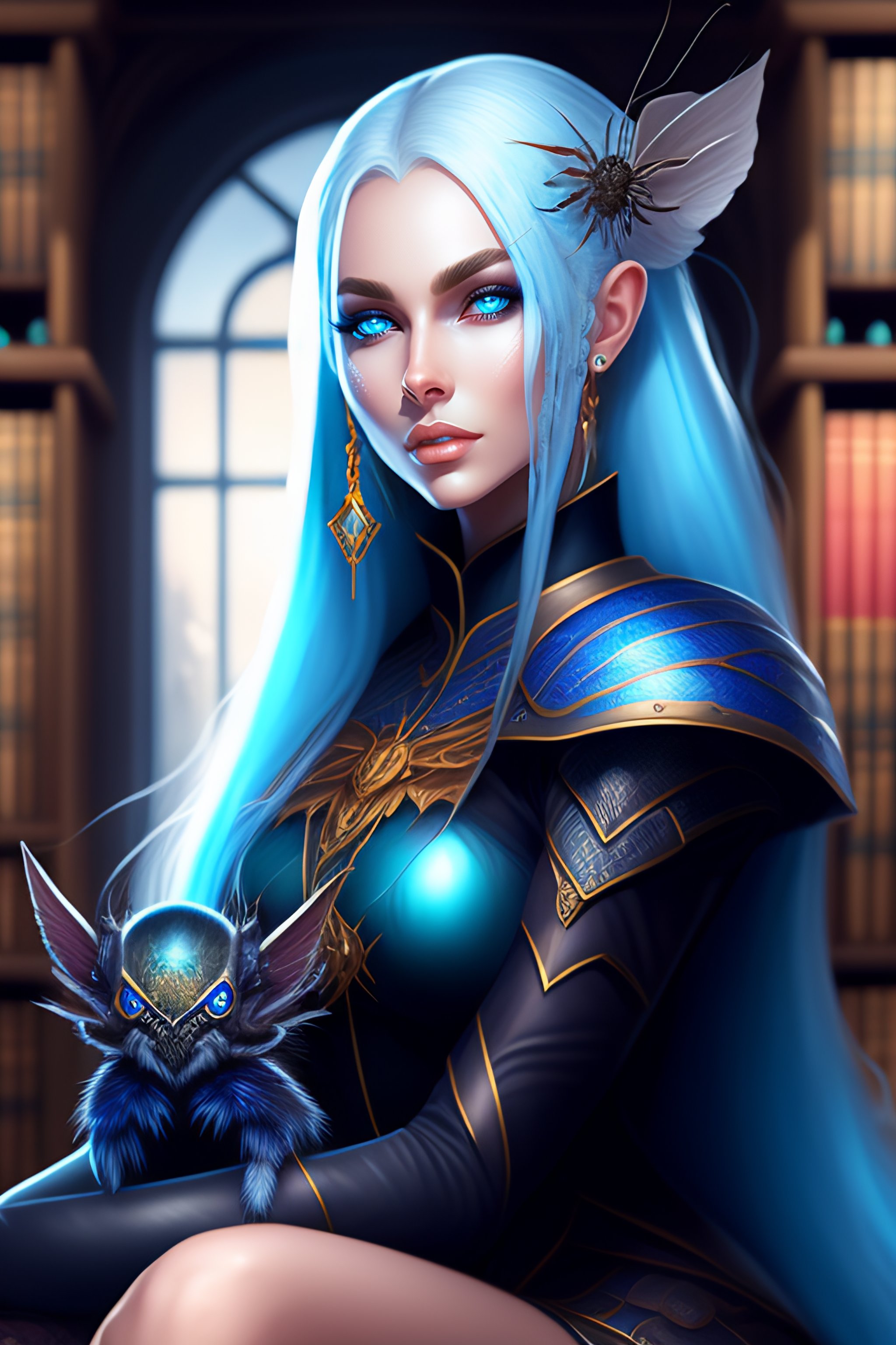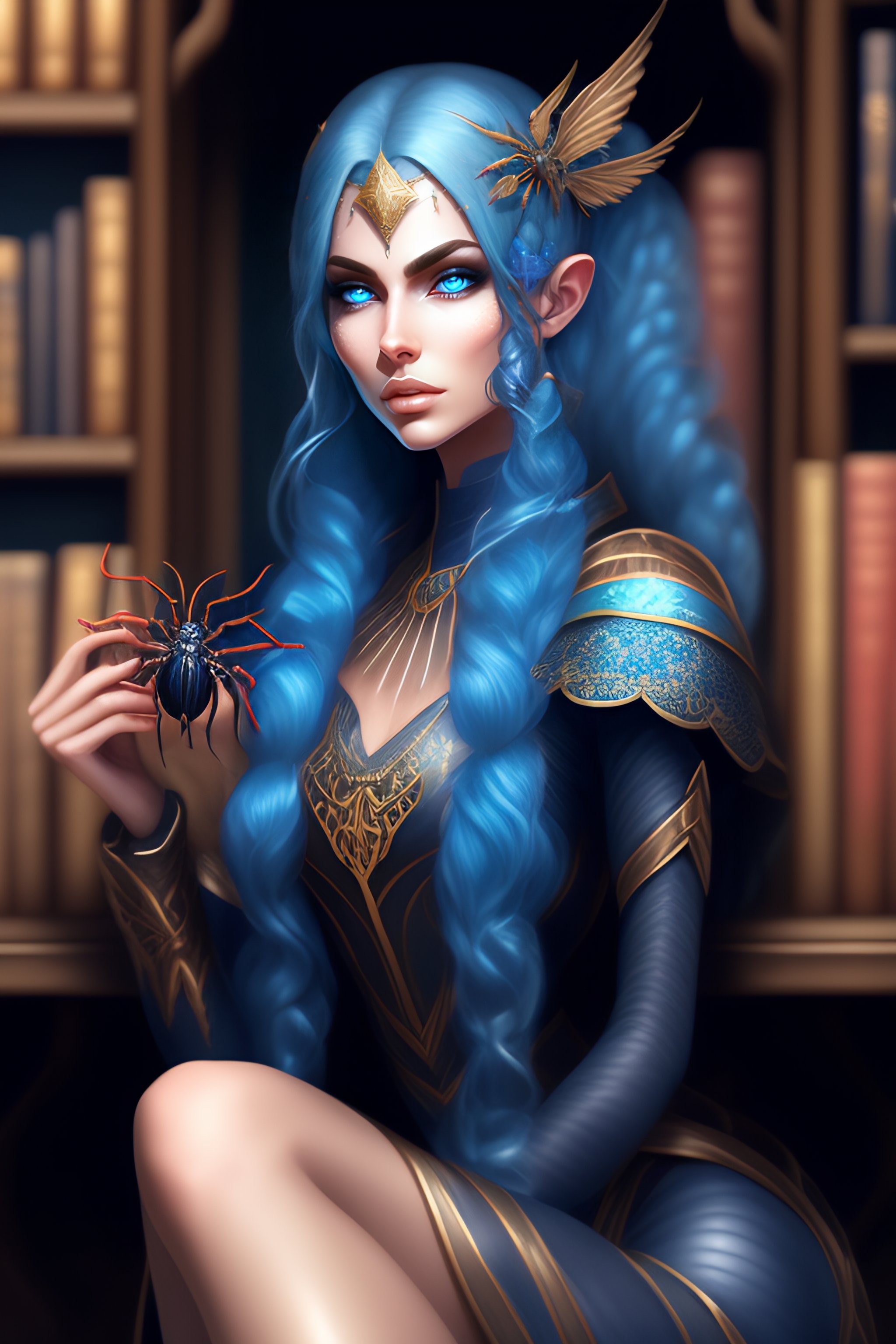 A dark elf girl with pale blue eyes sitting in a library and holding a spider, extreme detail, detailed drawing, trending artstation, hd, symmetrical features, digital art, illustration, dark fantasy, fantasy, d&d, drow, elf, dark elf, spider