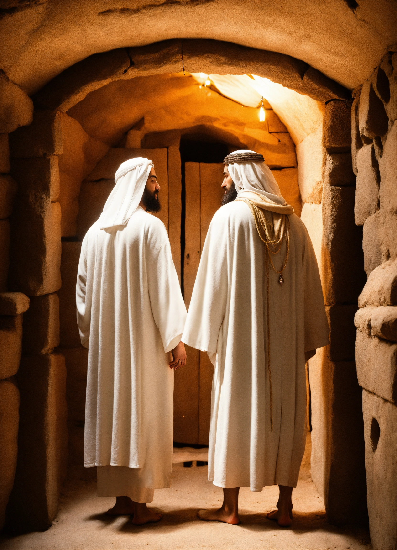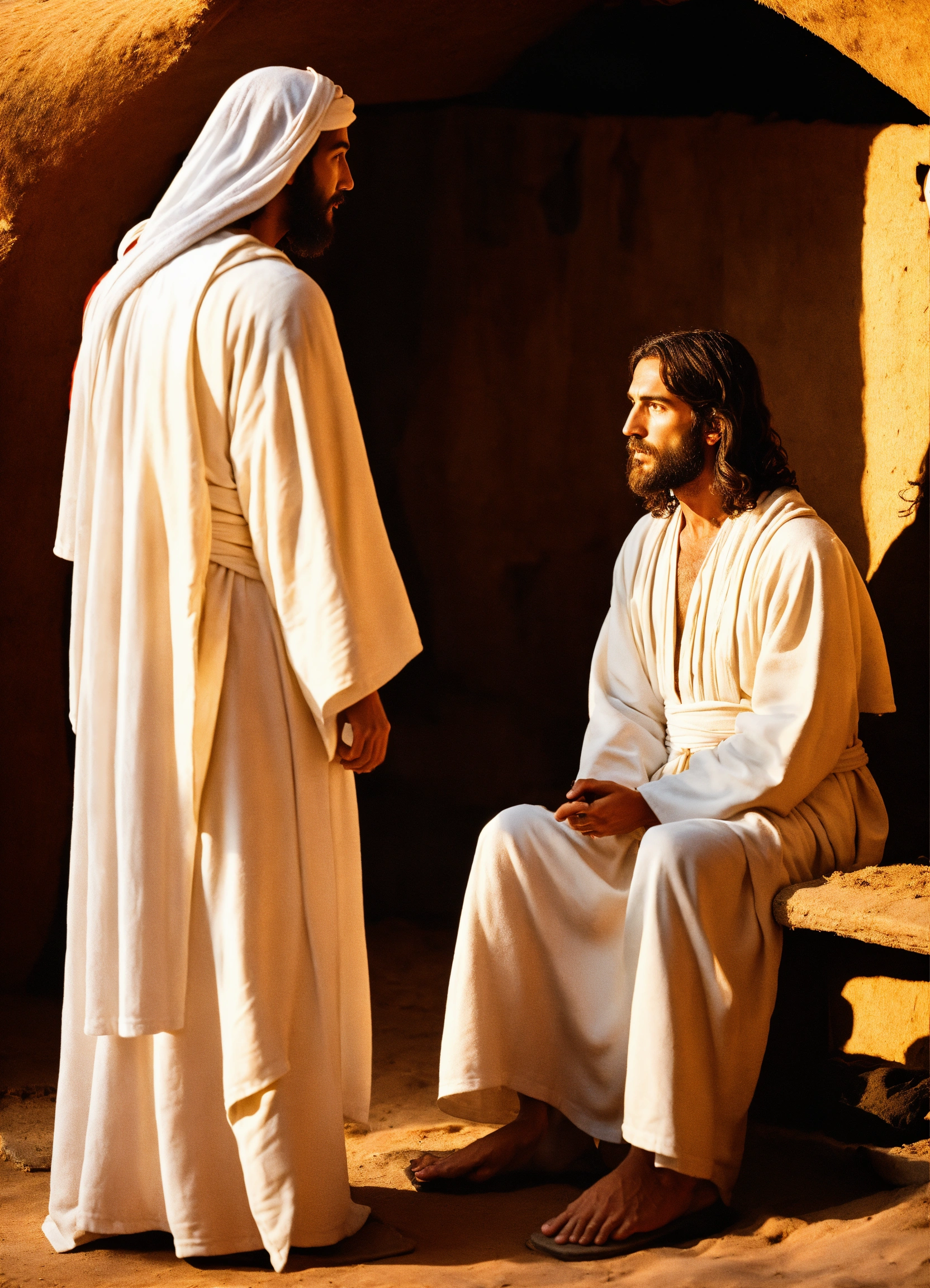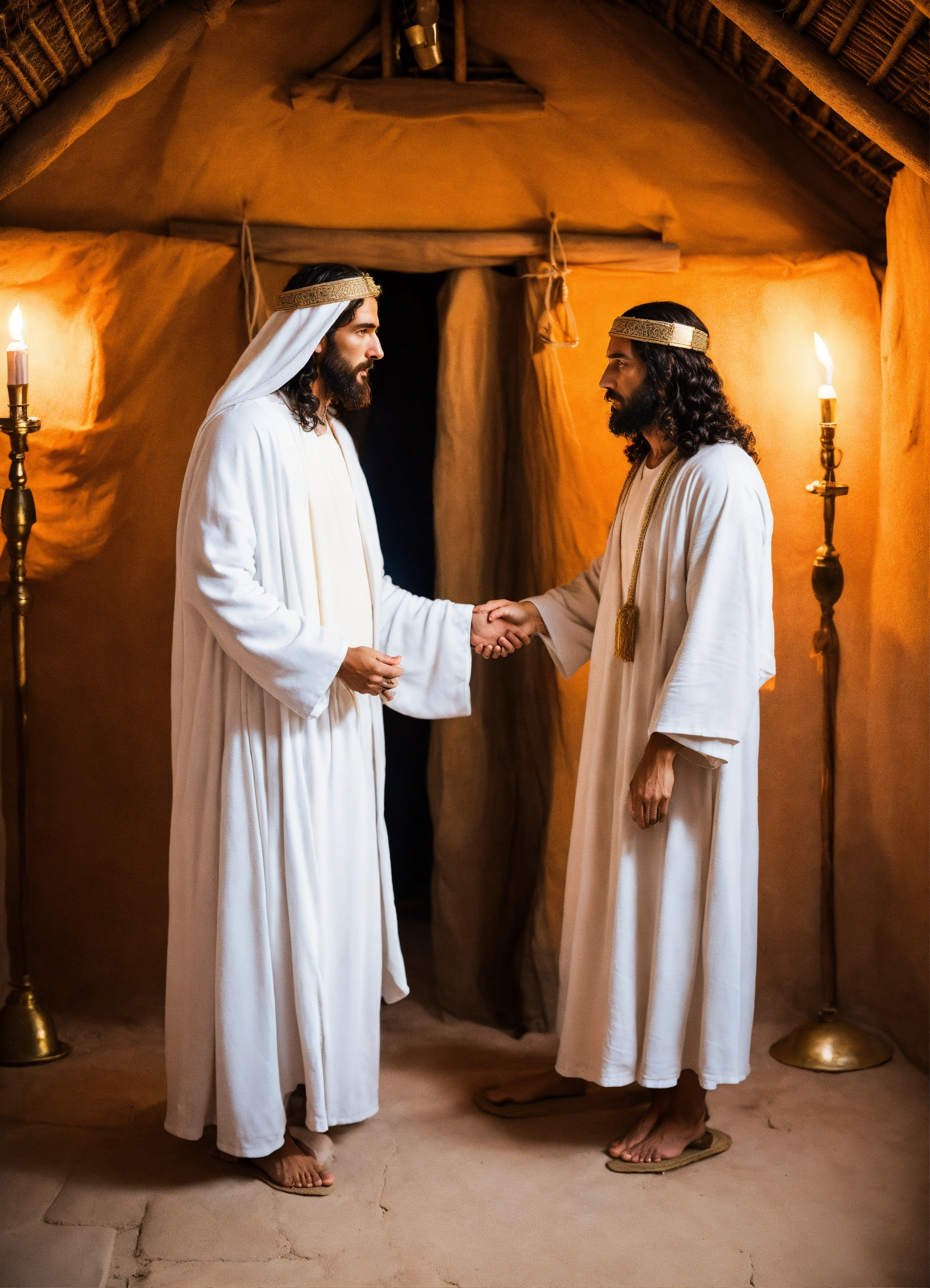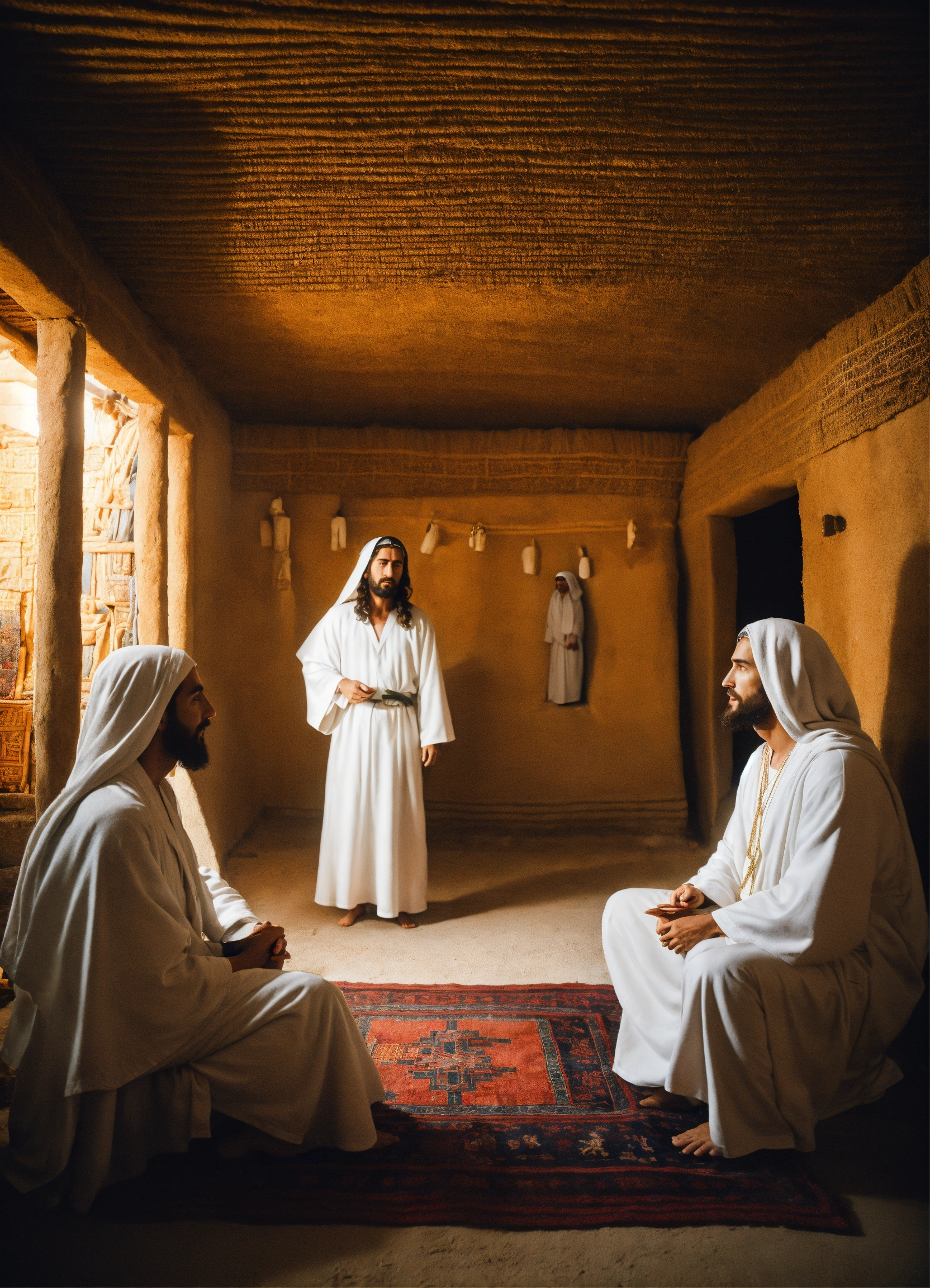 Jesus christ meeting a doppelgänger, heavenly vibes, white robes, ancient middle east, meeting in a secret room in a hut