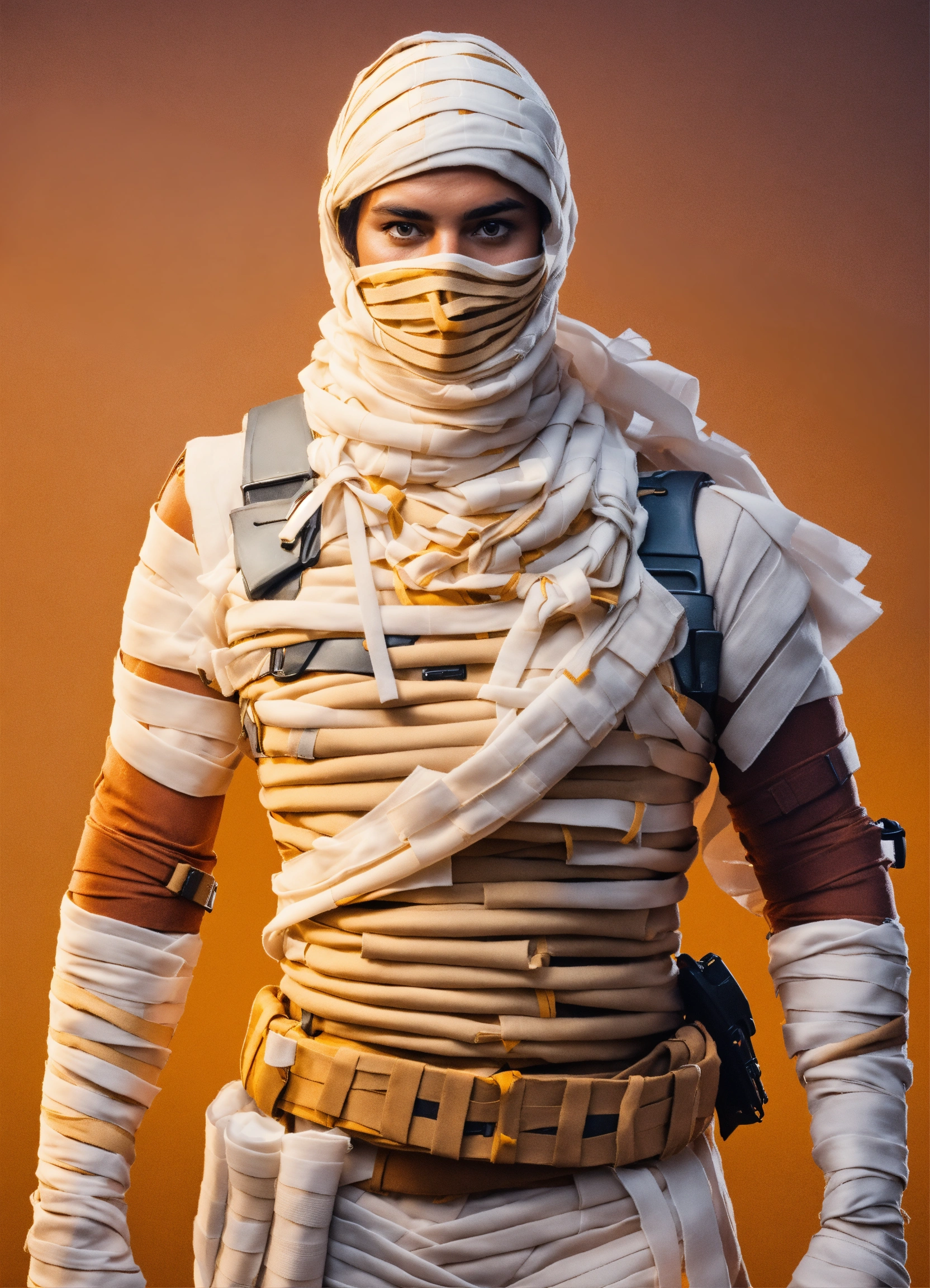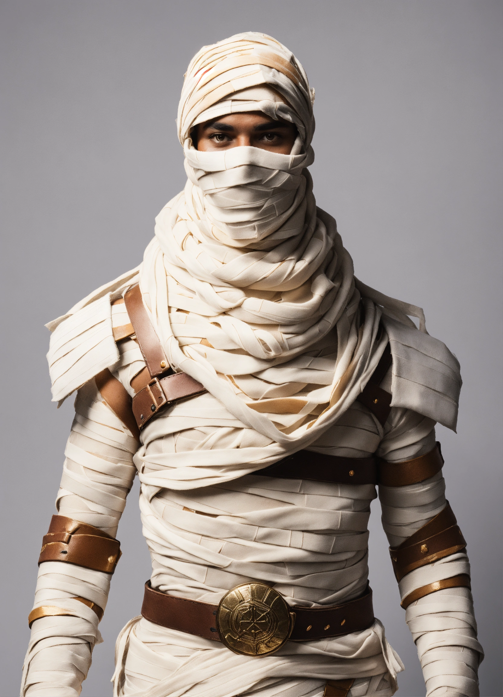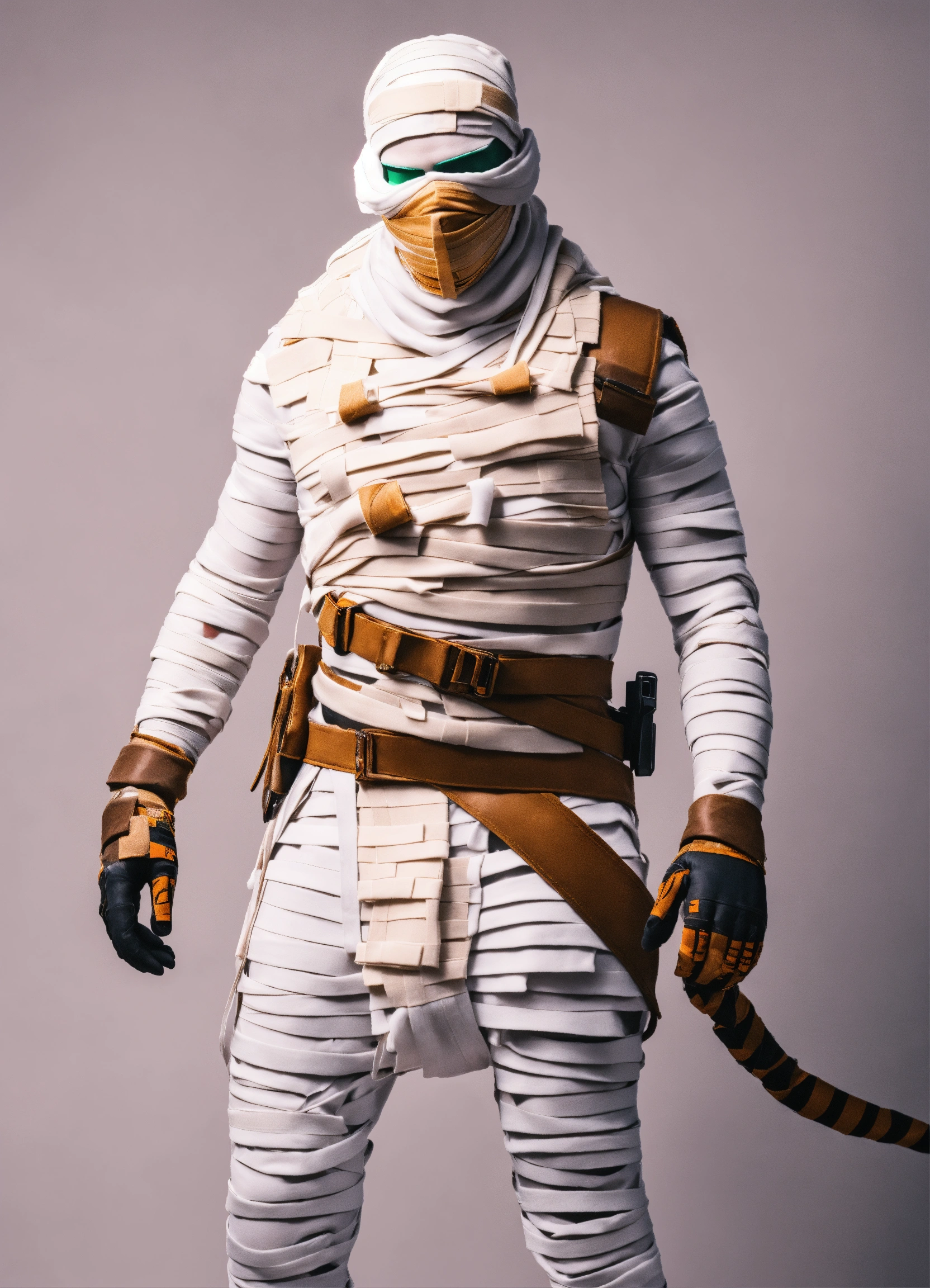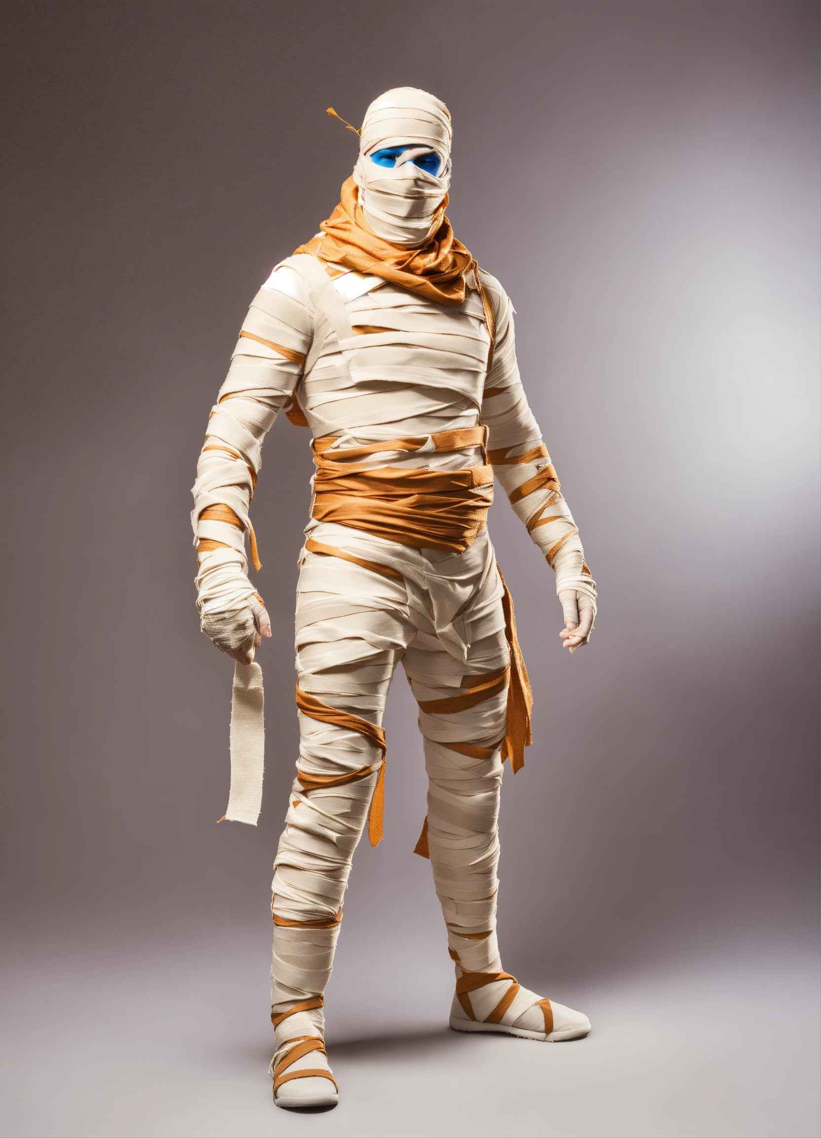 A photograph of mummy costume covered in bandages for a male character with fortnite style, halloween costume, white background, full body