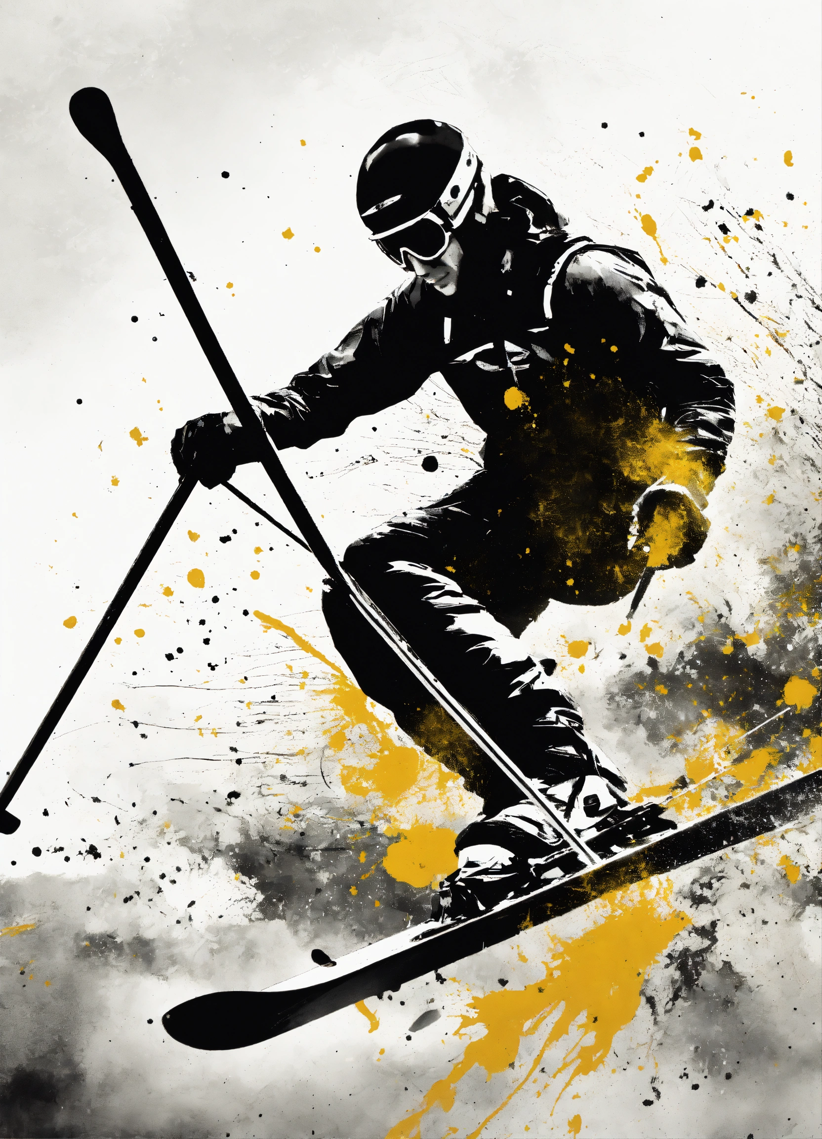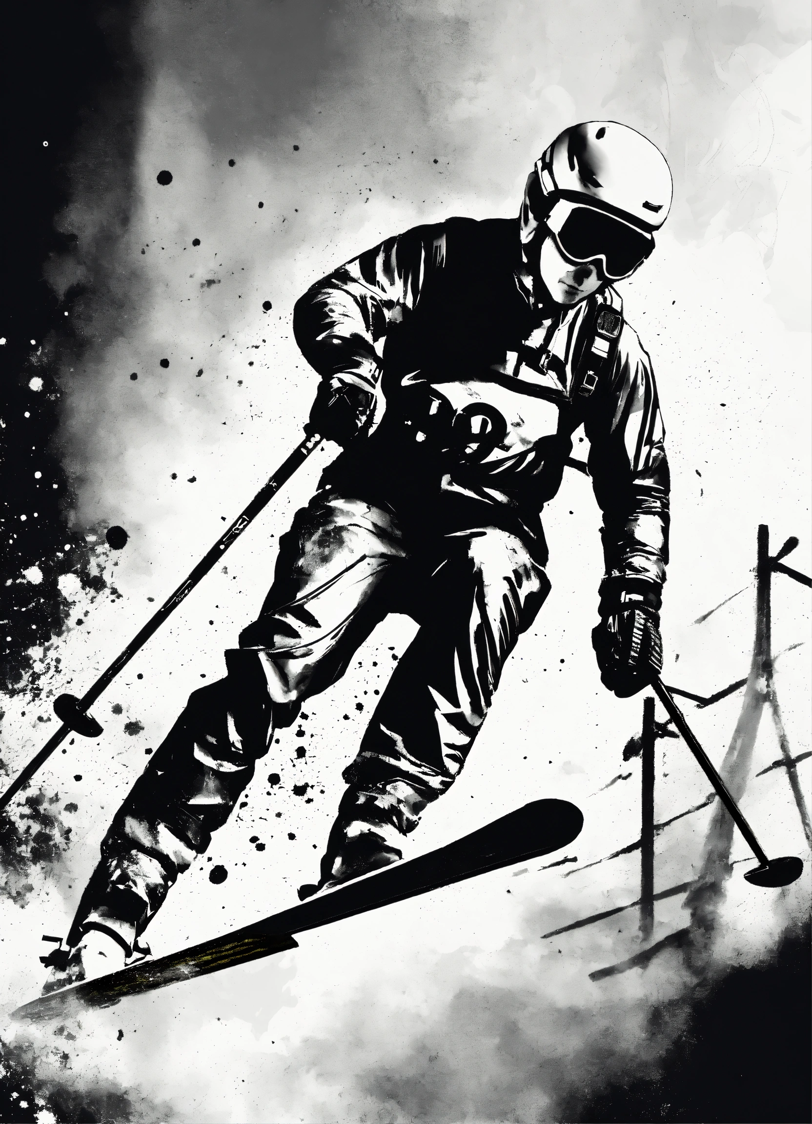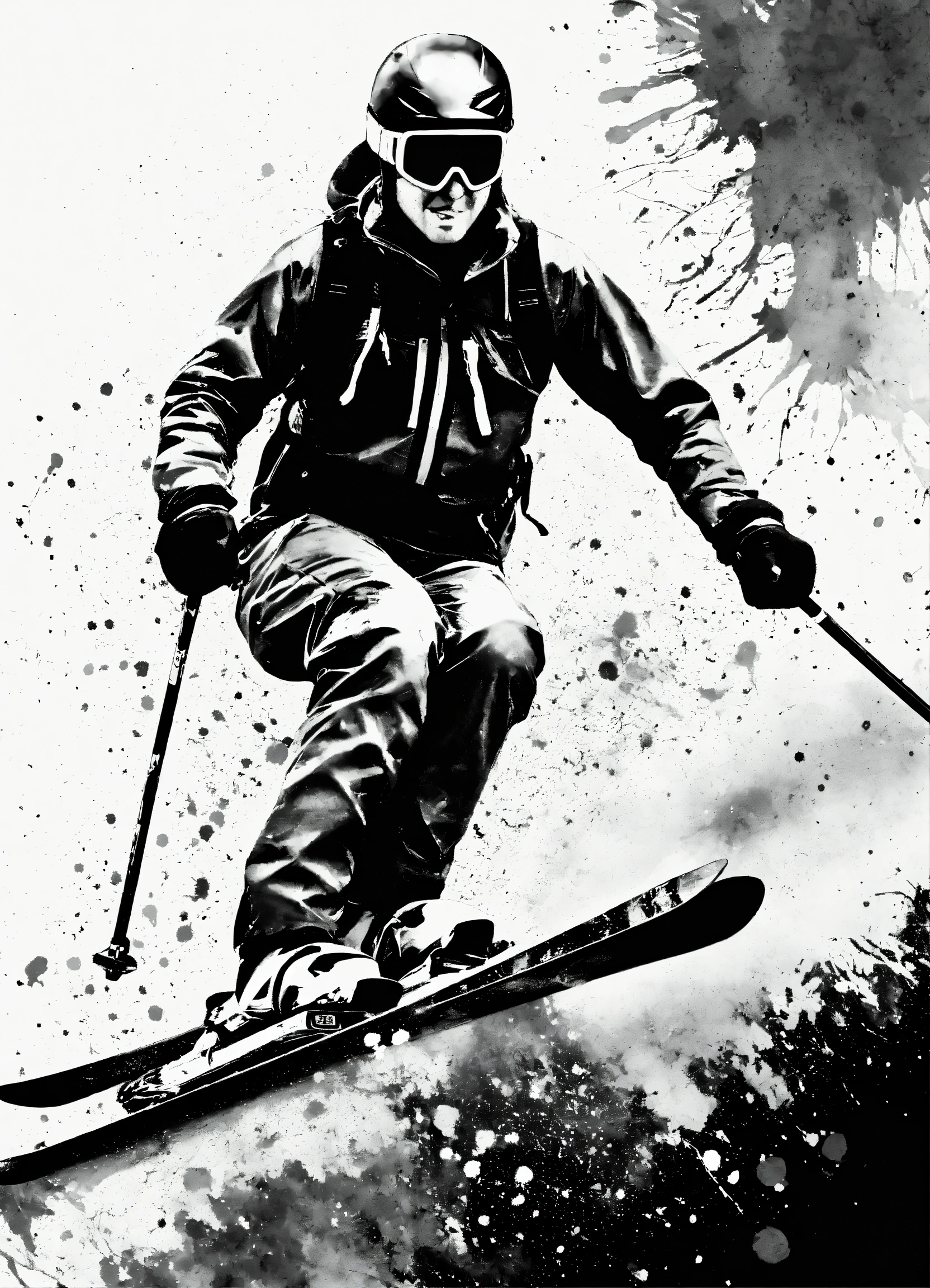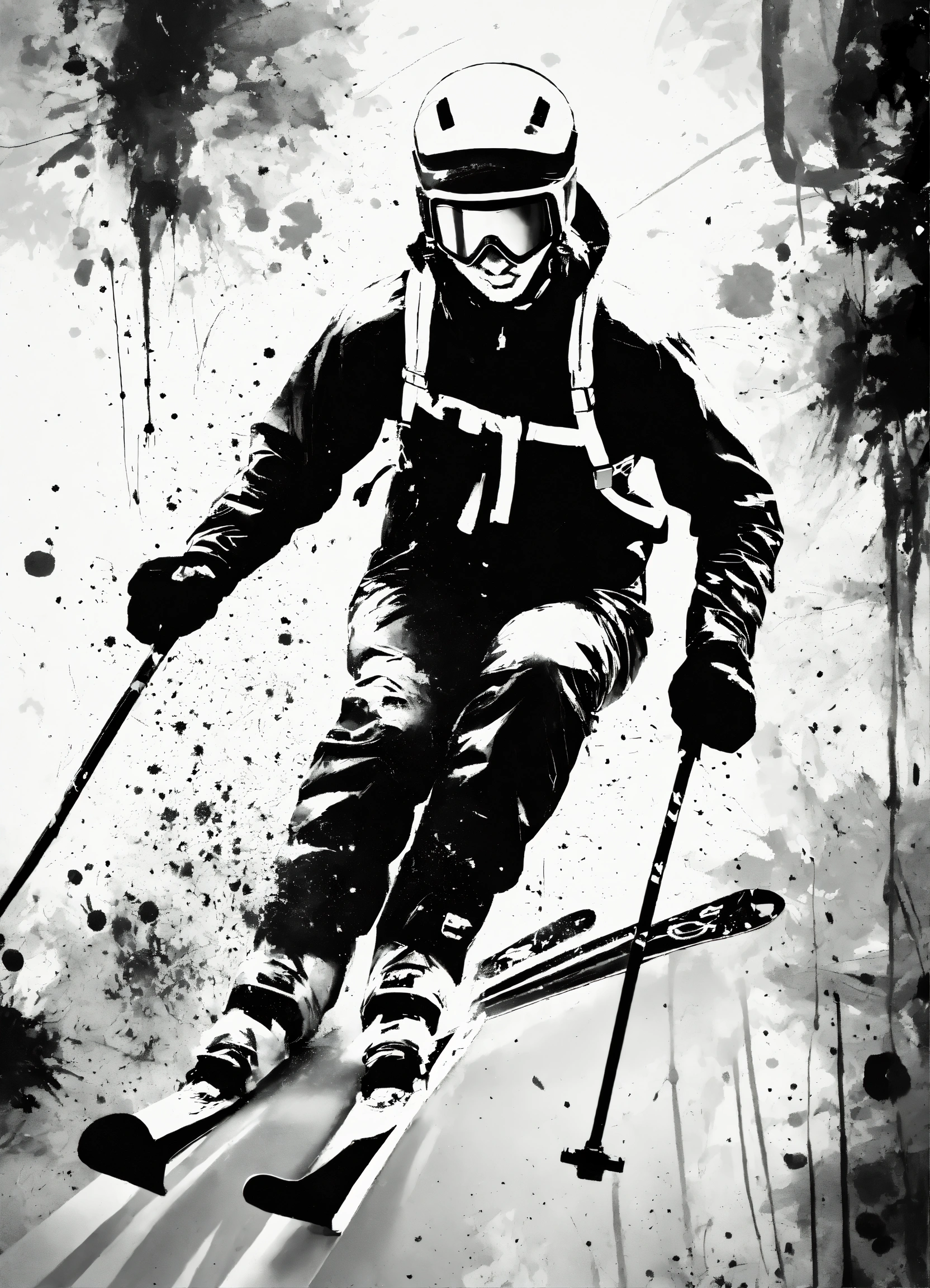 Skier sliding down the slope in grunge style, abstract splatters and drips, black and white with white background