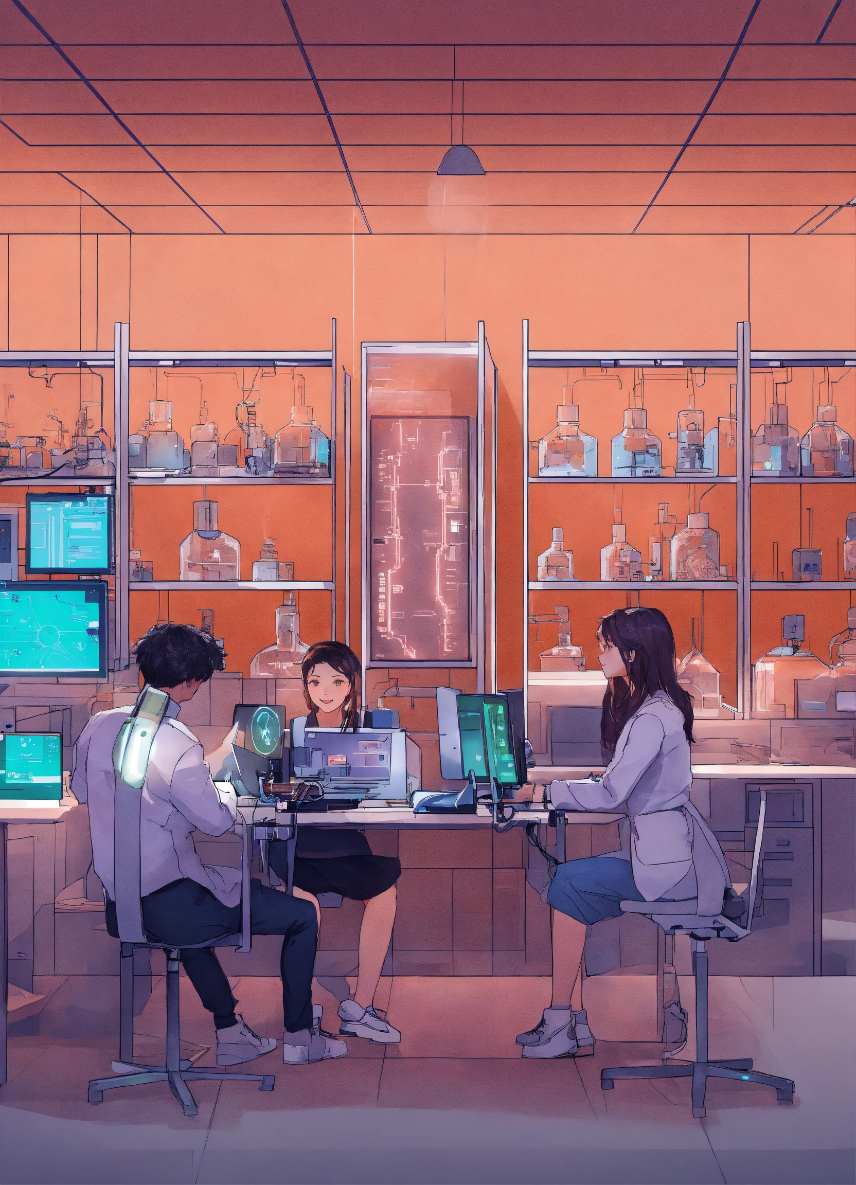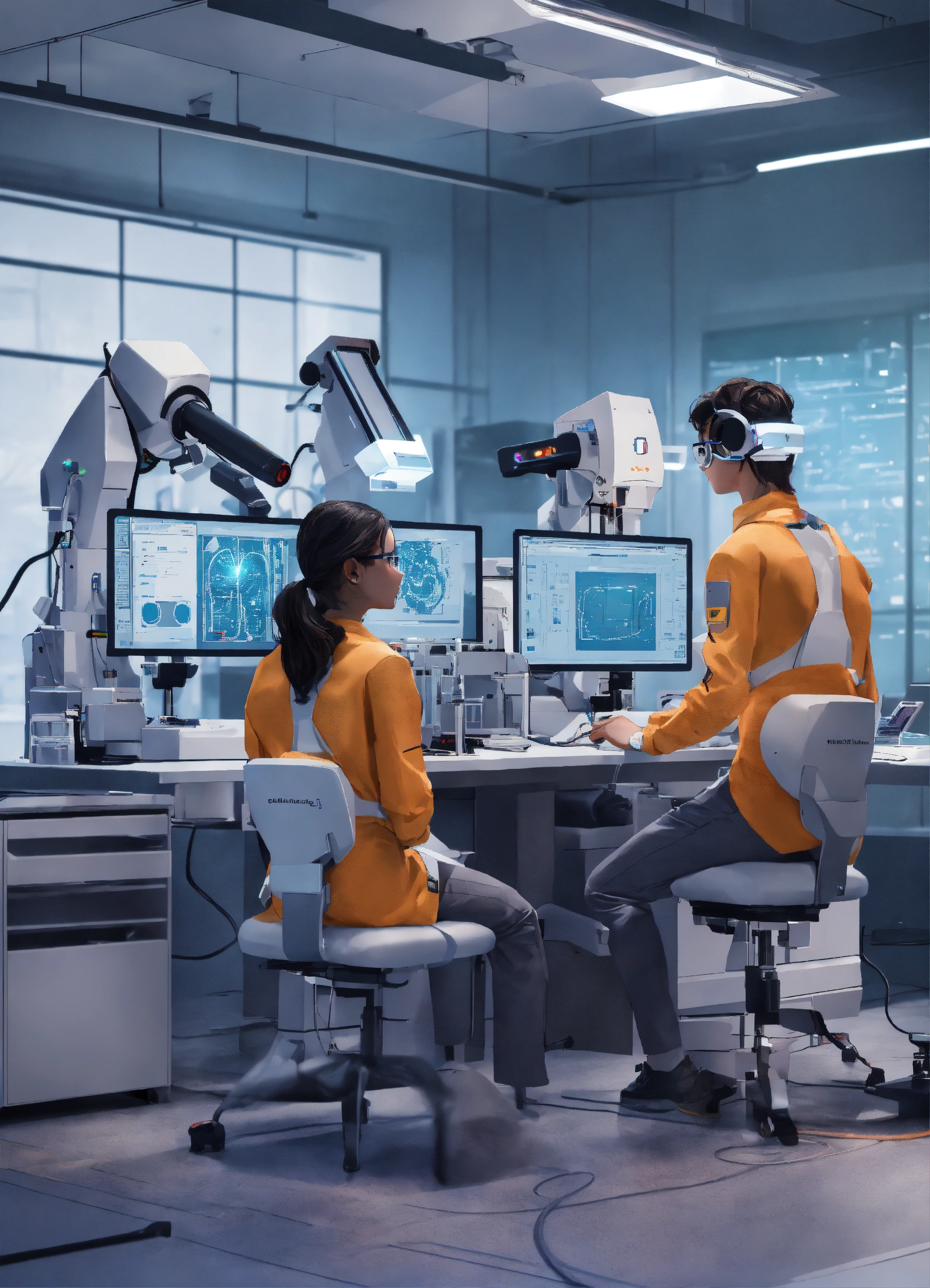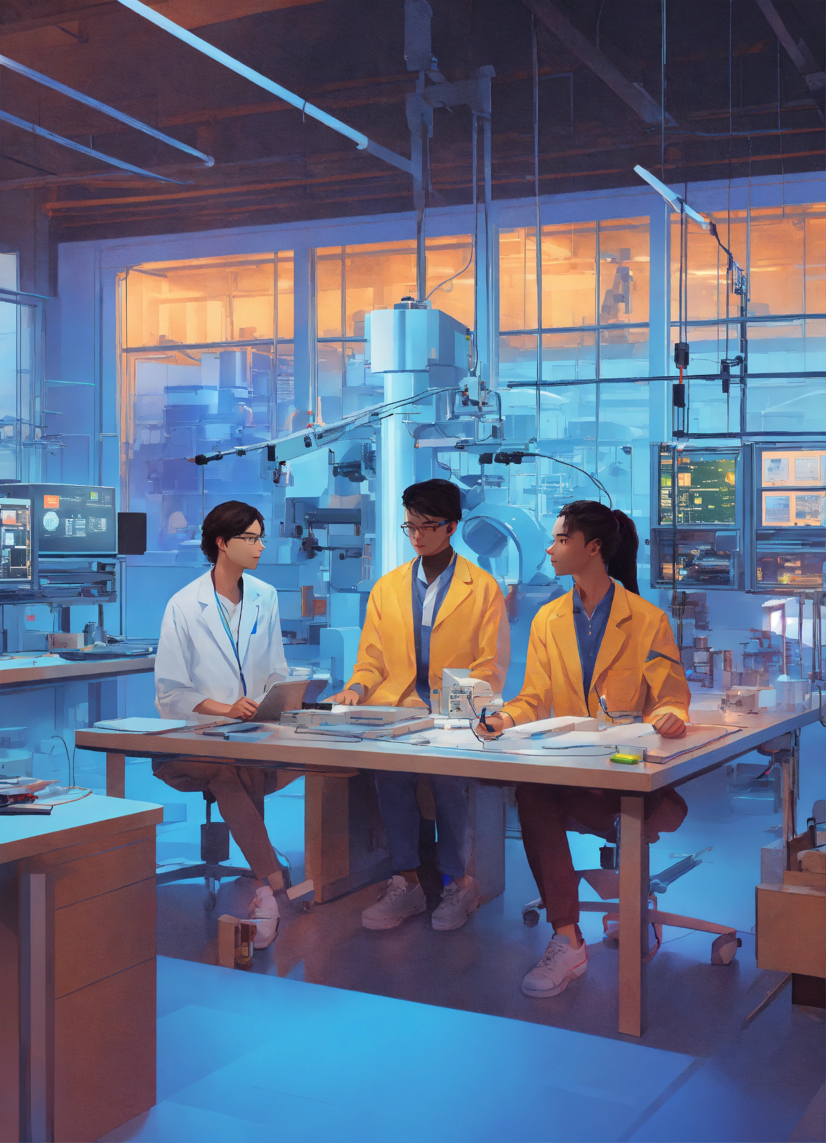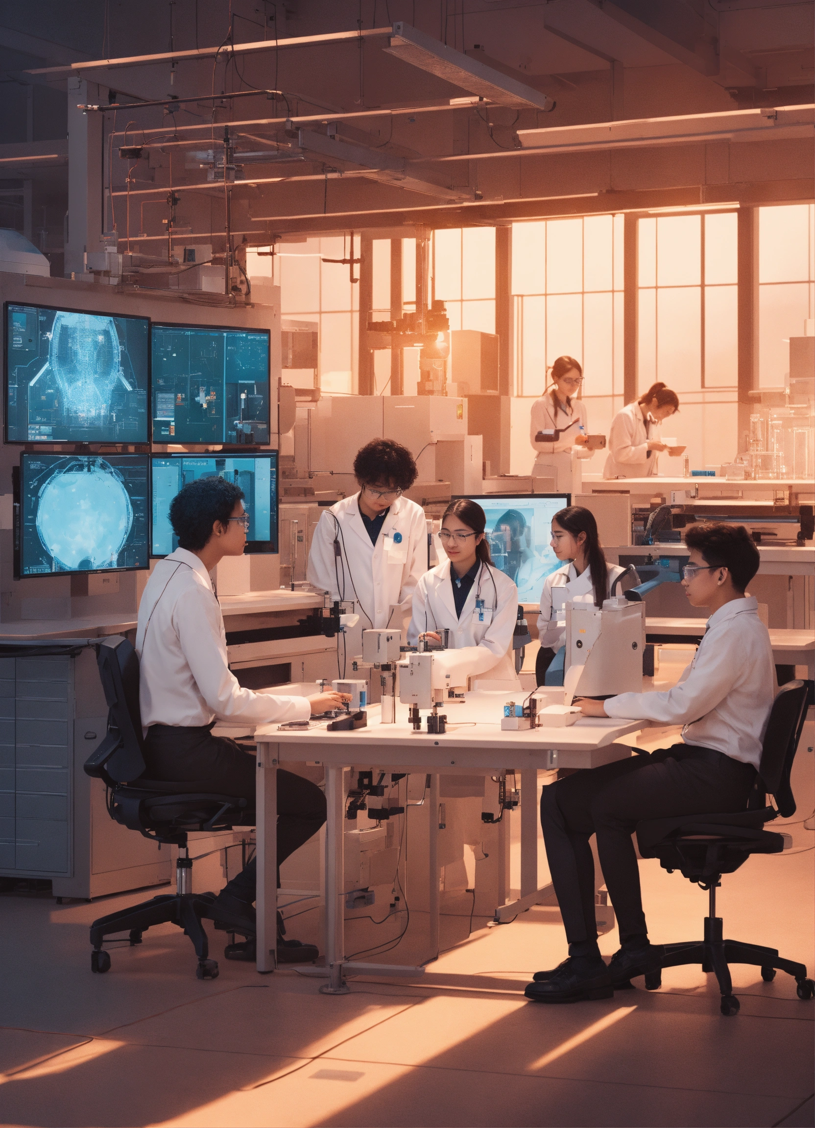 Create an image of ai-powered interns sitting in a lab that is enhanced with ai-augmented machines