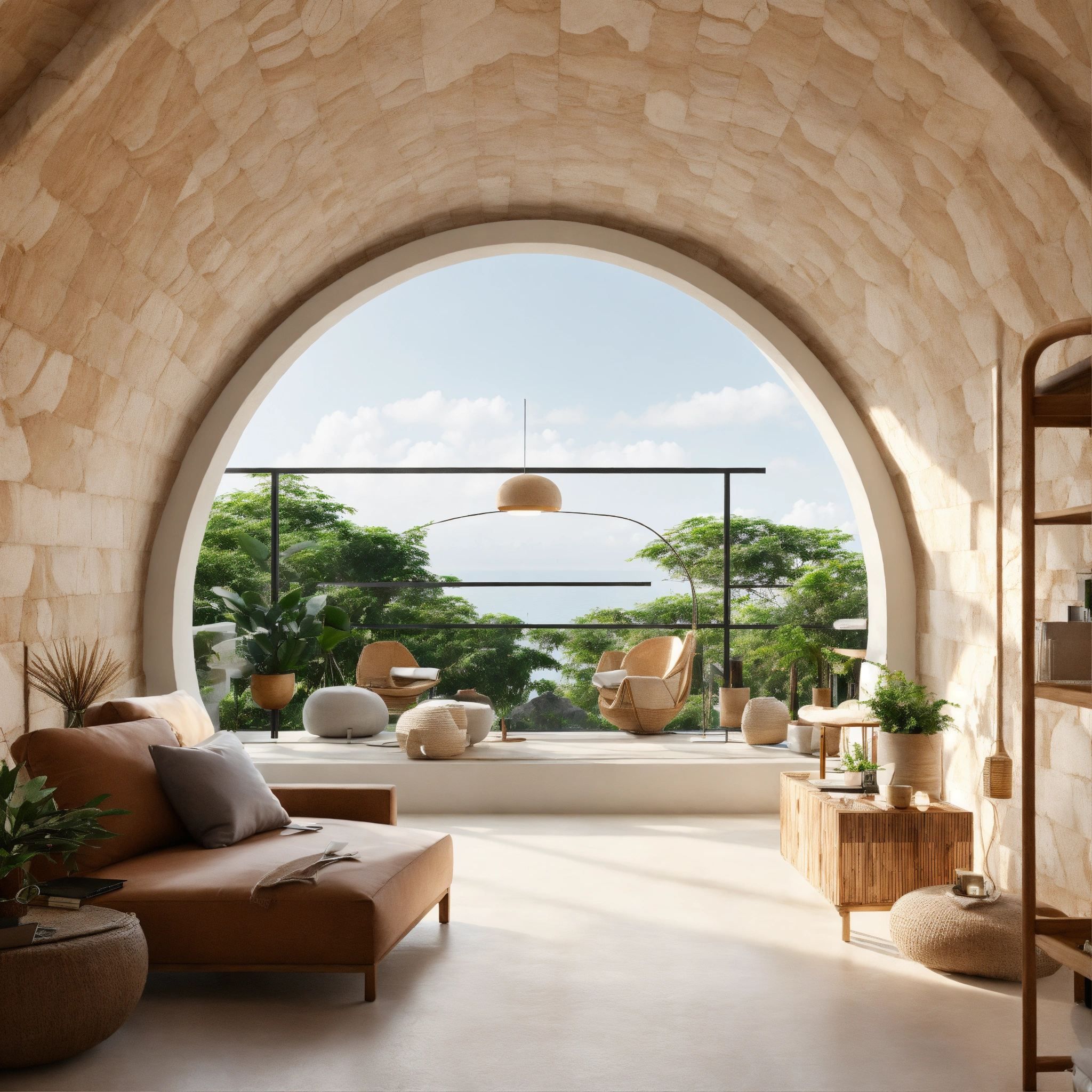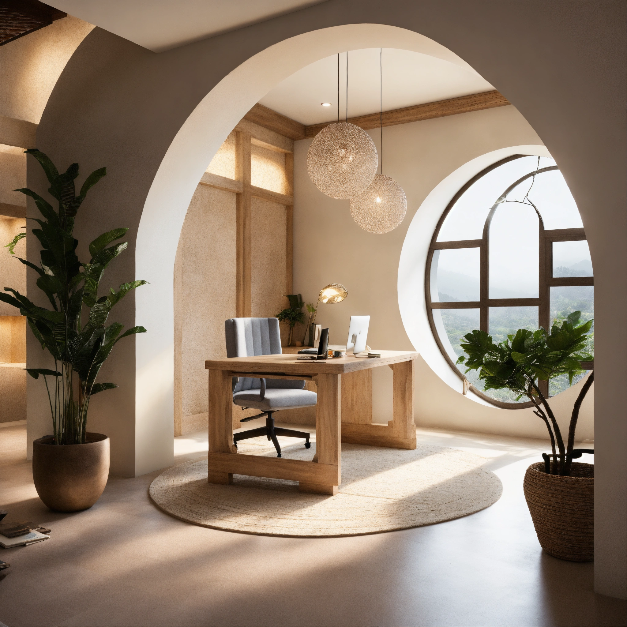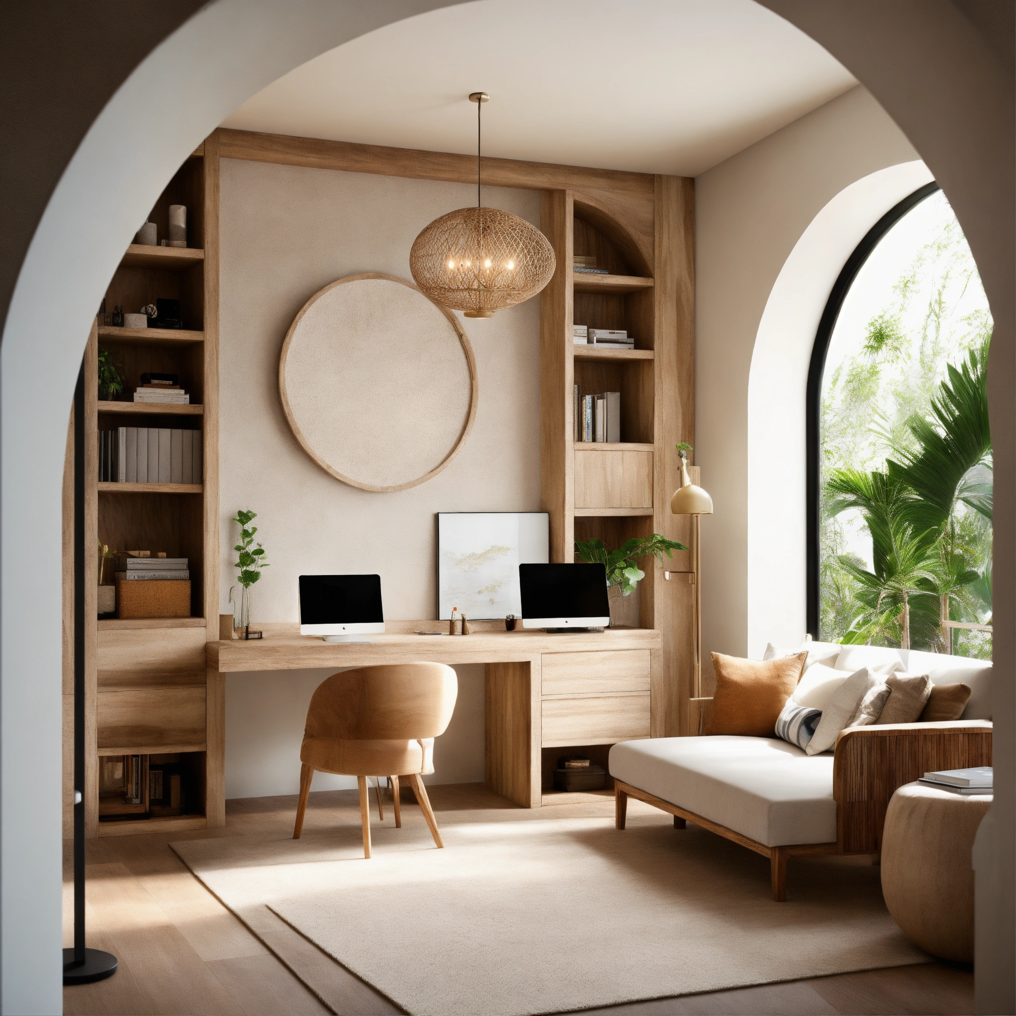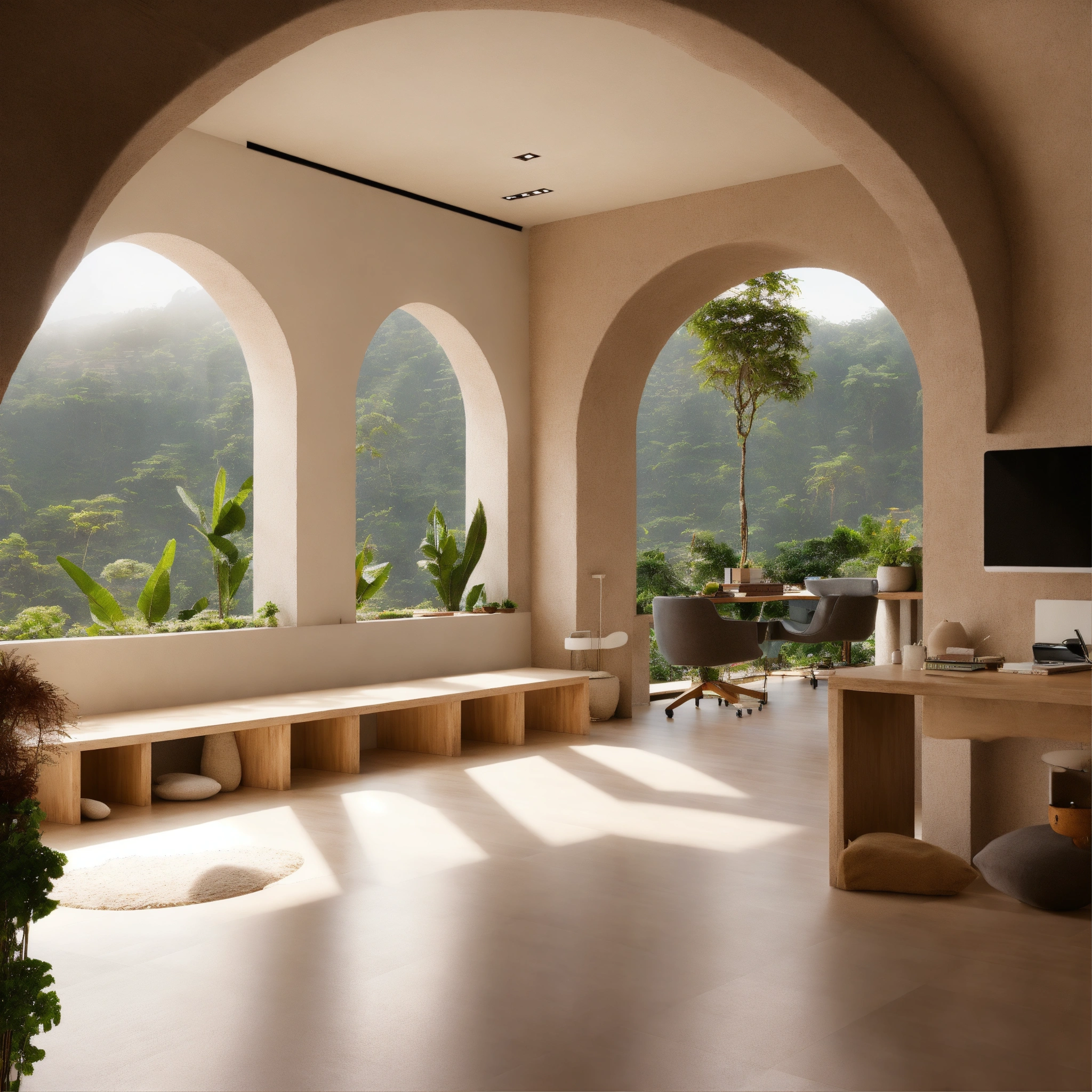 Ultra realistic photo of modern take on bali inspired low ceiling small apartment white cream stone, light wood round arches interor view of office.
