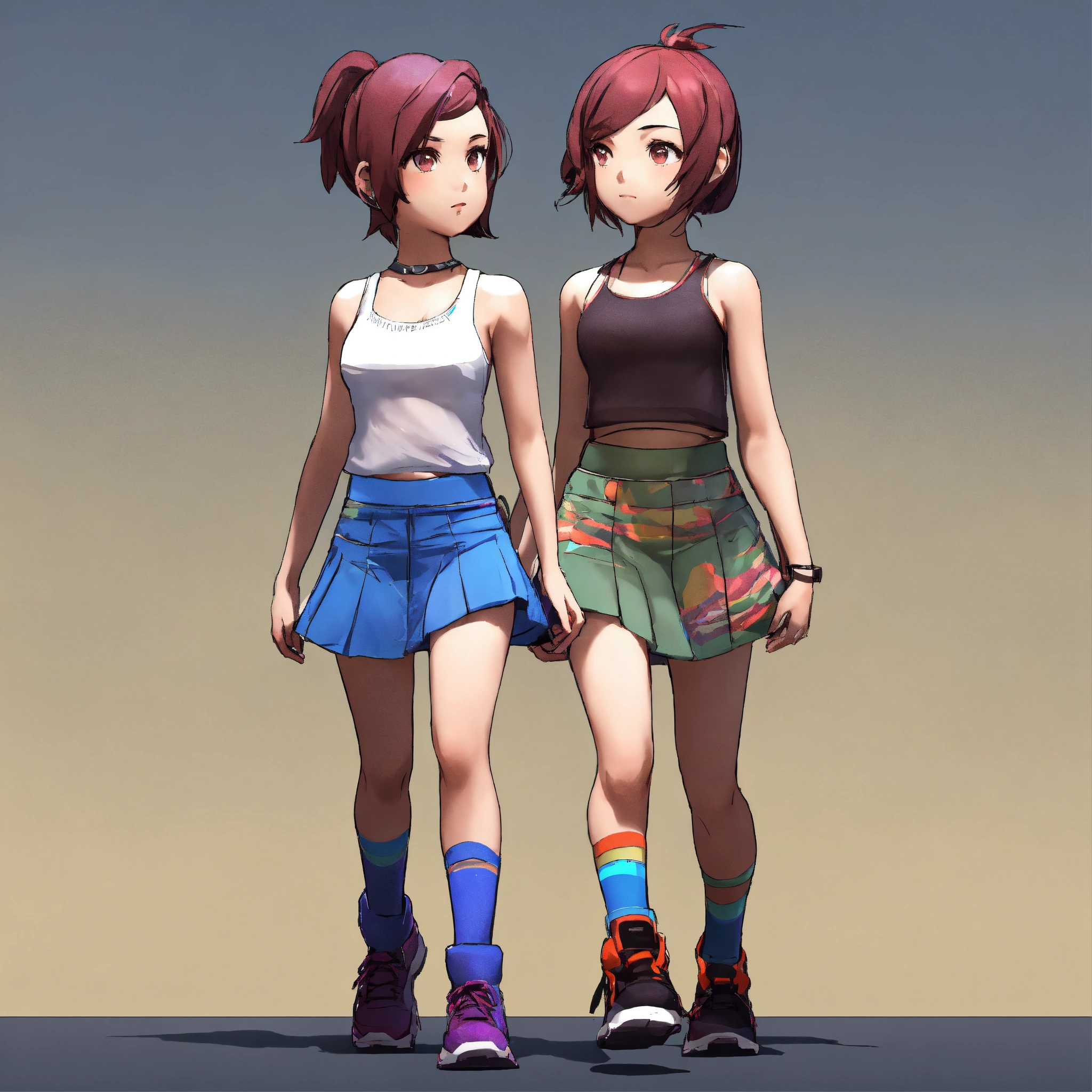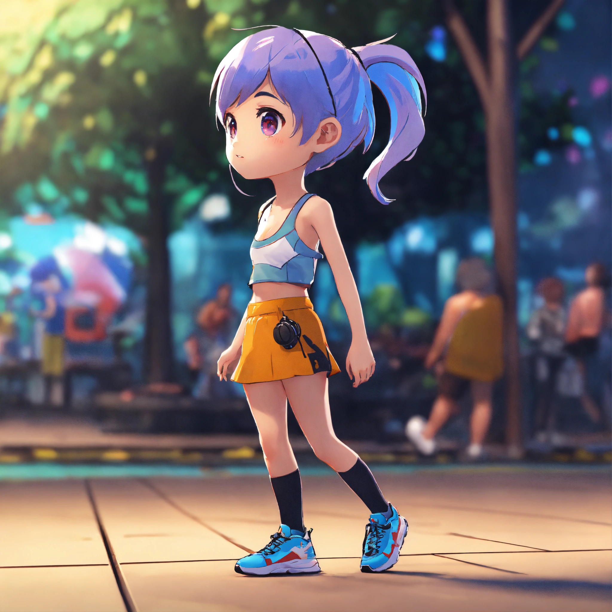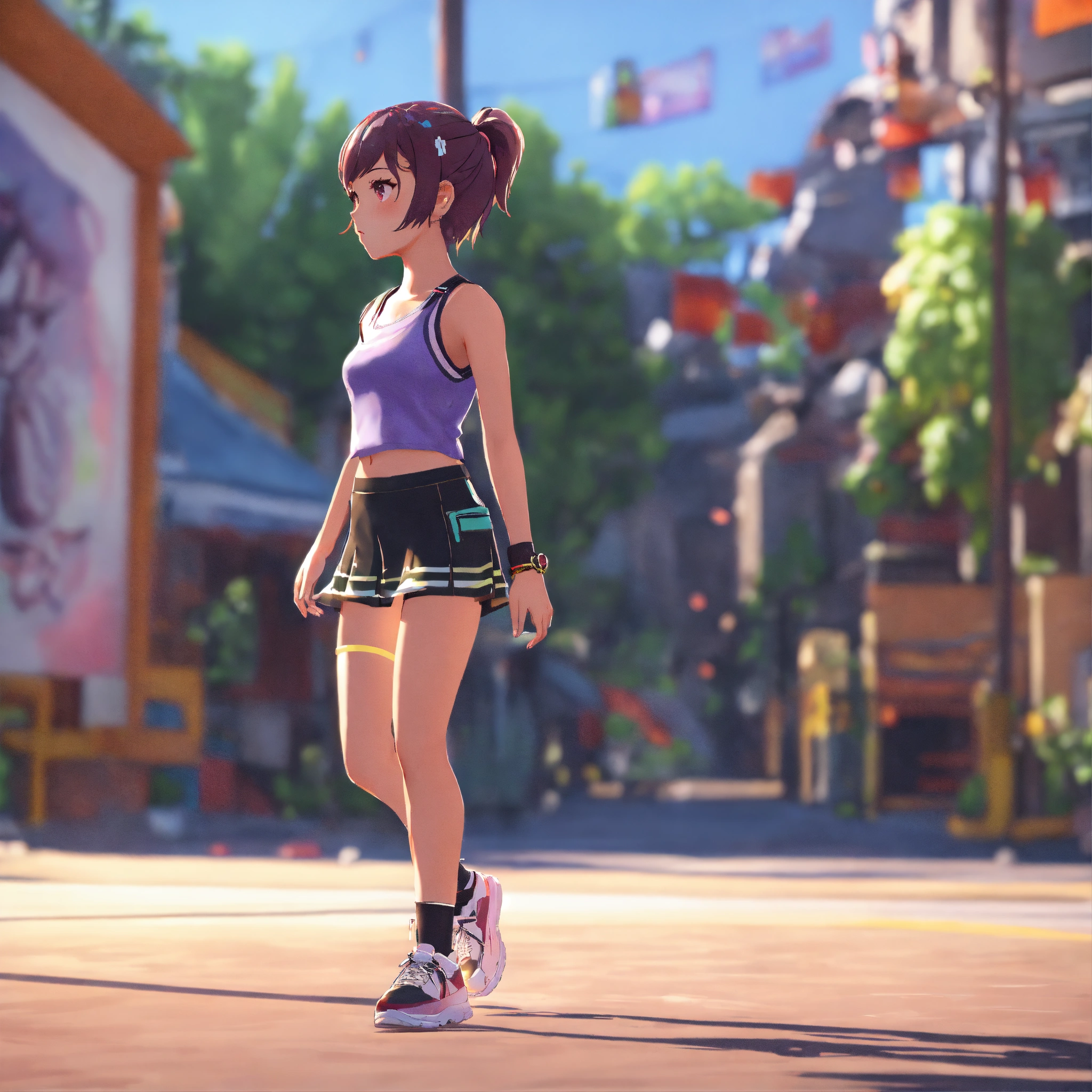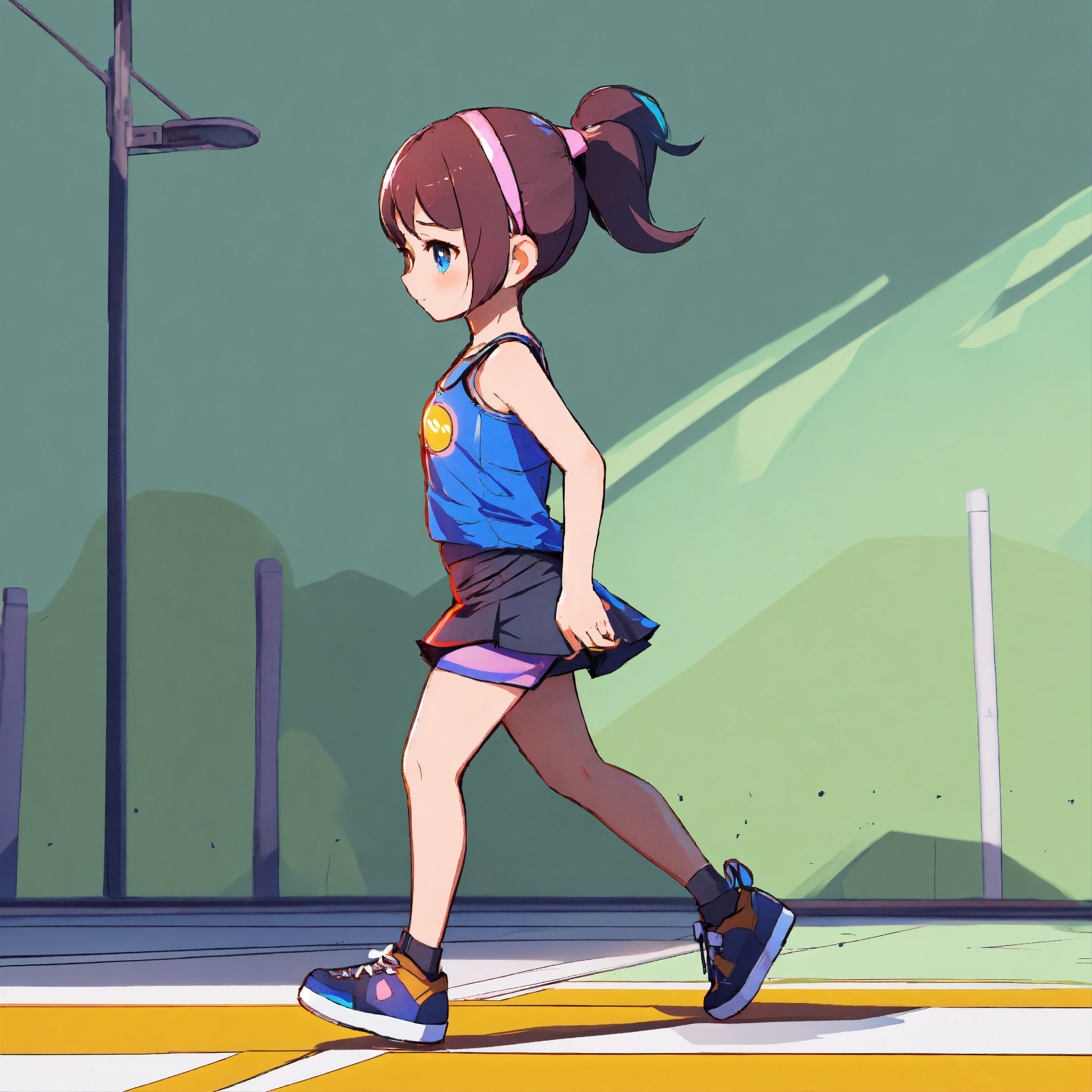 Short haired girl with ponytail wearing tank top and short skirt, walking, game art, full body view, side view, unreal engine, chibi proportions, blank background, bright cool colors. no outlines