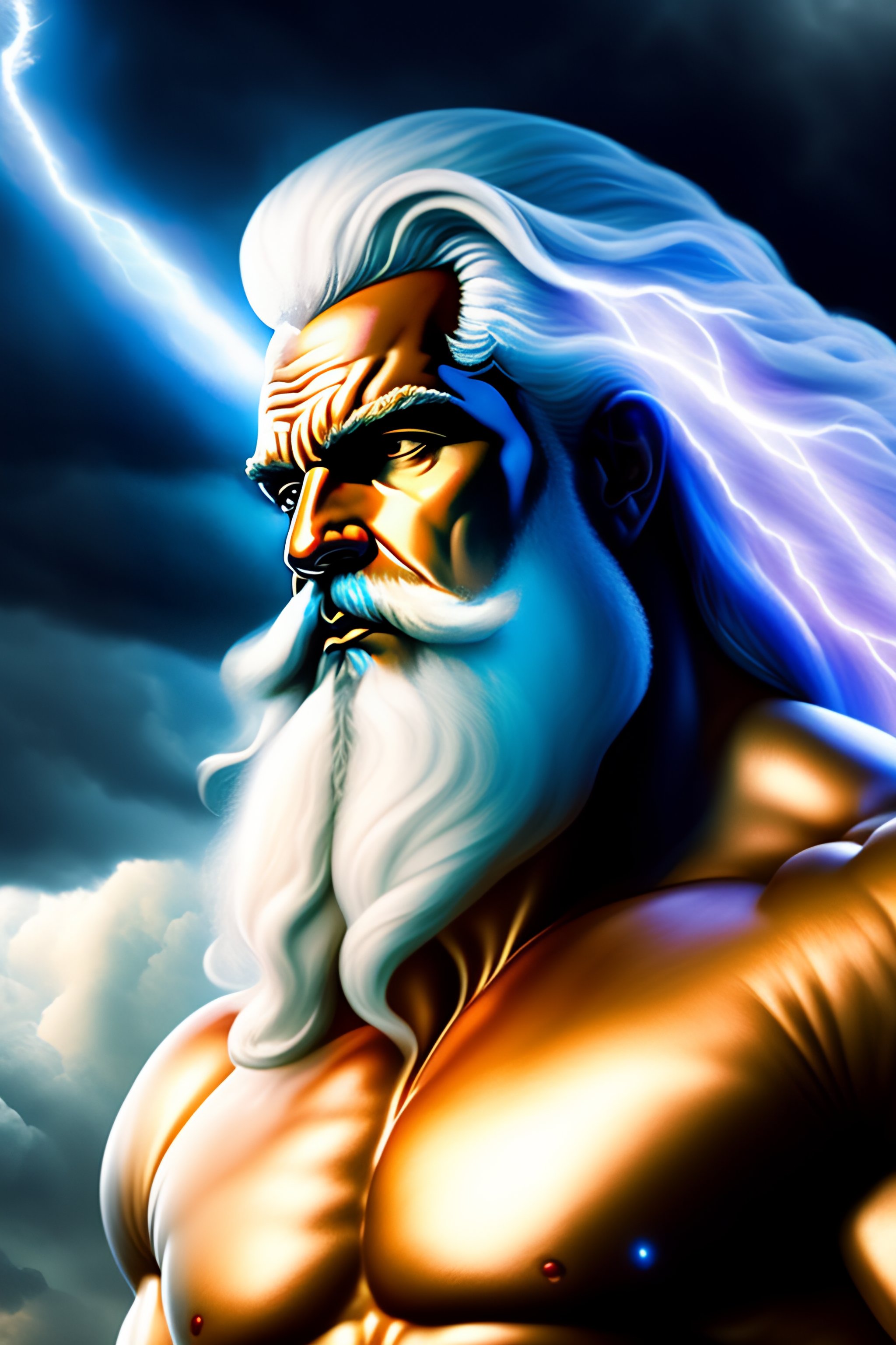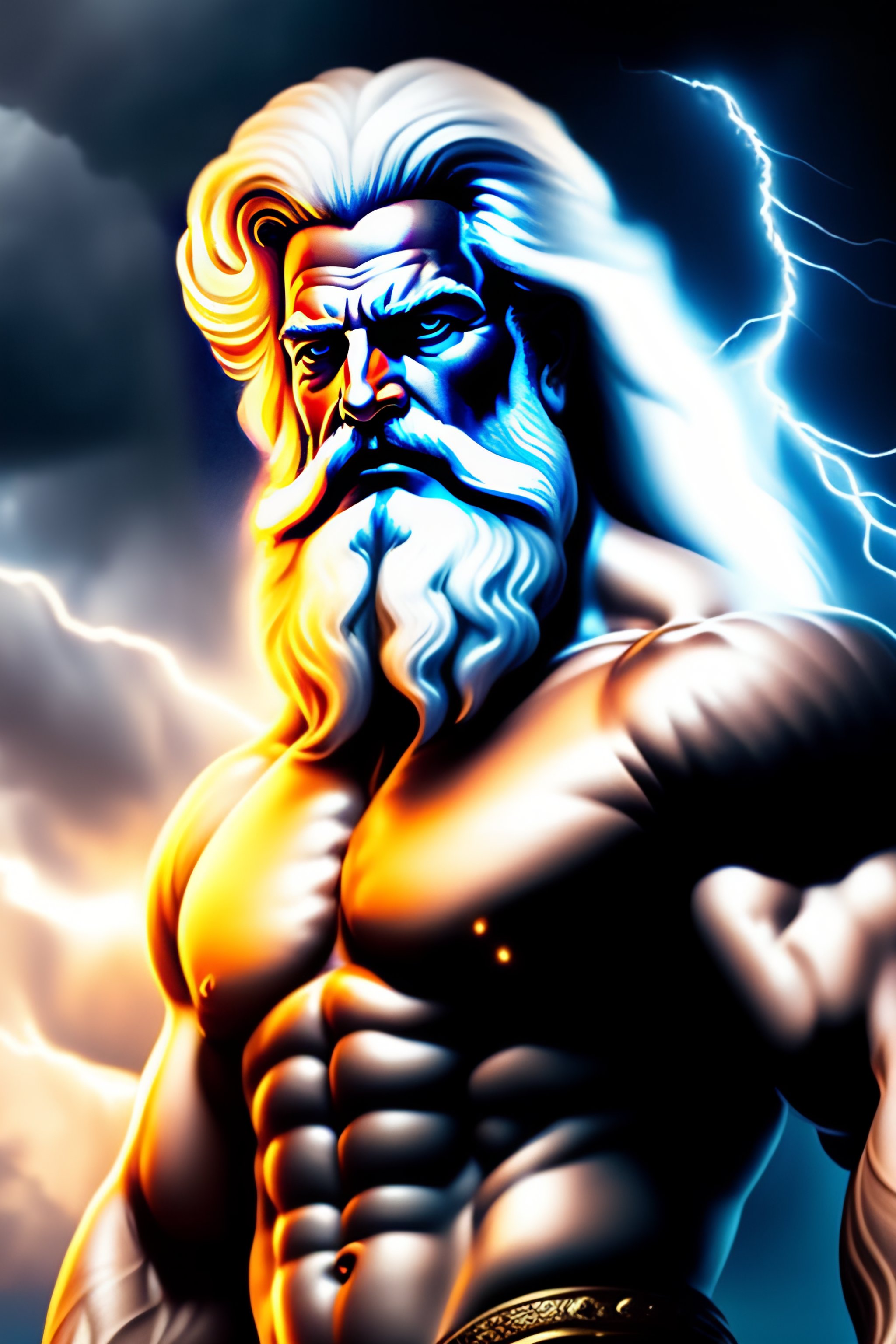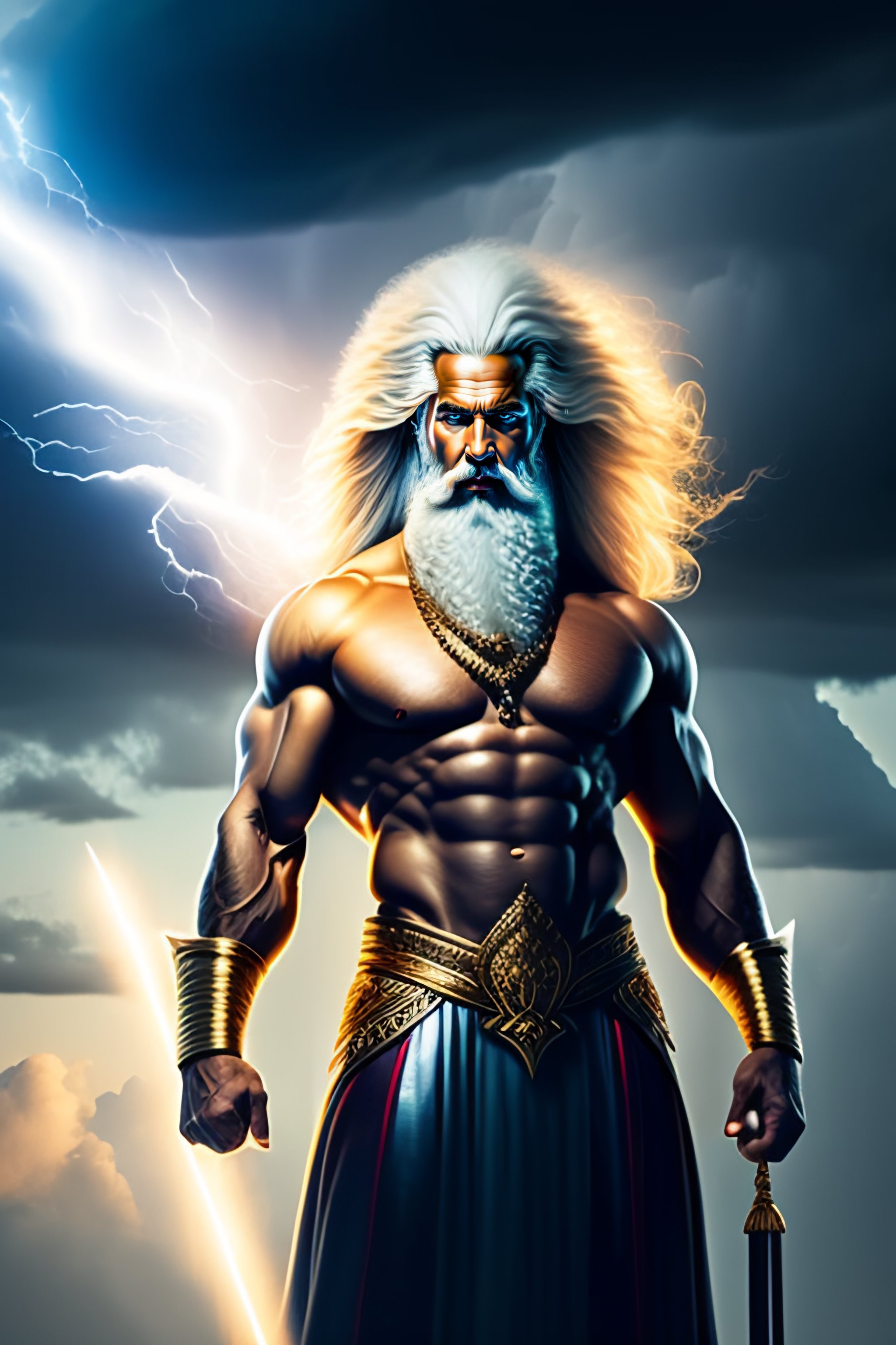 Hyper realistic, full length, old zeus god, with long white hair, in the sky, with athletic body, angry, holding a lightning bolt with his hand, on his hand he has 5 fingers, coming out through the clouds, looking down, with eyes illuminated by lightning