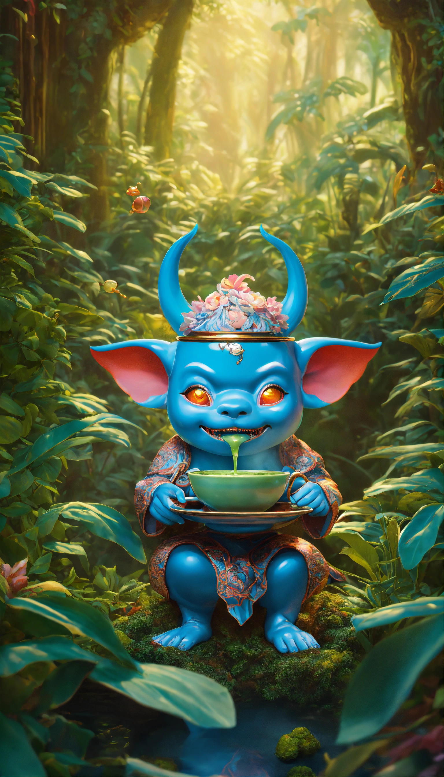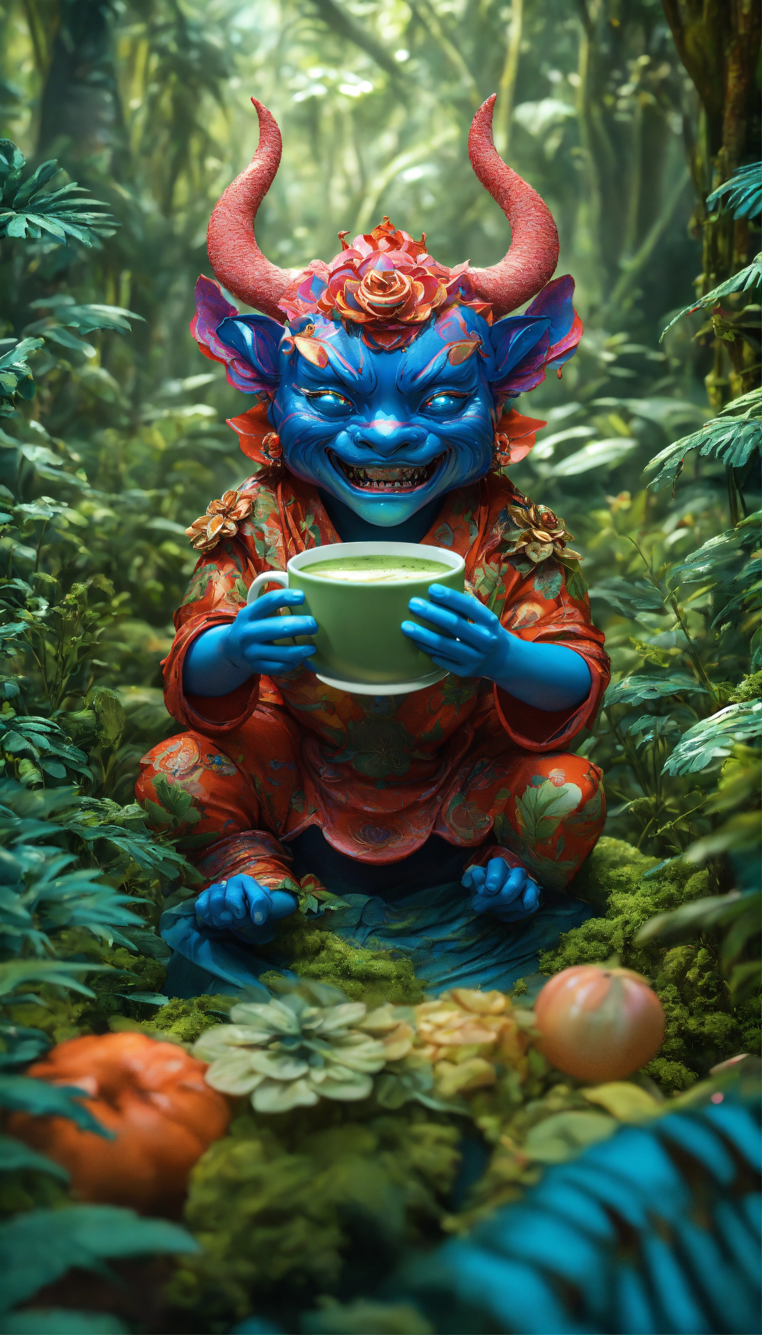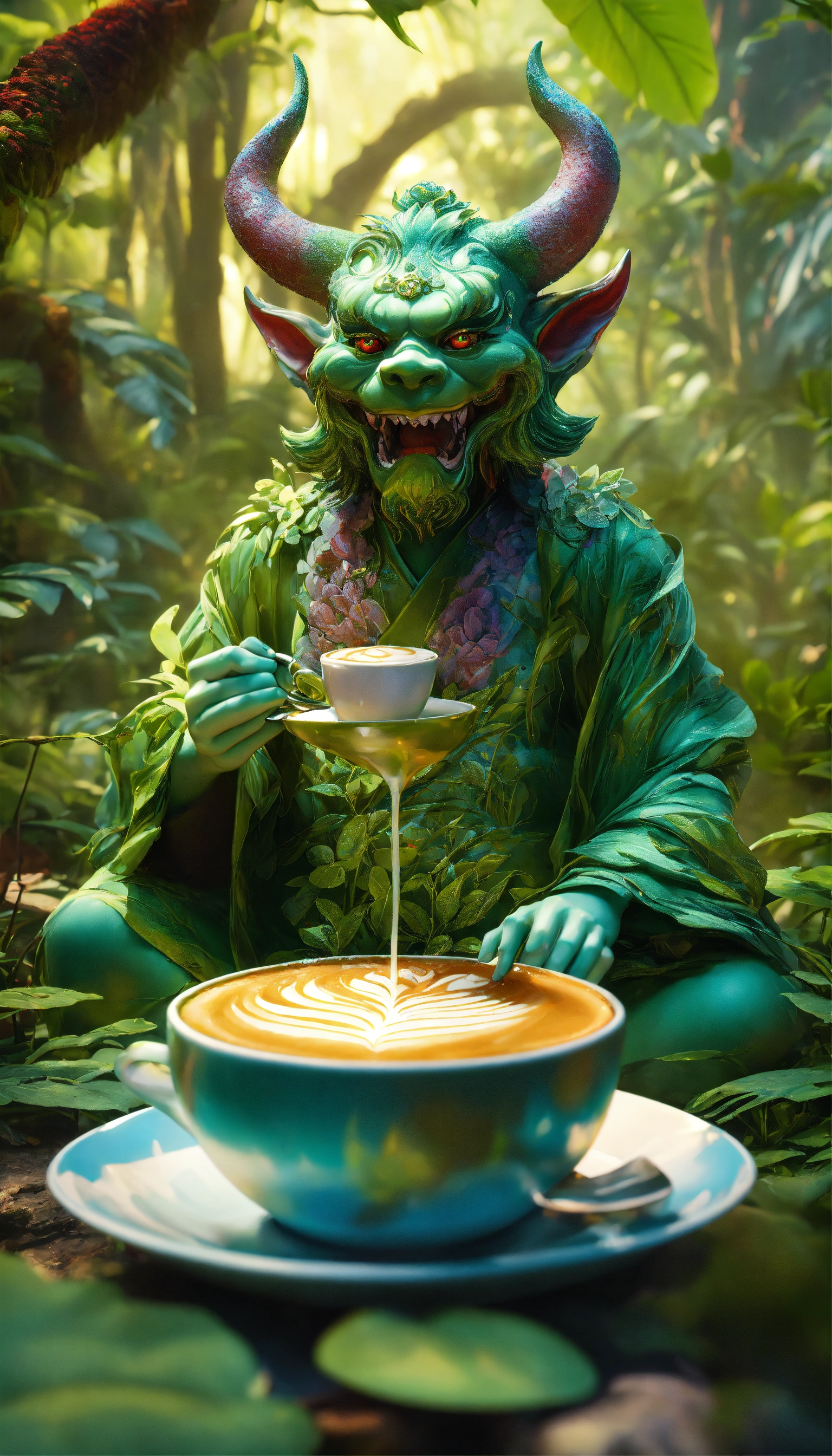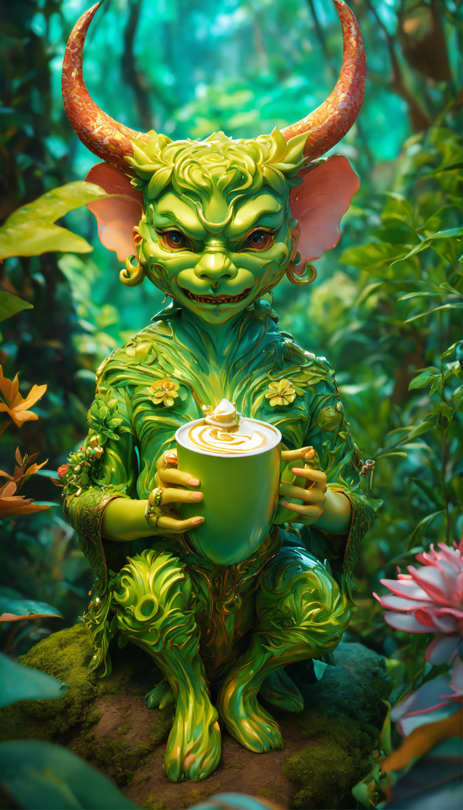 Extremely ultrarealistic photorealistic 3d cute iridiscent chrome japanese demon holding a matcha latte in a vast jungle, by james jean and android jones jeff koons erin hanson joe fenton dan mumford professional photography, natural lighting, volumetric lighting maximalist photoillustration 8k resolution intricately art nouveau detailed, complex, elegant, expansive, fantastical